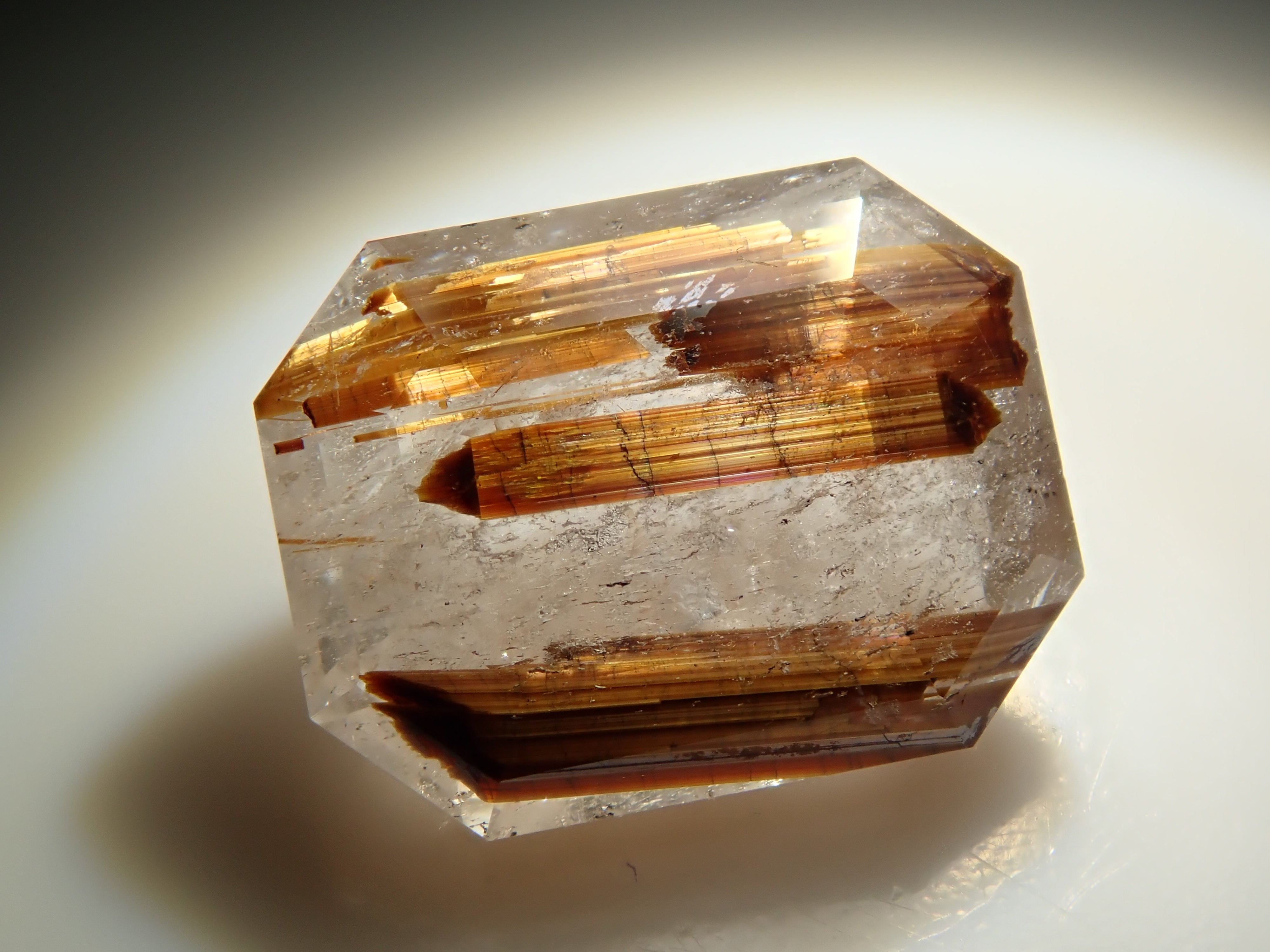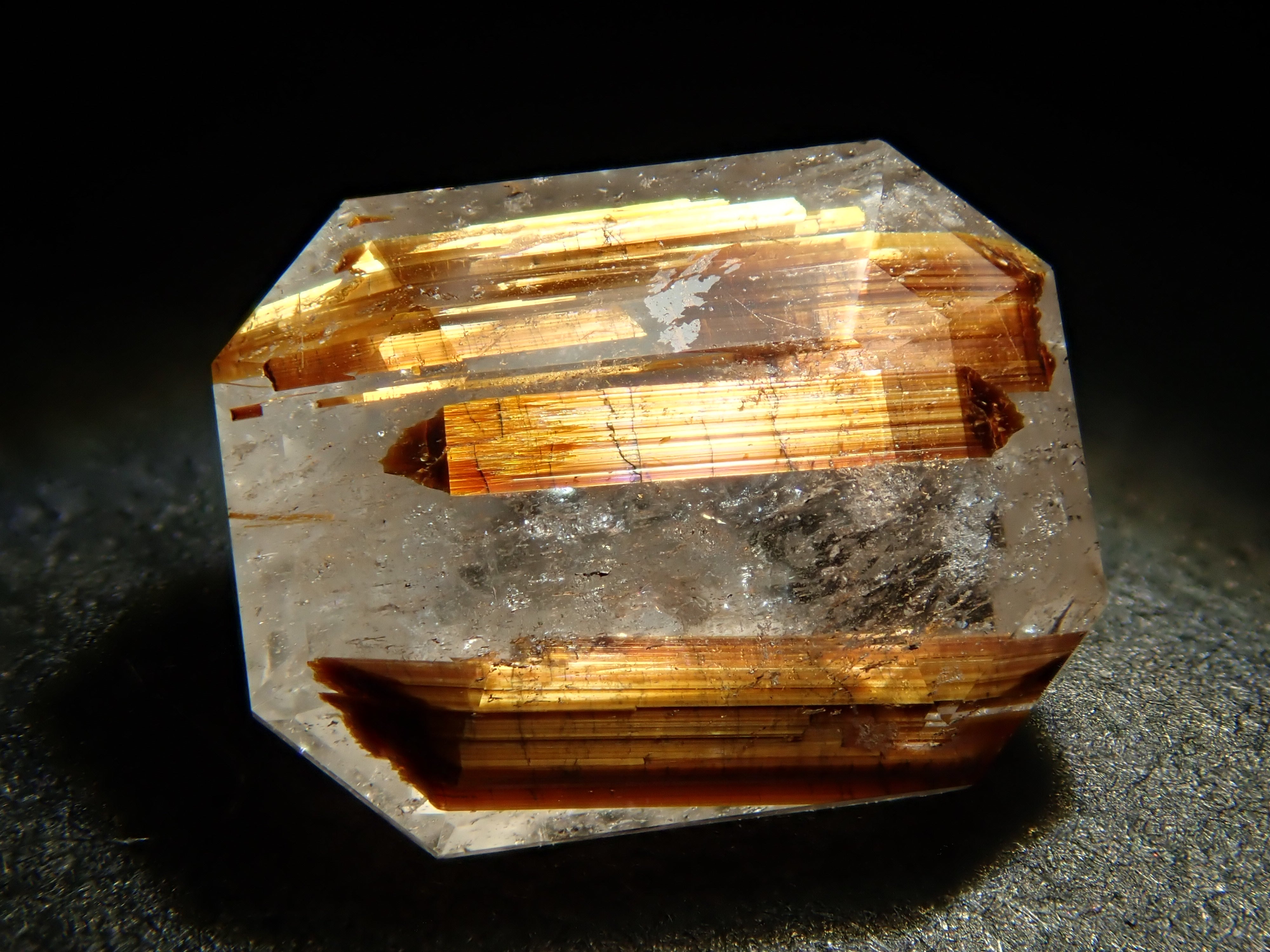 金紅石石英具有美麗的金色光澤。將一根由金紅石製成的「金針」插入晶體中。日本名字是“Kinkoishi”。這是稱為銅金紅石的石英。攝影時使用筆形燈捕捉內含物的美麗光芒。