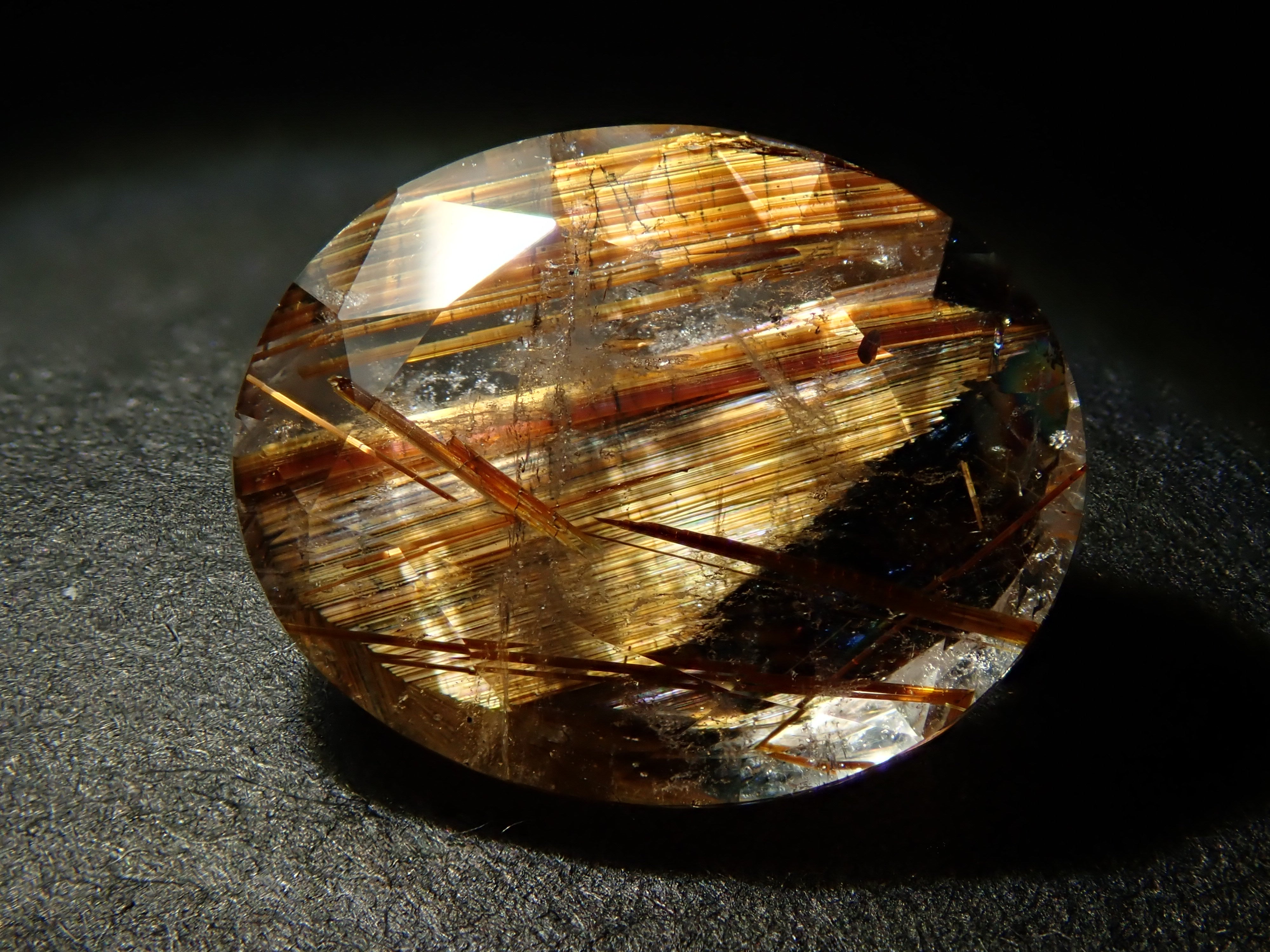 金紅石石英具有美麗的金色光澤。將一根由金紅石製成的「金針」插入晶體中。日本名字是“Kinkoishi”。這是稱為銅金紅石的石英。攝影時使用筆形燈捕捉內含物的美麗光芒。