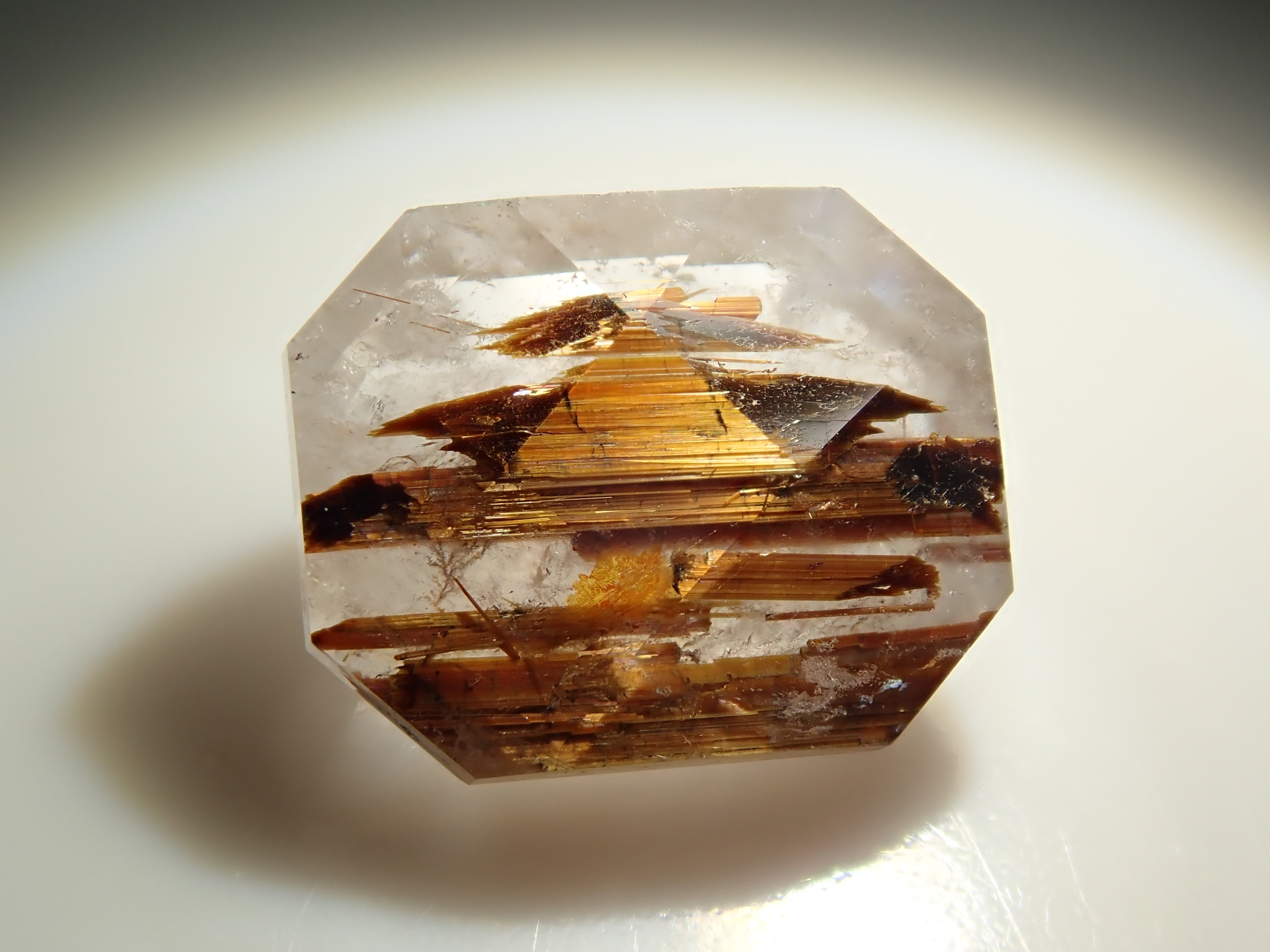 金紅石石英具有美麗的金色光澤。將一根由金紅石製成的「金針」插入晶體中。日本名字是“Kinkoishi”。這是稱為銅金紅石的石英。攝影時使用筆形燈捕捉內含物的美麗光芒。