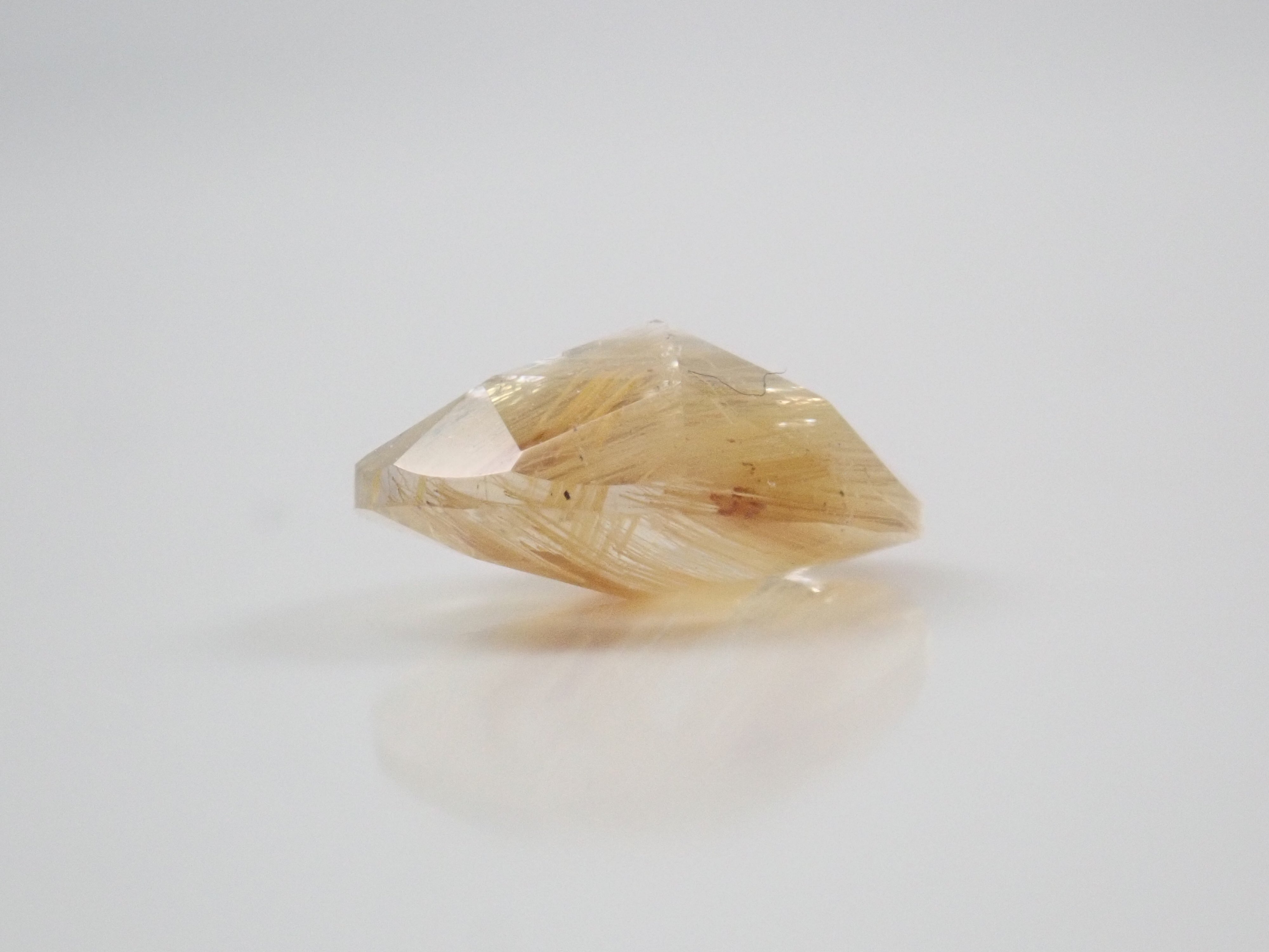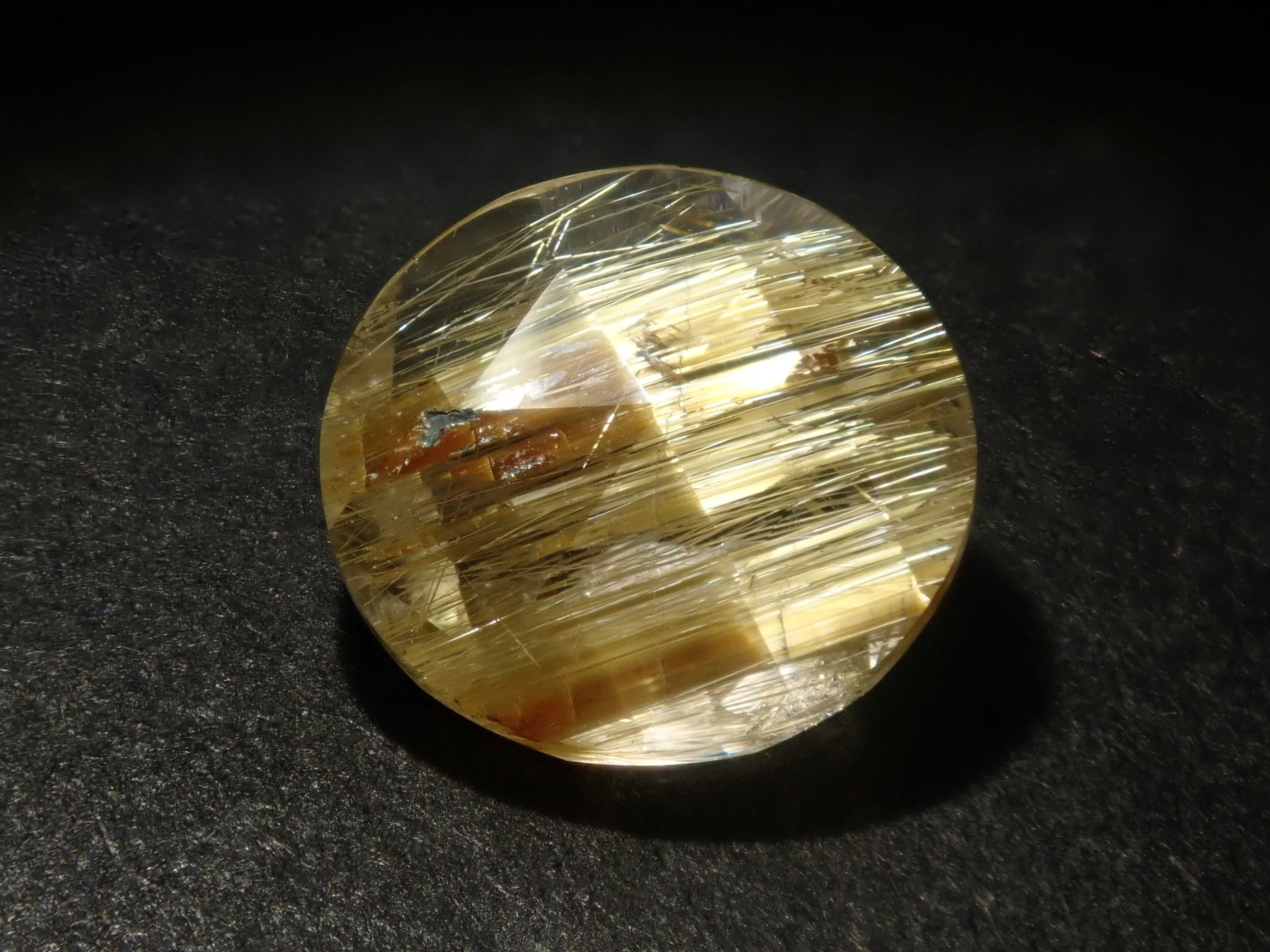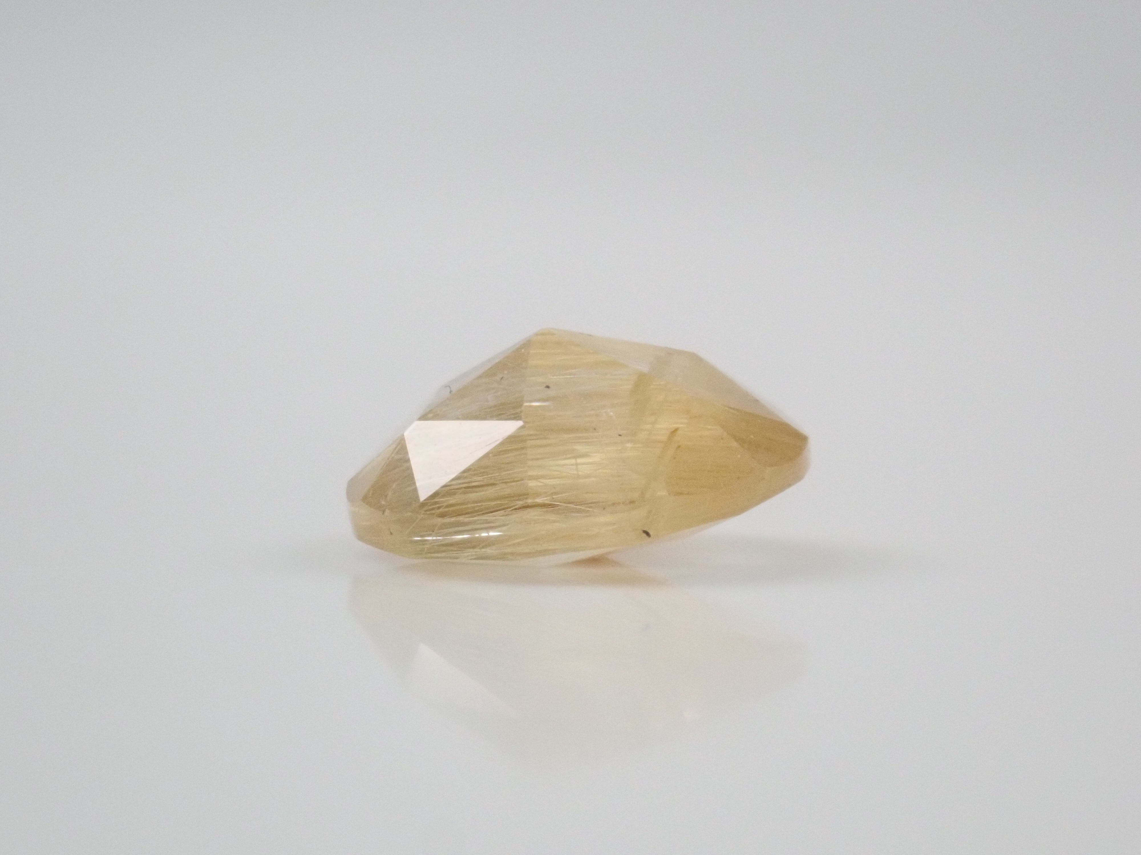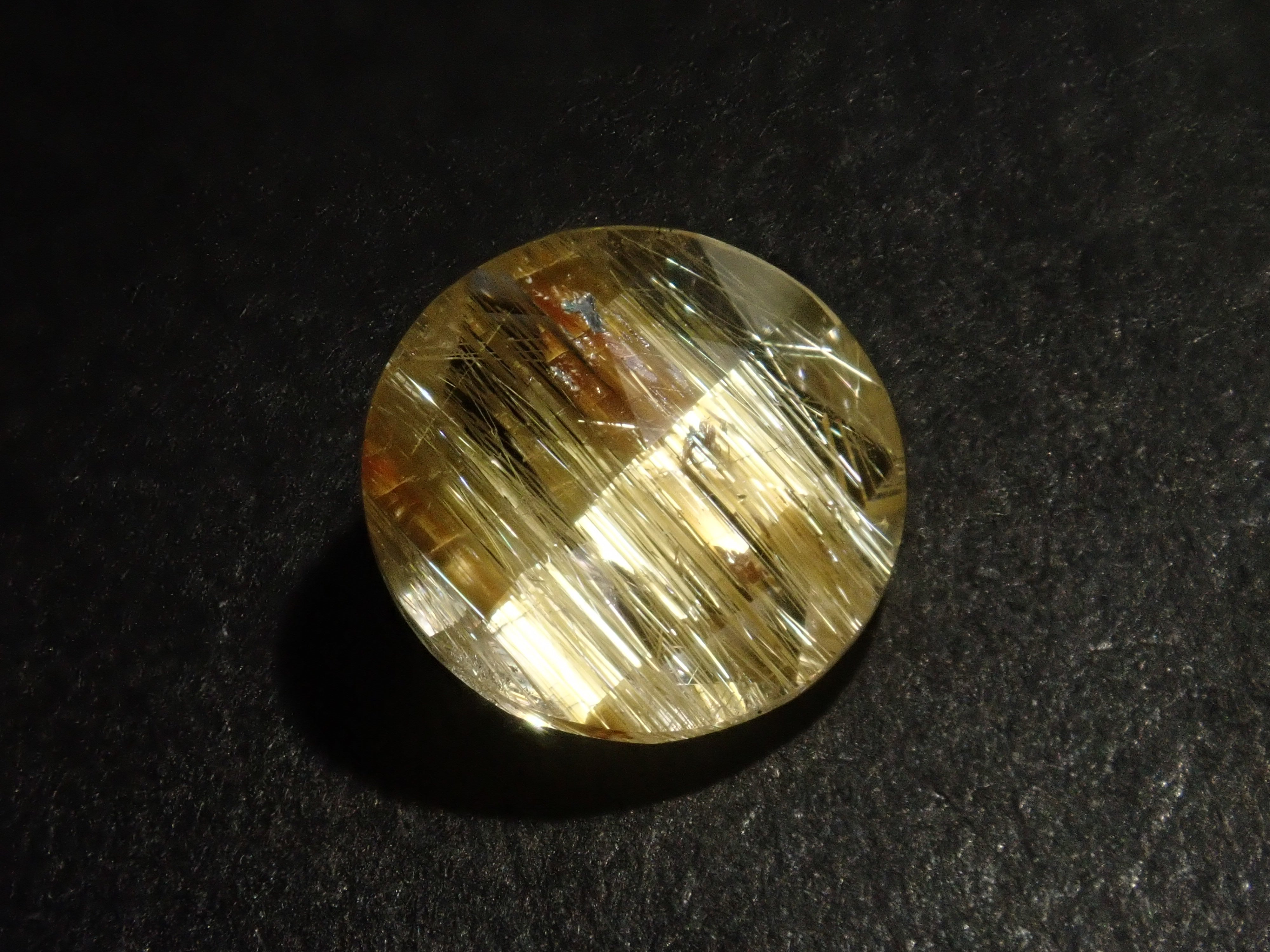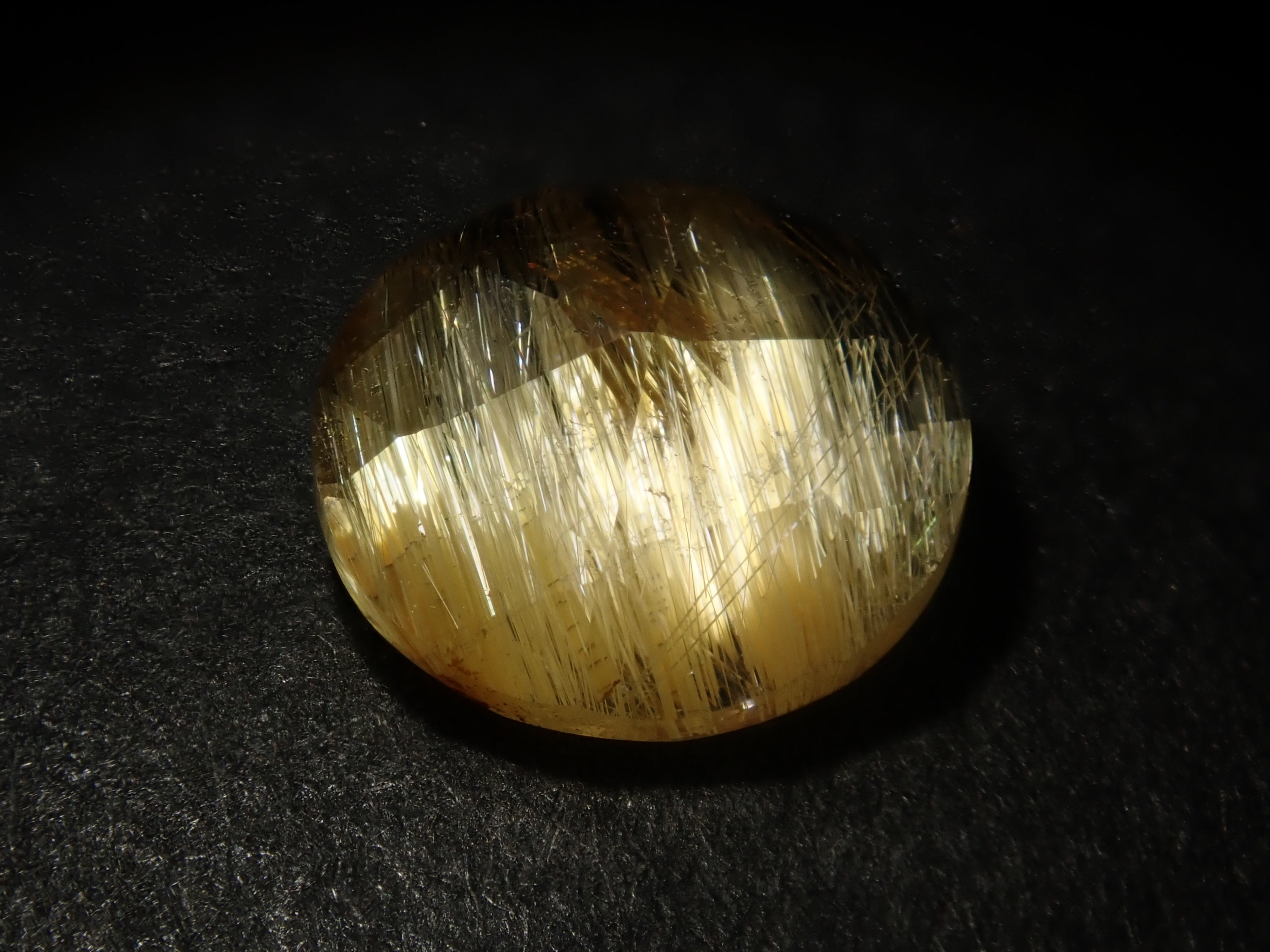 金紅石英散發著美麗的金色光澤。晶體中鑲嵌著由金紅石構成的「金針」。它的日文名稱是“金紅石”。它也被稱為“石英中的金紅石”、“金紅石石英”或“金紅石石英”。為了捕捉包裹體的美麗光澤,人們會用筆型手電筒進行拍攝。這是由斯里蘭卡切割師 Sanjay 切割的巴西金紅石石英(金紅石石英)。