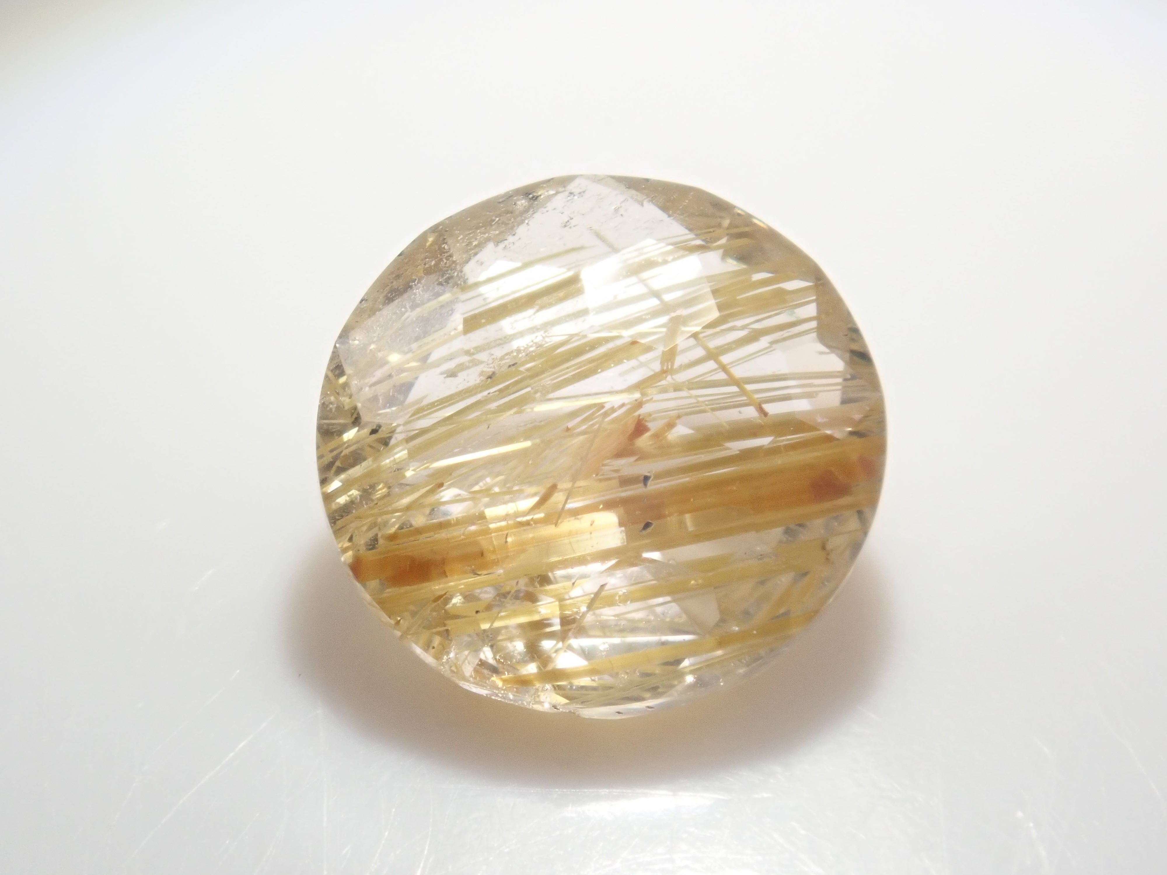 金紅石英散發著美麗的金色光澤。晶體中鑲嵌著由金紅石構成的「金針」。它的日文名稱是“金紅石”。它也被稱為“石英中的金紅石”、“金紅石石英”或“金紅石石英”。為了捕捉包裹體的美麗光澤,人們會用筆型手電筒進行拍攝。這是由斯里蘭卡切割師 Sanjay 切割的巴西金紅石石英(金紅石石英)。