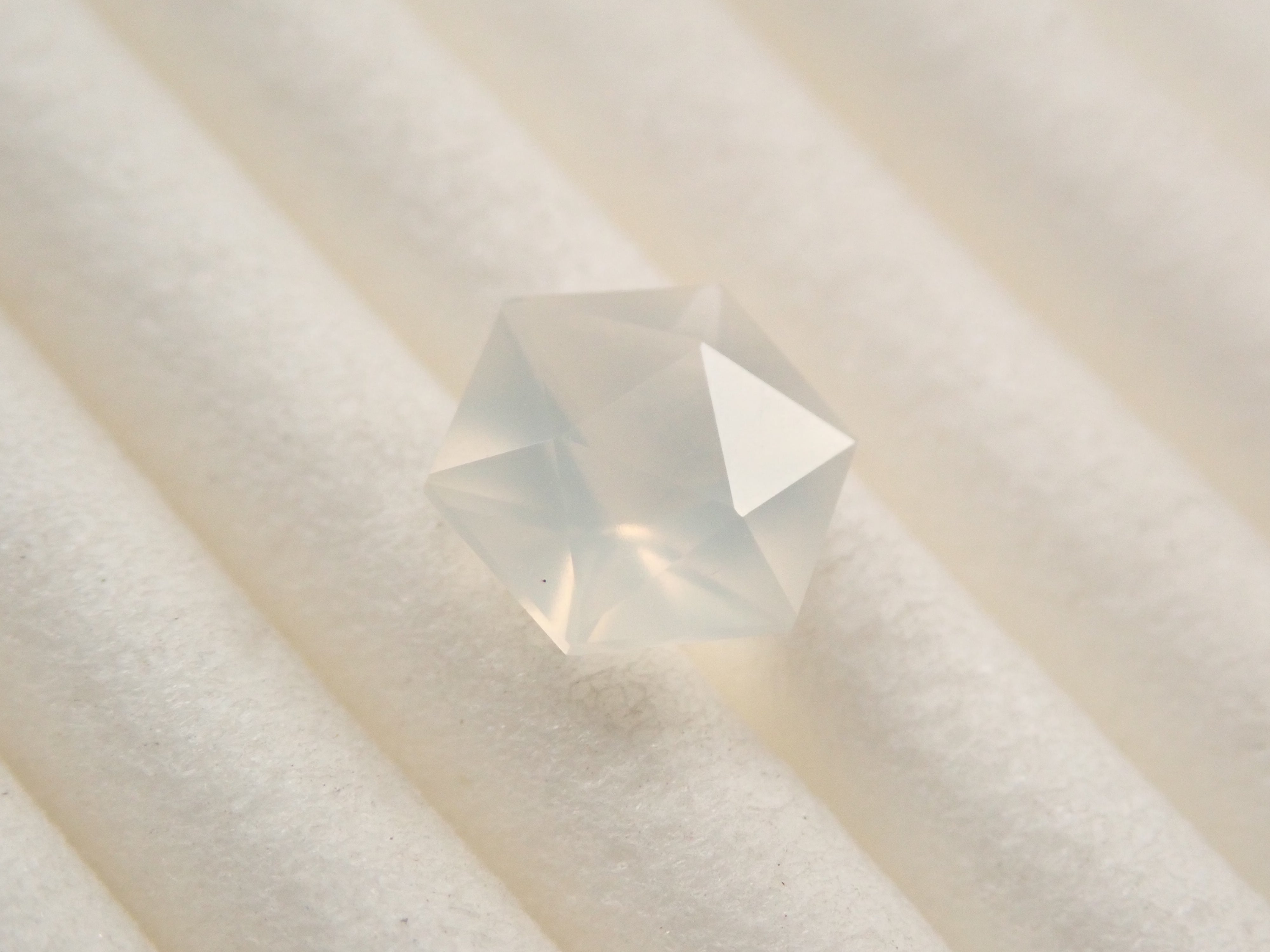 一顆看起來像聚光燈的月光石在中間閃閃發光。這種類似月光的明亮光學效果是月光石的標誌。照片是使用筆燈拍攝的。斯里蘭卡月光石 0.561 克拉,由斯里蘭卡拋光商 Sanju 裸切。
