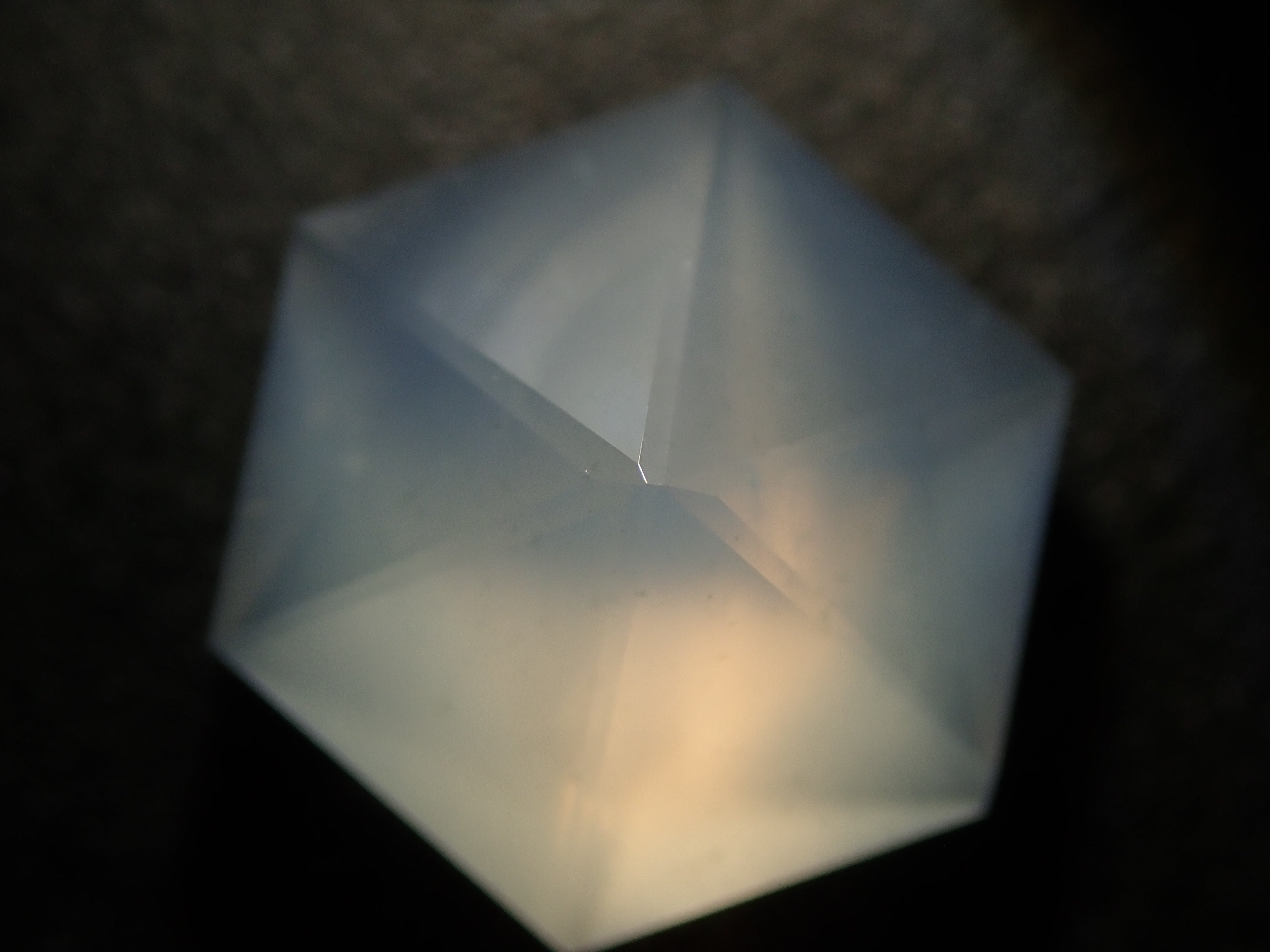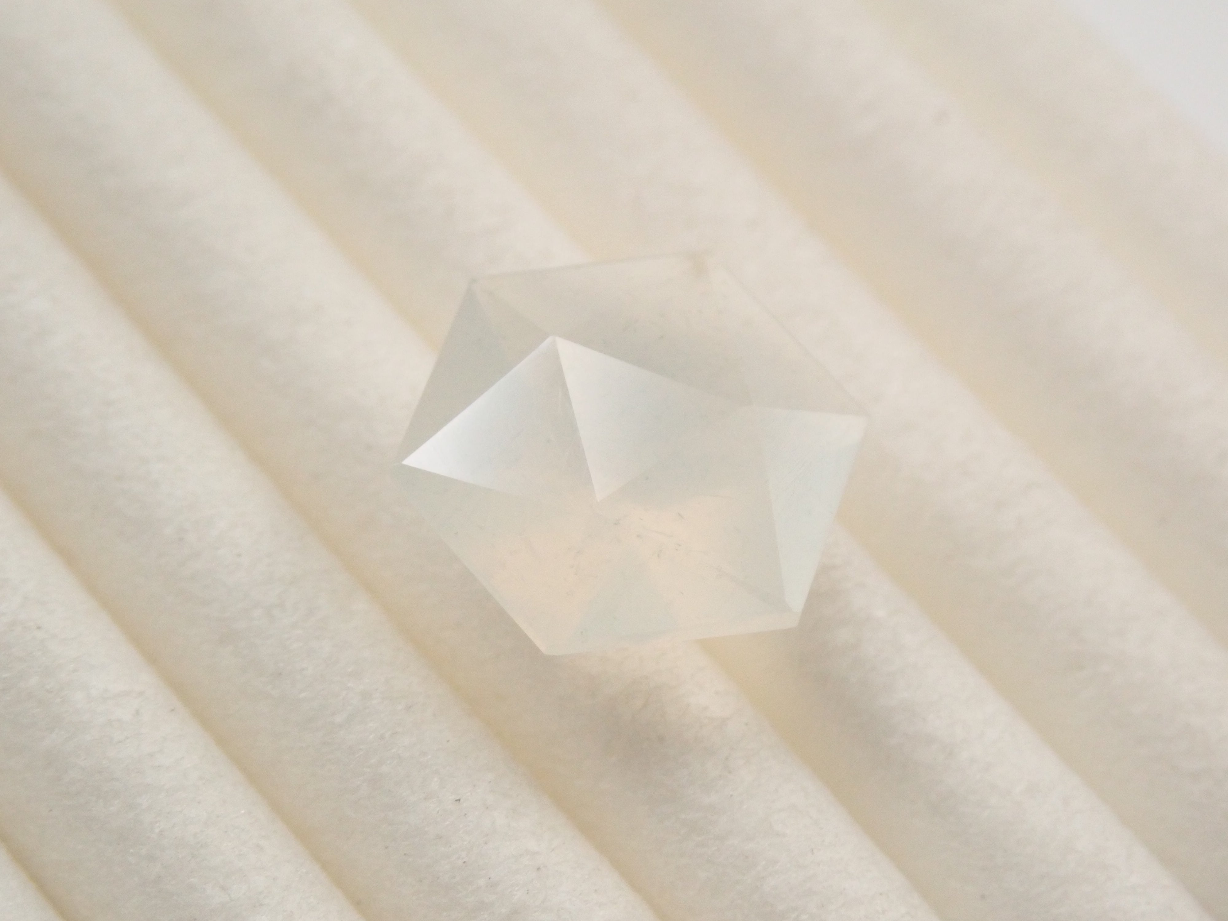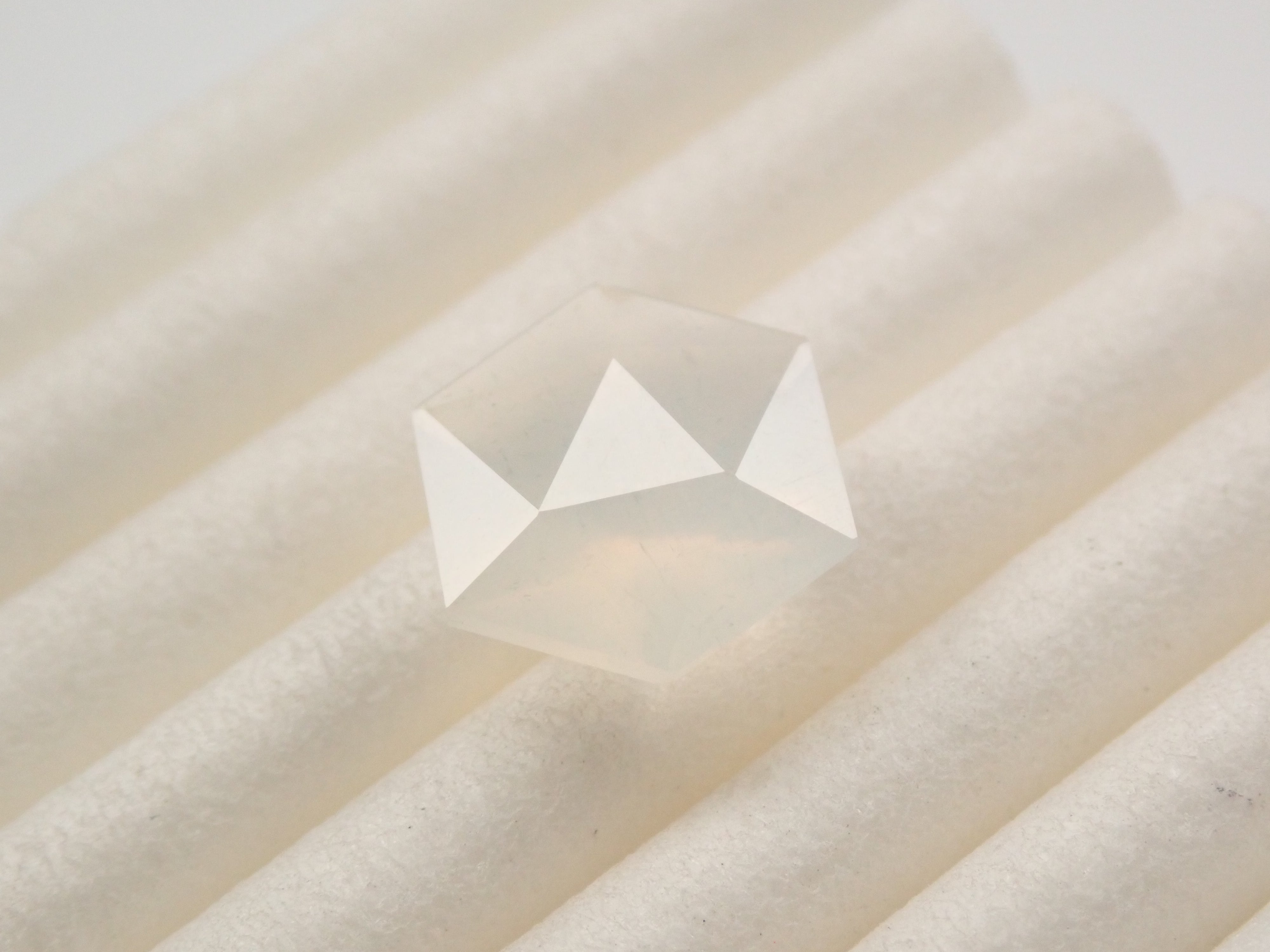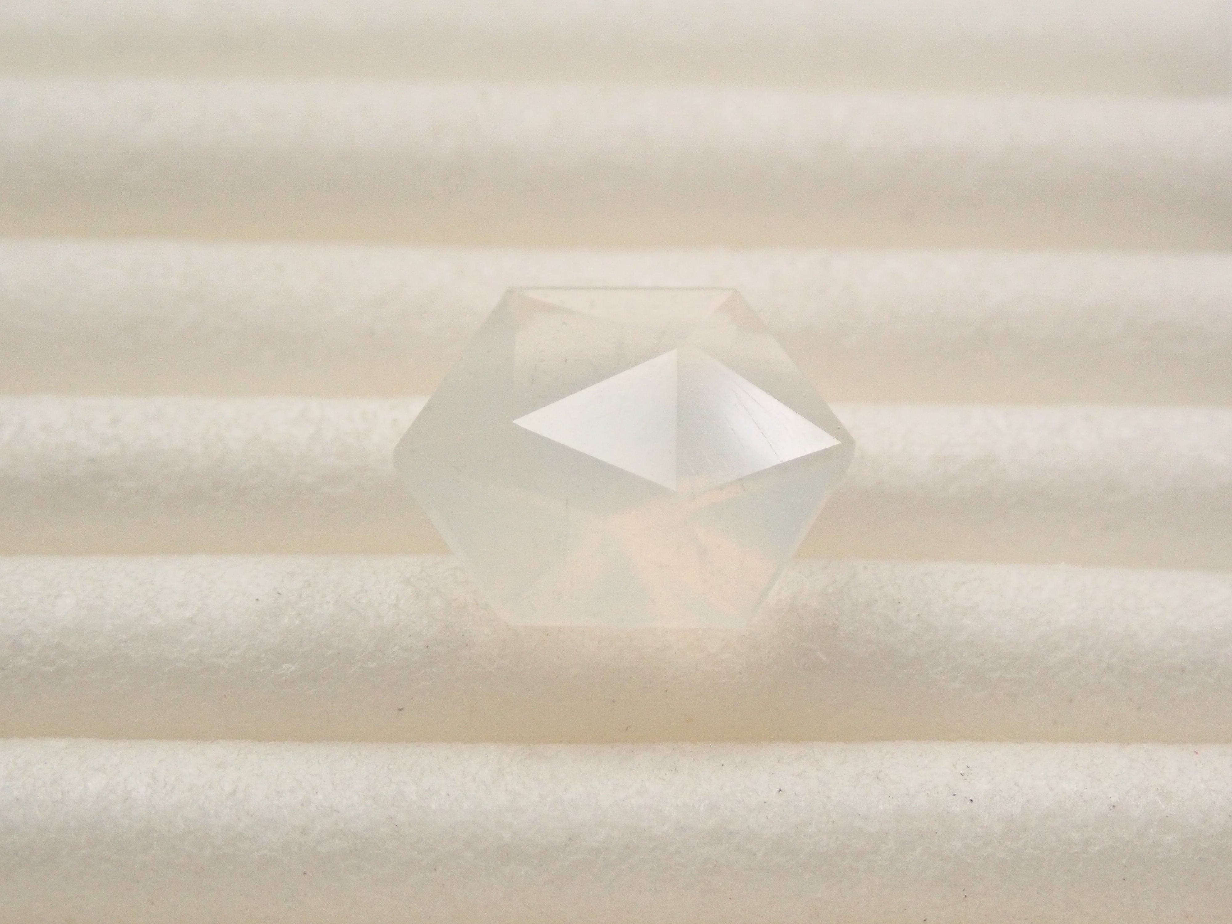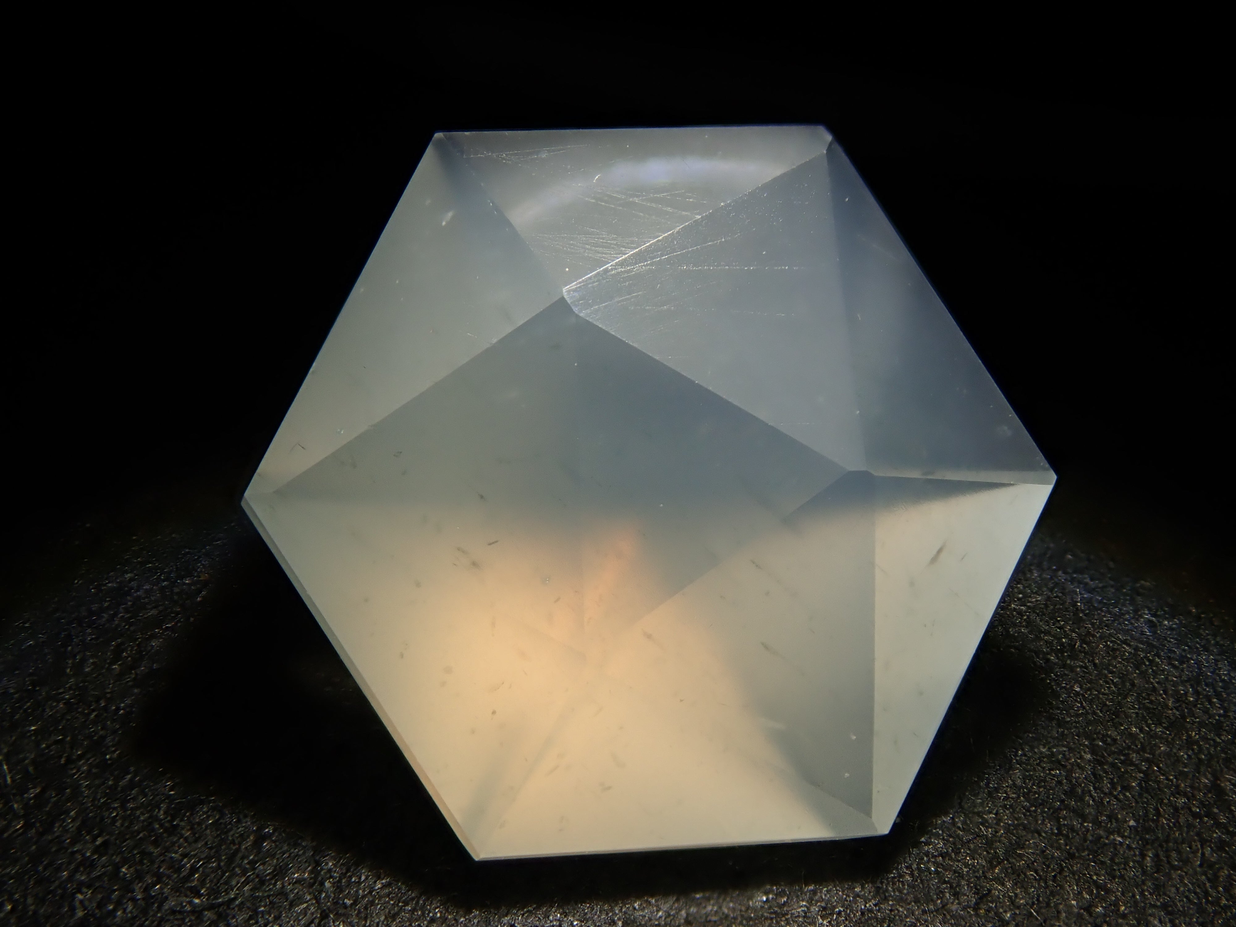 一顆看起來像聚光燈的月光石在中間閃閃發光。這種類似月光的明亮光學效果是月光石的標誌。照片是使用筆燈拍攝的。斯里蘭卡月光石 1.959 克拉,由斯里蘭卡拋光師 Sanjay 裸露切割。