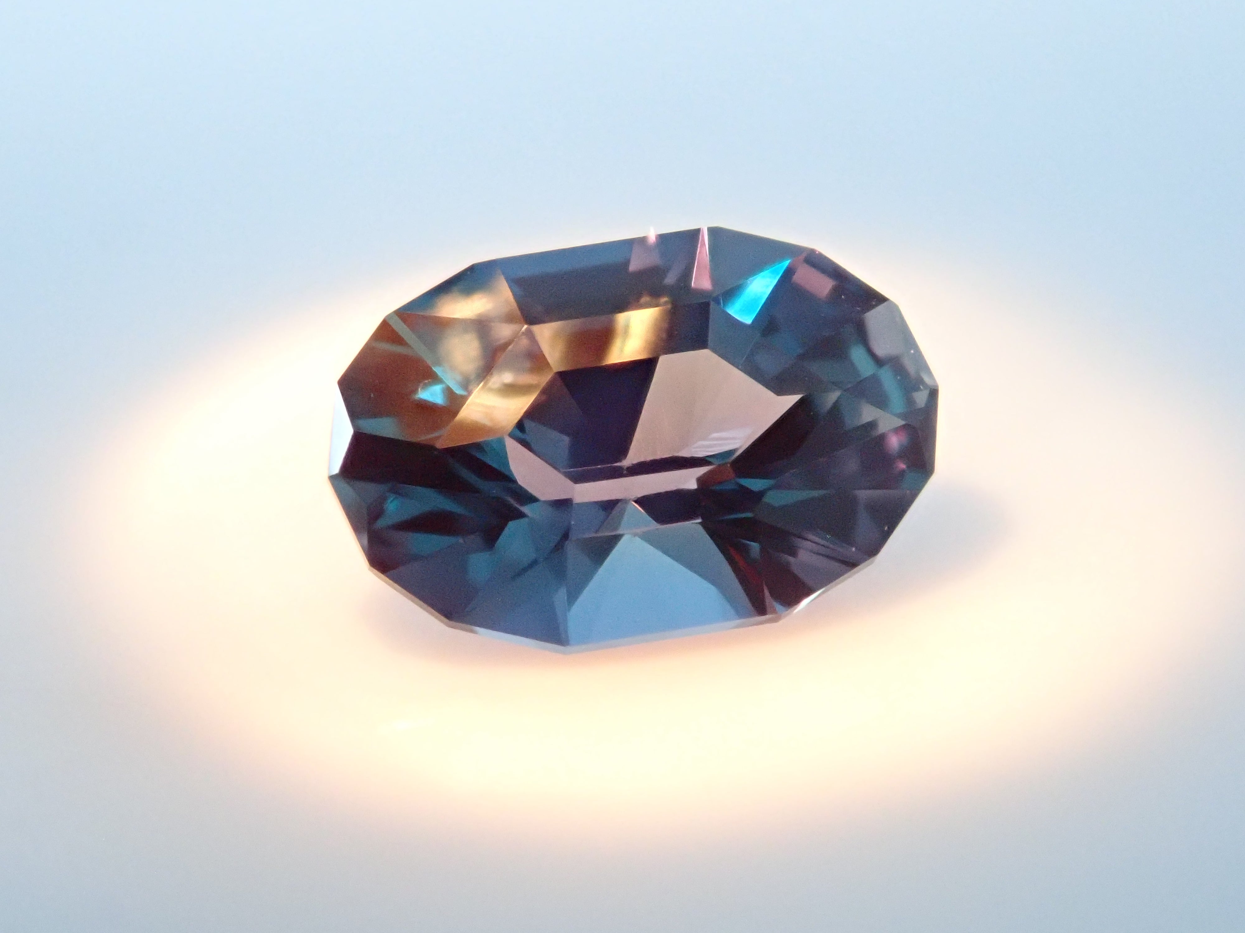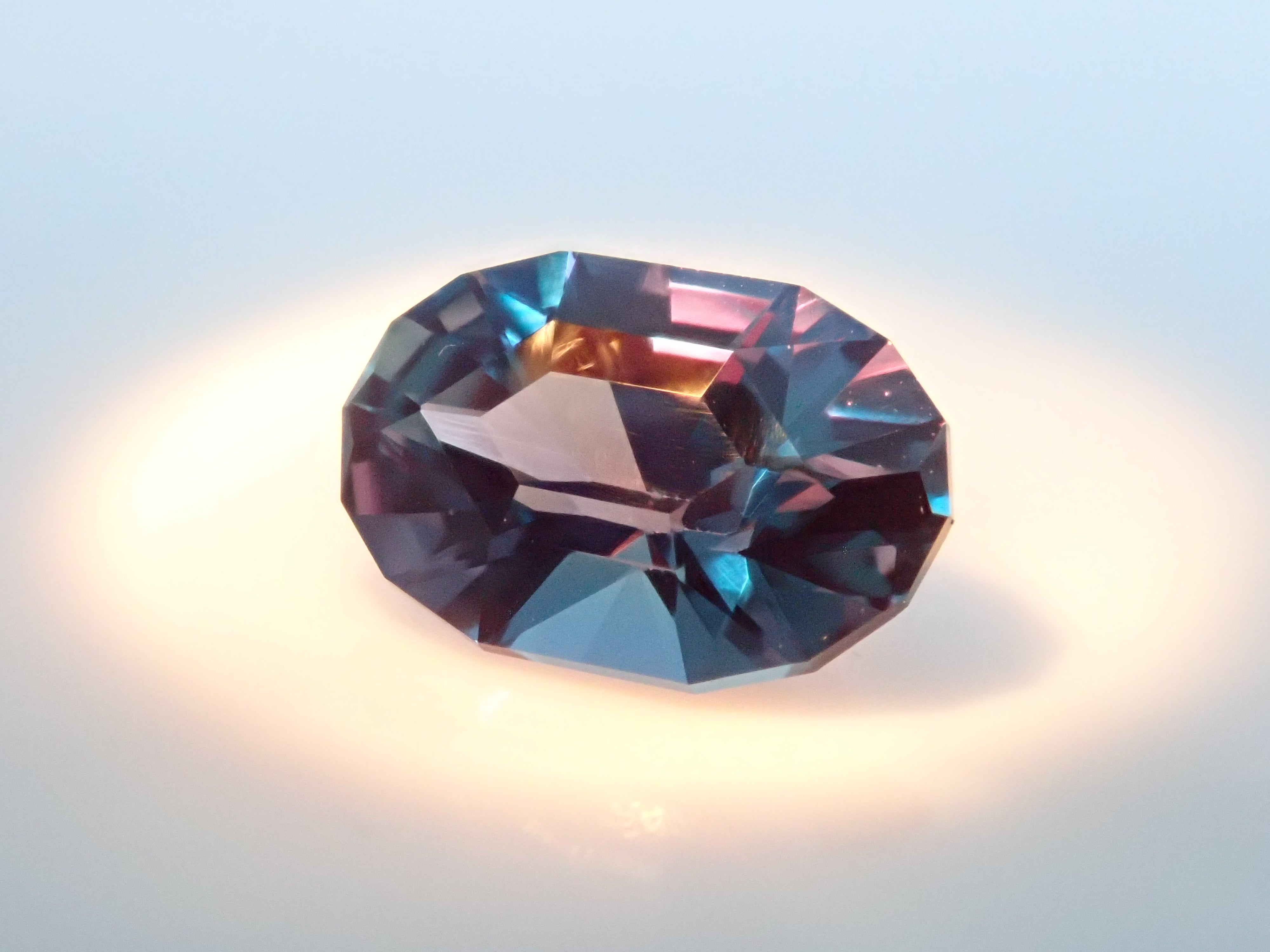 紫翠玉也被稱為「寶石之王」。它是一種顏色從綠色變為紅色的神秘寶石,也被稱為“白天的祖母綠和夜間的紅寶石”。這就是「合成石」。請使用紅色變色筆燈欣賞變色效果。合成亞歷山大變石 0.578 克拉,由斯里蘭卡拋光師裸切。