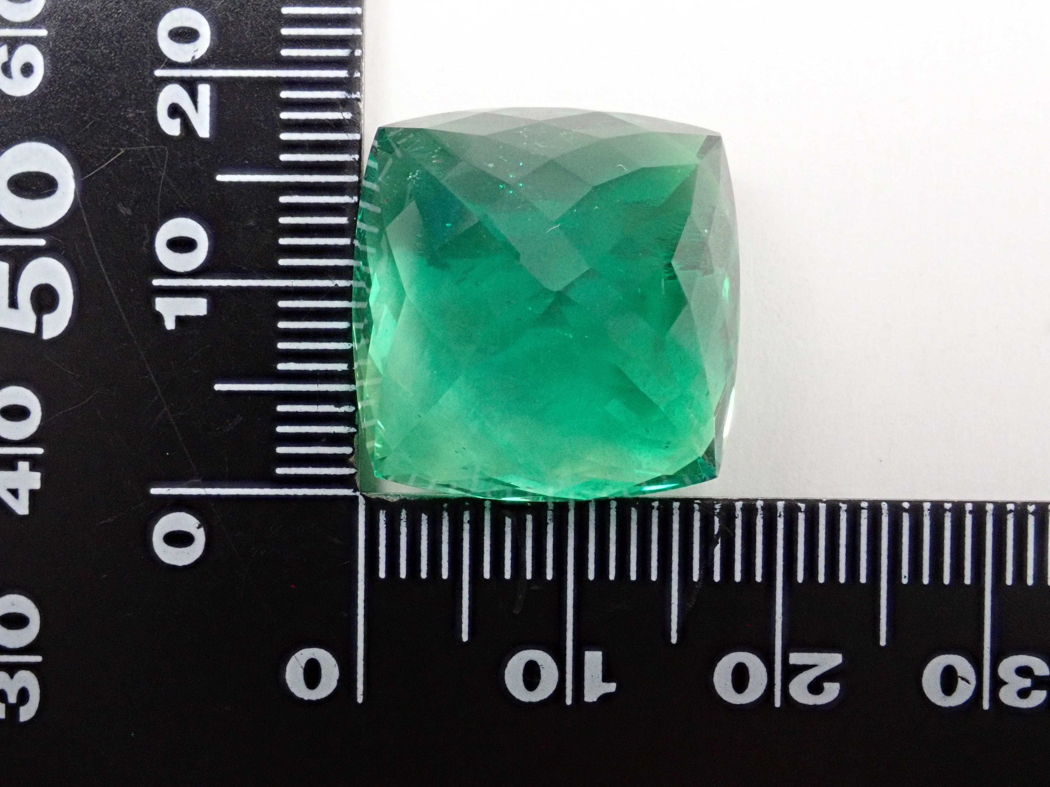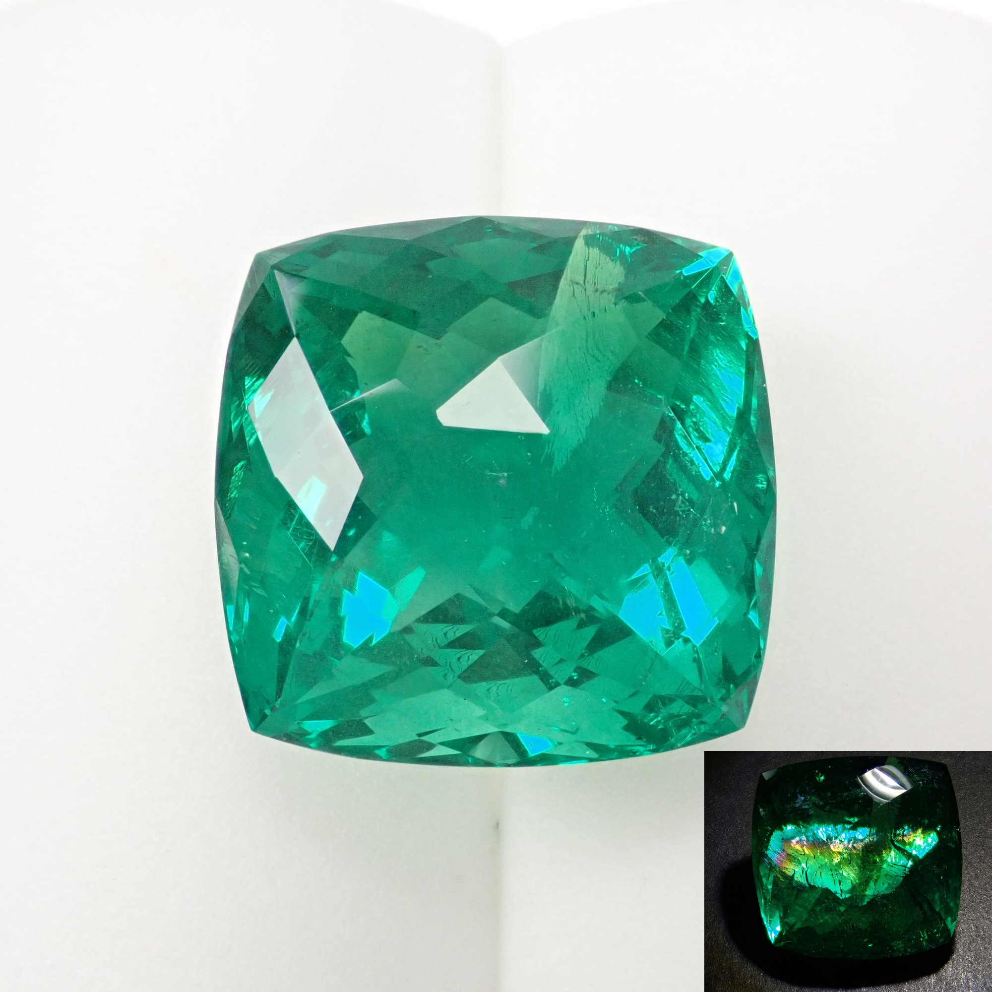 這是一種 UV 型綠色螢石,在黑光照射下會發出螢光。其特徵是鮮豔的綠色,在裡面還可以欣賞彩虹色。此顏色的綠色螢石是國外罕見的罕見螢石,其大尺寸為38克拉。
