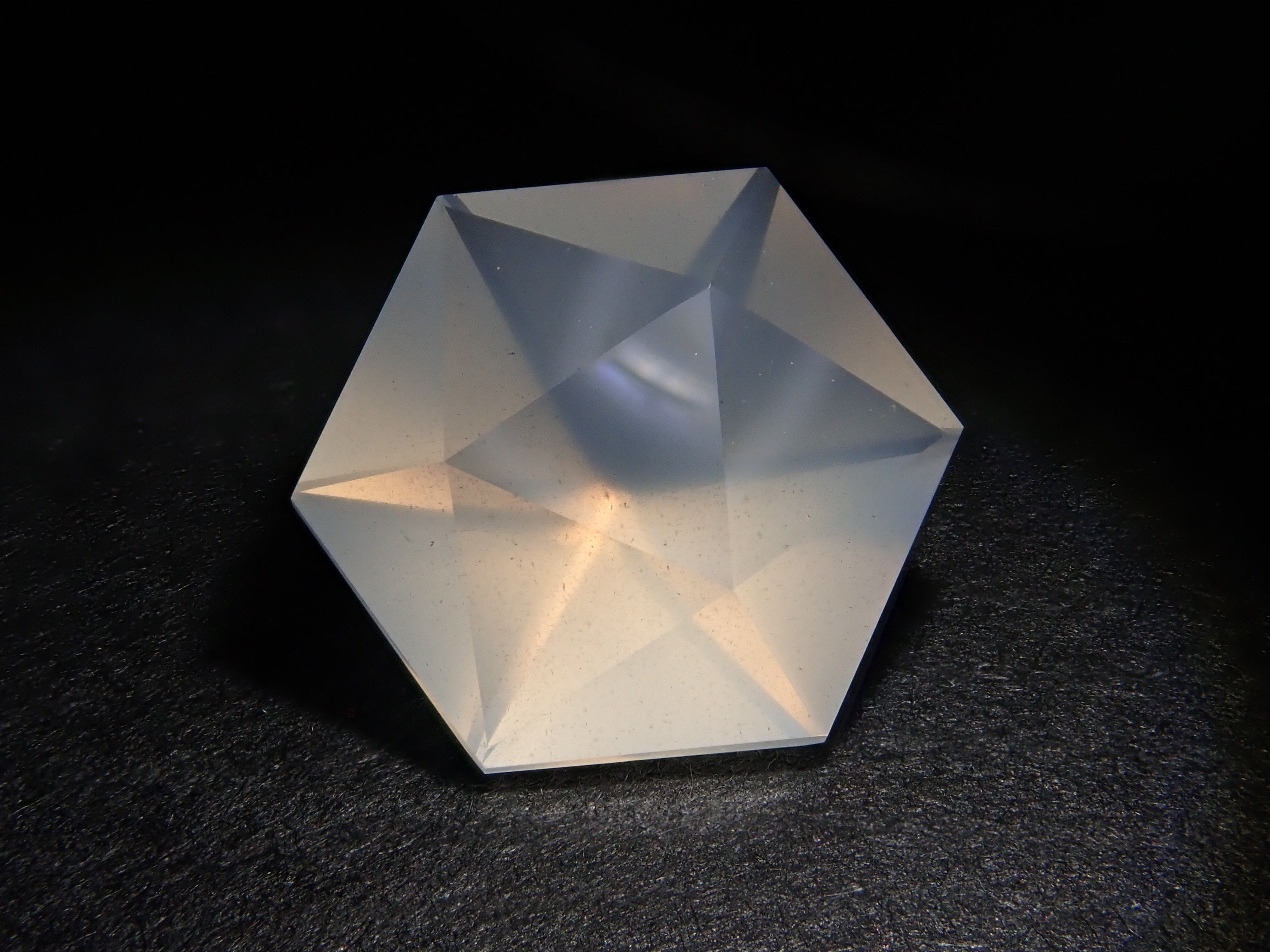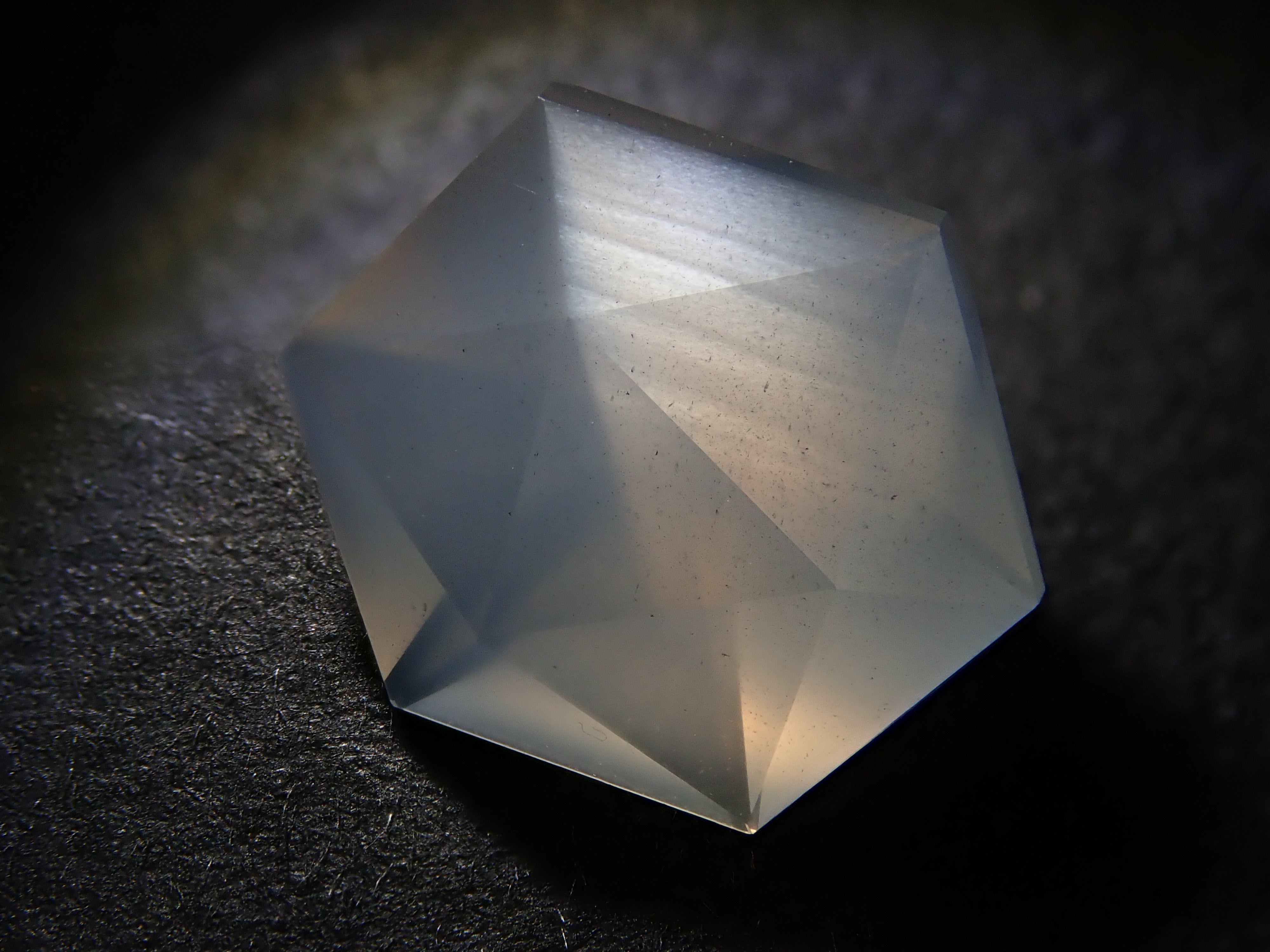一顆看起來像聚光燈的月光石在中間閃閃發光。這種類似月光的明亮光學效果是月光石的標誌。照片是使用筆燈拍攝的。