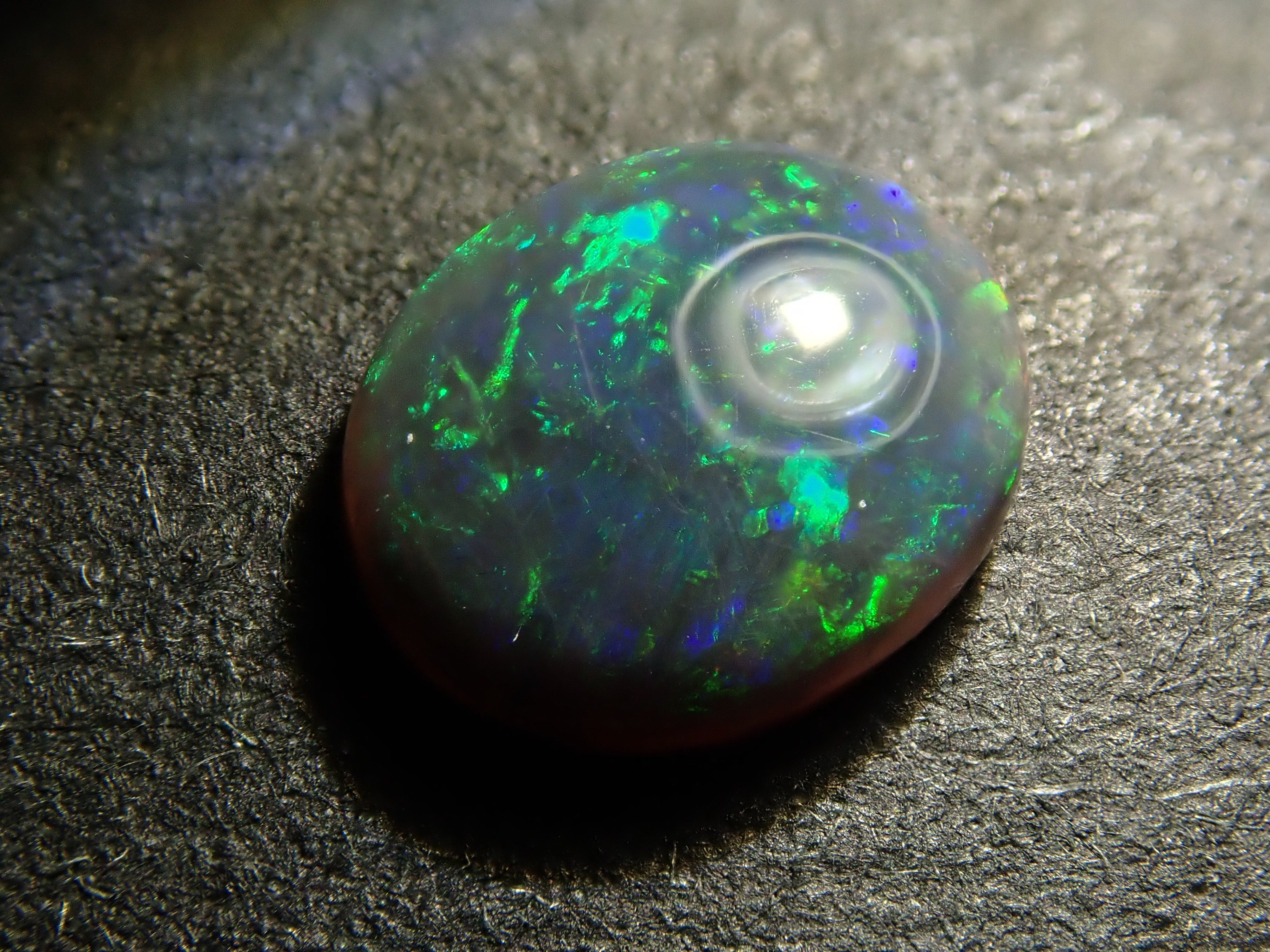 蛋白石是一種以閃爍的彩虹色為特徵的寶石。蛋白石有幾種不同的類型,但黑蛋白石在漆黑一片中閃爍的紅色火焰特別美麗。其背景色可以是黑色、藍色或灰色。這張照片是用筆型電筒拍攝的。