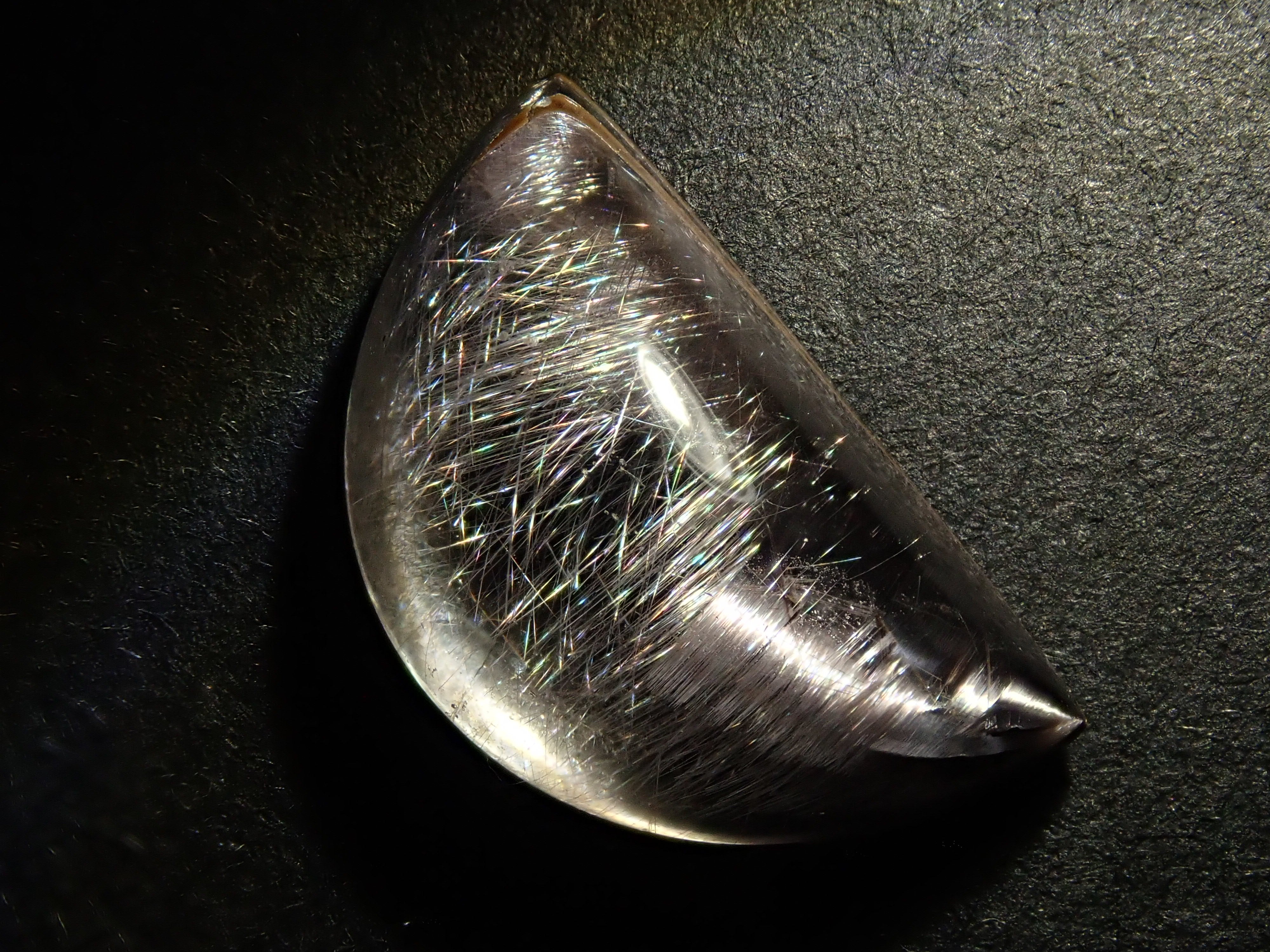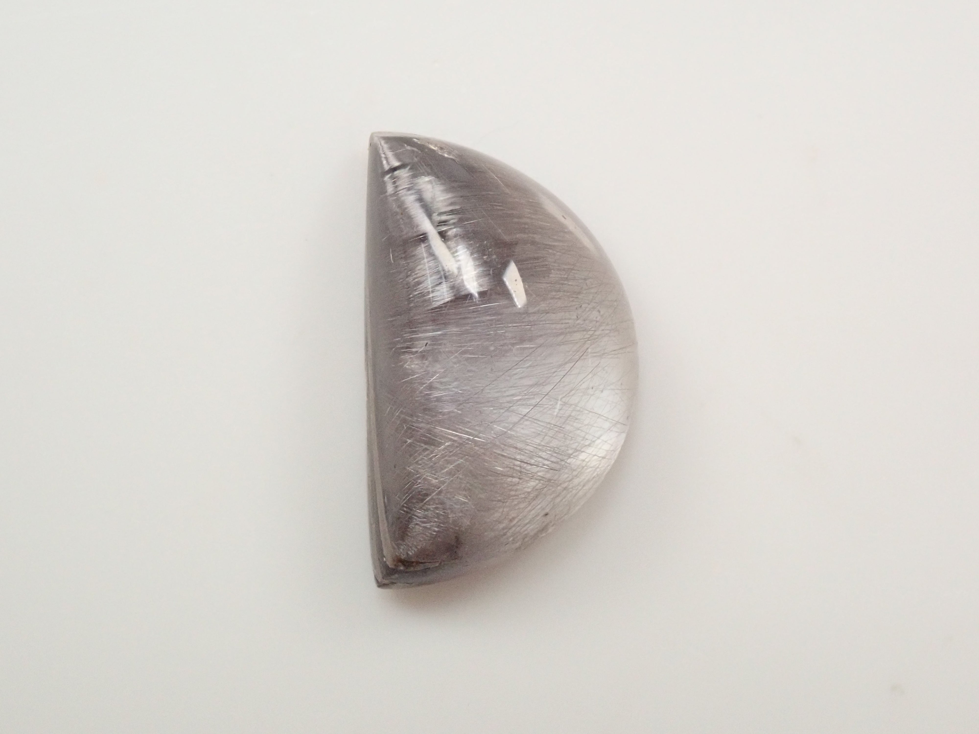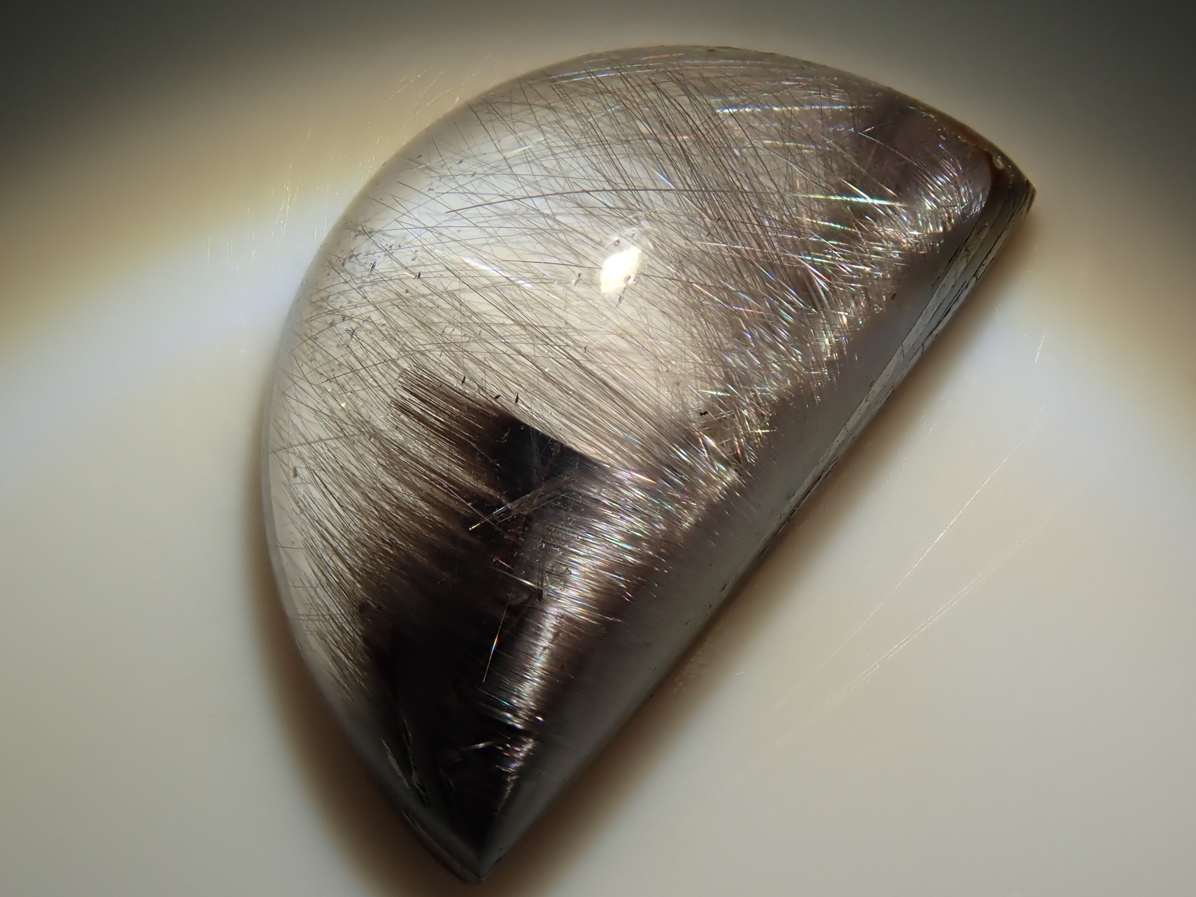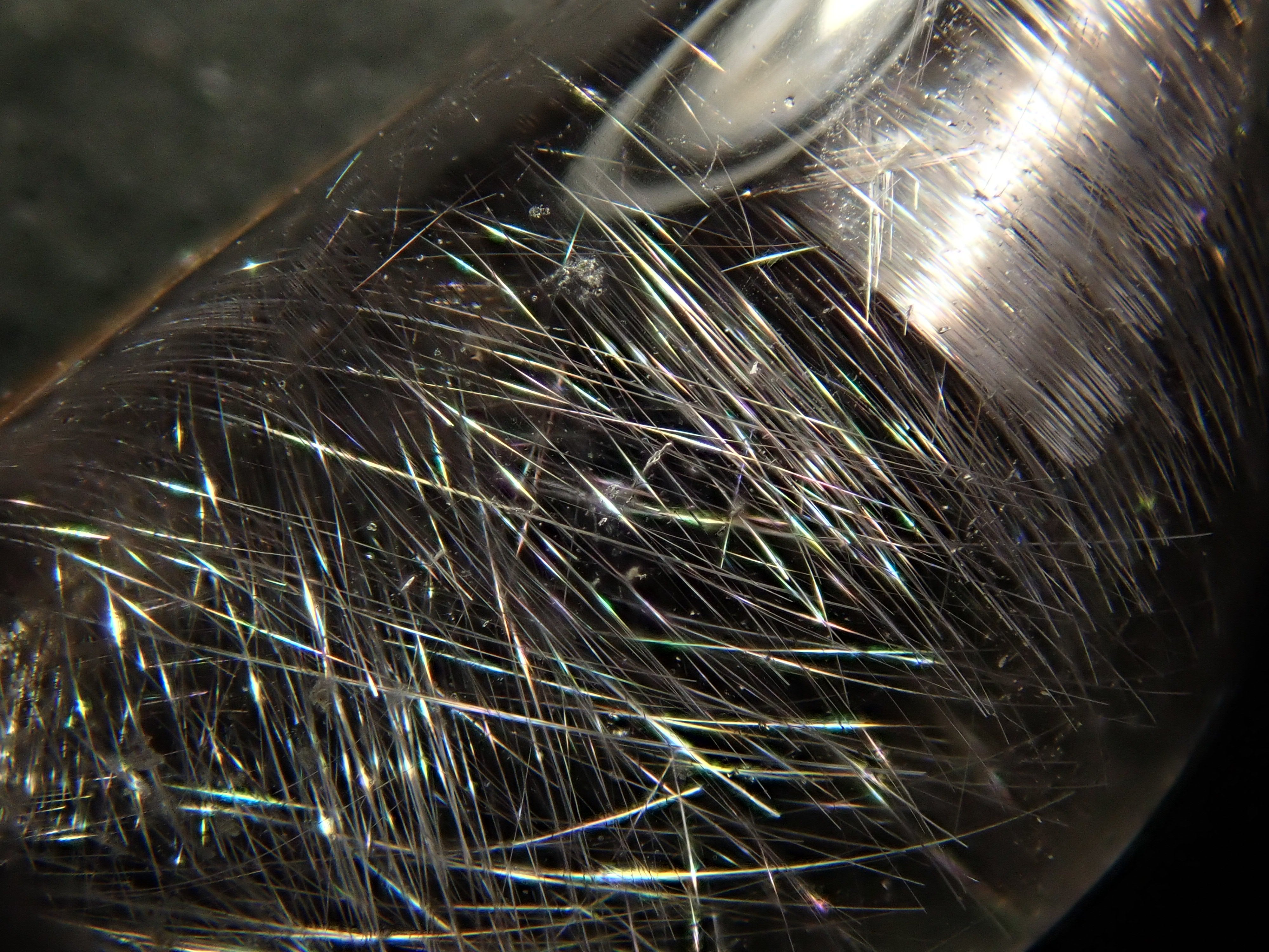 銀色的金紅石石英,又稱「鉑金金紅石石英」。石英結晶時,會與鈦和板鈦礦結合形成寶石。人們會用筆形電筒拍攝,以捕捉內含物閃耀的美麗光芒。這種石英也被稱為板鈦礦石英。
