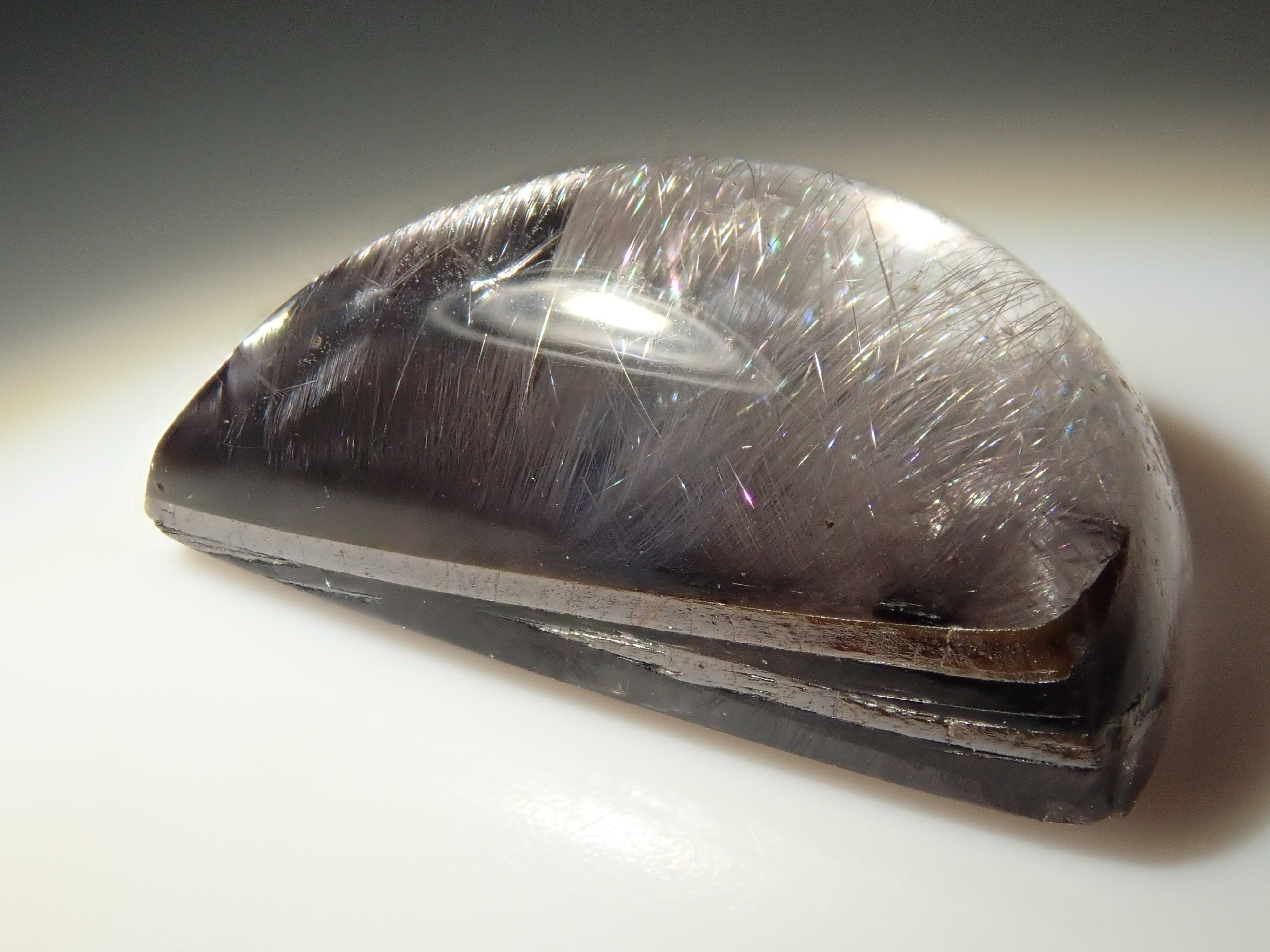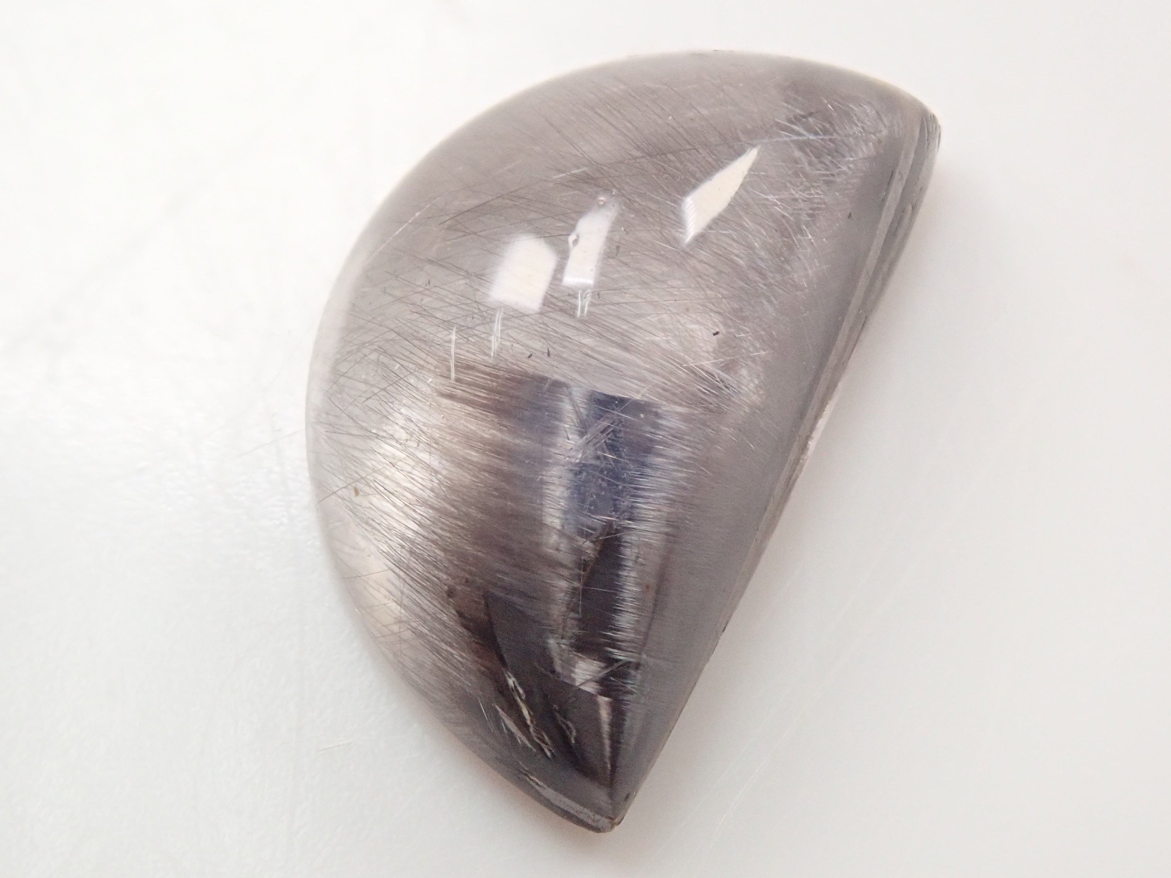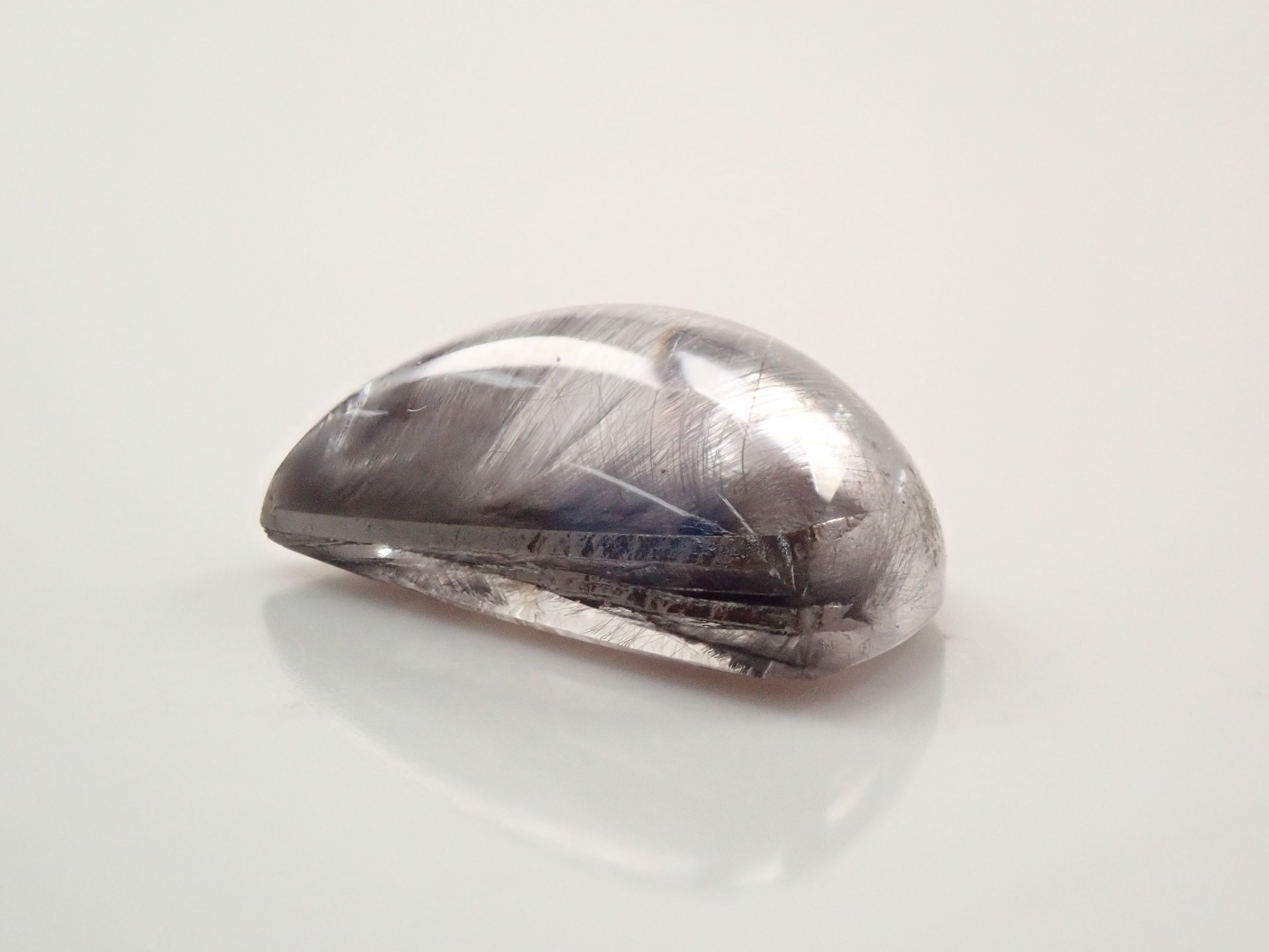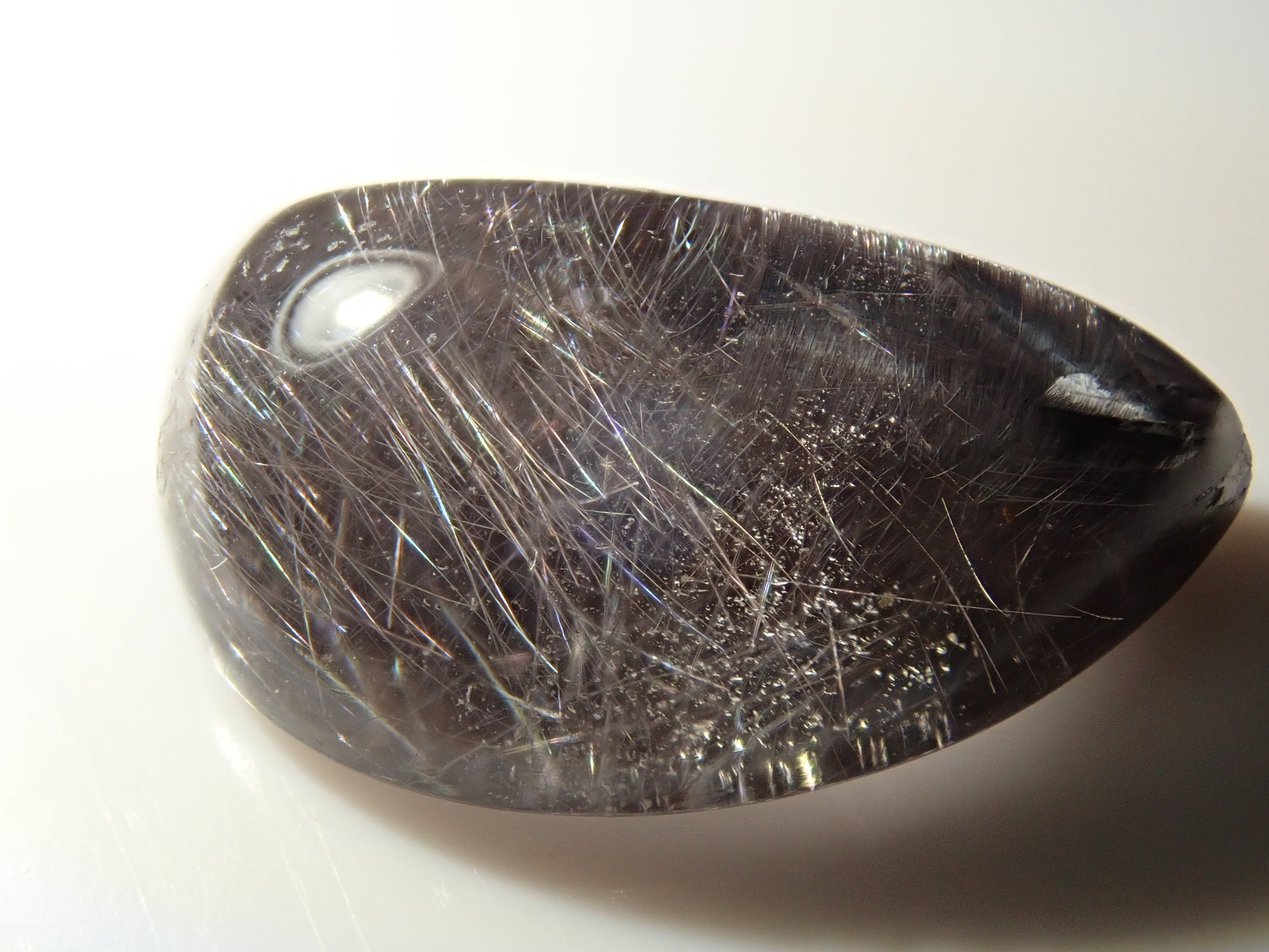 銀色的金紅石石英,又稱「鉑金金紅石石英」。石英結晶時,會與鈦和板鈦礦結合形成寶石。人們會用筆形電筒拍攝,以捕捉內含物閃耀的美麗光芒。這種石英也被稱為板鈦礦石英。
