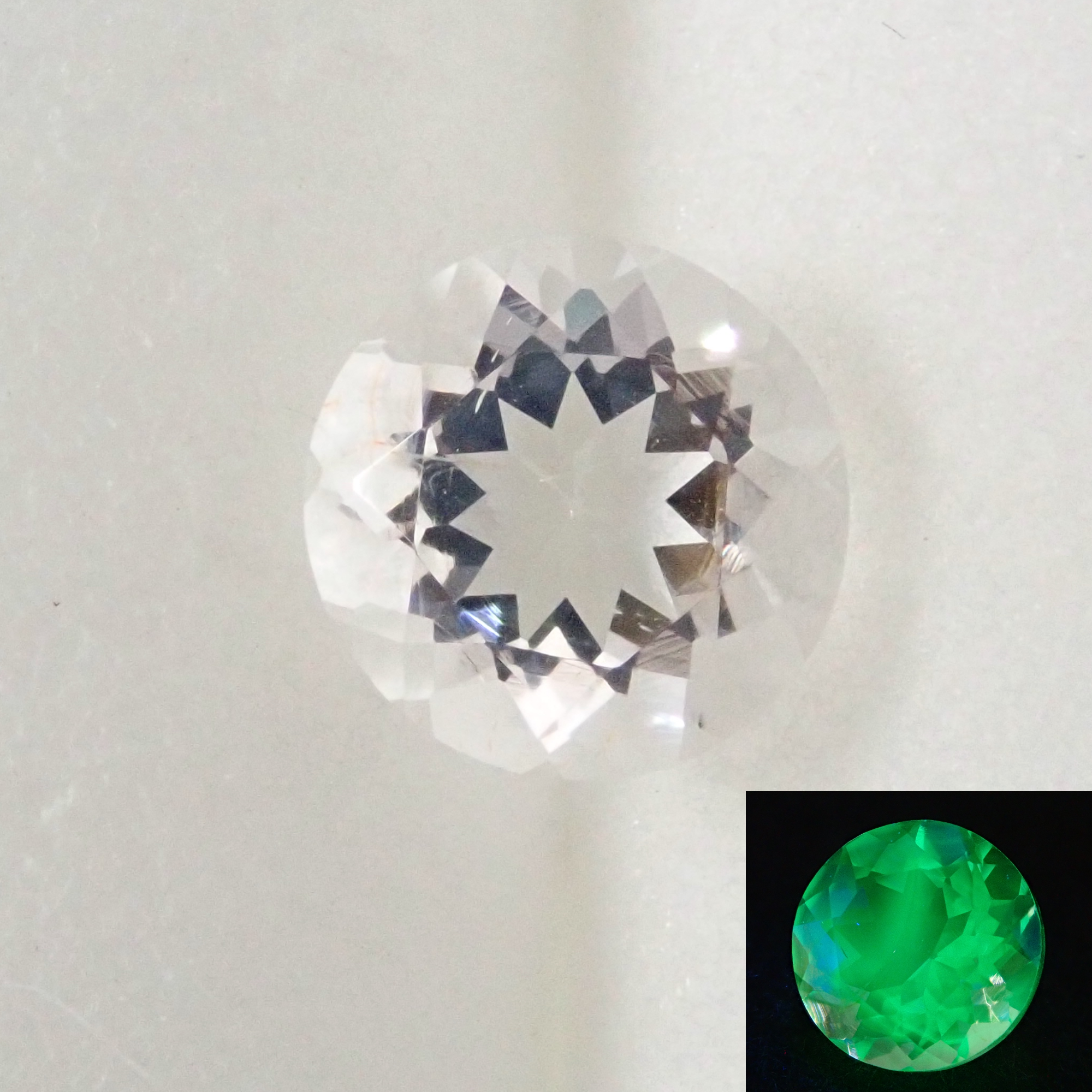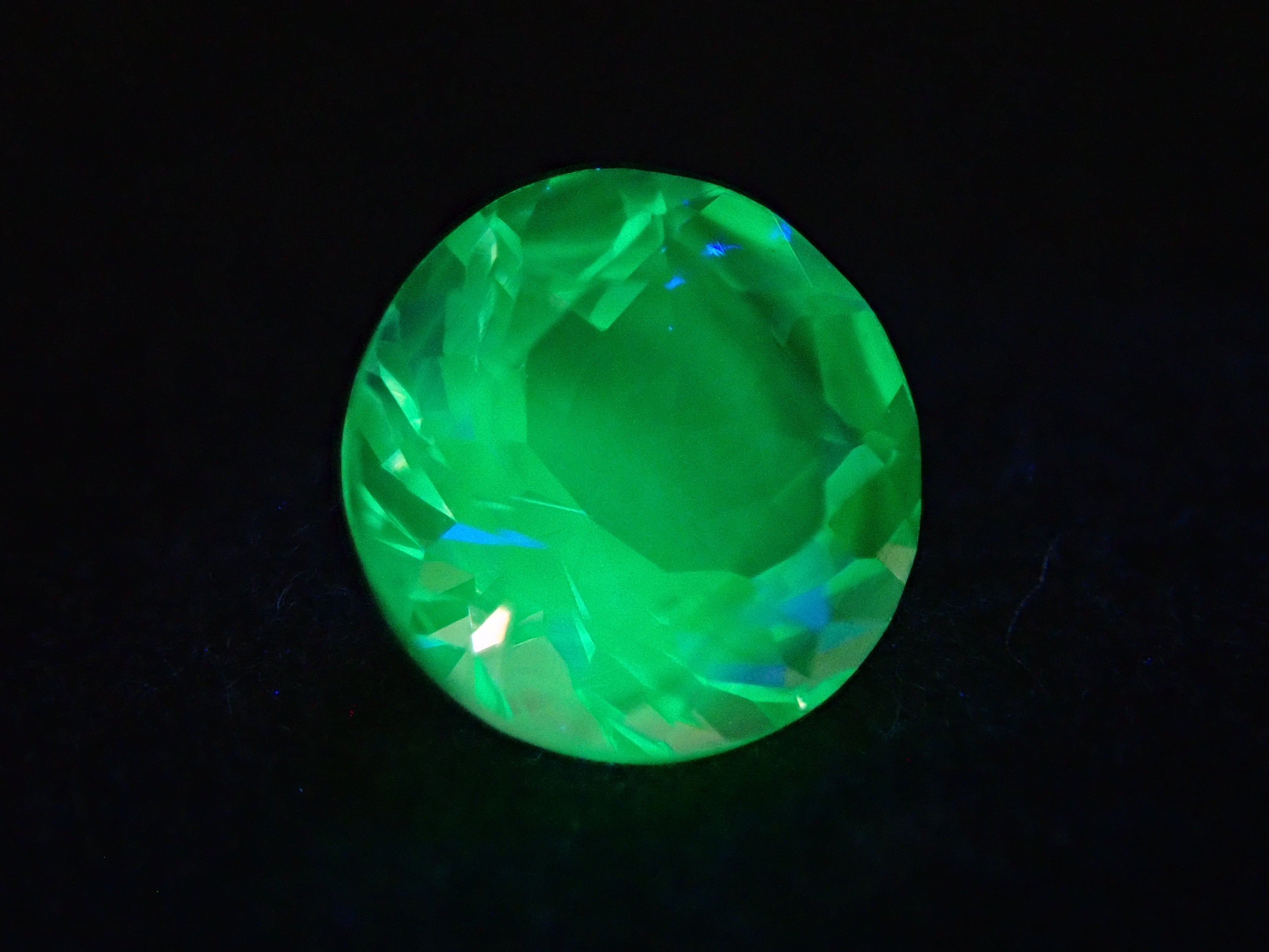 透明蛋白石在黑光下會發出薄荷綠的螢光。它是一種稀有寶石。顧名思義,它在礦物學上屬於蛋白石家族,但沒有變色現象。請使用黑光燈欣賞螢光。