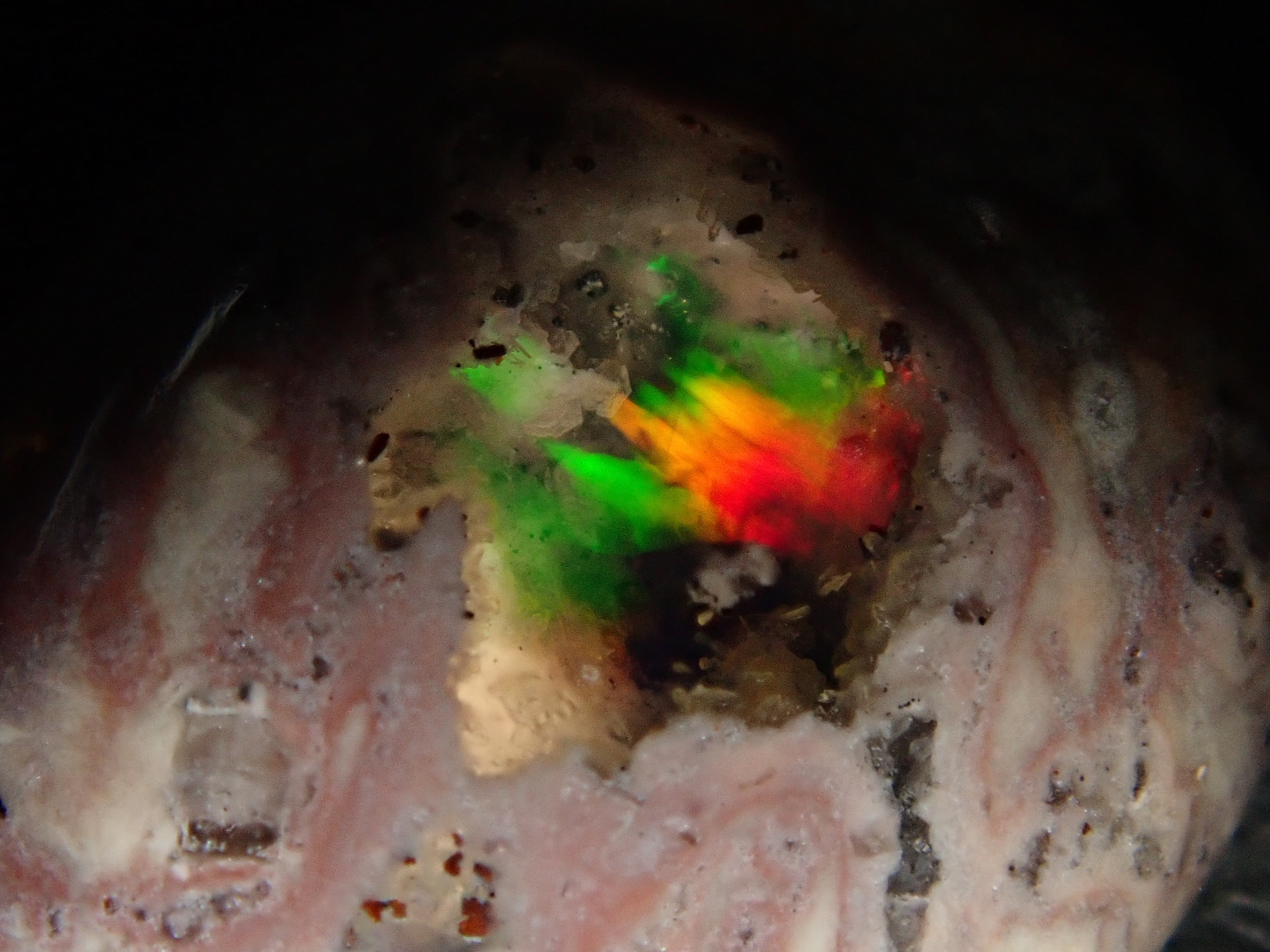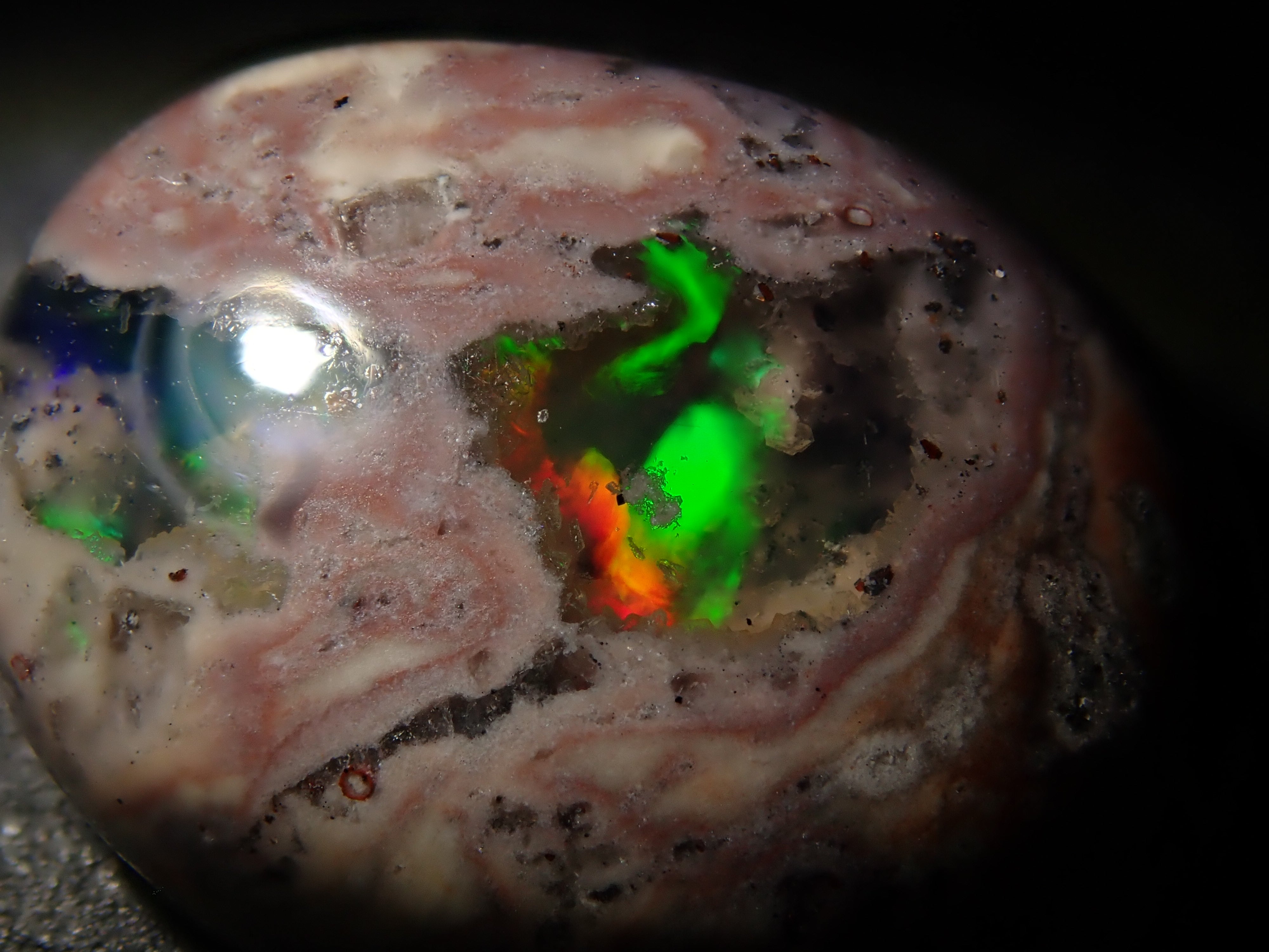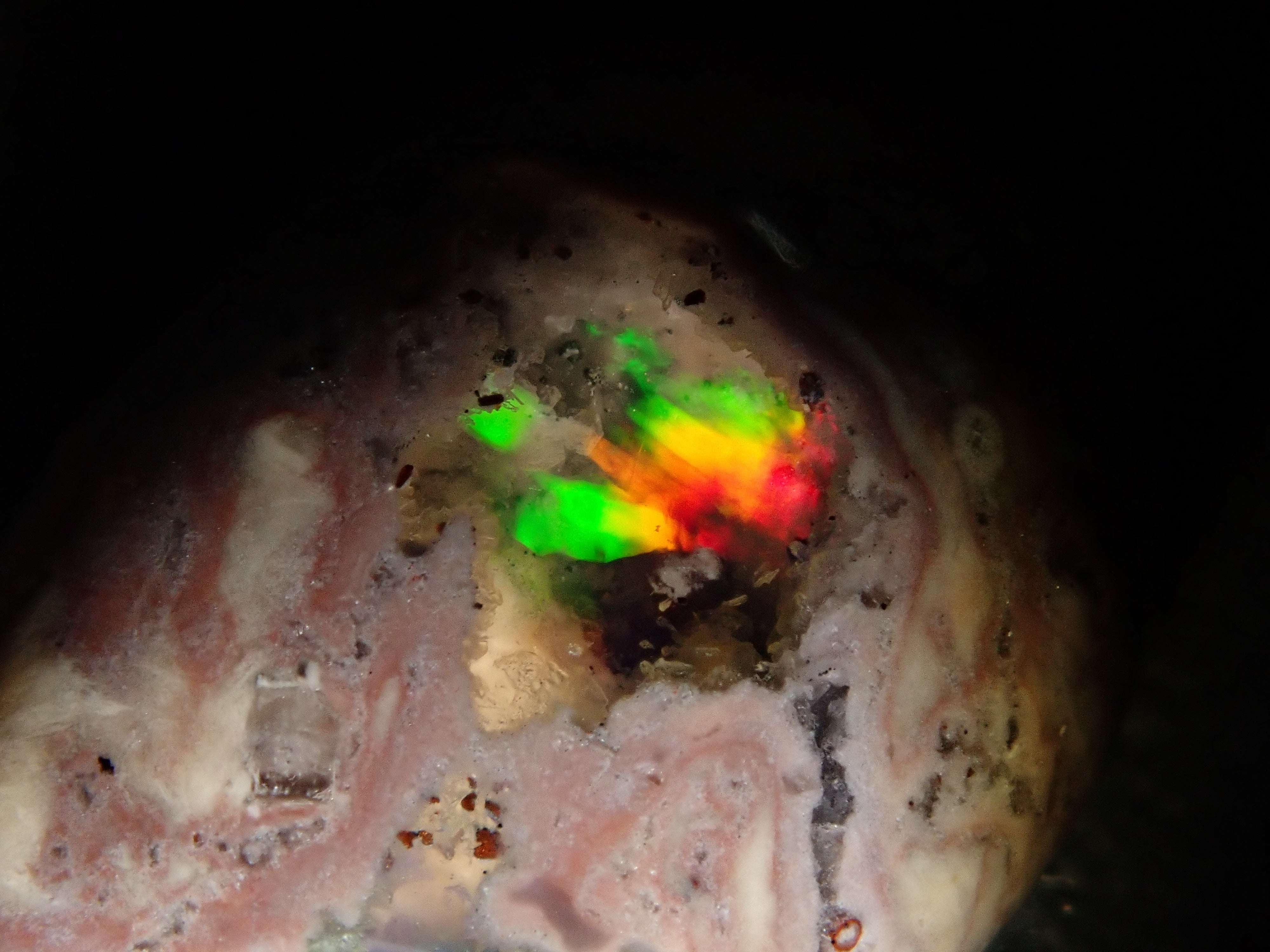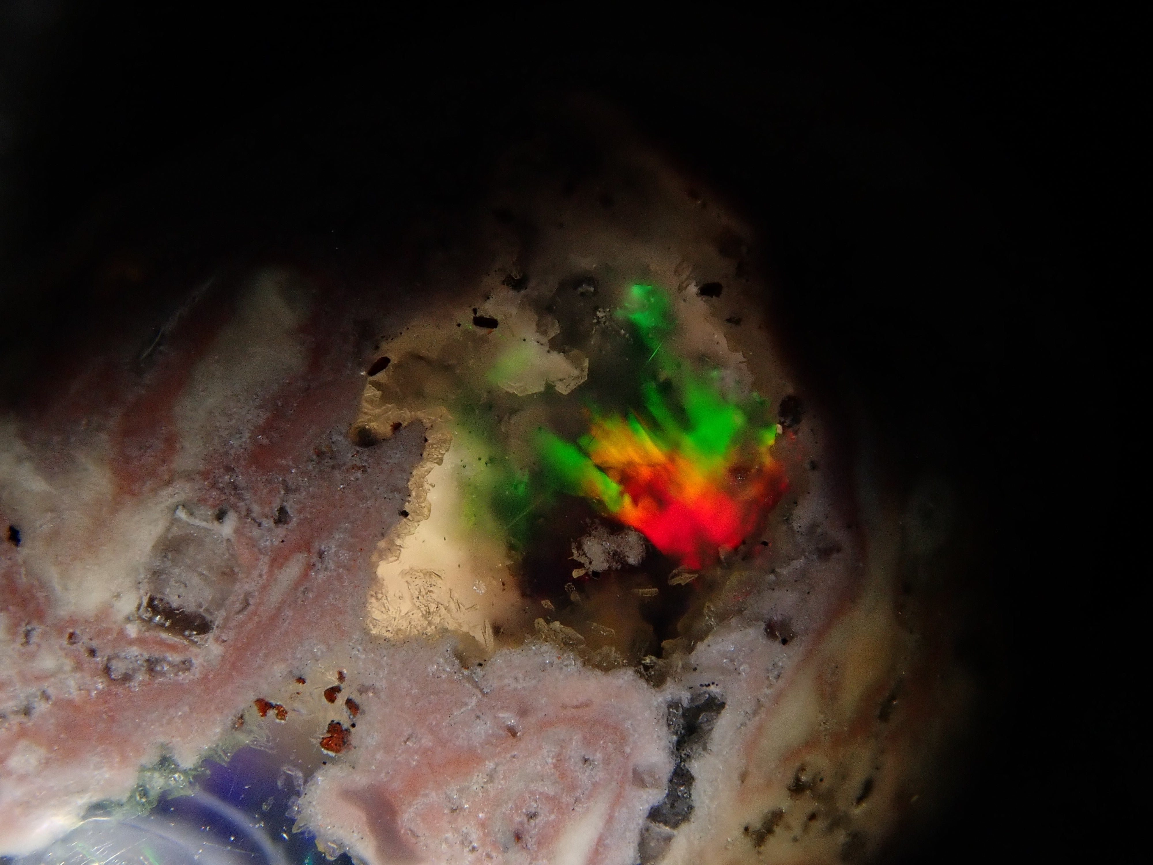 Cantera 蛋白石原本是一種有許多環的寶石。照片是使用筆燈拍攝的。