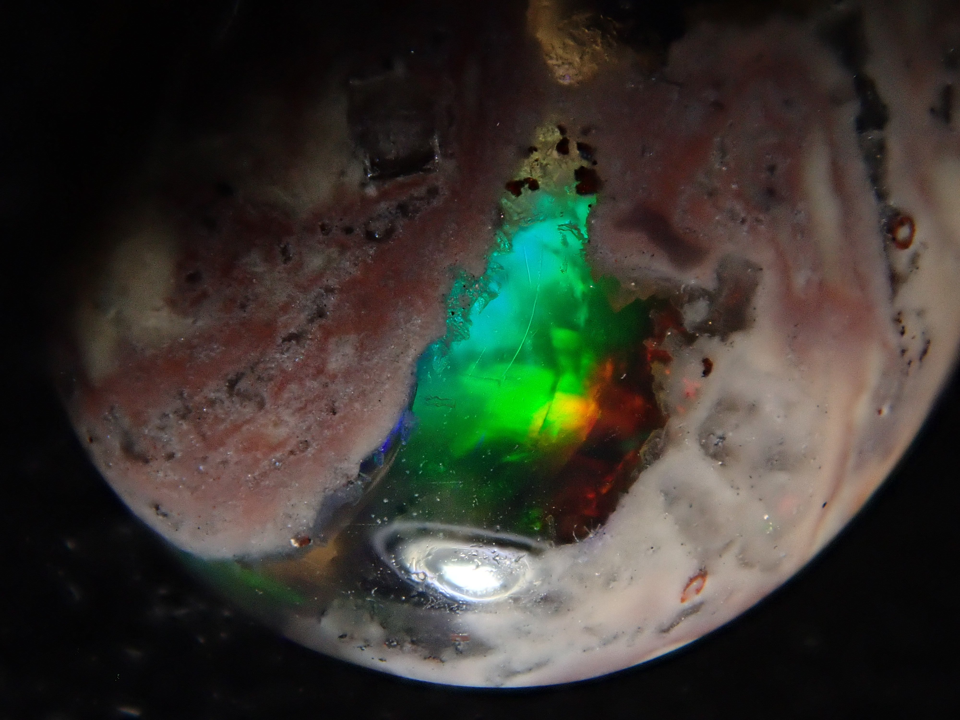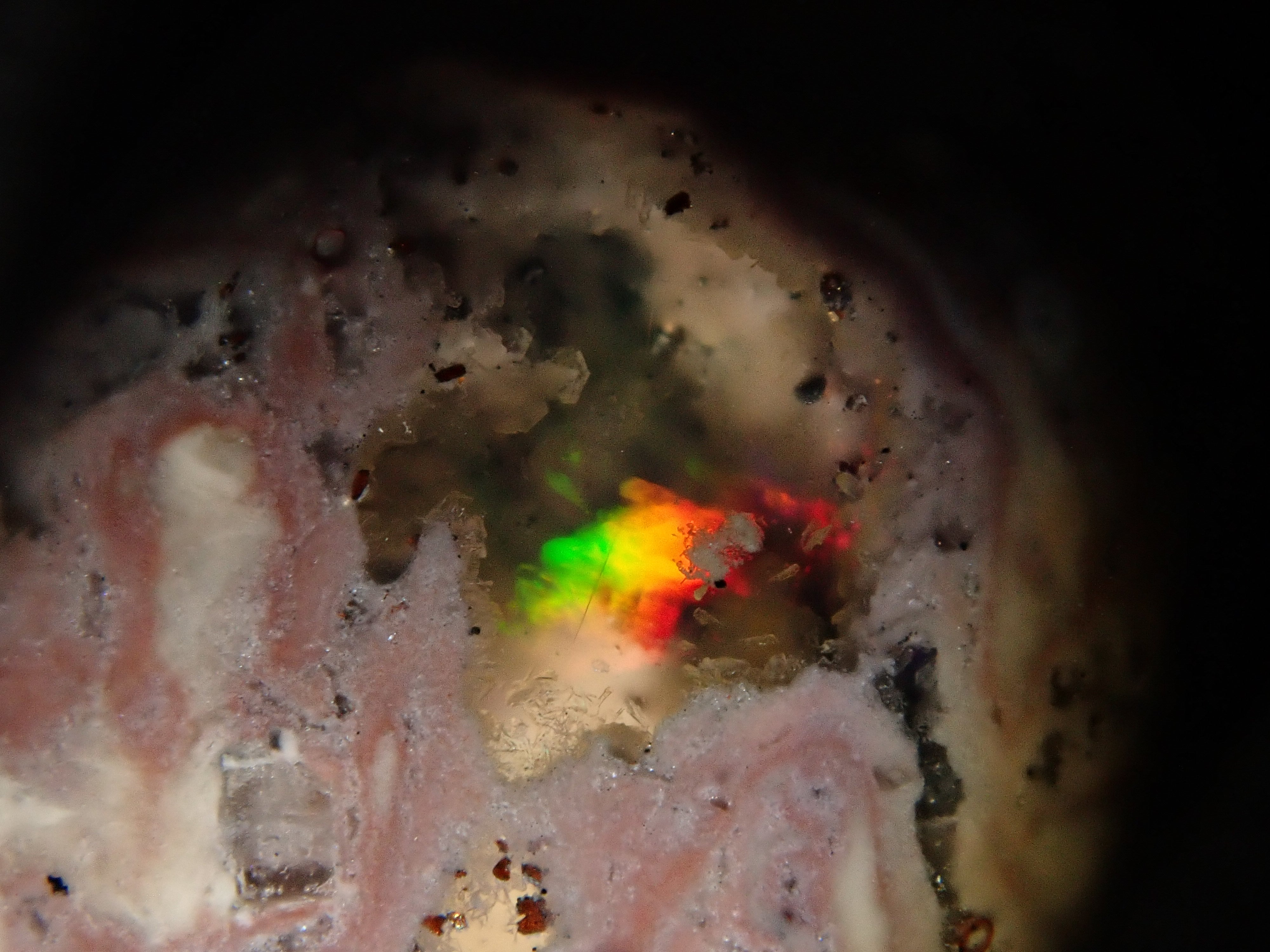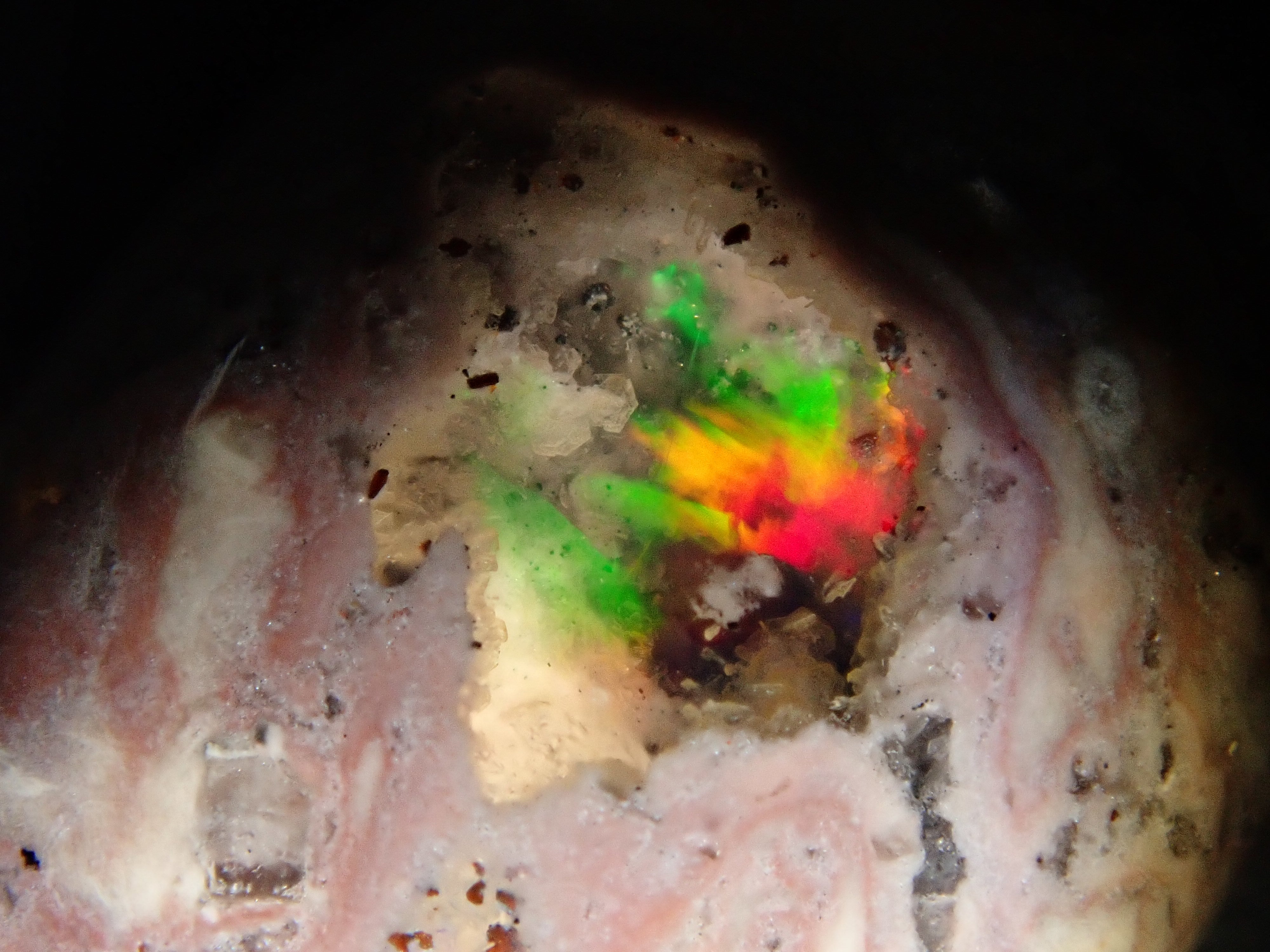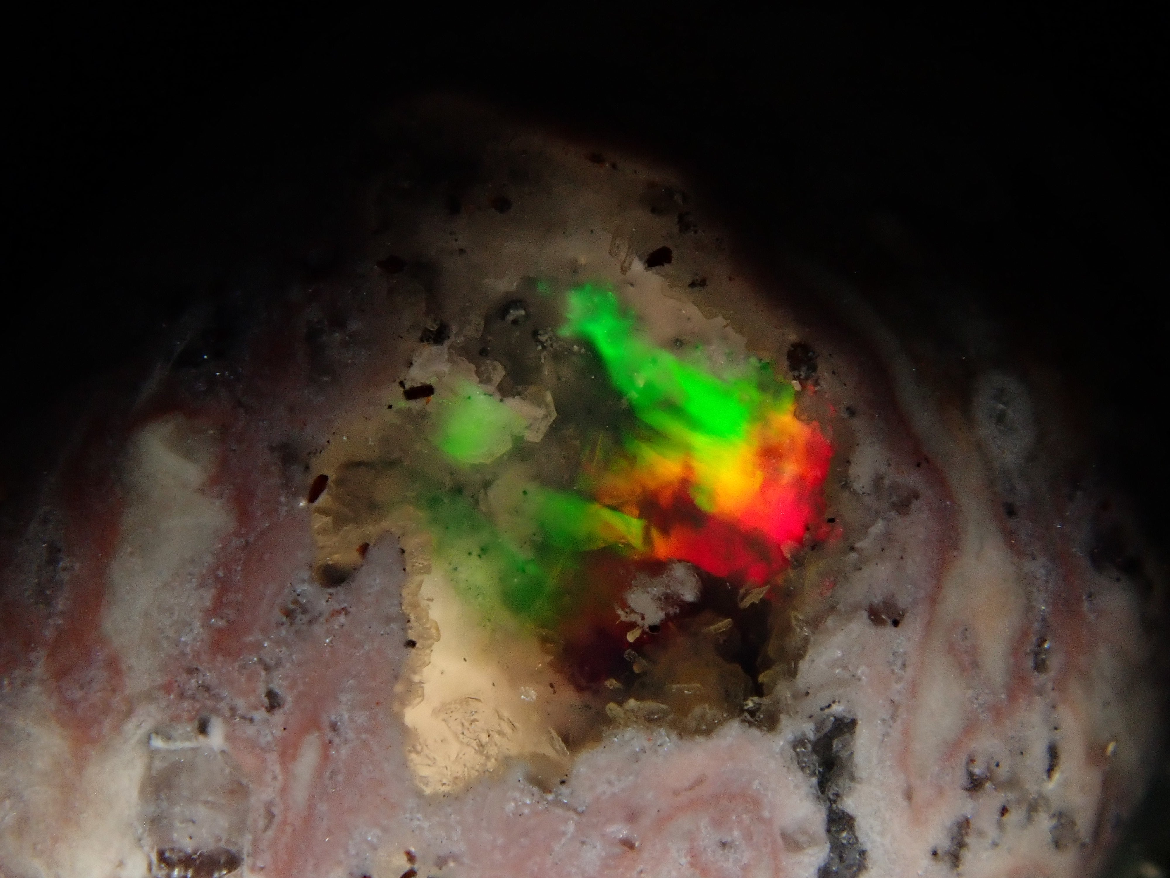 Cantera 蛋白石原本是一種有許多環的寶石。照片是使用筆燈拍攝的。