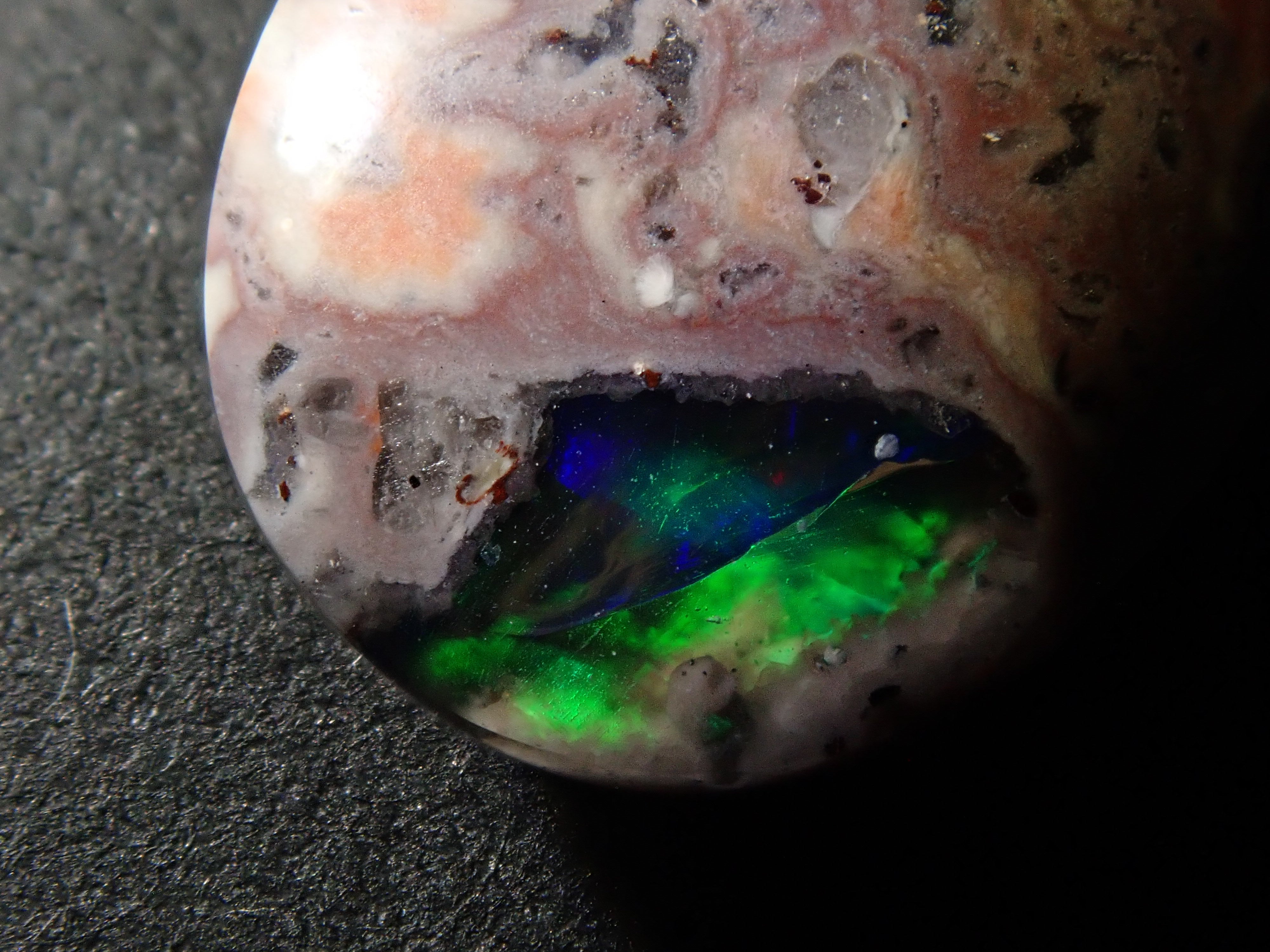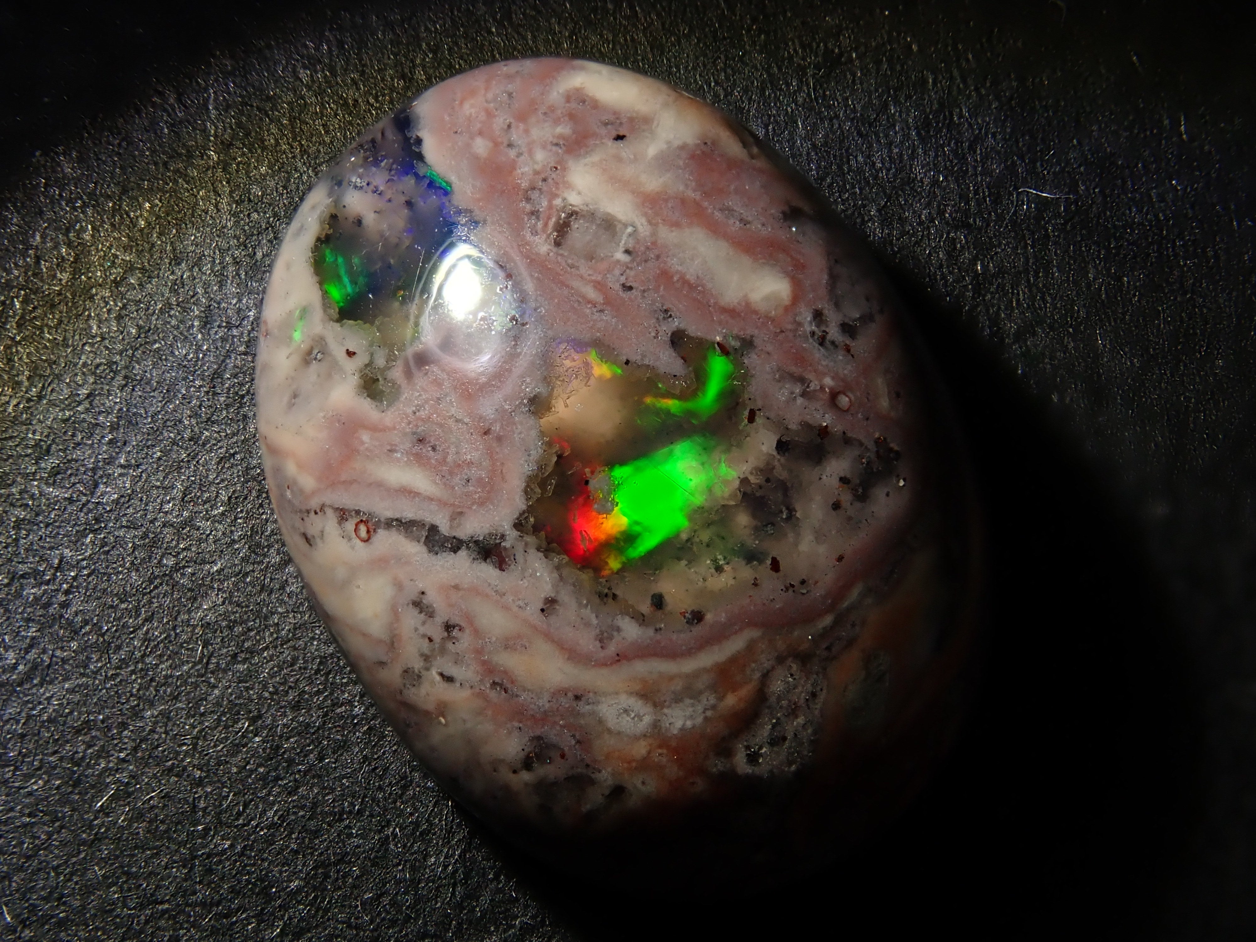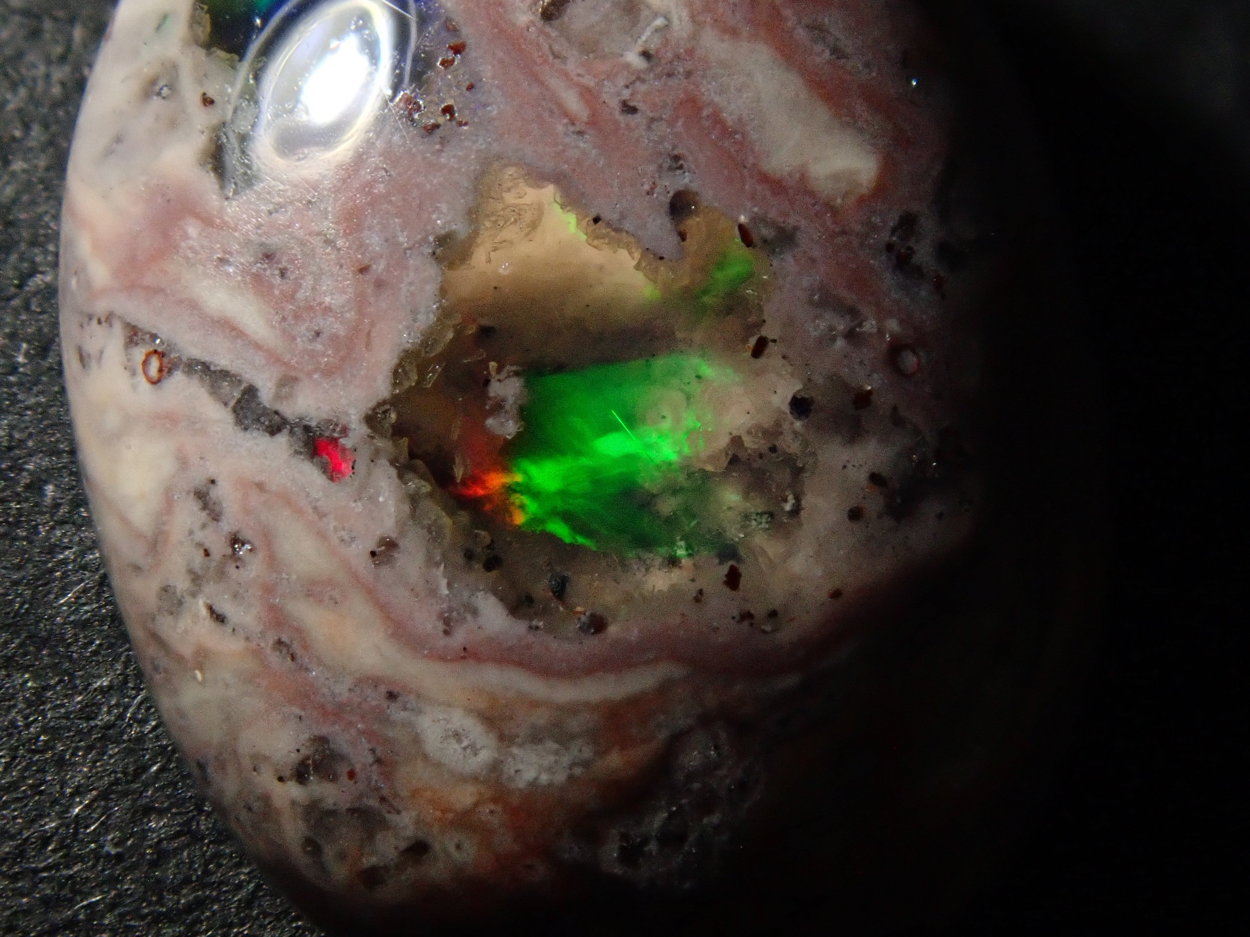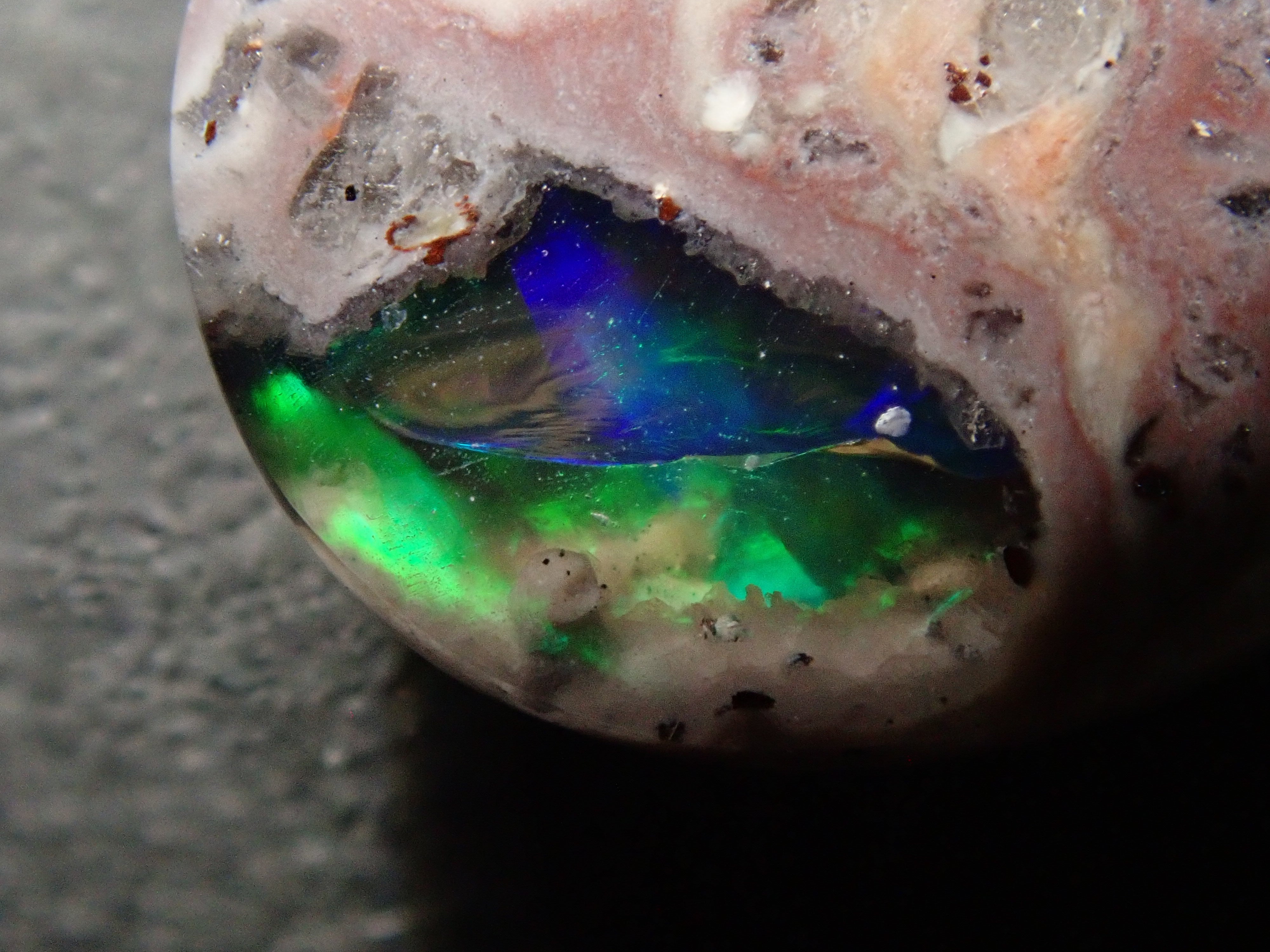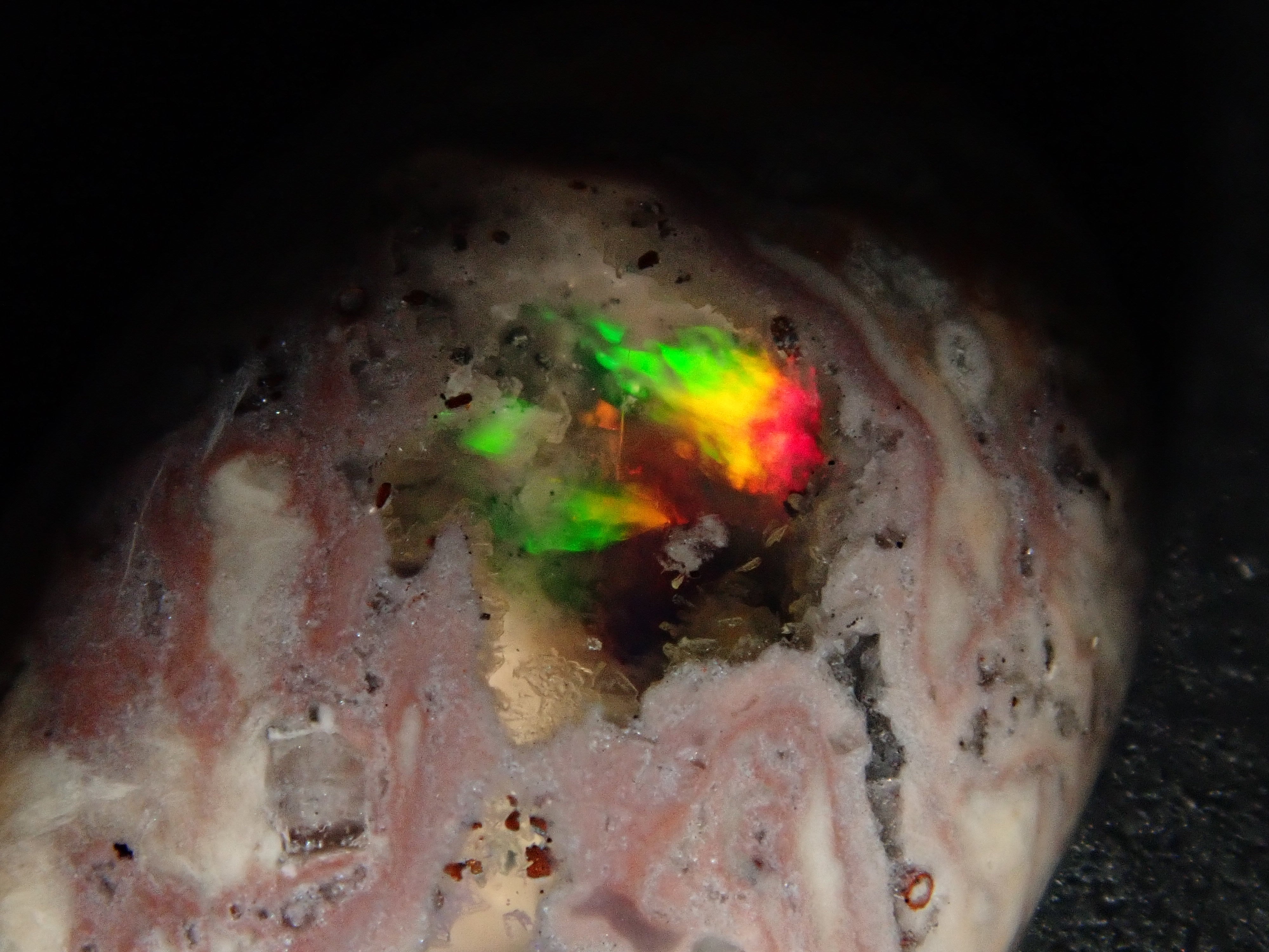 Cantera 蛋白石原本是一種有許多環的寶石。照片是使用筆燈拍攝的。