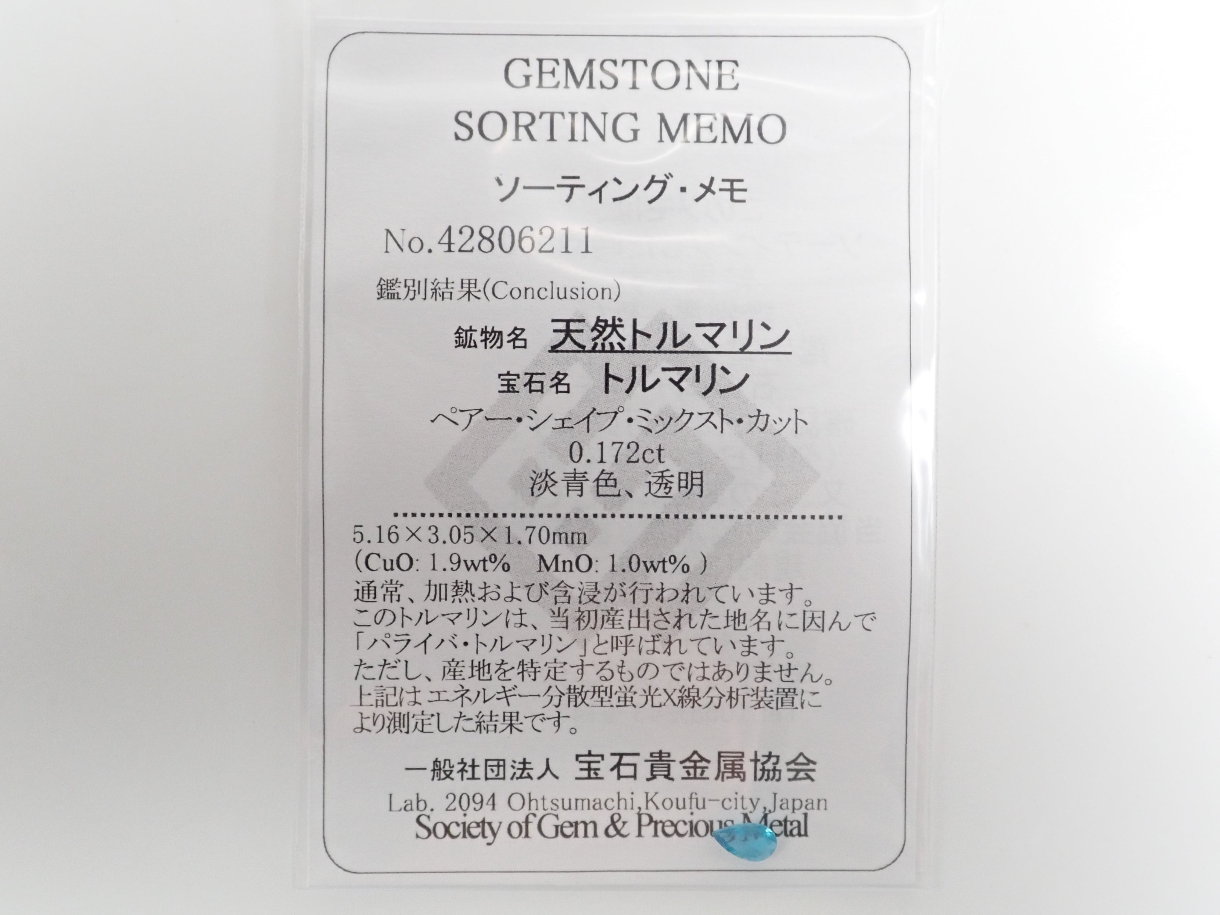 這是從巴西珠寶商購買的一塊舊帕拉伊巴碧璽。這顆巴西帕拉伊巴碧璽的CuO含量為1.9%,MnO含量為1.0%。