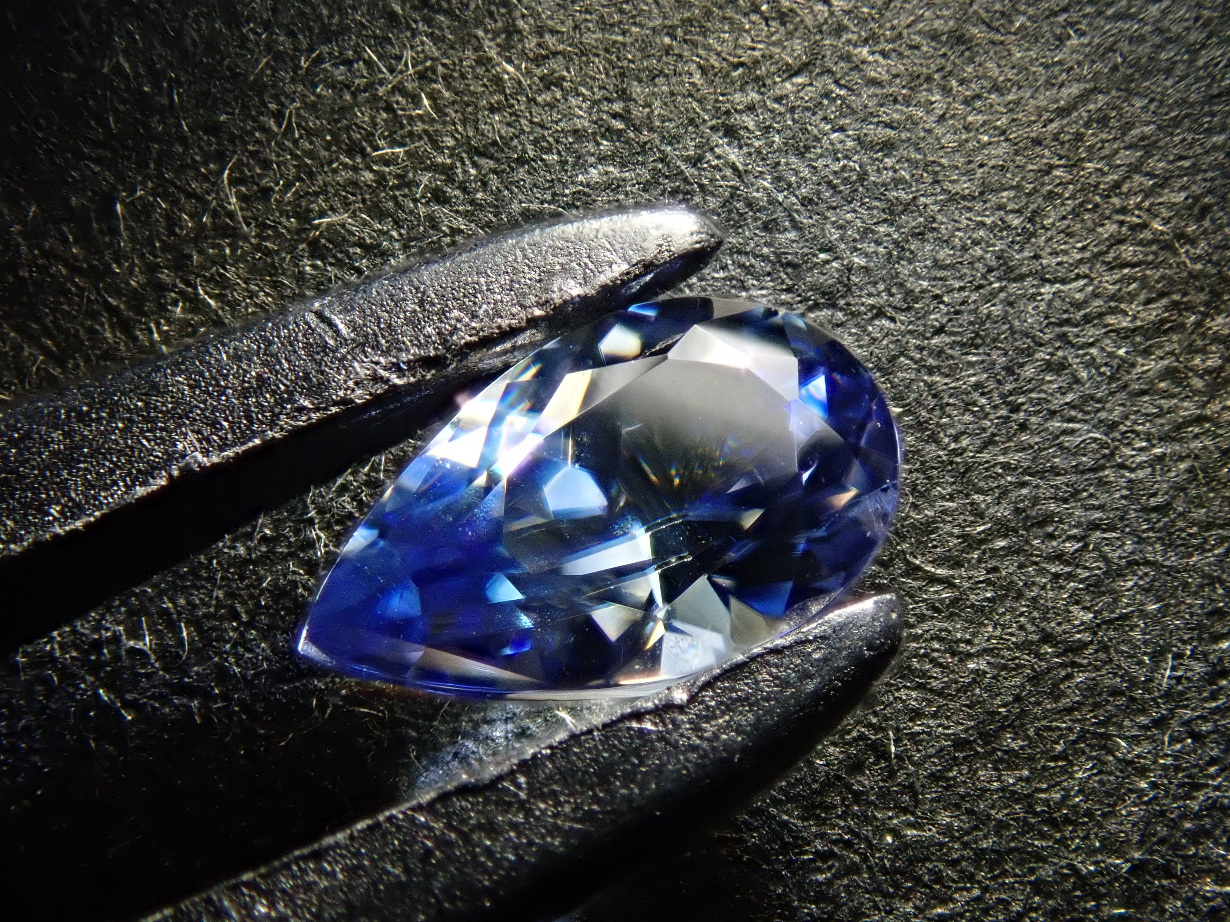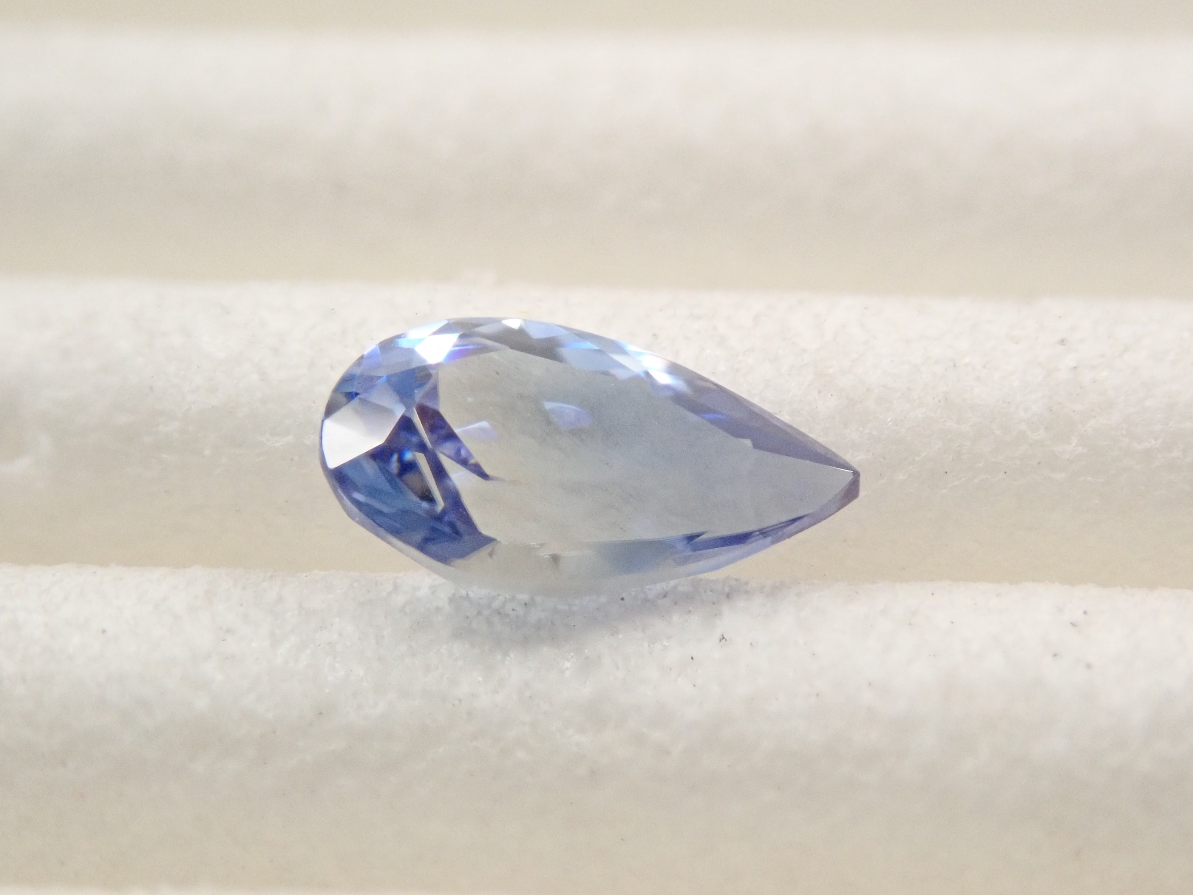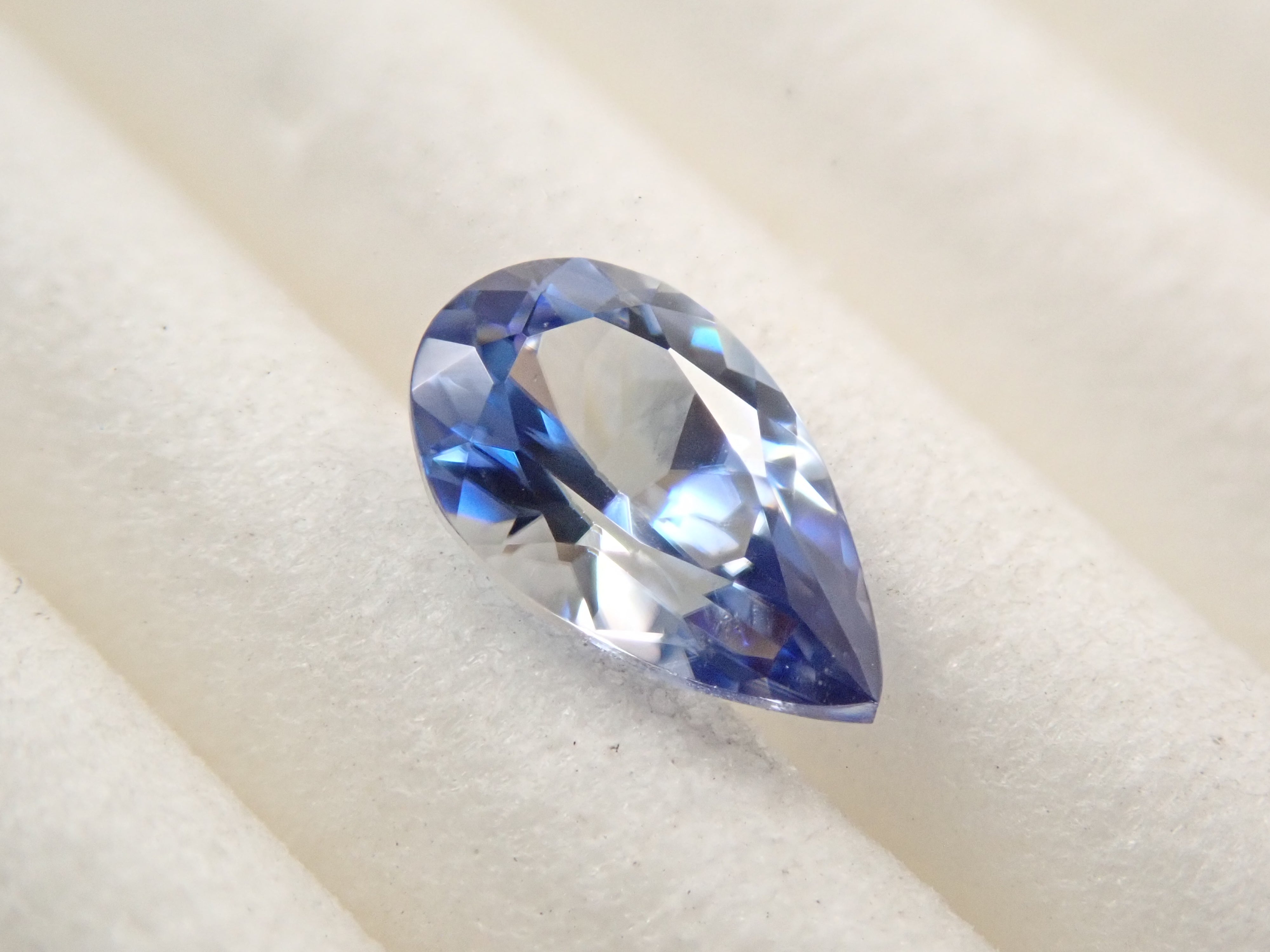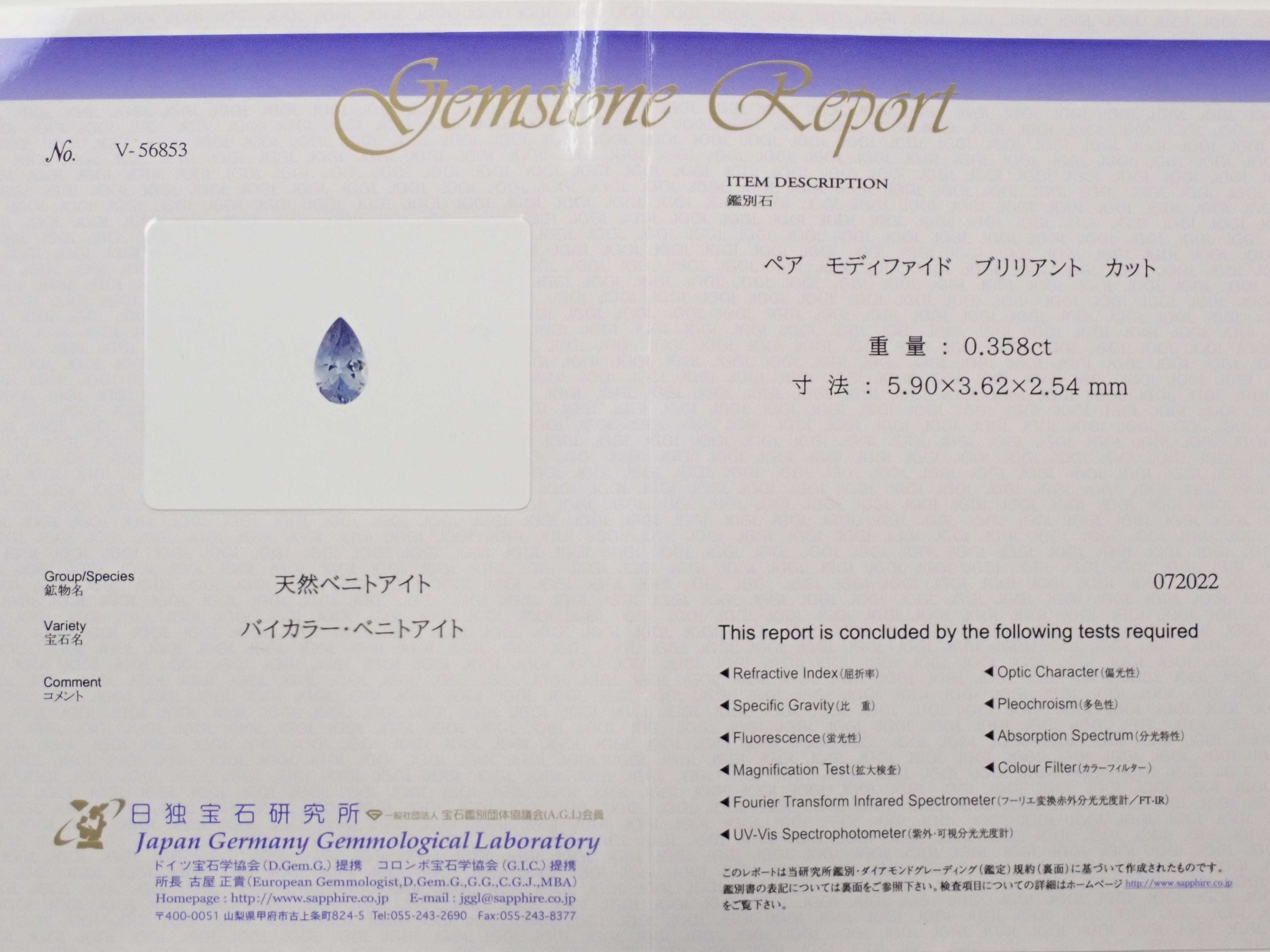 藍錐礦據說是美國三大稀有寶石之一。它是一種充滿寶石魅力的石頭,擁有鑽石般的強烈光澤和藍寶石般美麗的藍色。據說是1900年代在加州聖貝尼托河附近發現的,其特徵是光色散力強。這是藍錐礦中罕見的雙色藍錐礦。最大放大倍率為 44 倍,包裹體清晰可見,但這是一種高品質的藍錐礦,透明度高,肉眼難以察覺。附有日德寶石研究所頒發的鑑定證書。