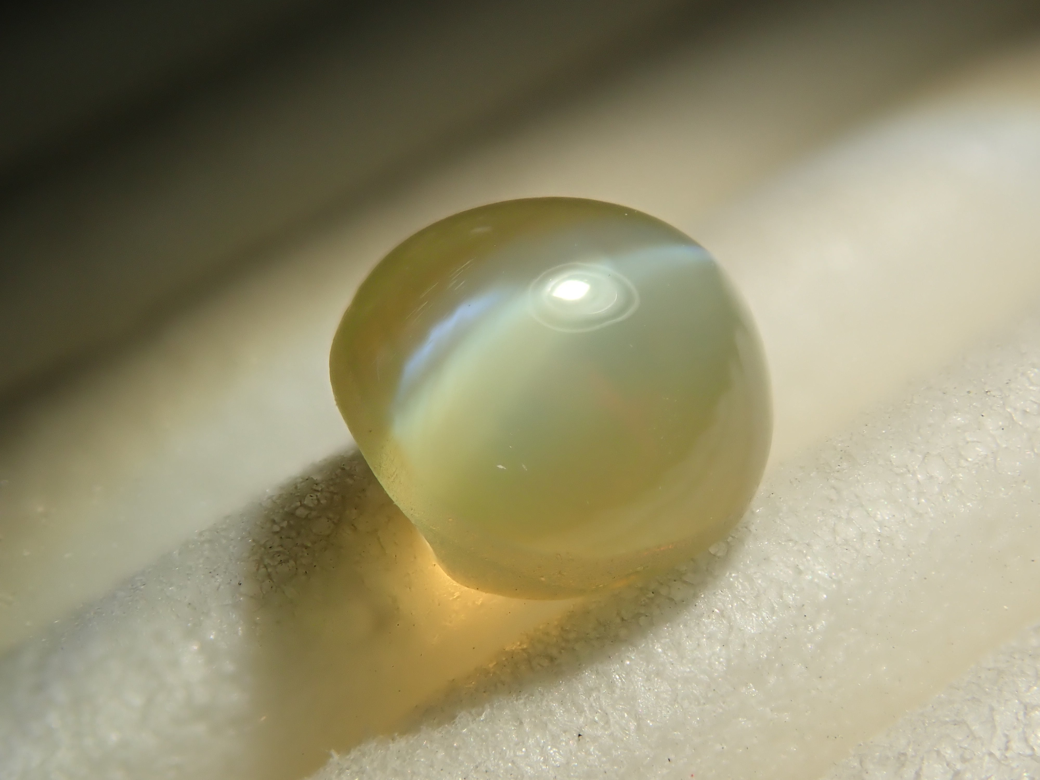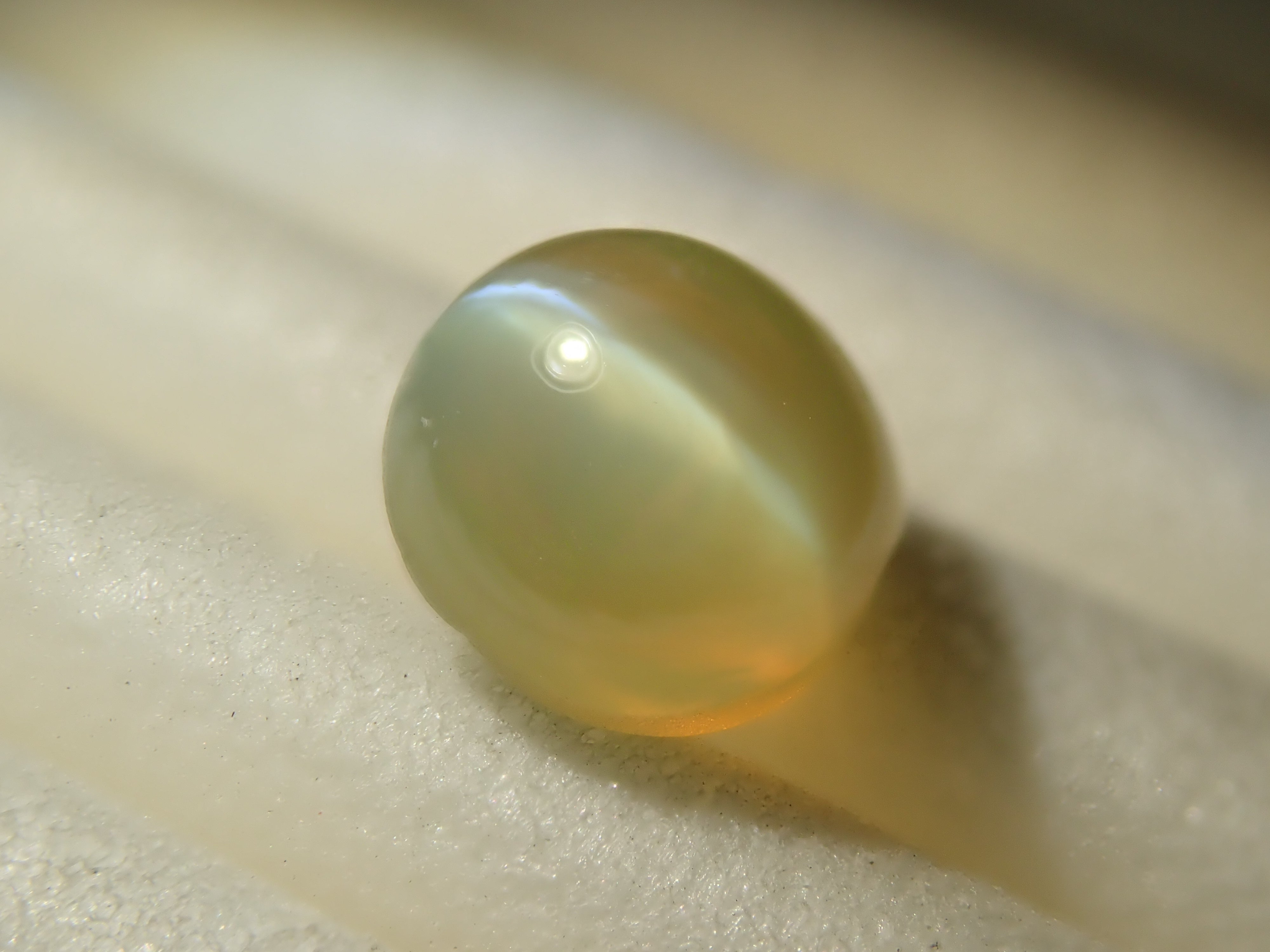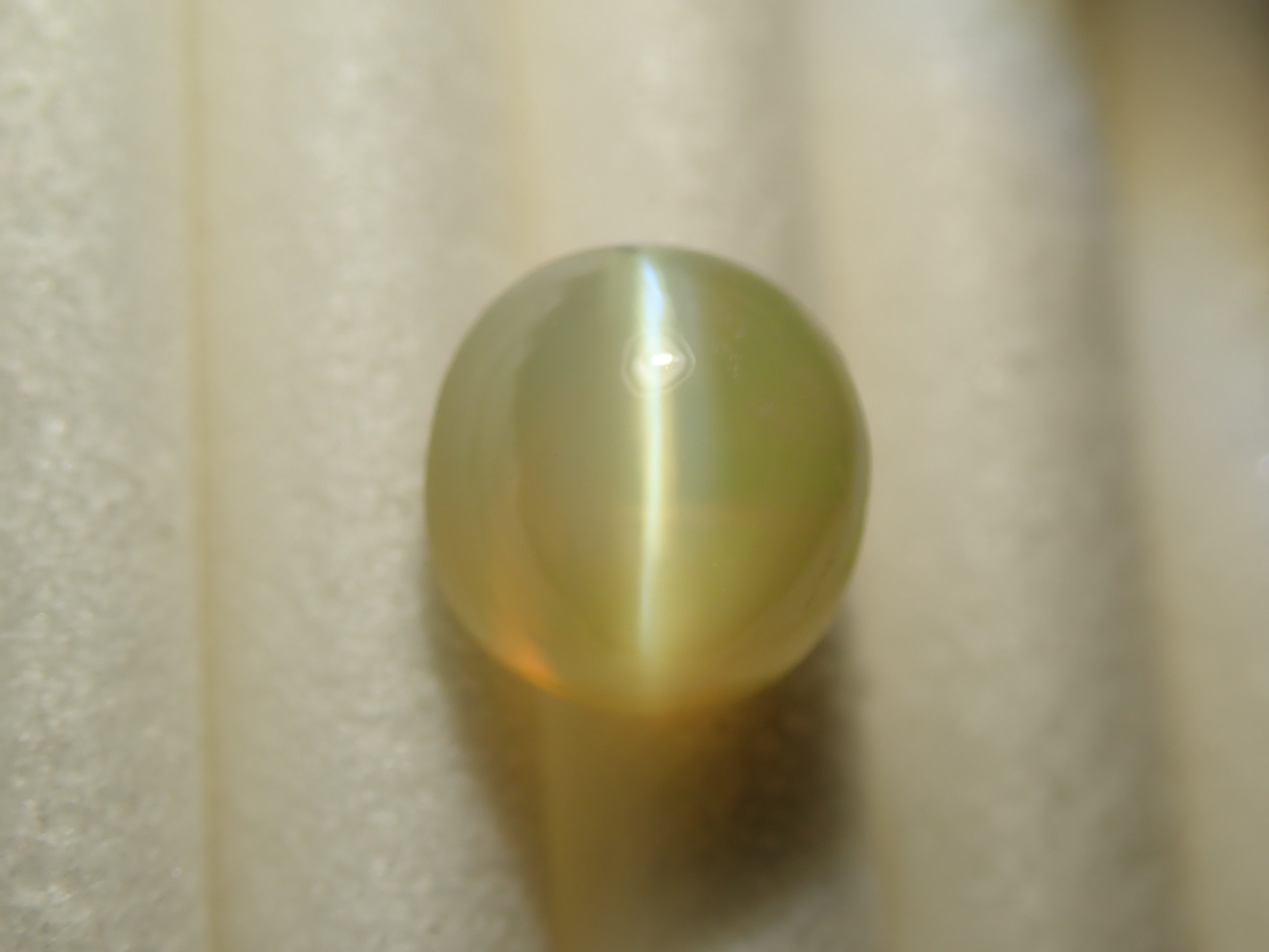 金綠玉的顏色多種多樣,從淺黃色到綠色再到深棕色。它是一種堅硬耐用的寶石。這顆寶石呈現貓眼效果,照片是用筆型手電筒拍攝的。寶石背面通常未經拋光。