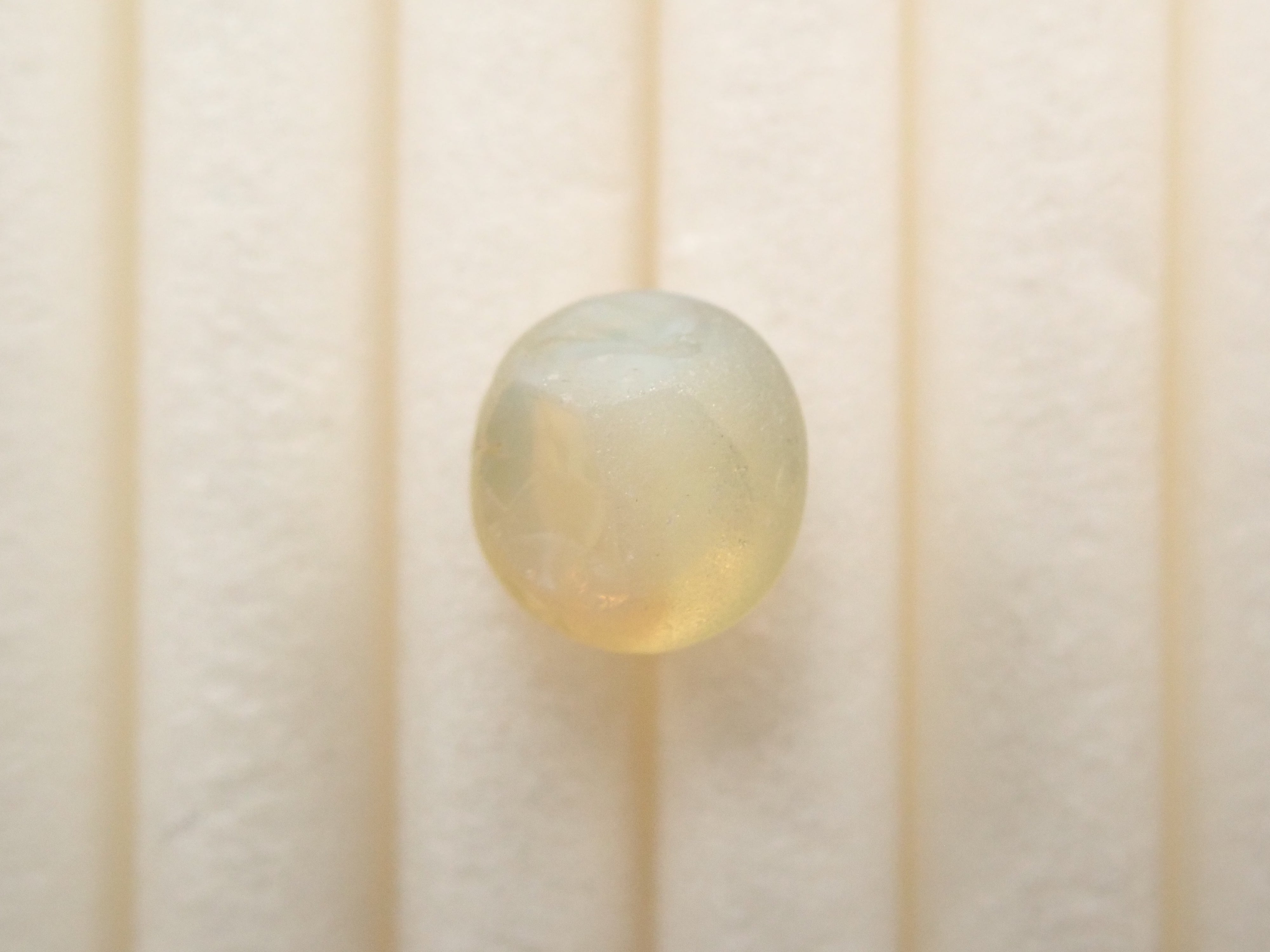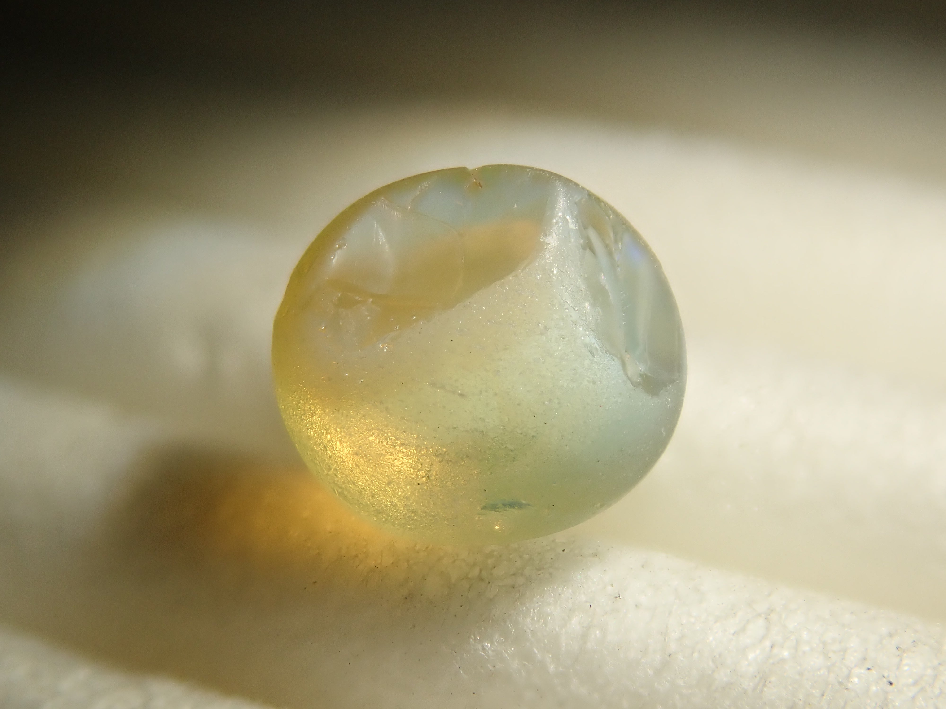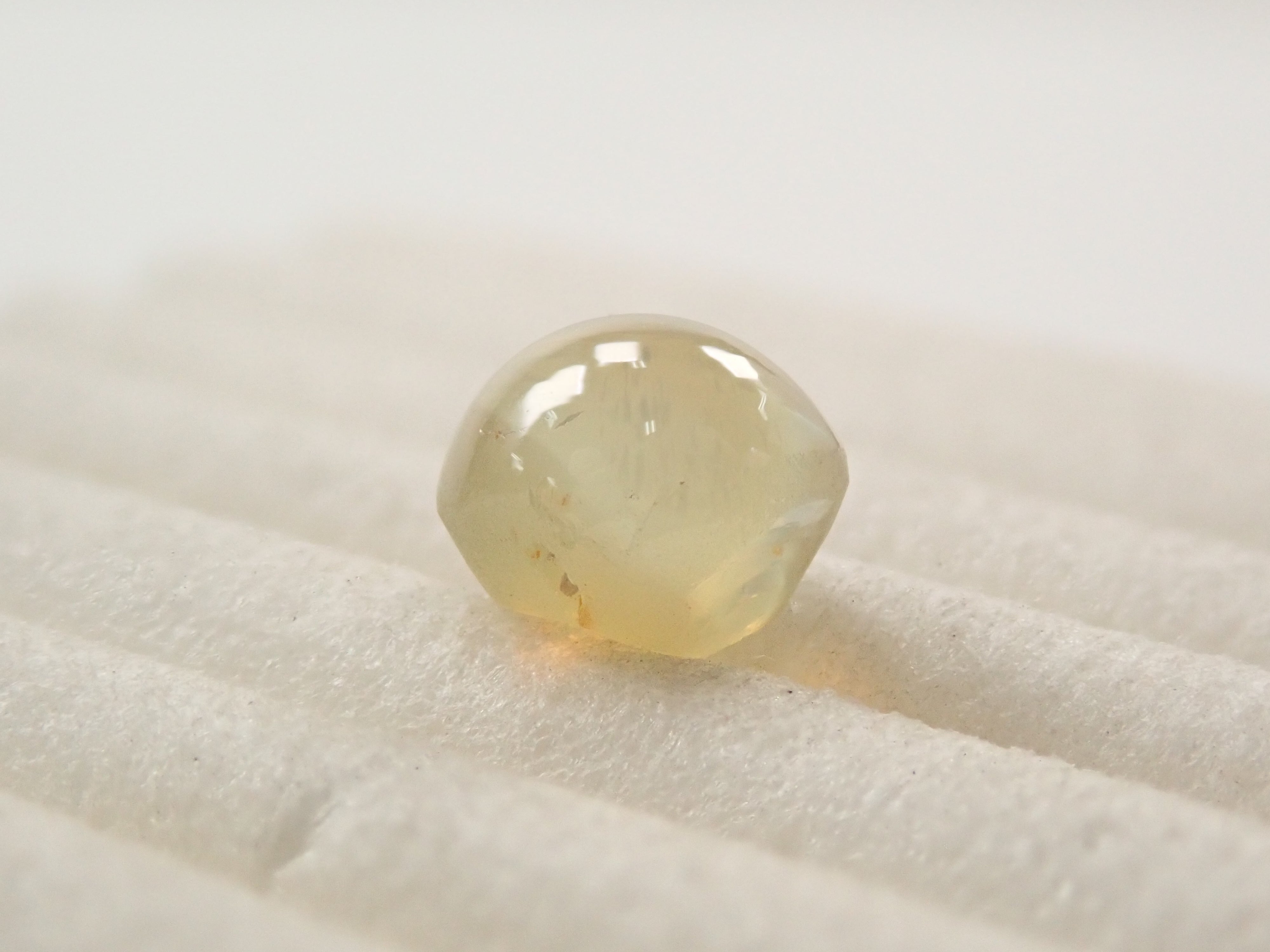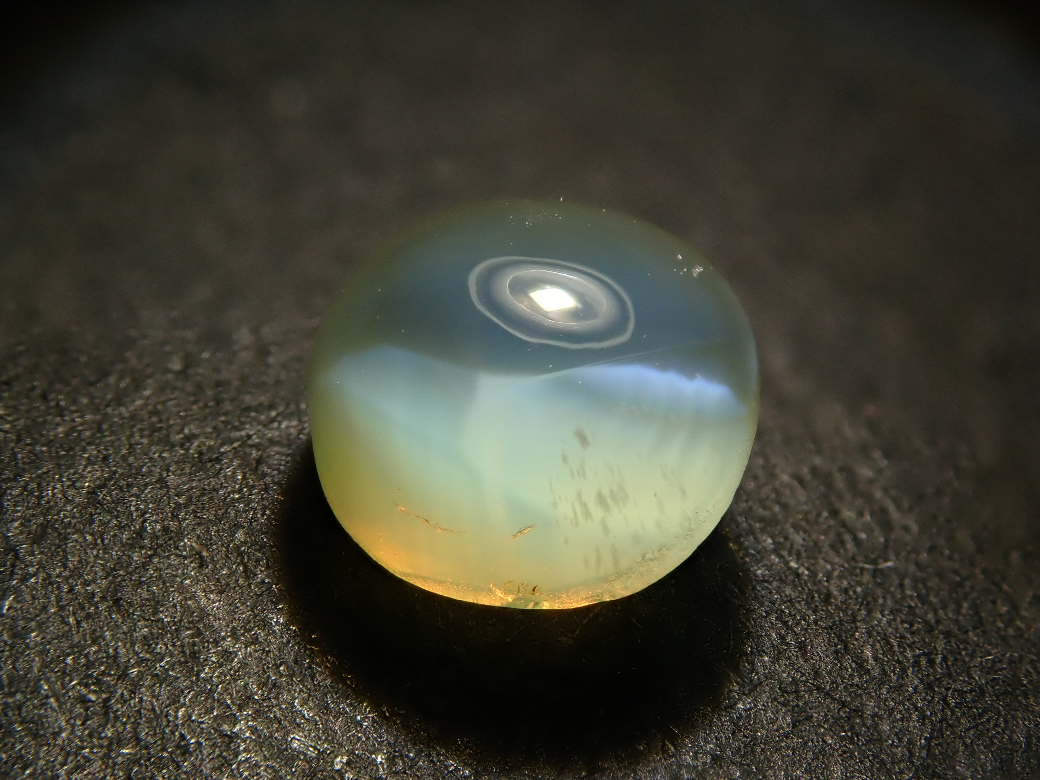 金綠玉的顏色多種多樣,從淺黃色到綠色再到深棕色。它是一種堅硬耐用的寶石。這顆寶石呈現貓眼效果,照片是用筆型手電筒拍攝的。寶石背面通常未經拋光。