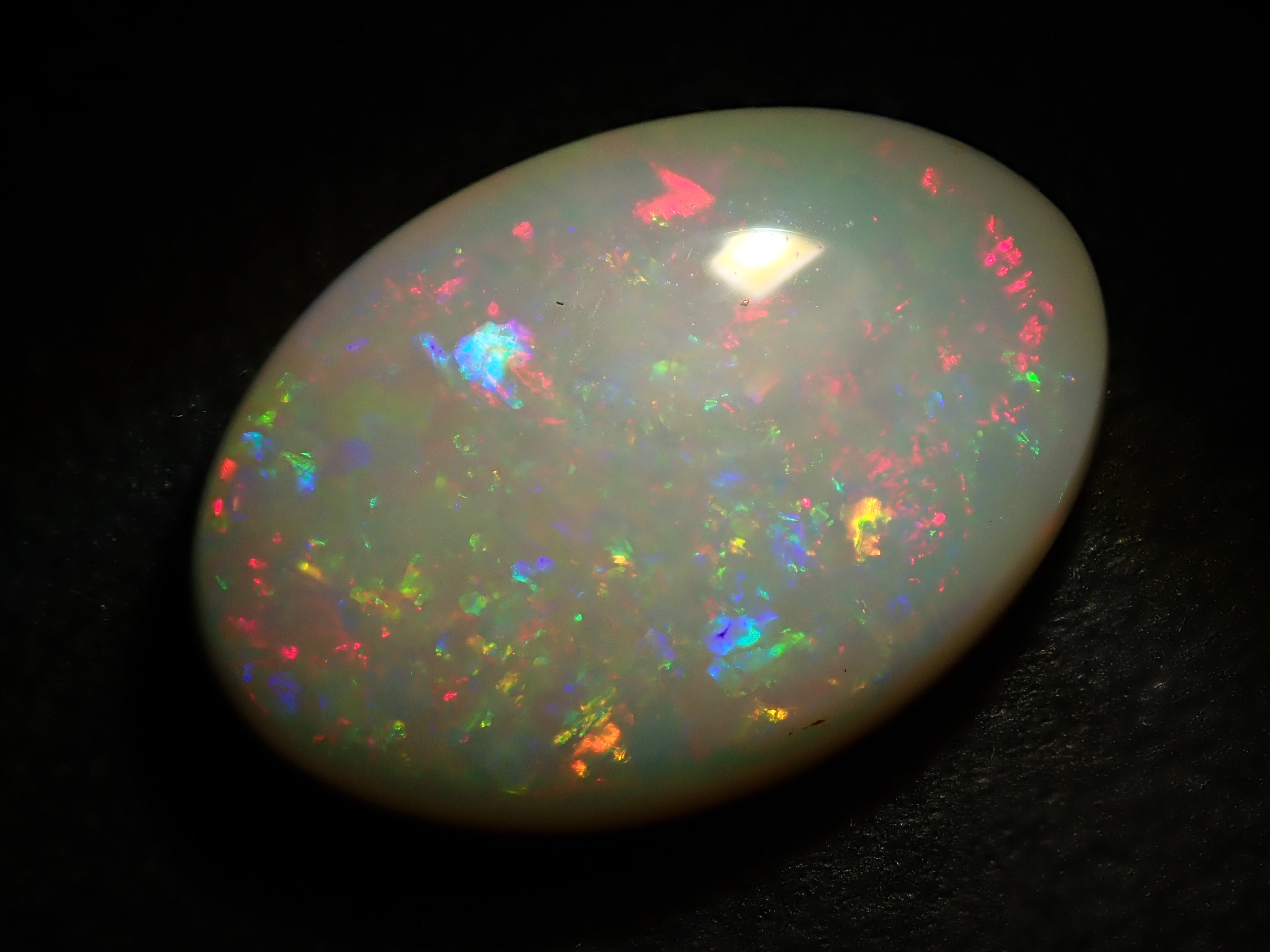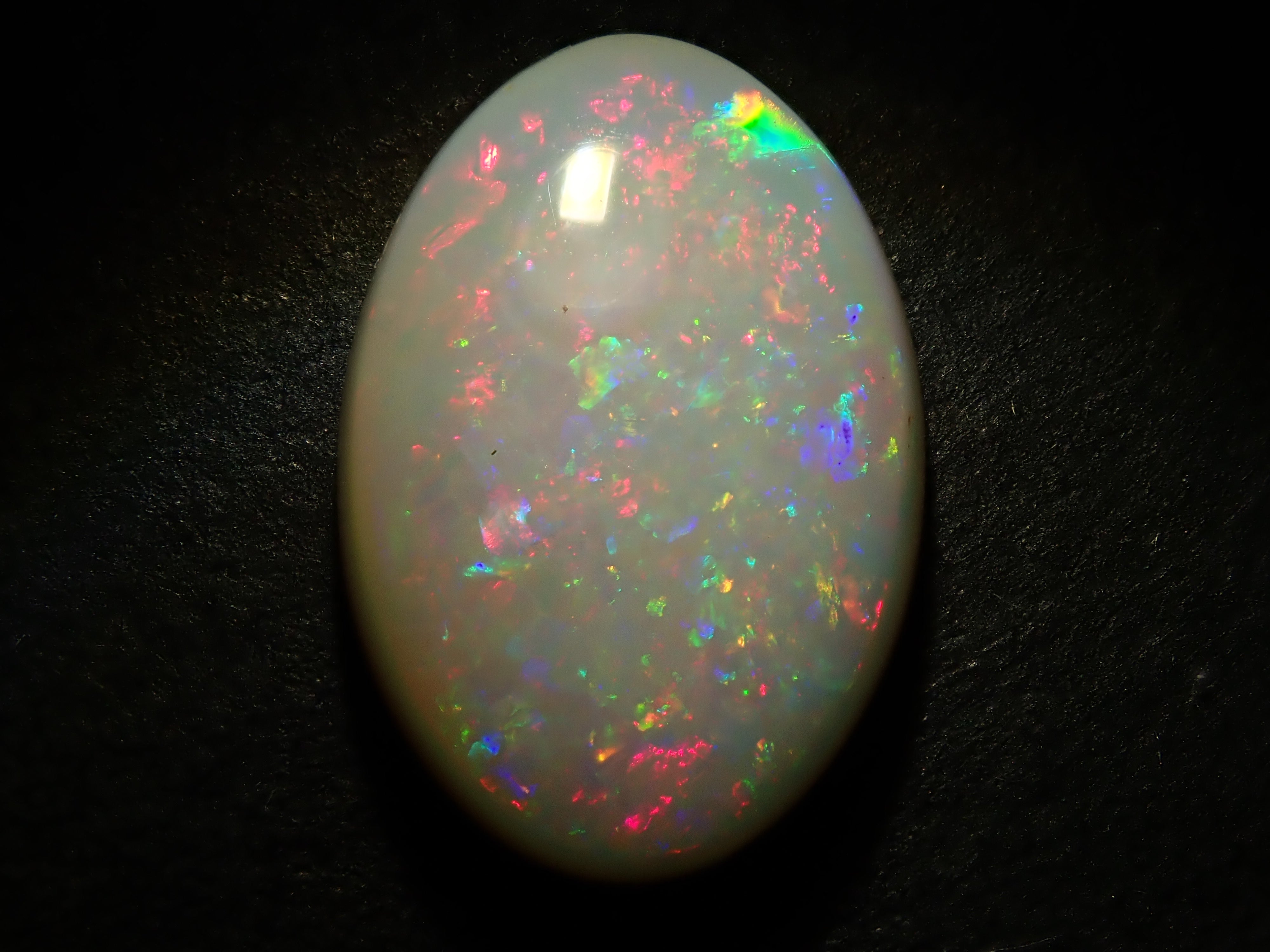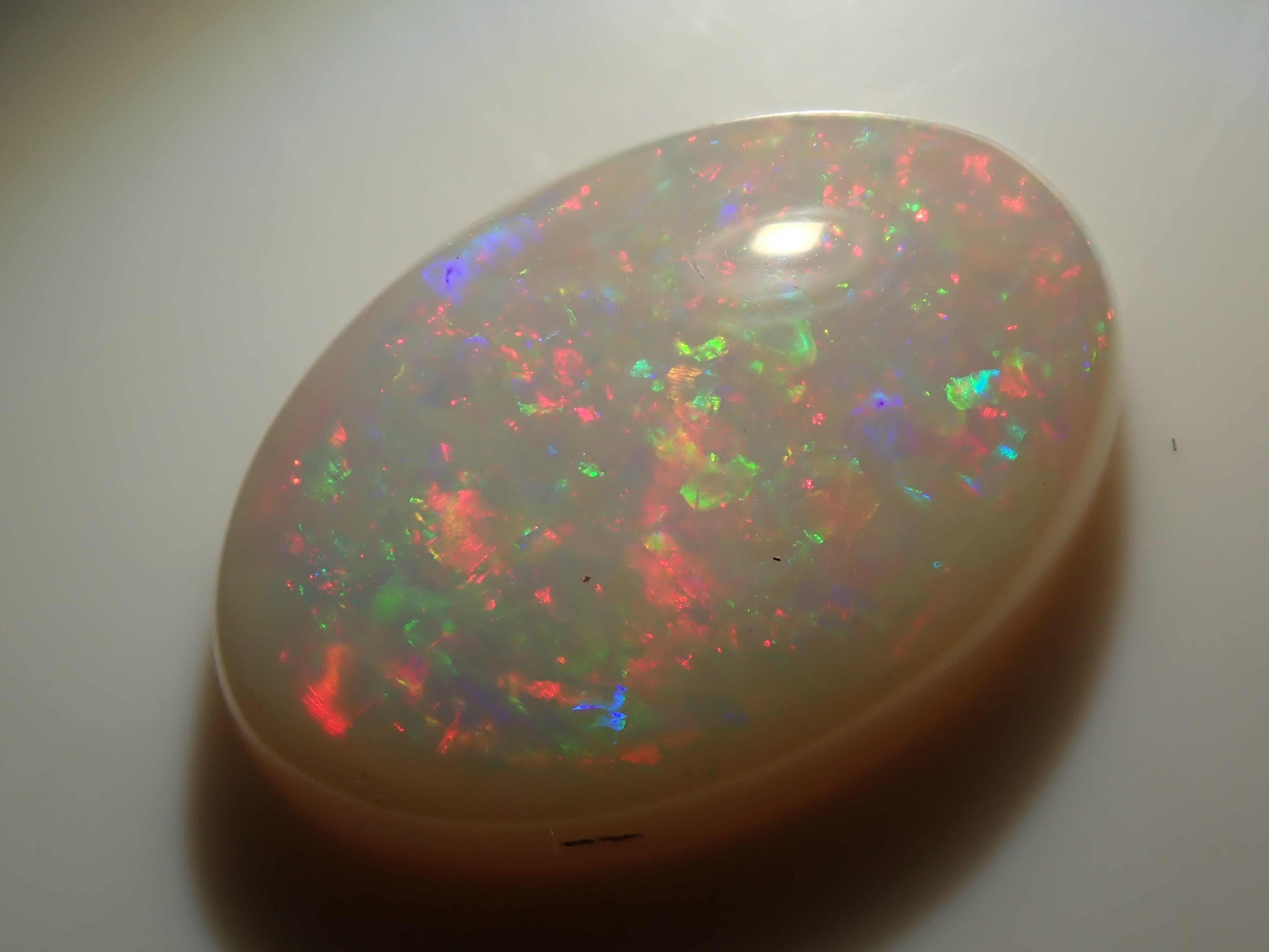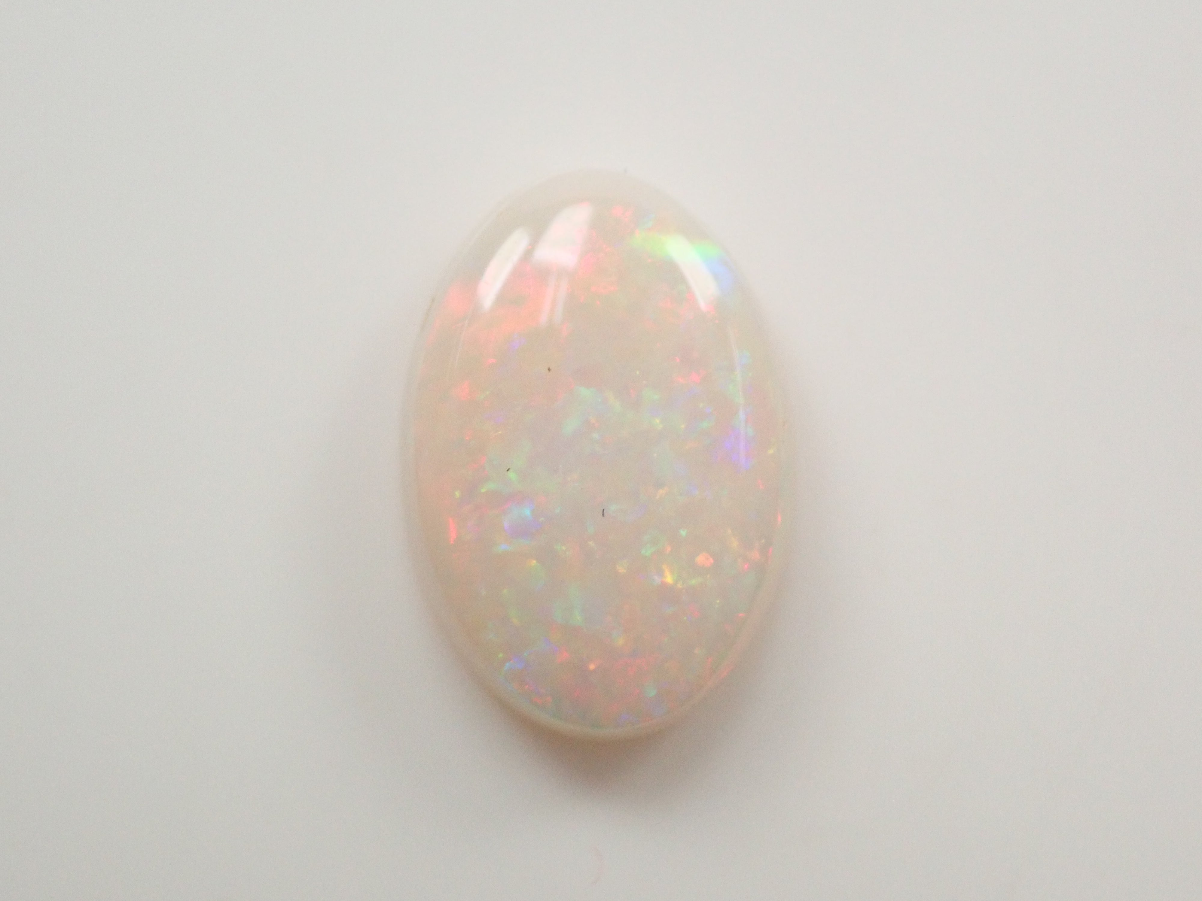 蛋白石是一種以虹彩般的光澤為特徵的寶石。蛋白石種類繁多,但其受歡迎的秘訣在於白蛋白石,它以白色為底色,擁有如肥皂泡般轉瞬即逝的美麗。這張照片是用筆型電筒拍攝的。