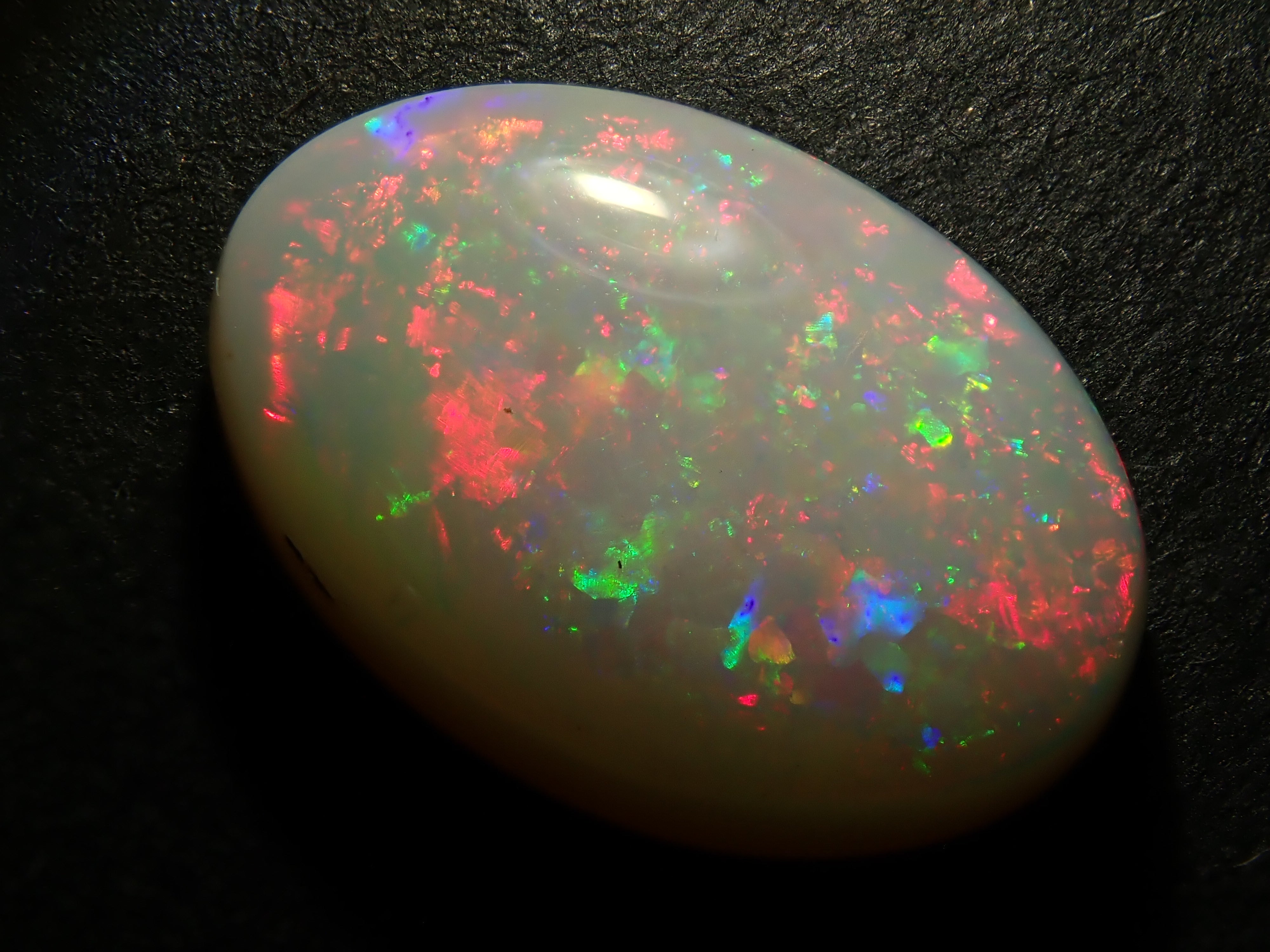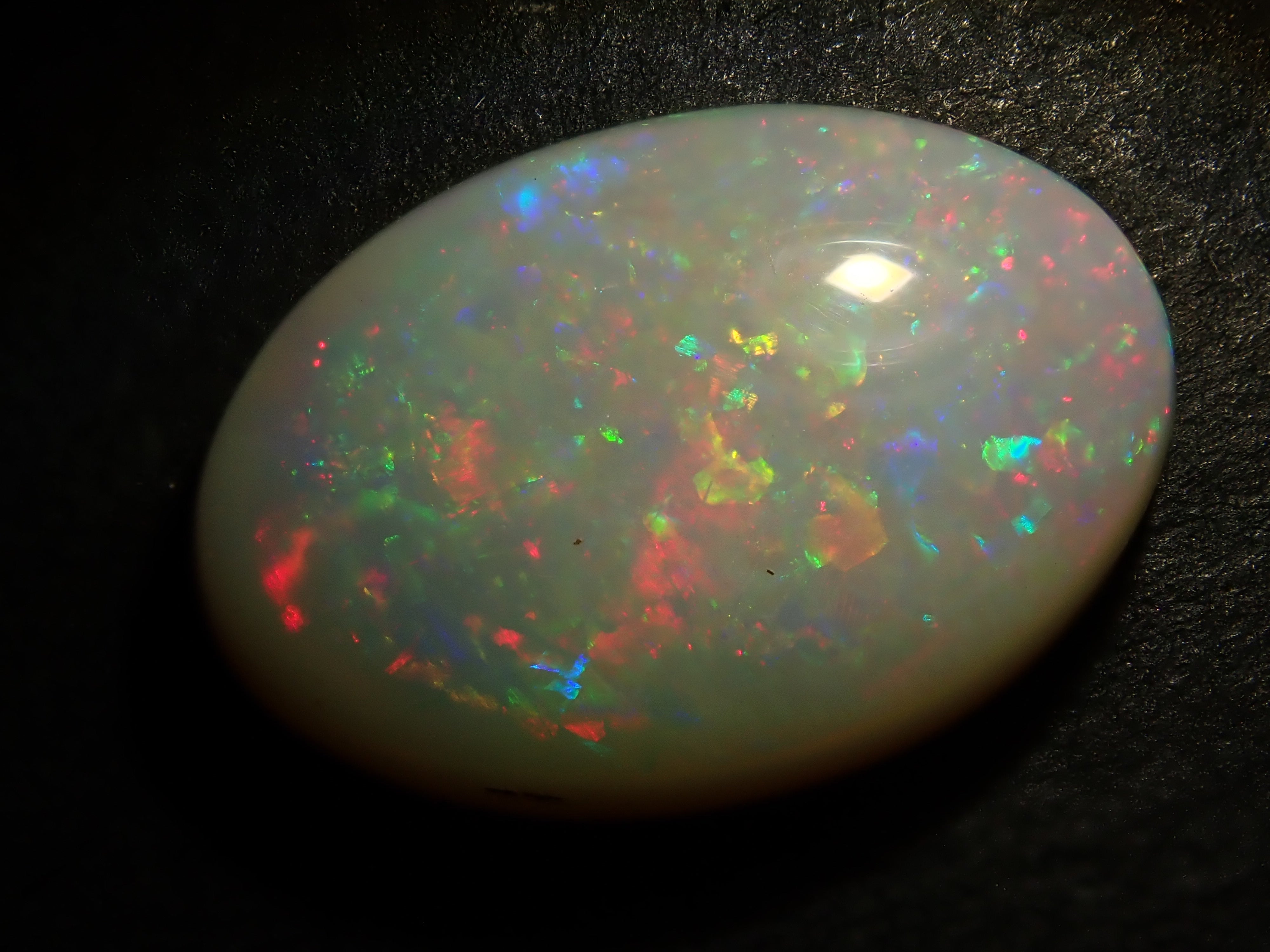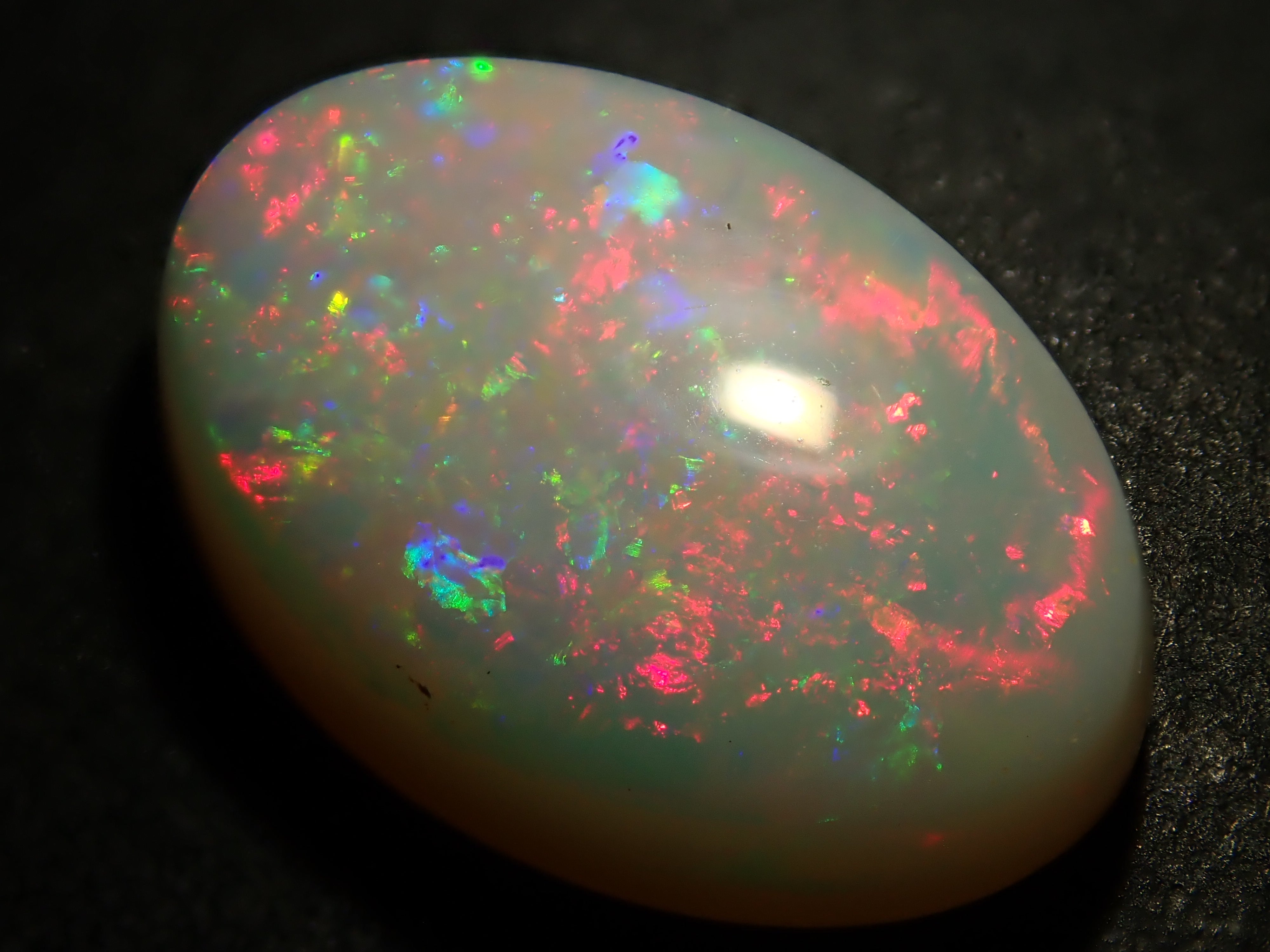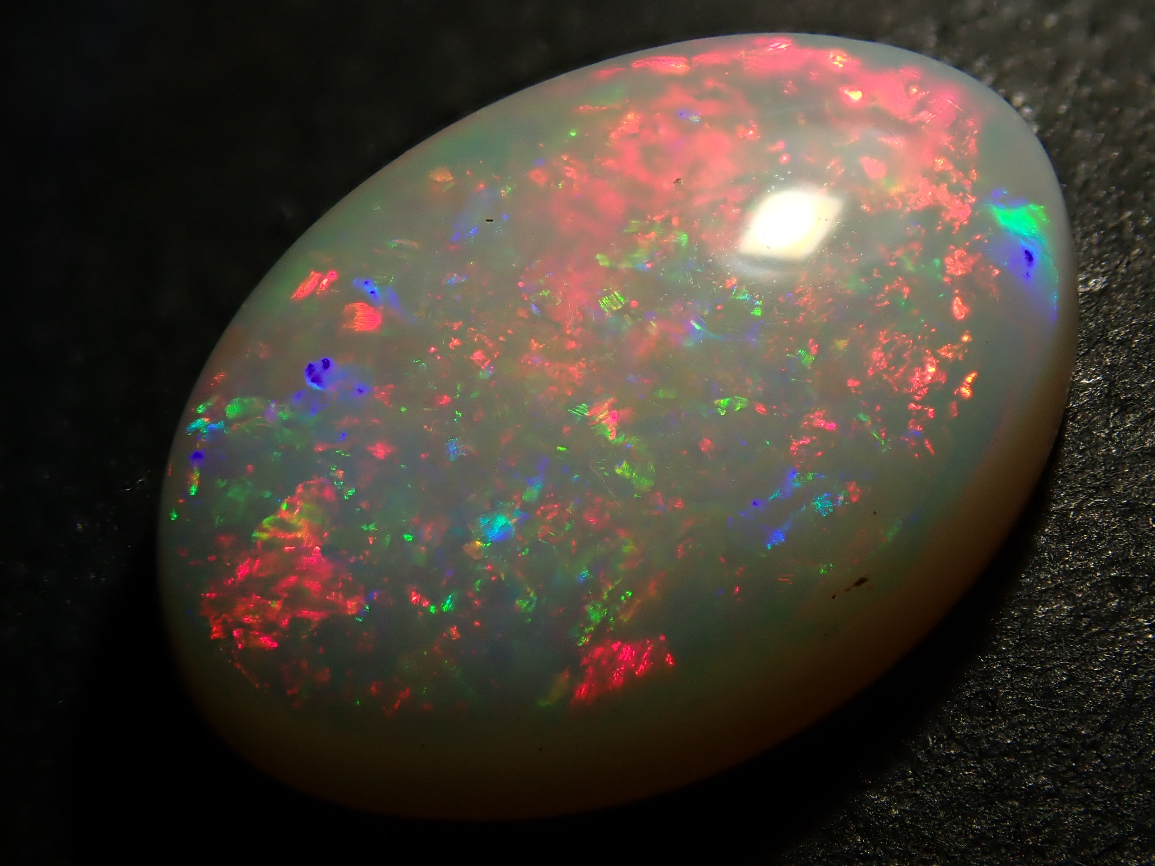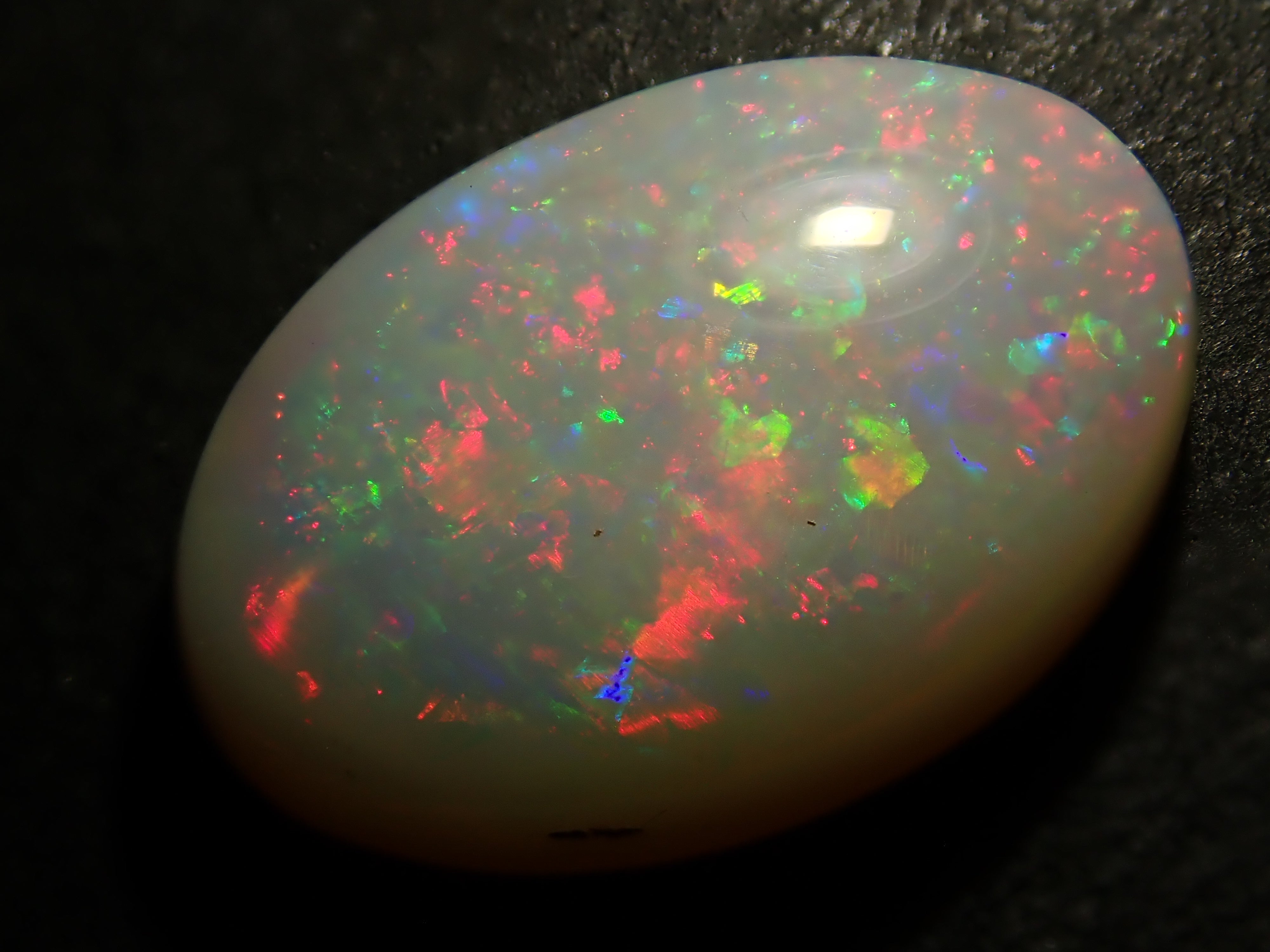 蛋白石是一種以虹彩般的光澤為特徵的寶石。蛋白石種類繁多,但其受歡迎的秘訣在於白蛋白石,它以白色為底色,擁有如肥皂泡般轉瞬即逝的美麗。這張照片是用筆型電筒拍攝的。