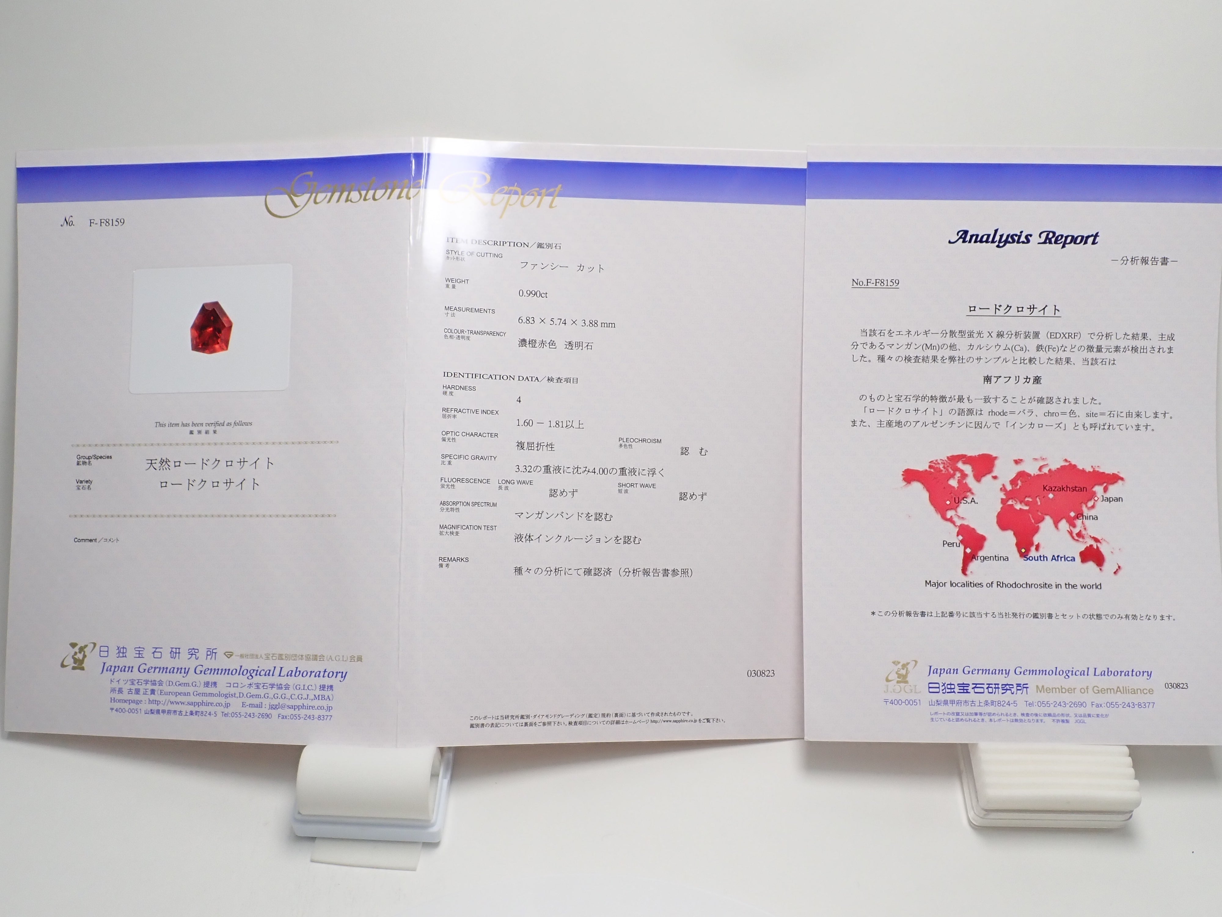菱錳礦是一種可愛的寶石,顏色從草莓紅色到粉紅色。它是一種相對較新的寶石,於 1940 年首次出現在市場上。這個名字來自希臘語“rhodes”,意思是“玫瑰”,以及“chros”,意思是“顏色”。這是這種菱錳礦由來自南非的特別優質的菱錳礦原石製成,並由熟練的美國工匠 KEN 切割而成。附有日德寶石研究所頒發的鑑定證書。