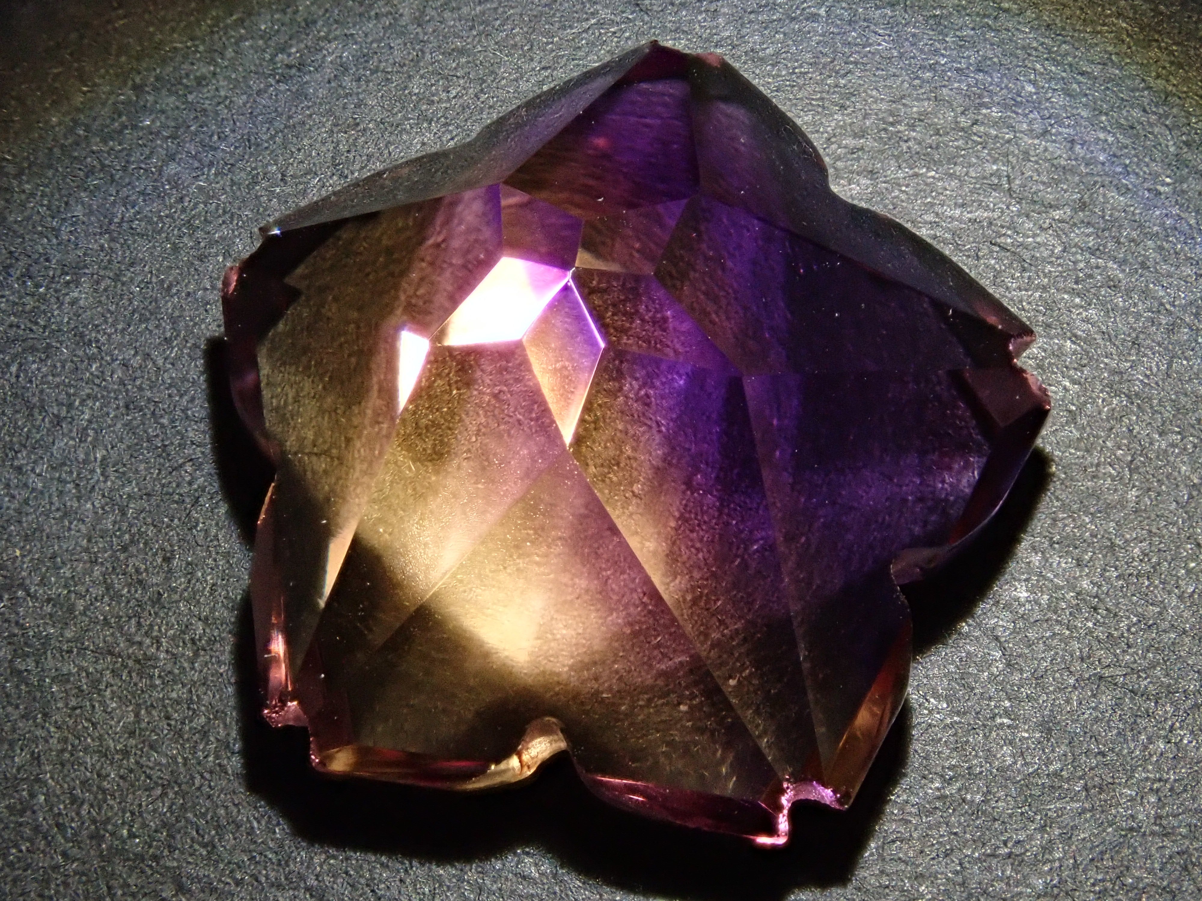 紫黃晶兼具紫水晶的紫色和黃水晶的黃色。紫水晶和黃水晶都屬於石英(水晶),寶石名稱中稱為“雙色石英”,日文則稱為“紫黃水晶”。