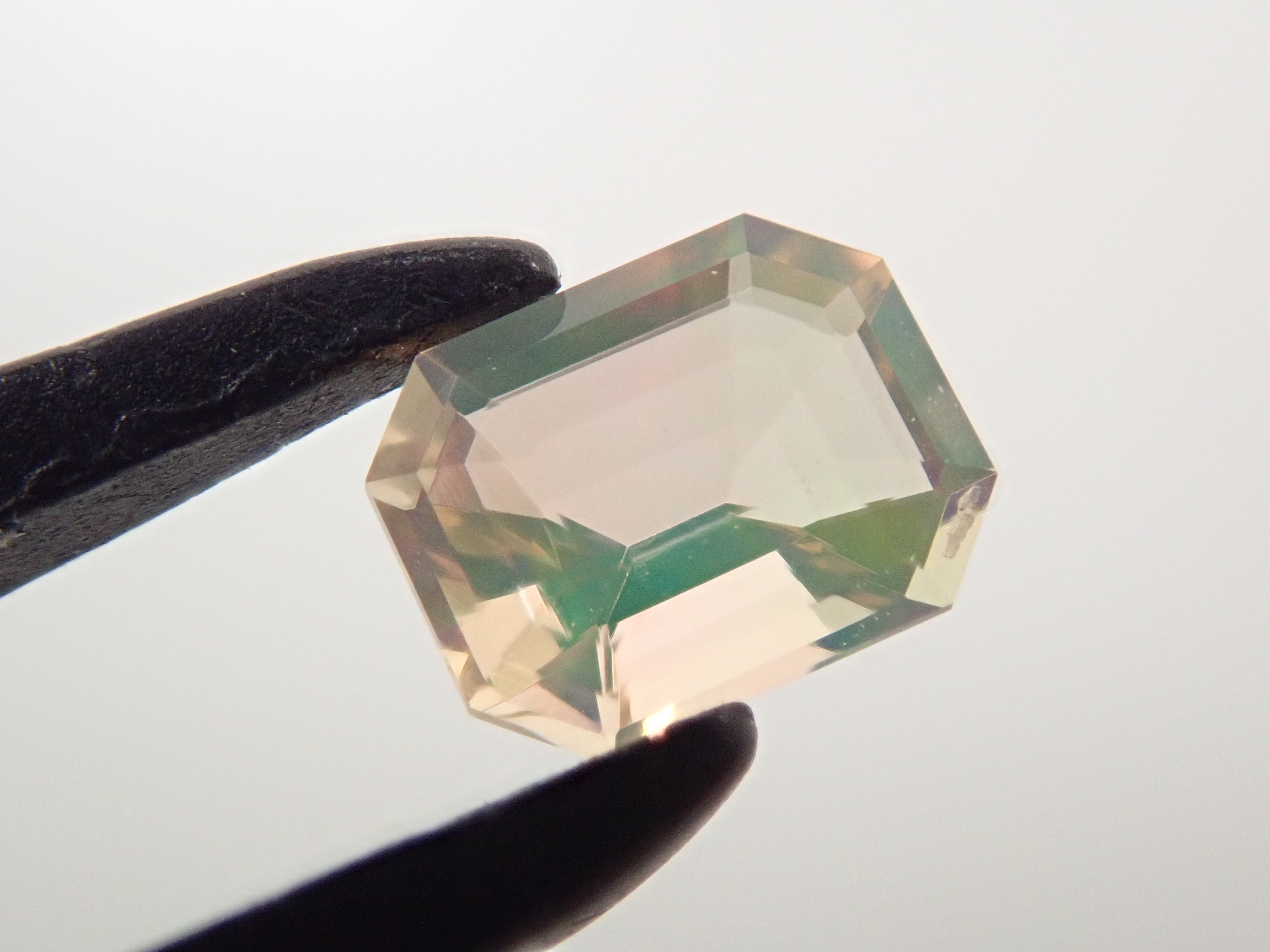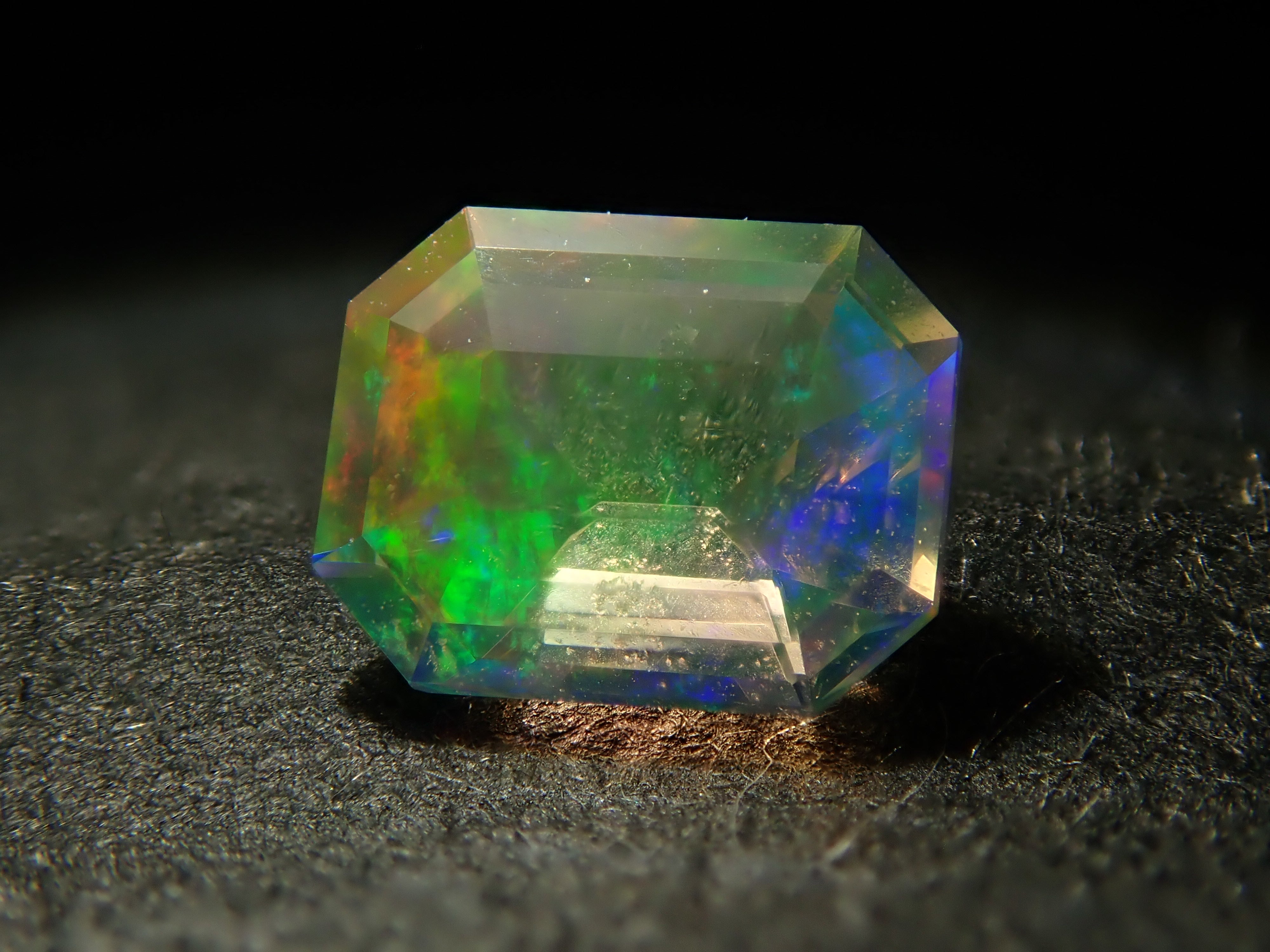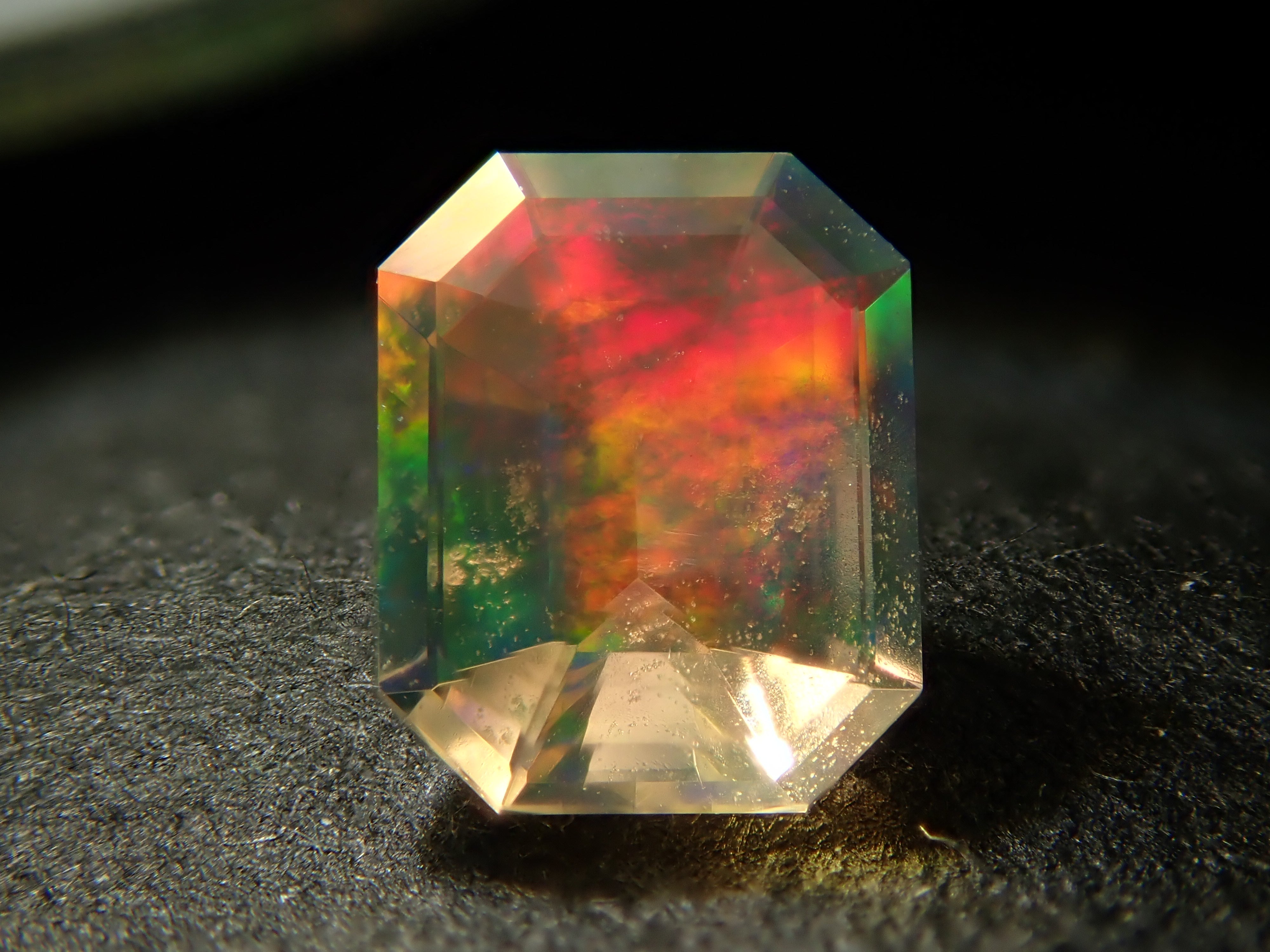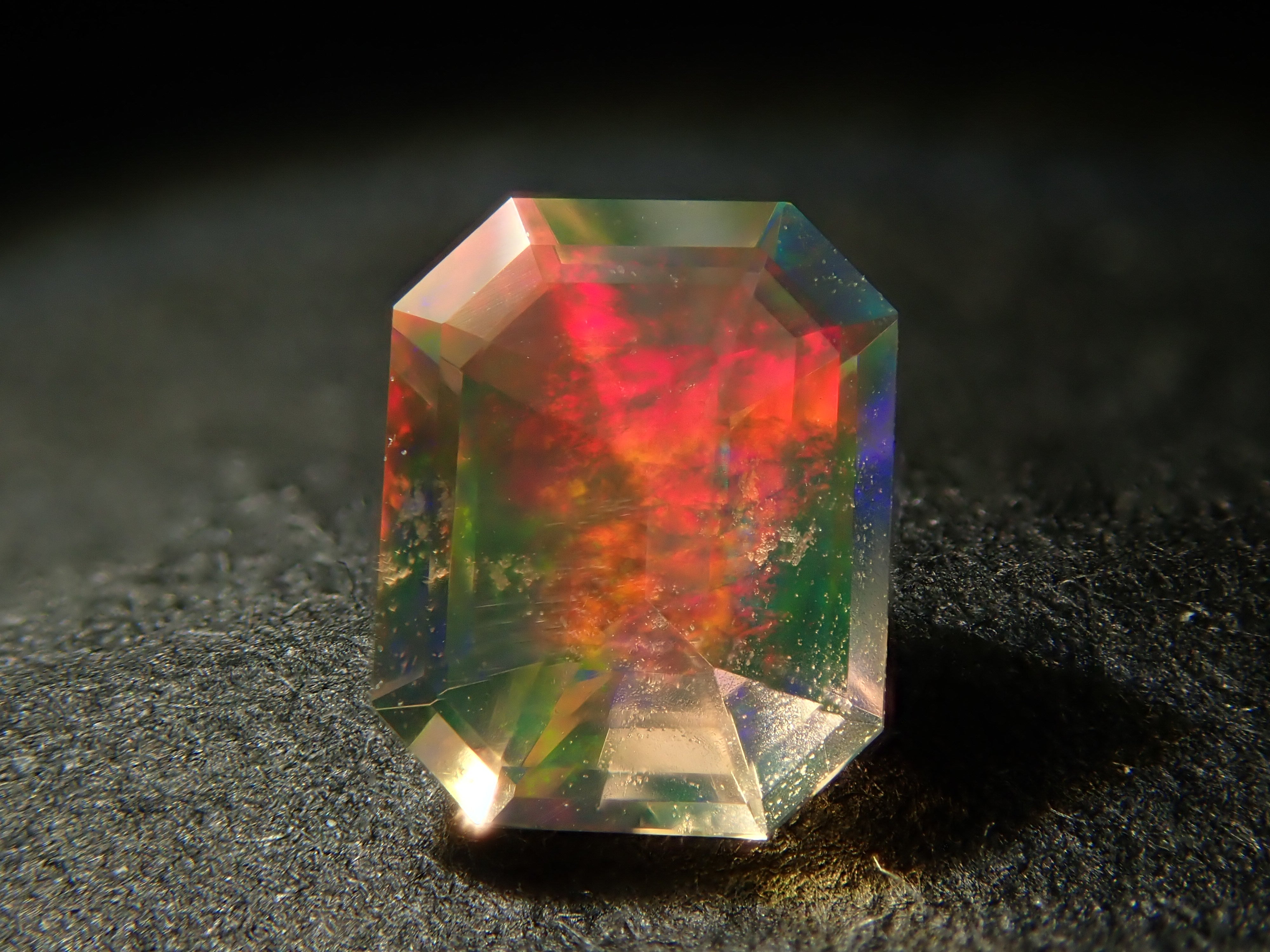 蛋白石自古羅馬時代以來就很受歡迎。火蛋白石是指底色從紅色到橘色,給人火的印象的蛋白石。照片是使用筆燈拍攝的。墨西哥火蛋白石 0.213 克拉散切,由斯里蘭卡拋光師 Sanjay 出品。它高度透明,當您在黑色背景上照射光線時,您可以享受到奇妙的色彩變化。 這是產自墨西哥的刻面火蛋白石。