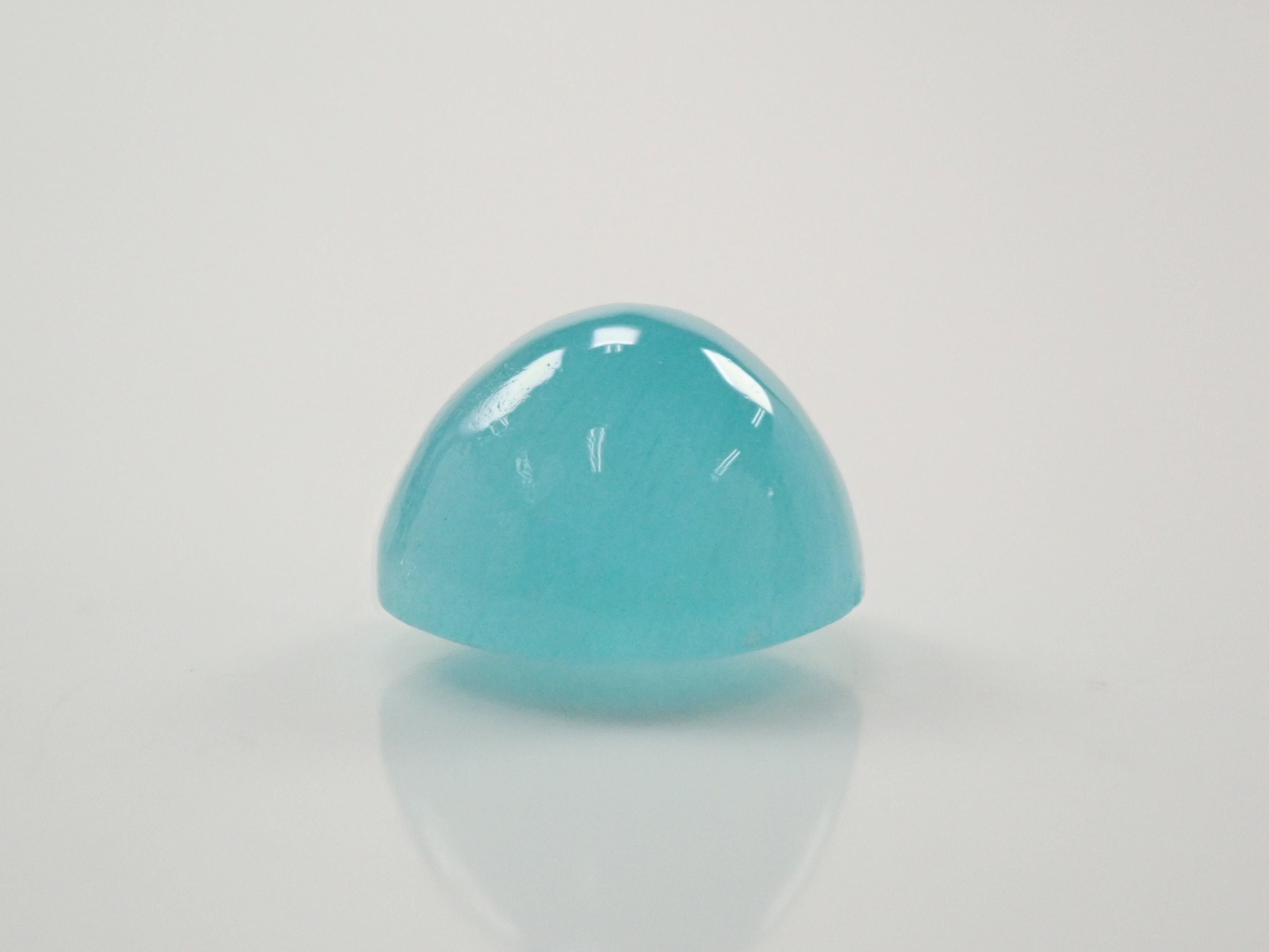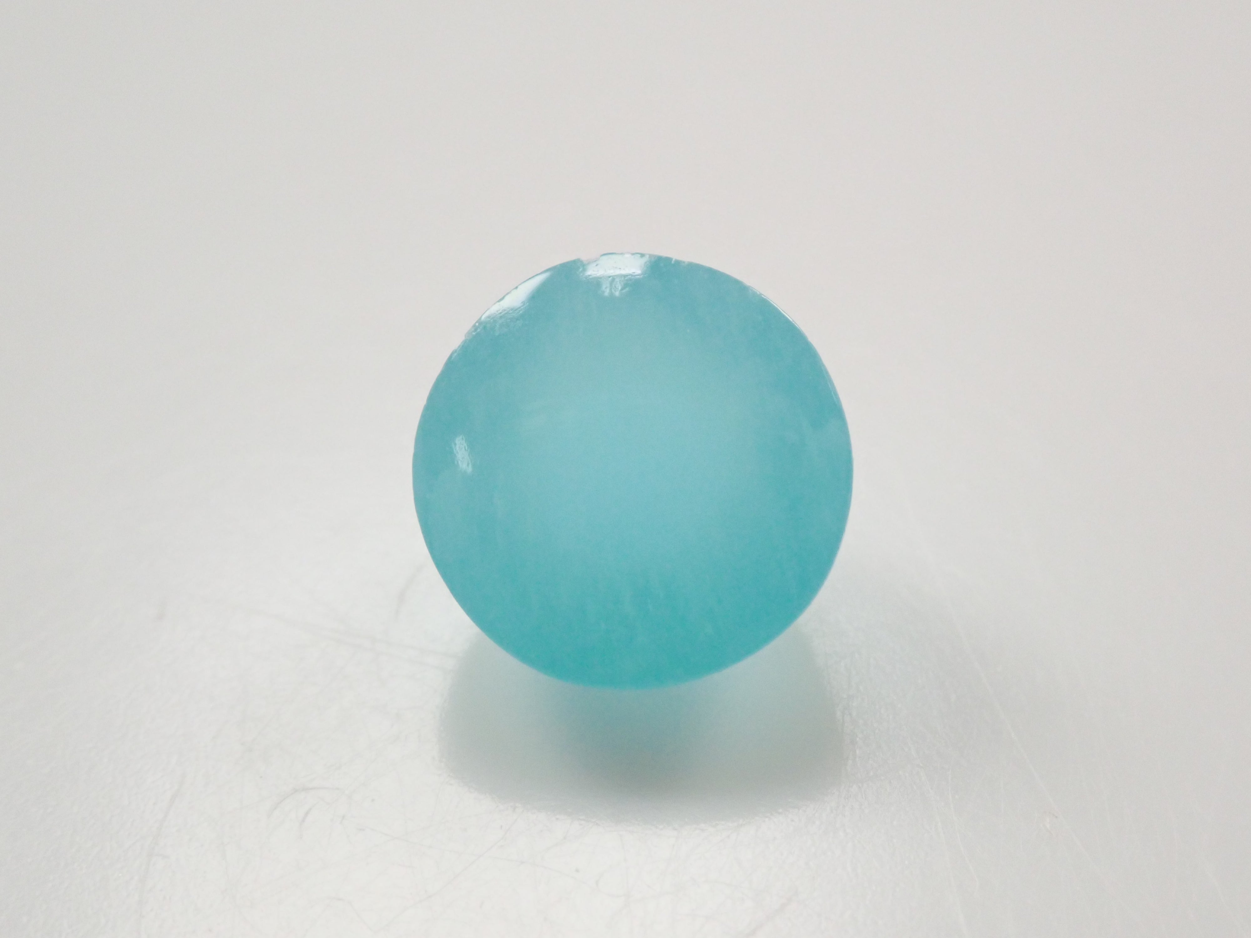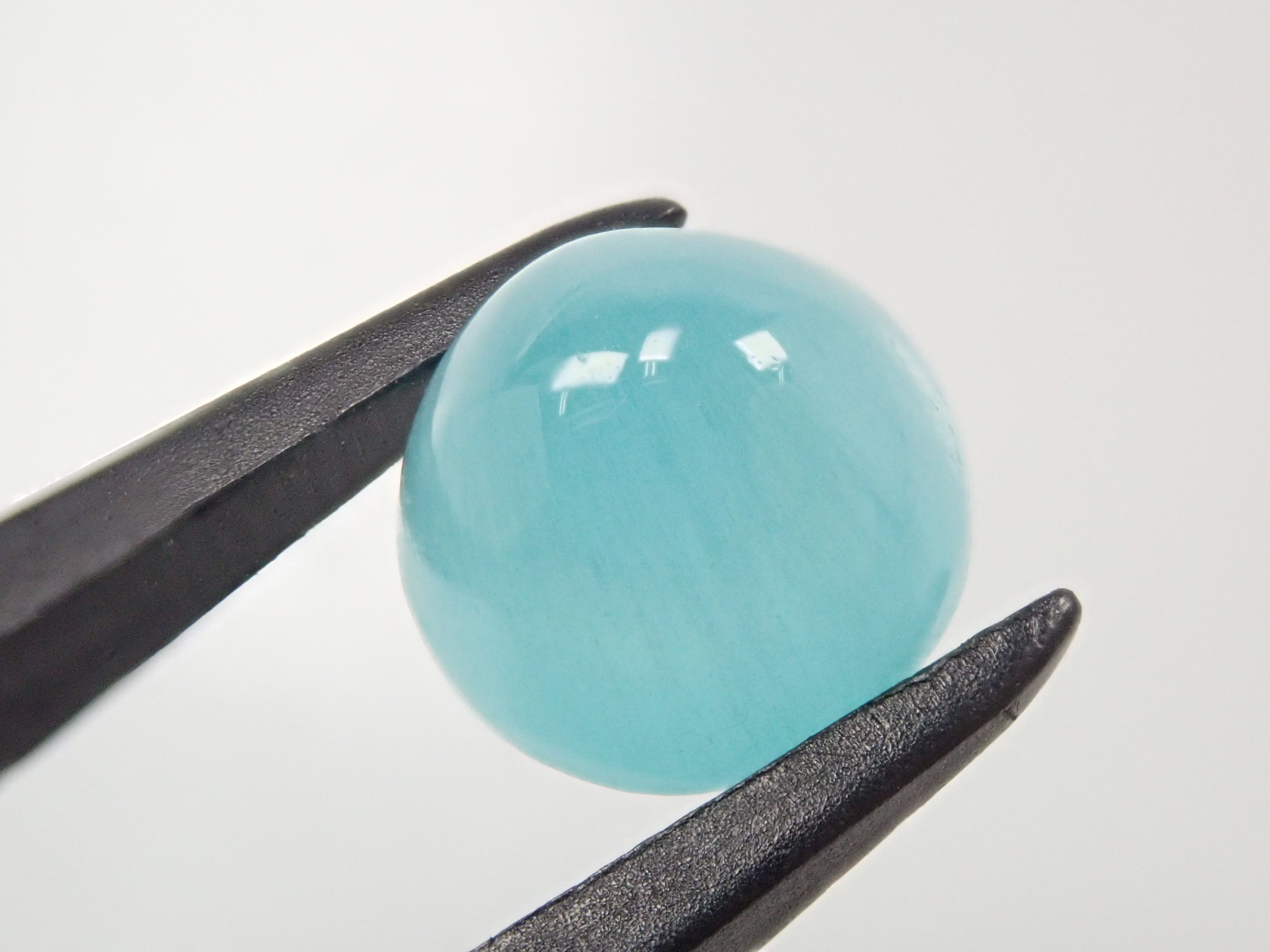 文石的日文名稱是文石。因碳酸鈣呈從天而降的小冰雹形狀而得名。莫氏硬度稍低,為3.5至4。它非常堅硬,如果您一直將其作為戒指佩戴,則需要小心。它具有美麗的玻璃般的光澤。 凸圓形切割藍色霰石。