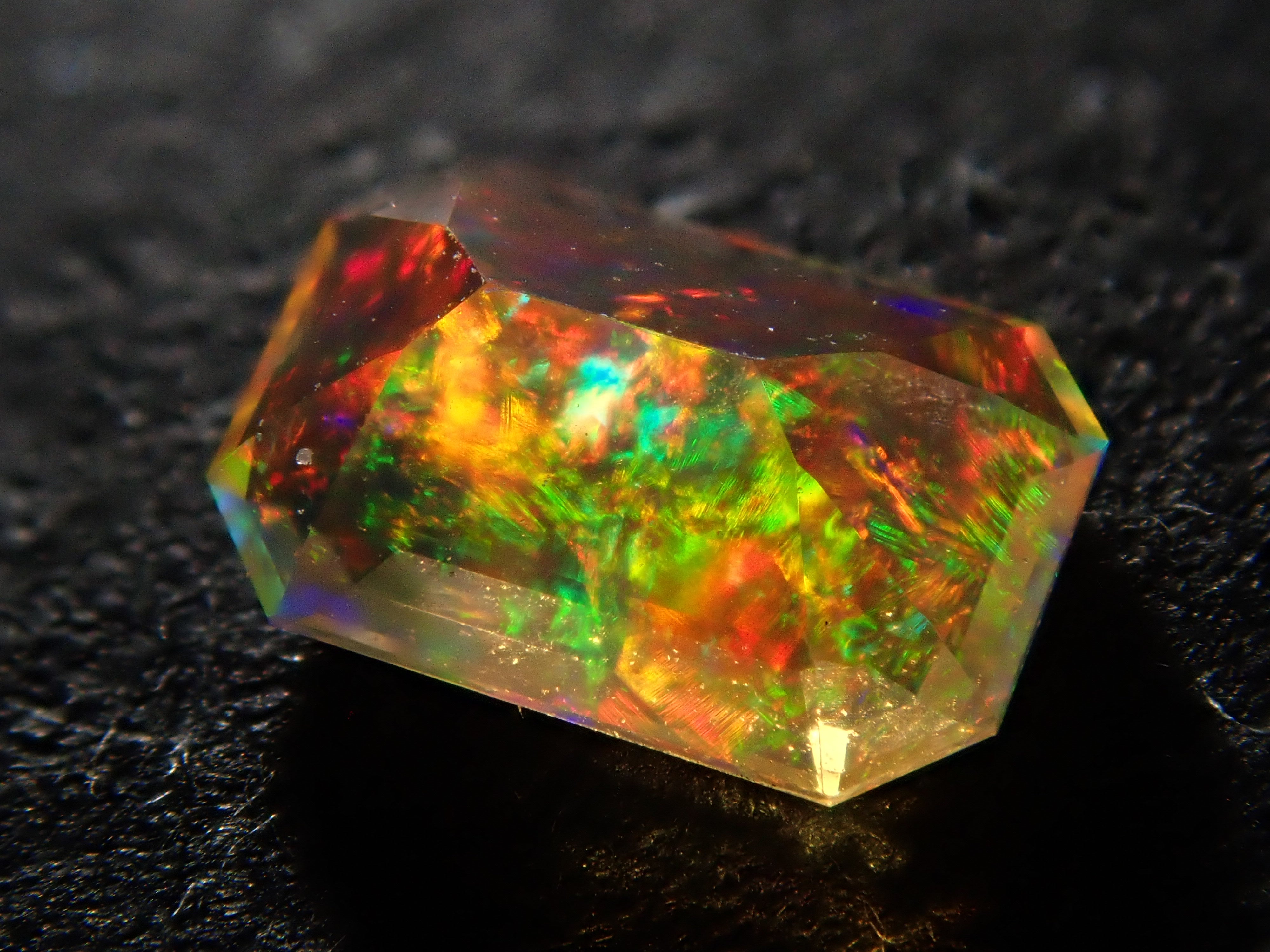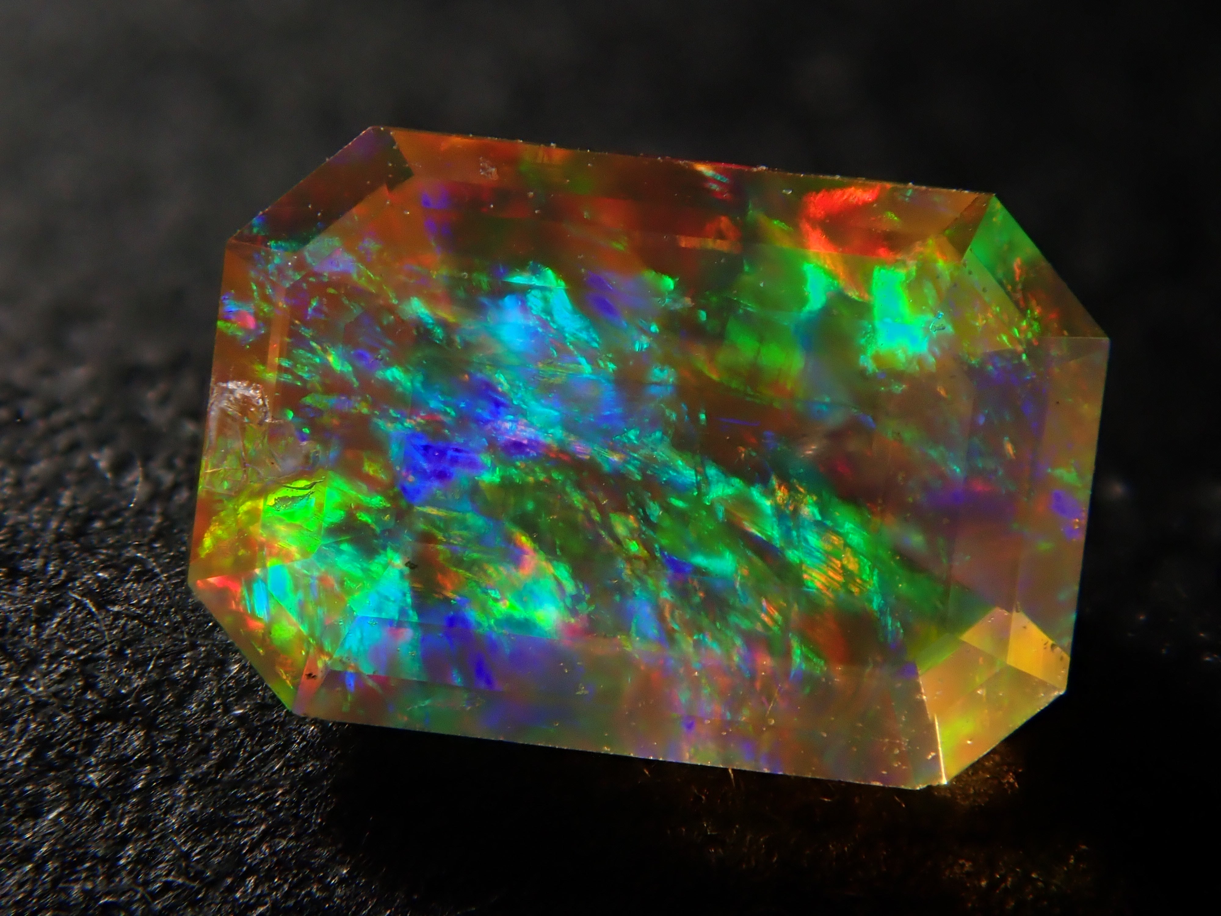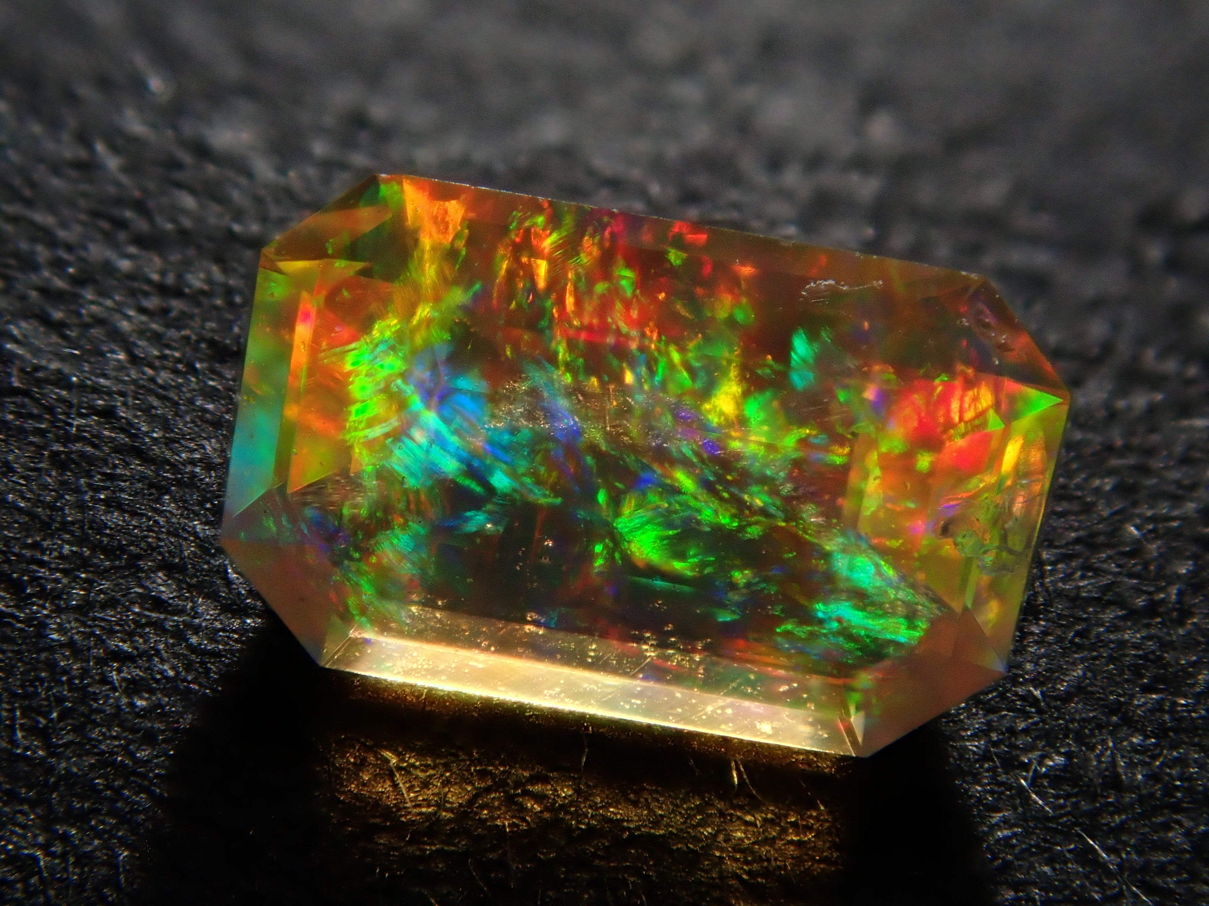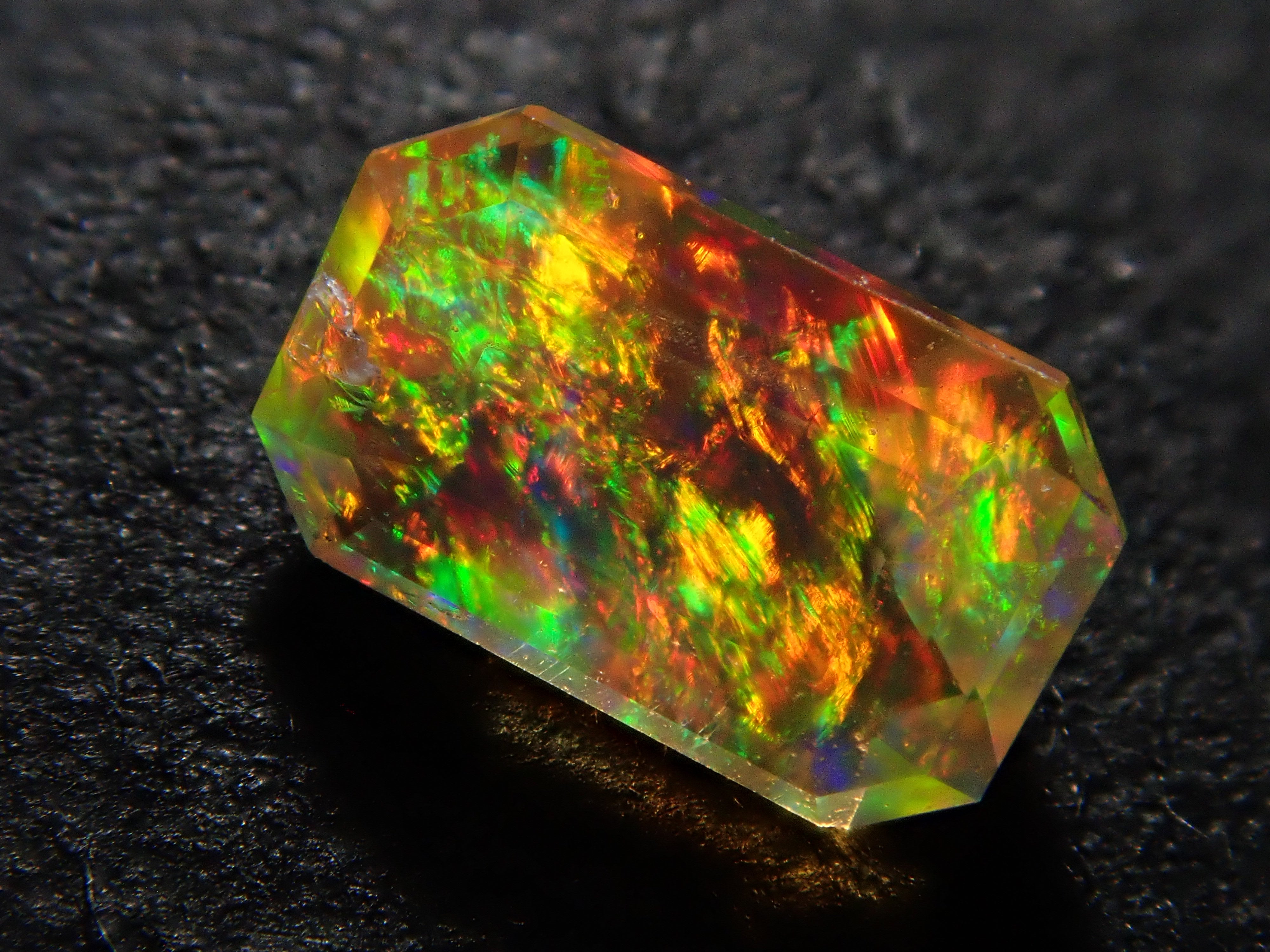 蛋白石自古羅馬時代以來就很受歡迎。火蛋白石是指底色從紅色到橘色的蛋白石,給人火的形象。照片是使用筆燈拍攝的。來自墨西哥的火蛋白石由斯里蘭卡拋光師 Sanjay 切割。 高度透明的火蛋白石,在黑色背景下閃耀時,您可以欣賞到奇妙的色彩變化。這是產自墨西哥的刻面火蛋白石。