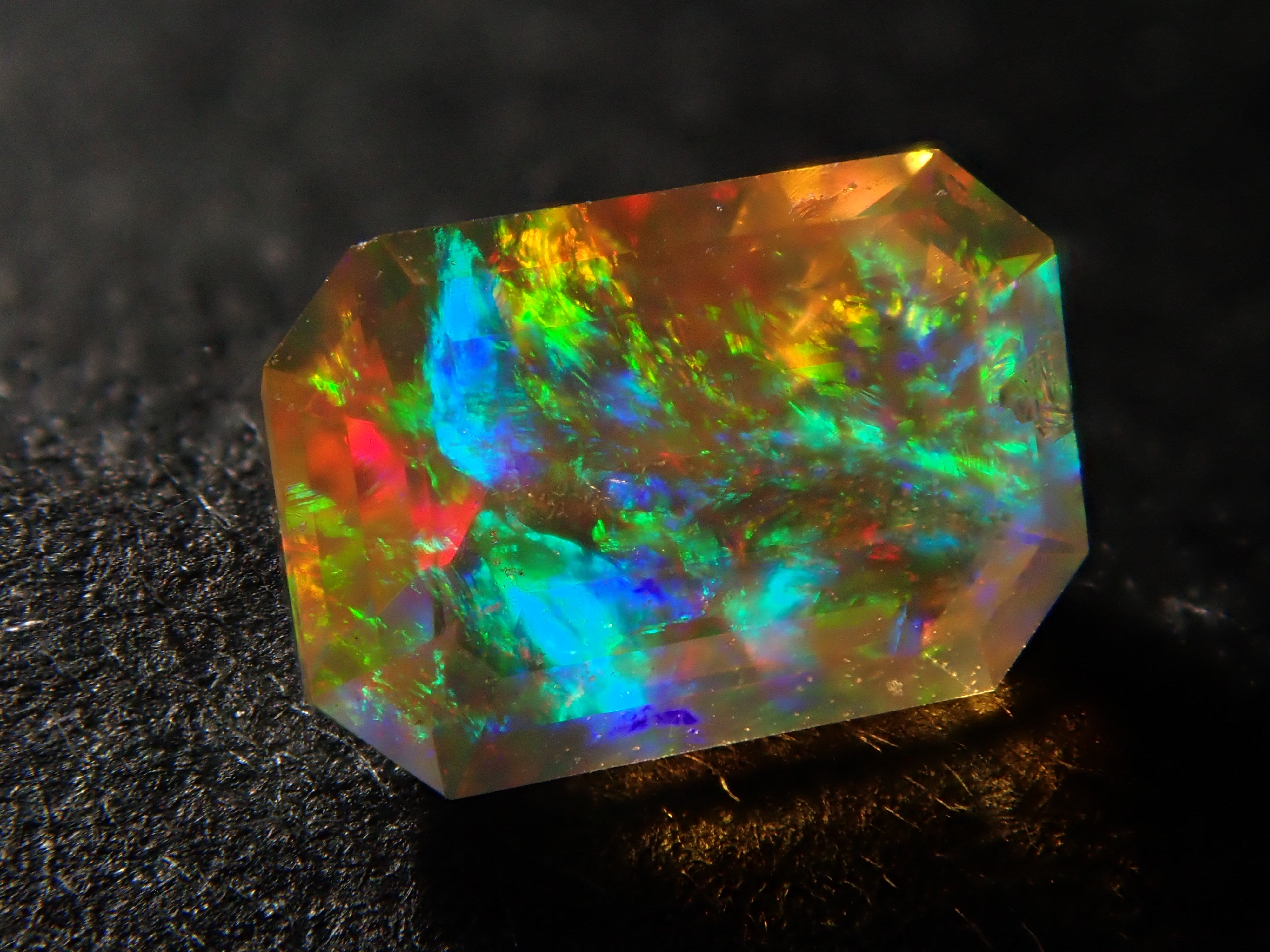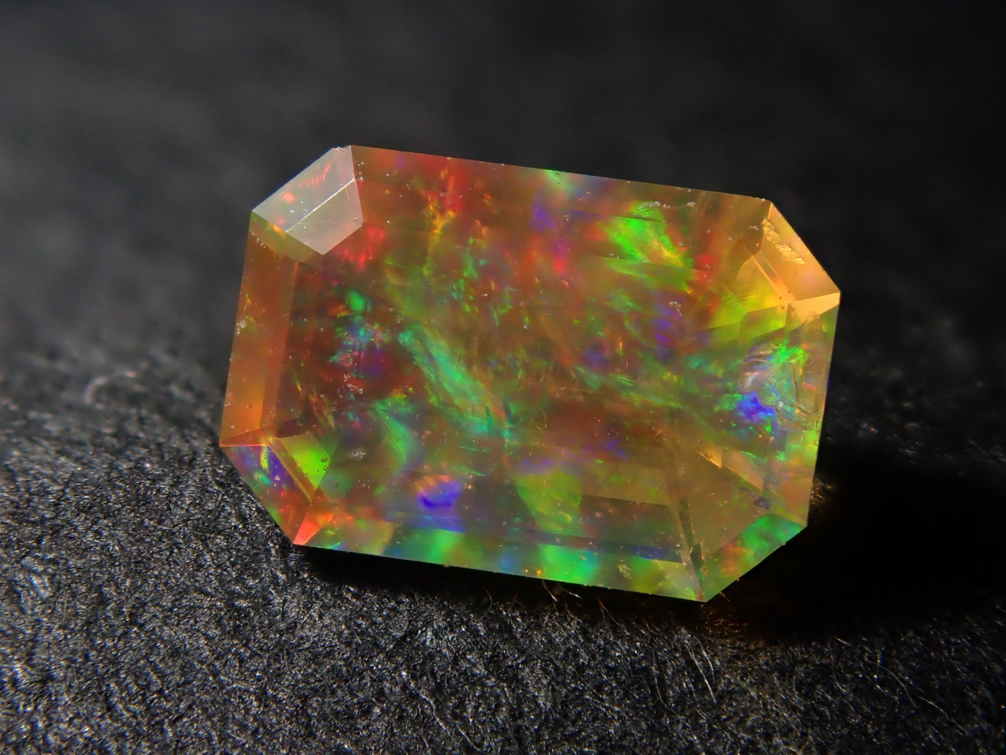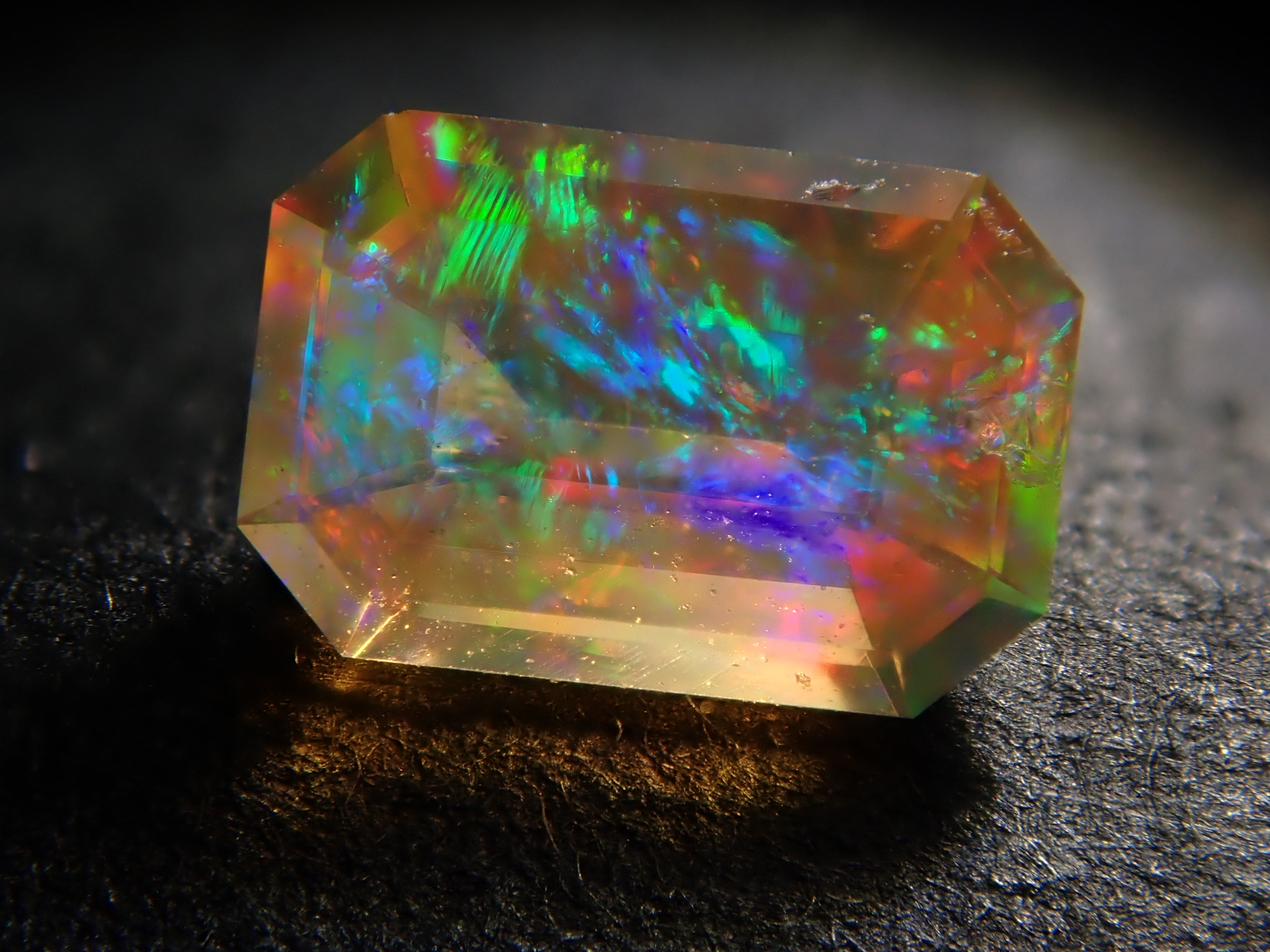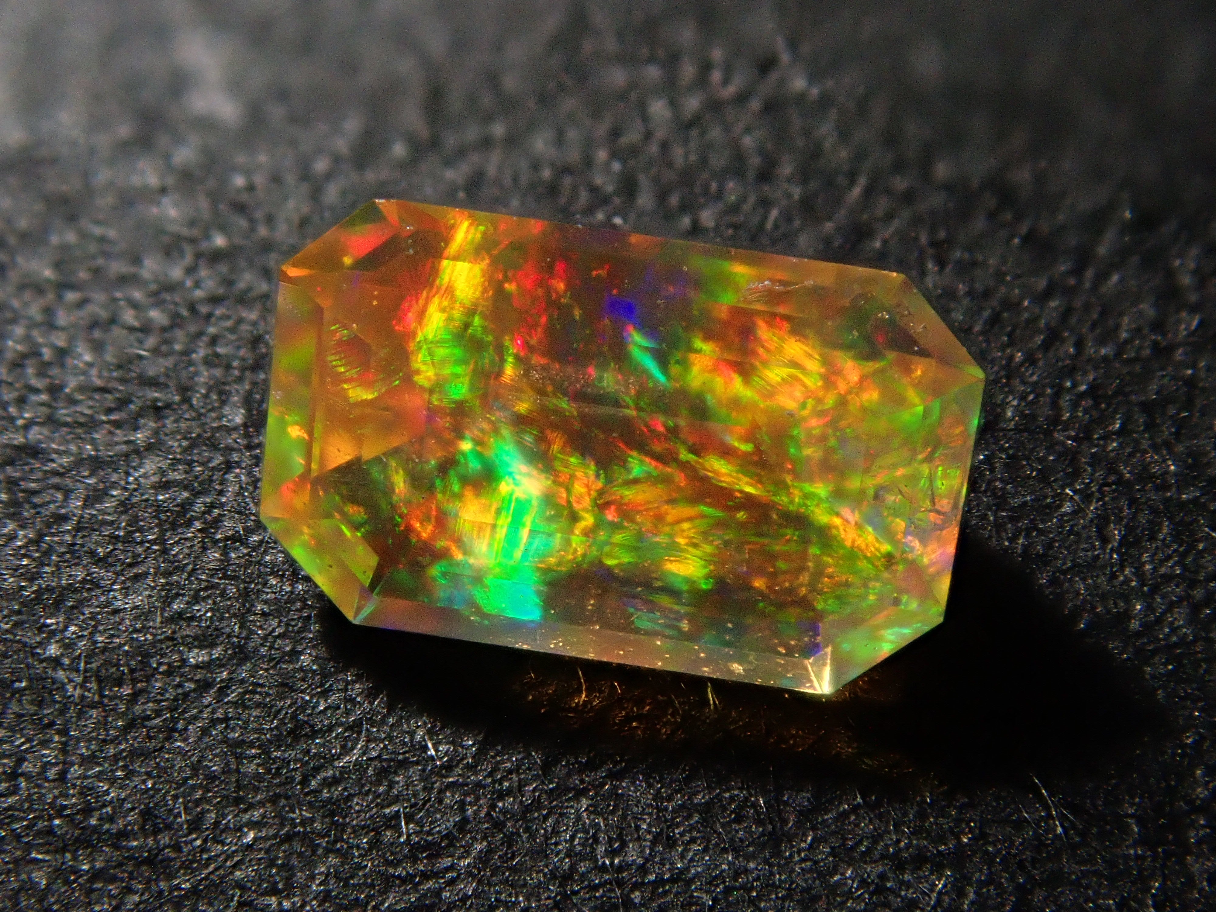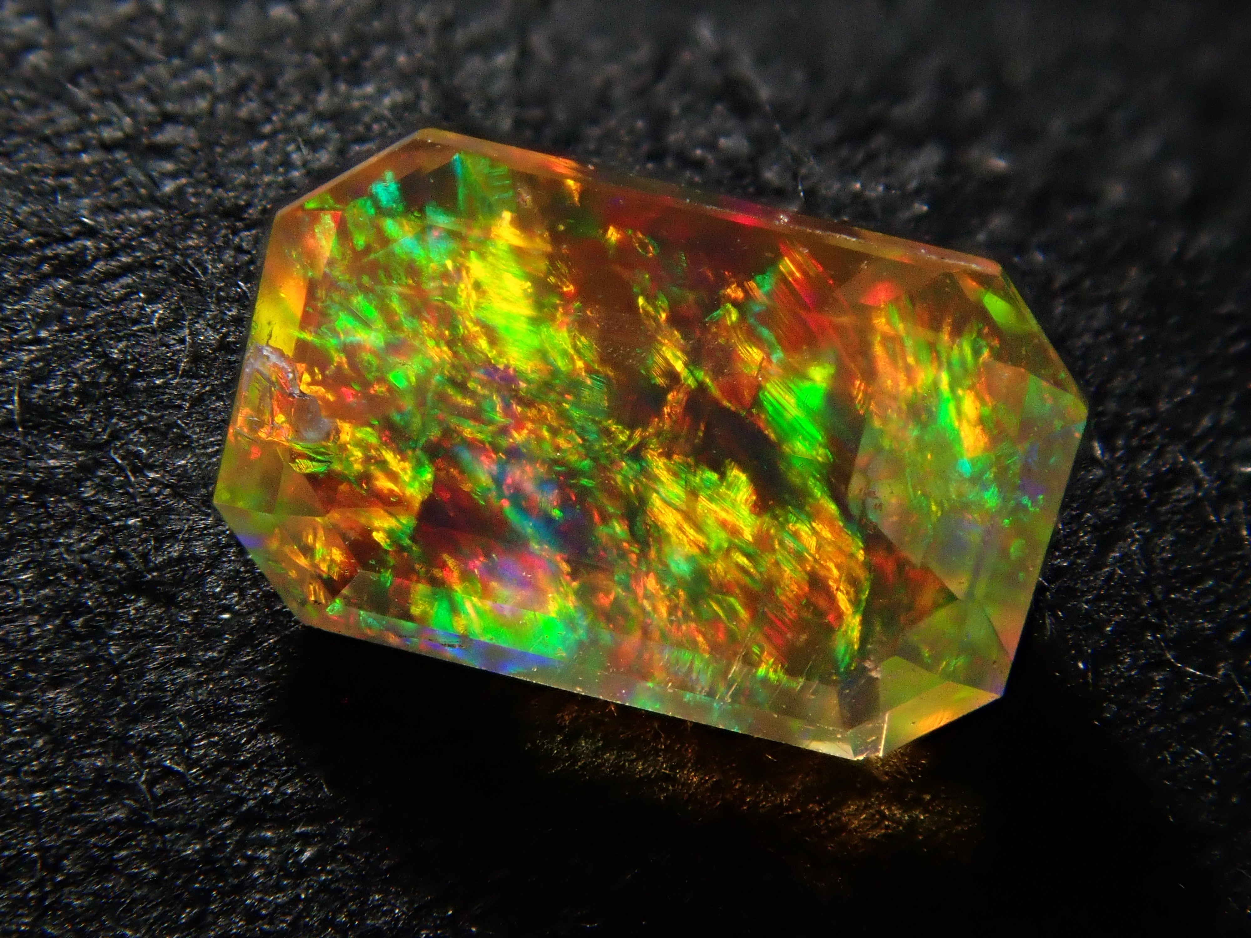 蛋白石自古羅馬時代以來就很受歡迎。火蛋白石是指底色從紅色到橘色的蛋白石,給人火的形象。照片是使用筆燈拍攝的。來自墨西哥的火蛋白石由斯里蘭卡拋光師 Sanjay 切割。 高度透明的火蛋白石,在黑色背景下閃耀時,您可以欣賞到奇妙的色彩變化。這是產自墨西哥的刻面火蛋白石。