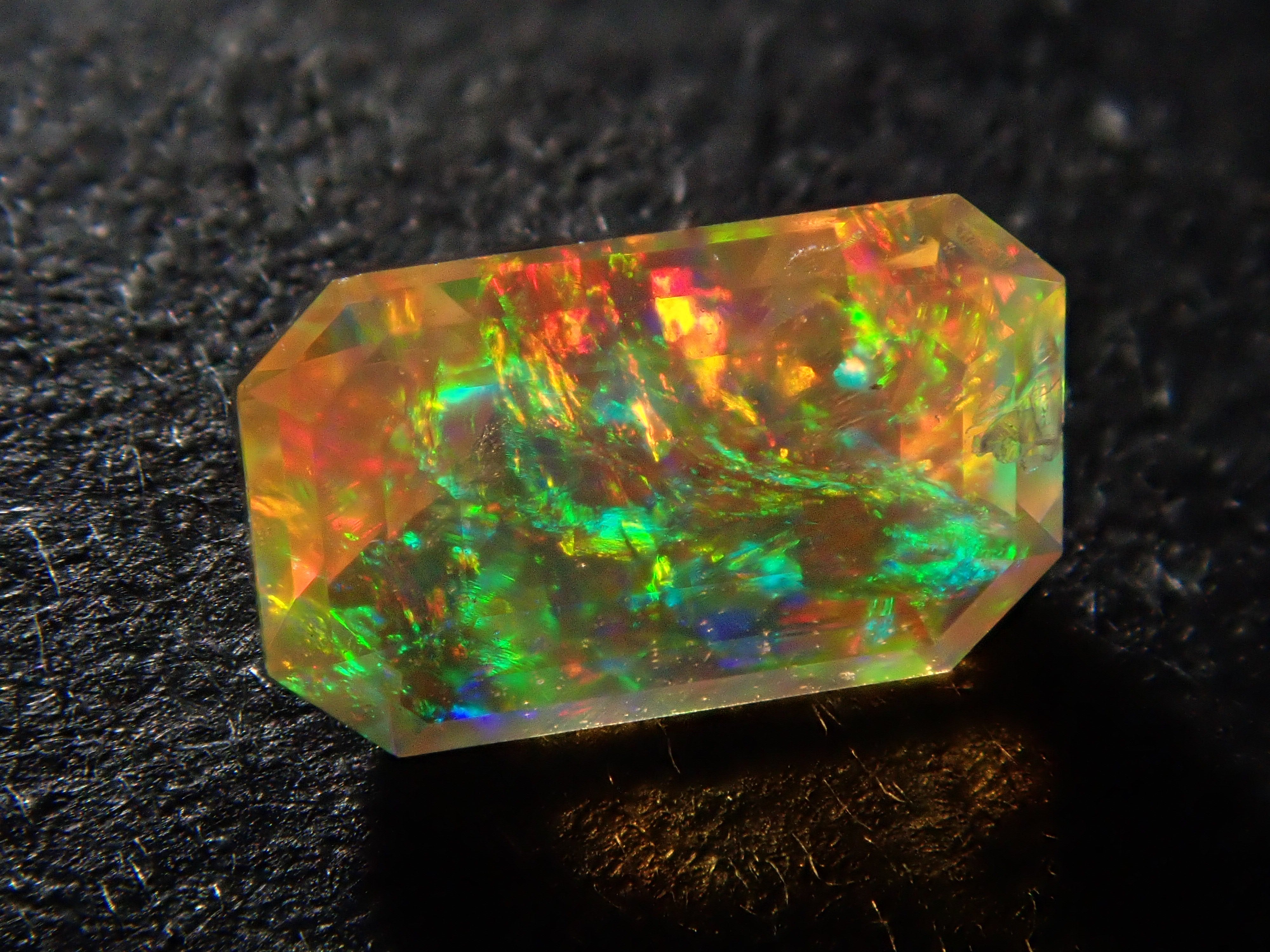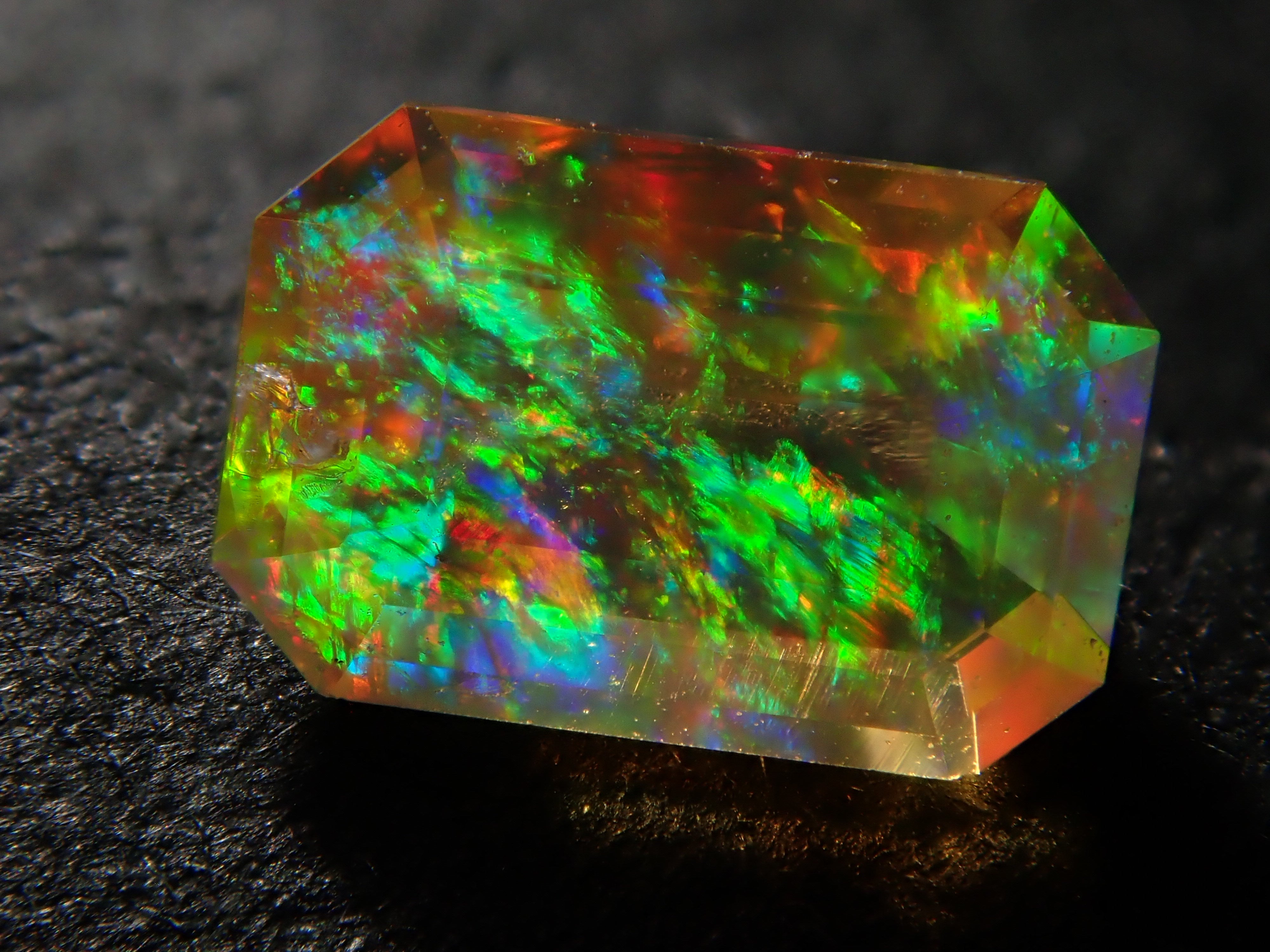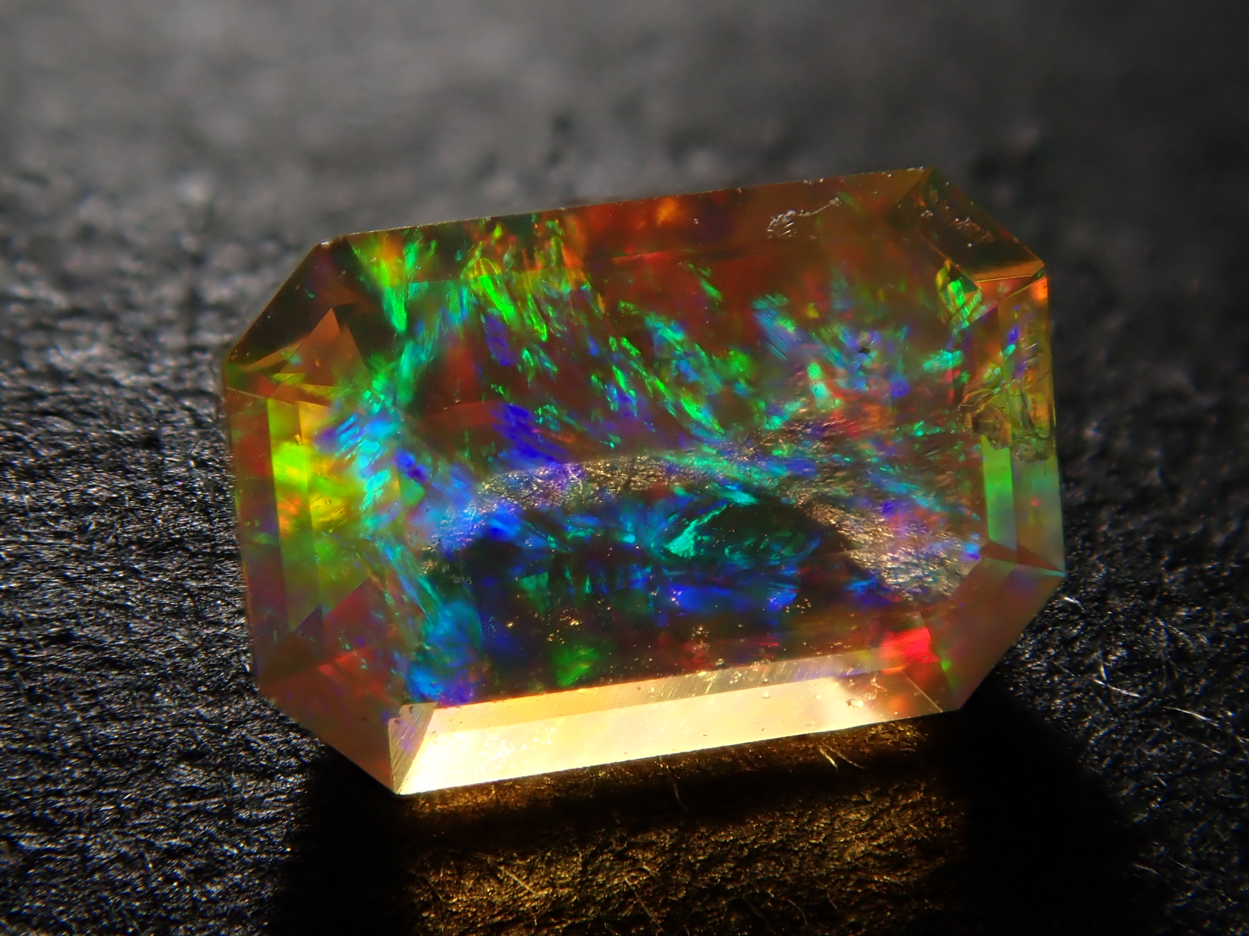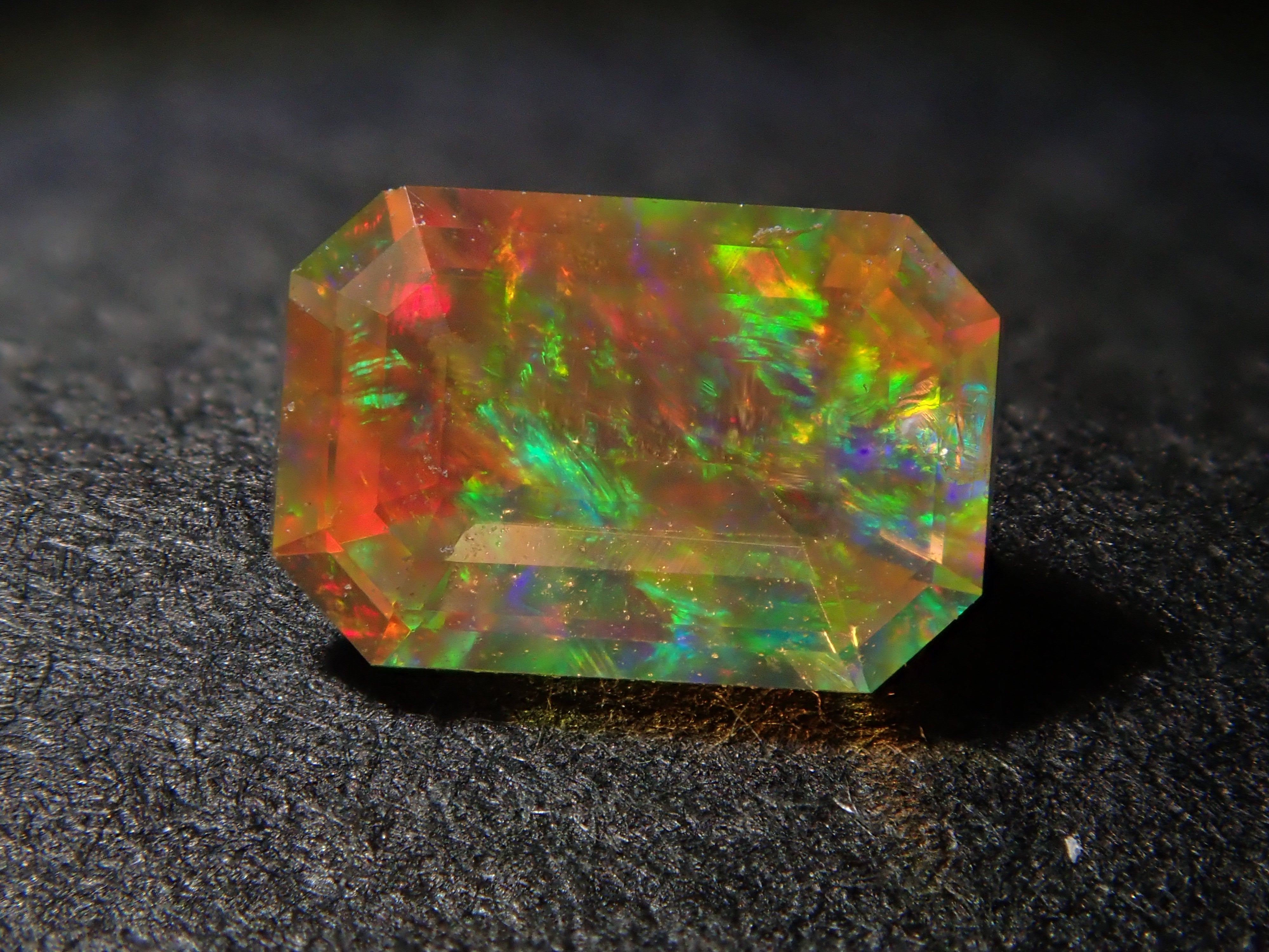 蛋白石自古羅馬時代以來就很受歡迎。火蛋白石是指底色從紅色到橘色的蛋白石,給人火的形象。照片是使用筆燈拍攝的。來自墨西哥的火蛋白石由斯里蘭卡拋光師 Sanjay 切割。 高度透明的火蛋白石,在黑色背景下閃耀時,您可以欣賞到奇妙的色彩變化。這是產自墨西哥的刻面火蛋白石。