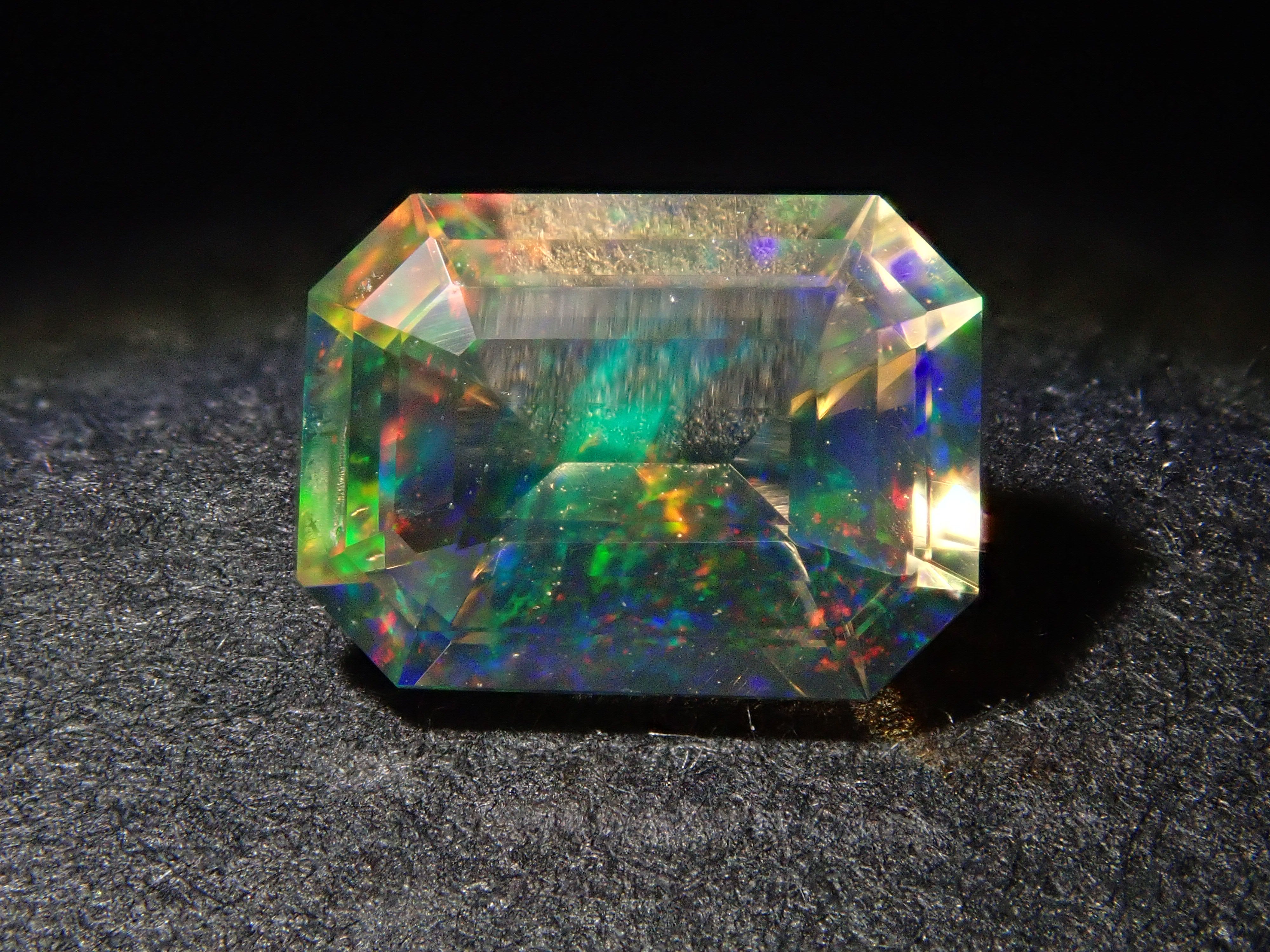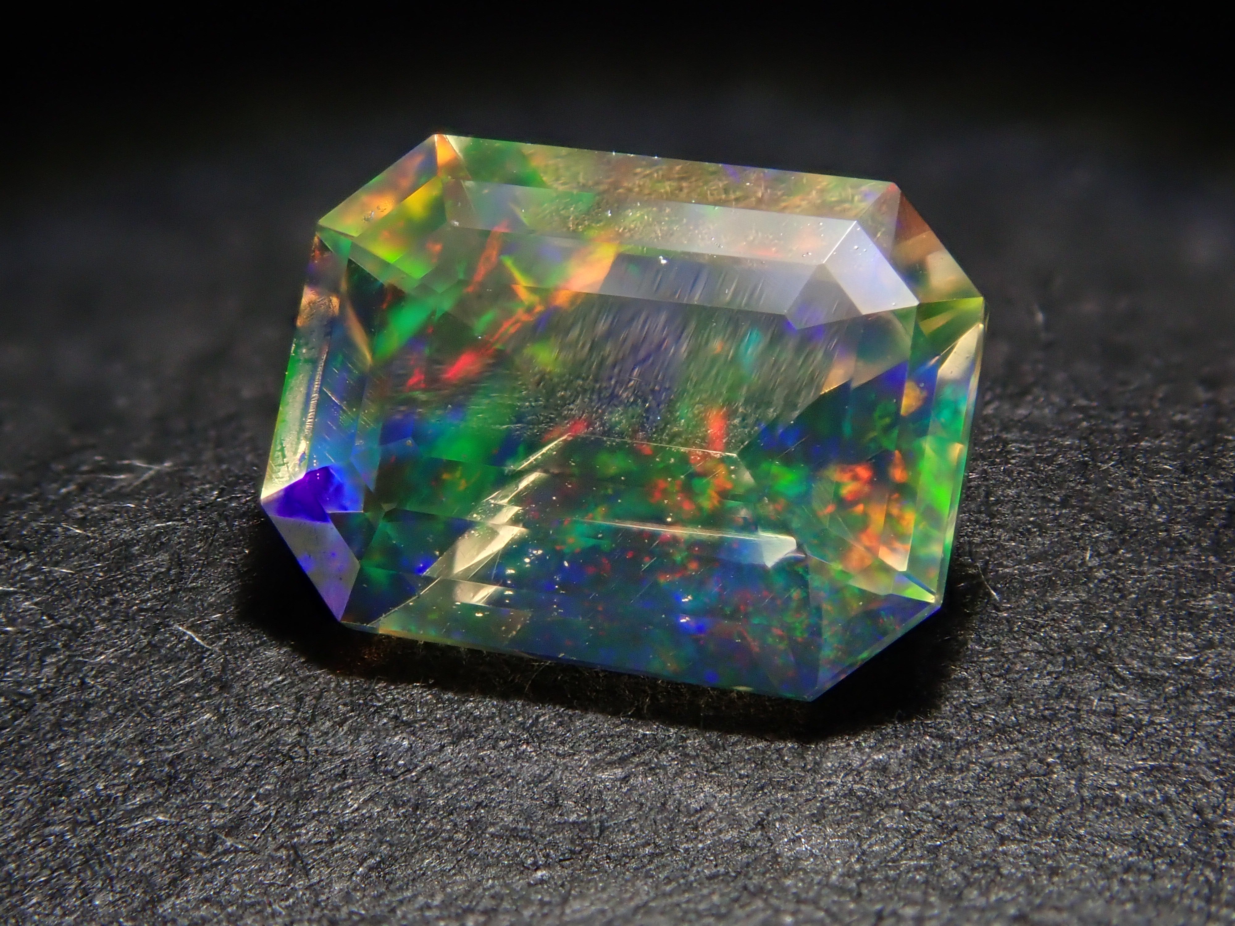 蛋白石自古羅馬時代以來就很受歡迎。火蛋白石是指底色從紅色到橘色的蛋白石,給人火的形象。照片是使用筆燈拍攝的。墨西哥火蛋白石 0.576 克拉,由斯里蘭卡拋光師 Sanjay 進行散切。如果在黑色背景上照射光線,您可以享受奇妙的色彩變化。這是產自墨西哥的刻面火蛋白石。