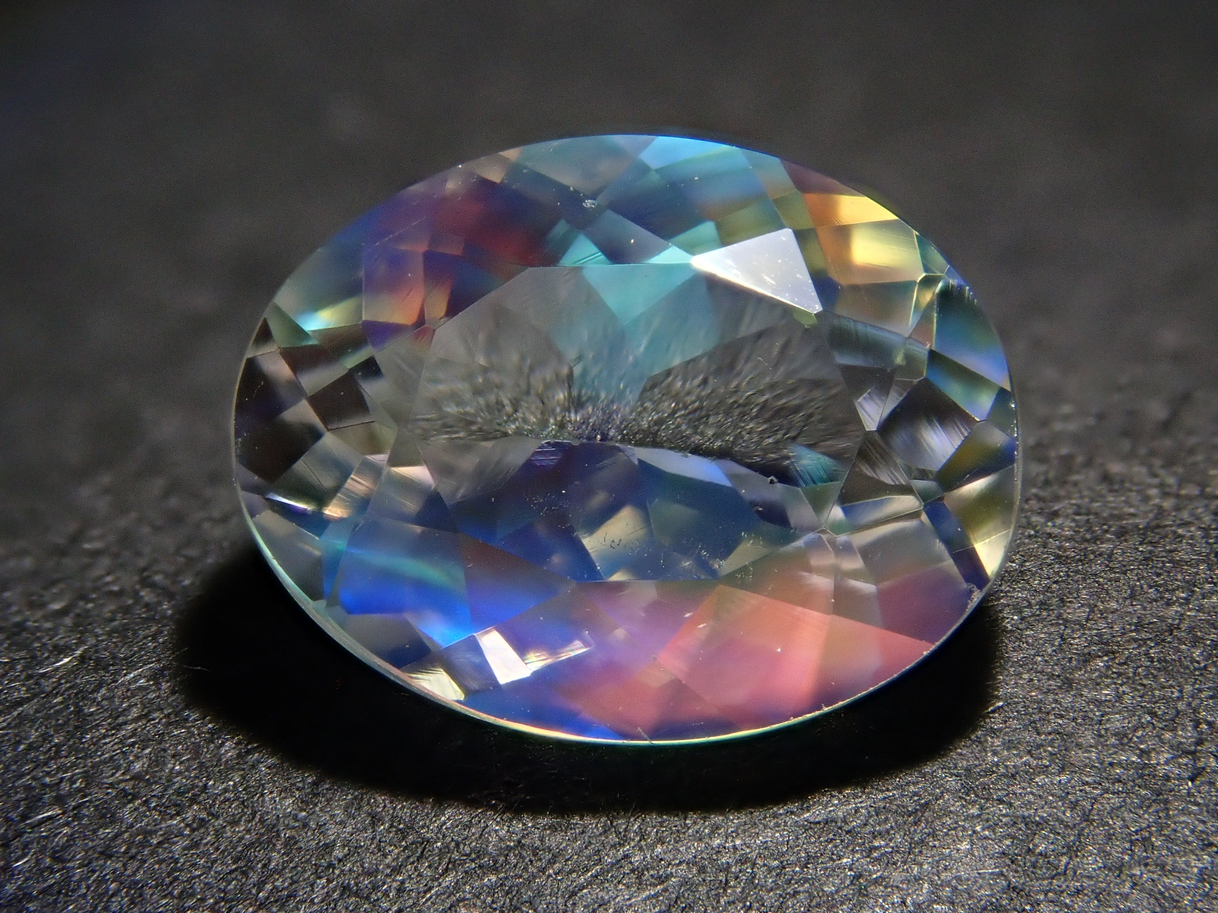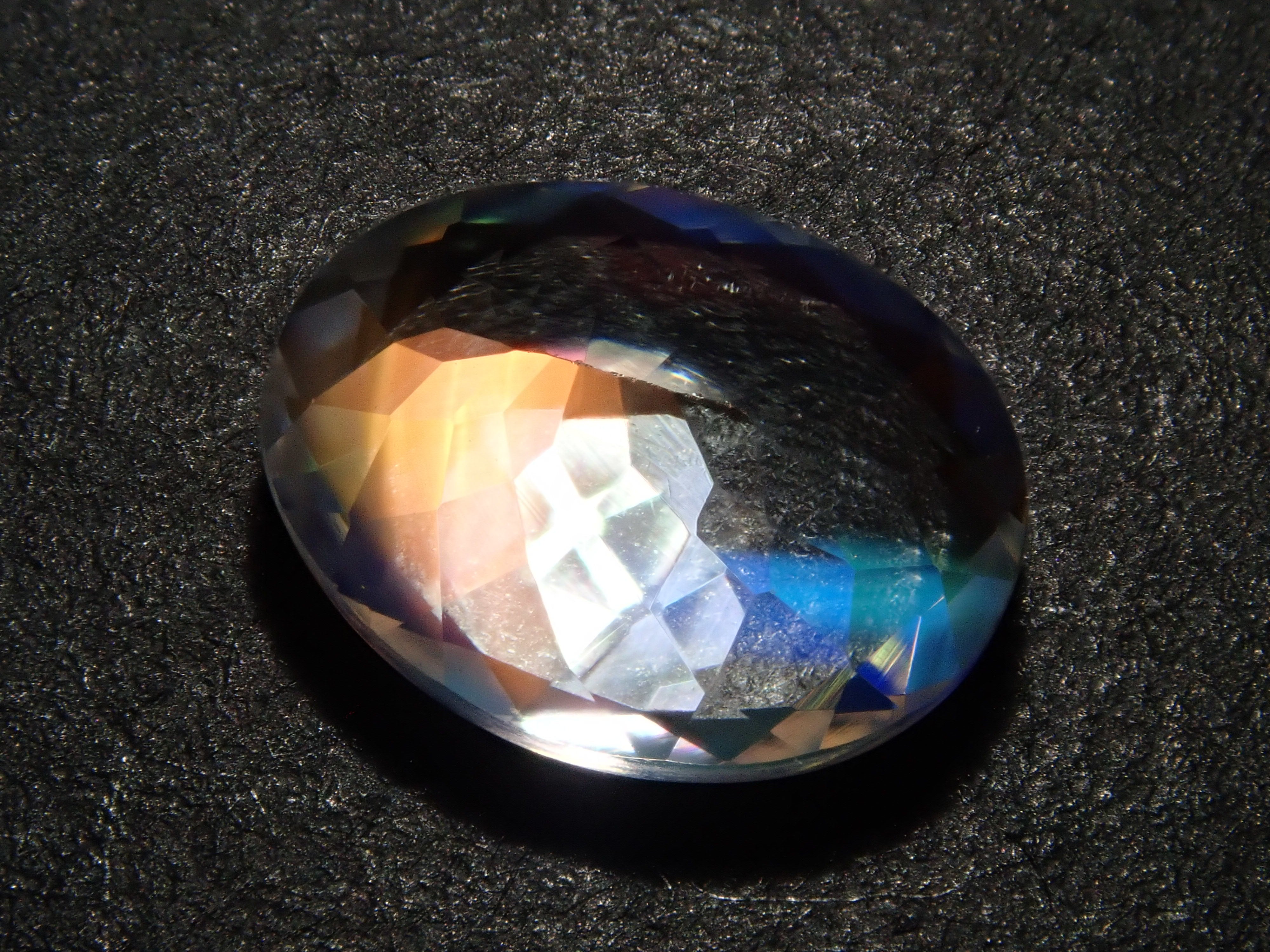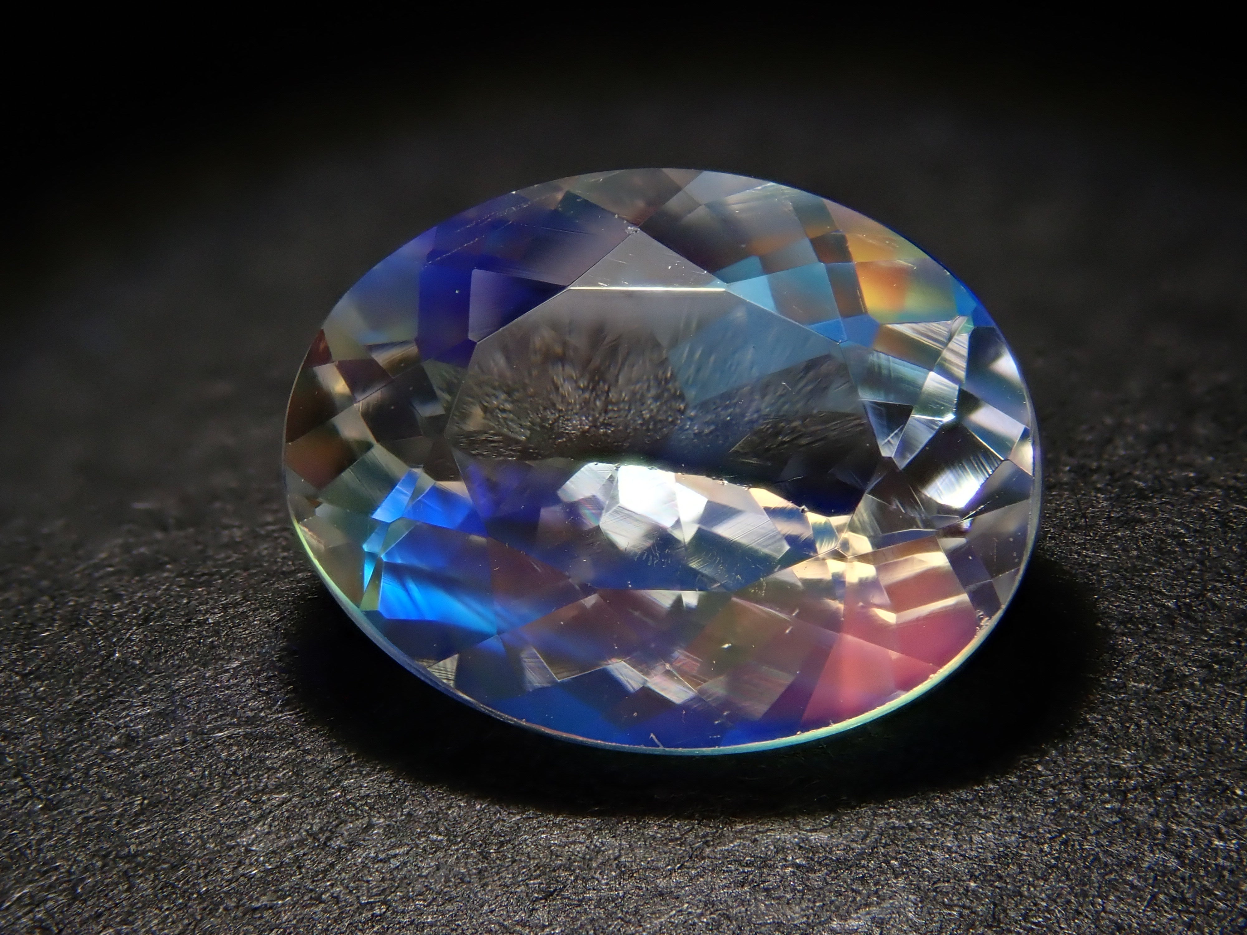 它是一種位於中長石和拉長石之間的寶石,它們屬於同一斜長石族。閃閃發光的彩虹色光學效果是如此神秘,讓您想永遠看著它。產自馬達加斯加的 1.911 克拉鬆散安山拉長石(俗稱彩虹月光石),具有美麗的彩虹西拉和高透明度。