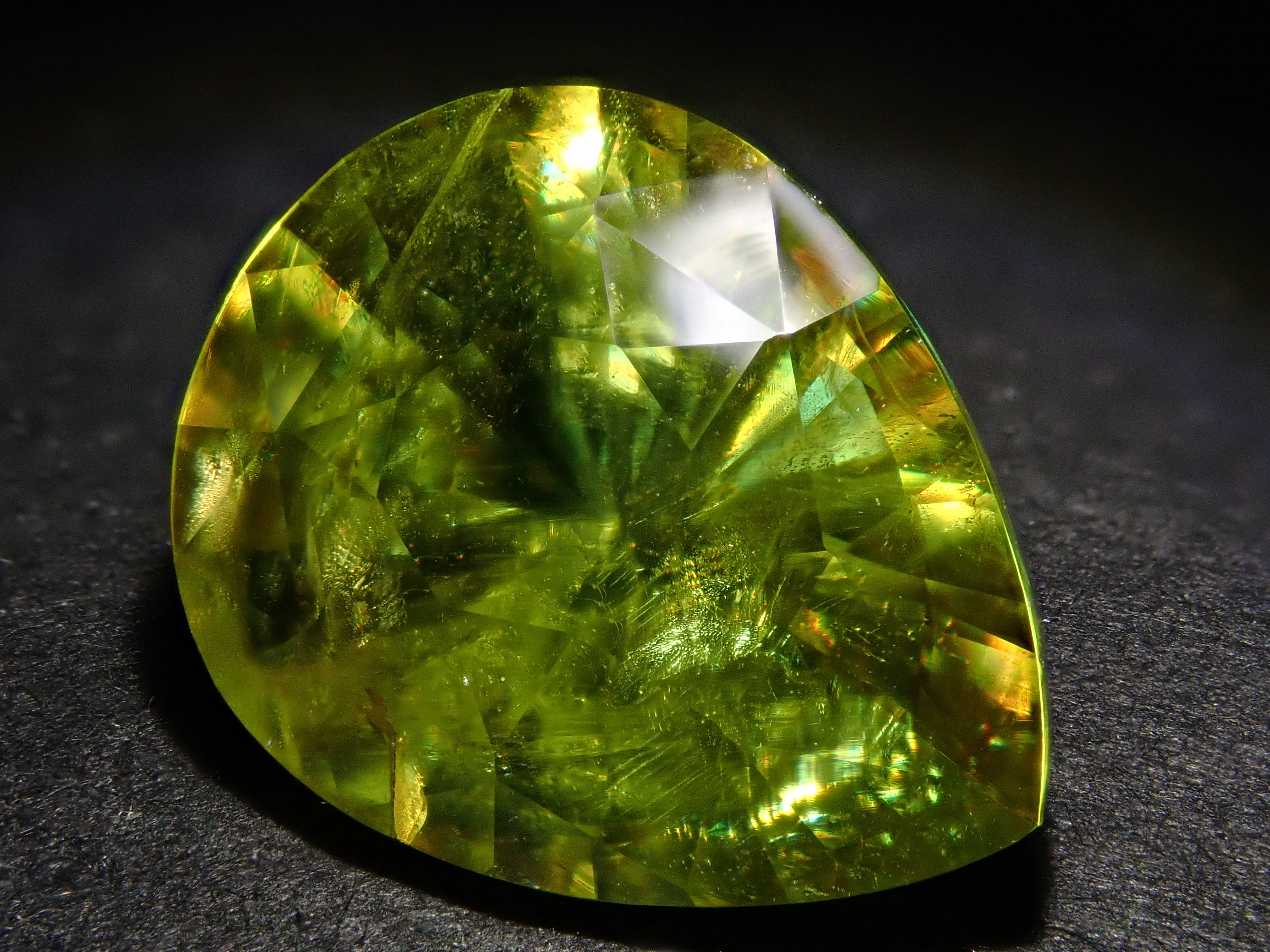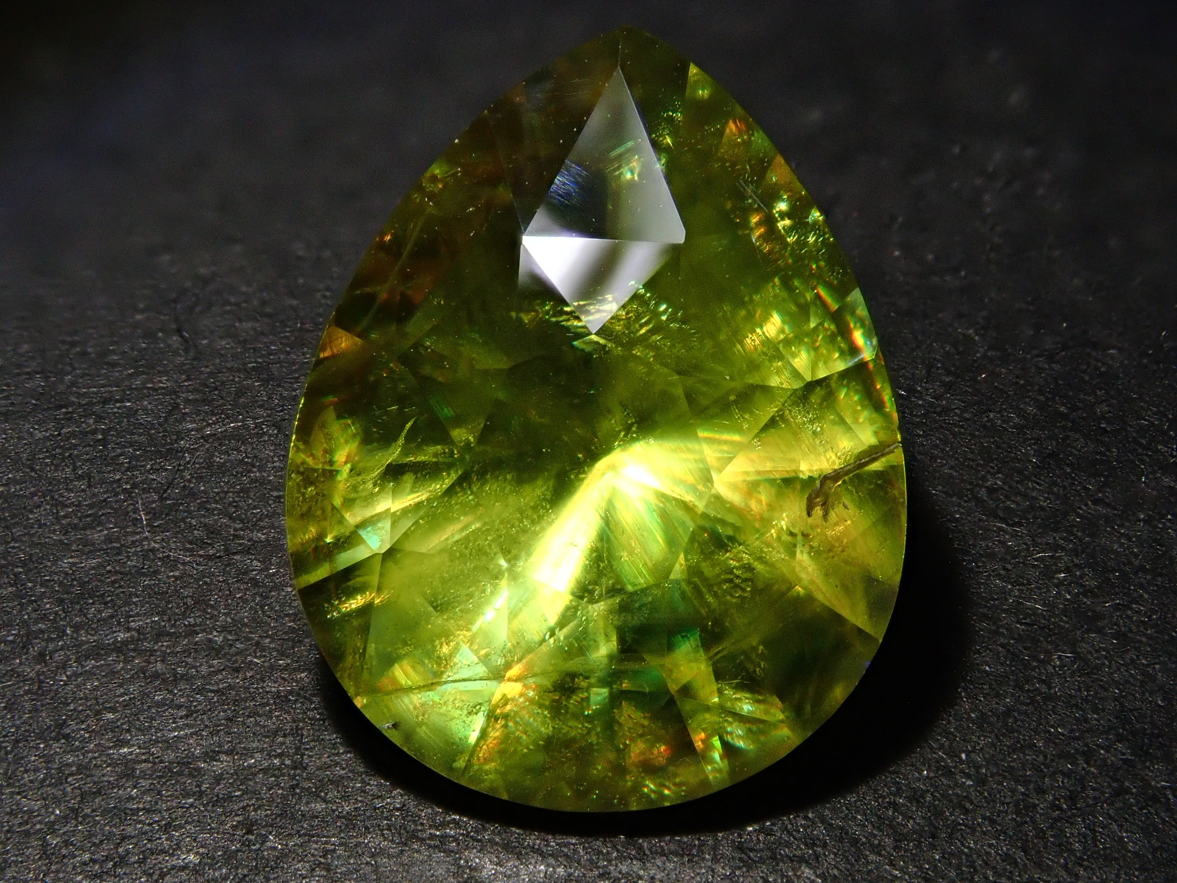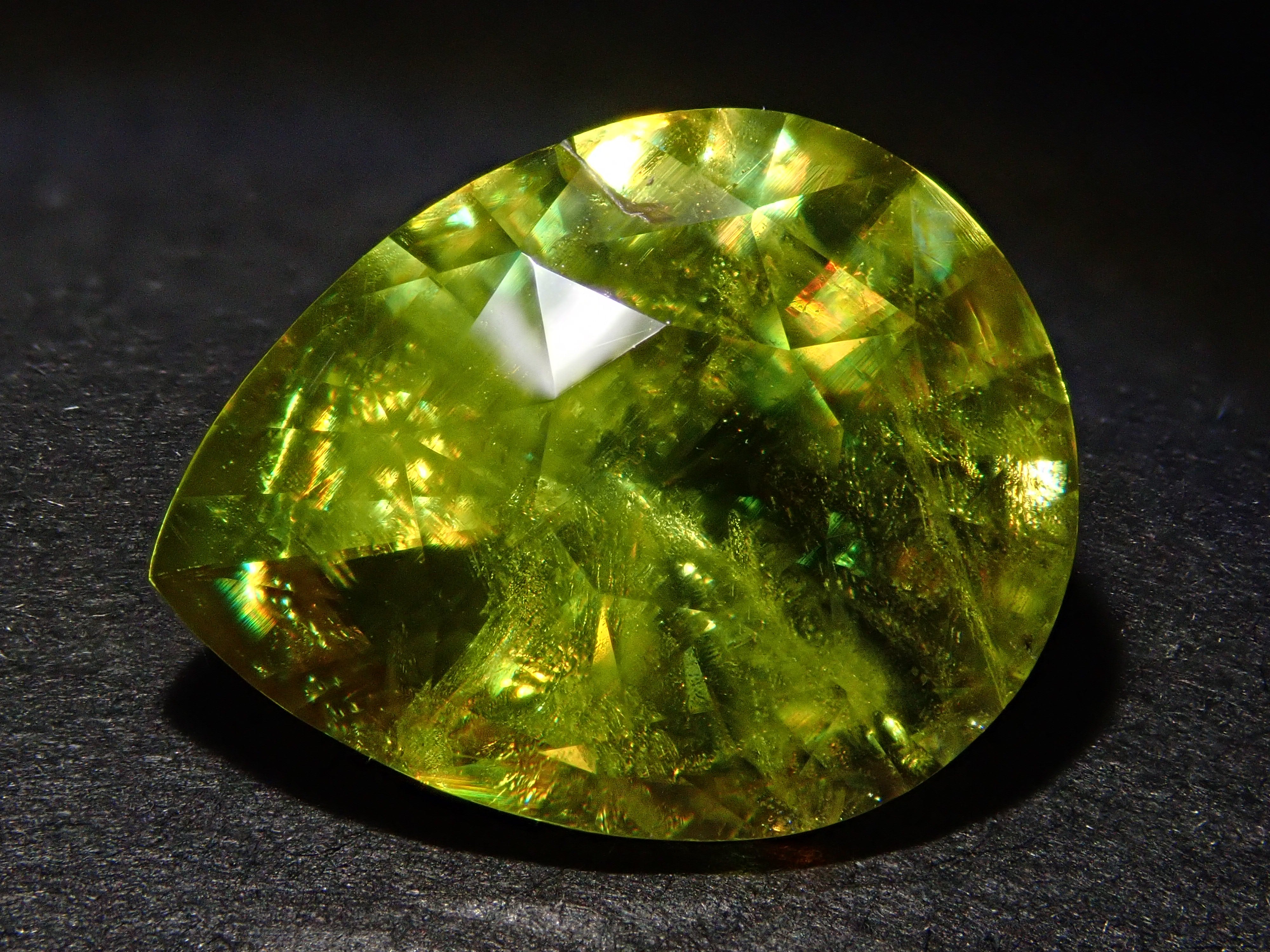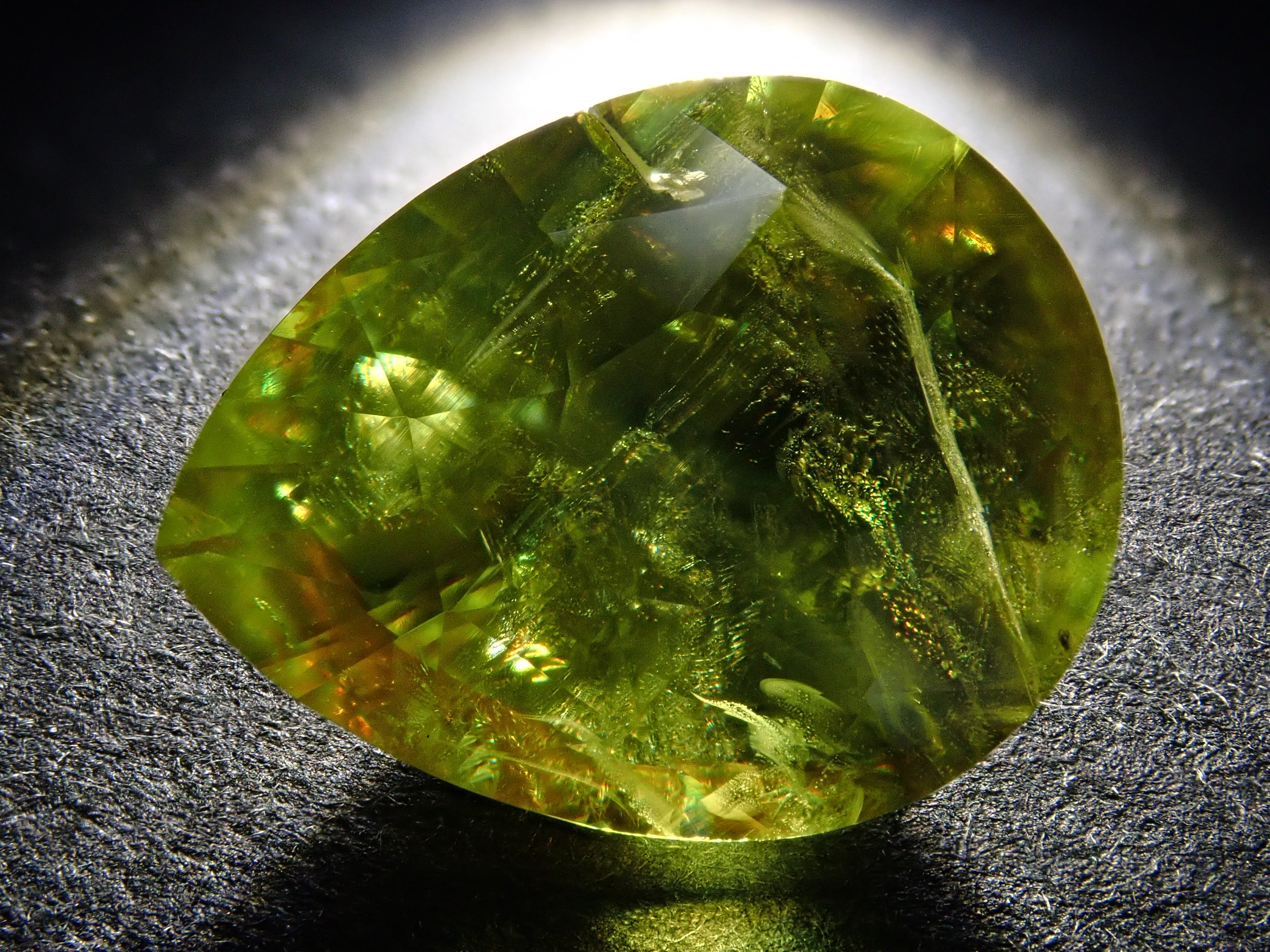 呈現出金色光芒和奢華火焰的榍石。它作為一種有吸引力的寶石而受到收藏家的歡迎,它散發出比鑽石更強大的火彩。輝度隨角度而快速變化的榍石。請在陽光下在手中滾動並觀察。請注意,有些照片是使用筆燈拍攝的。