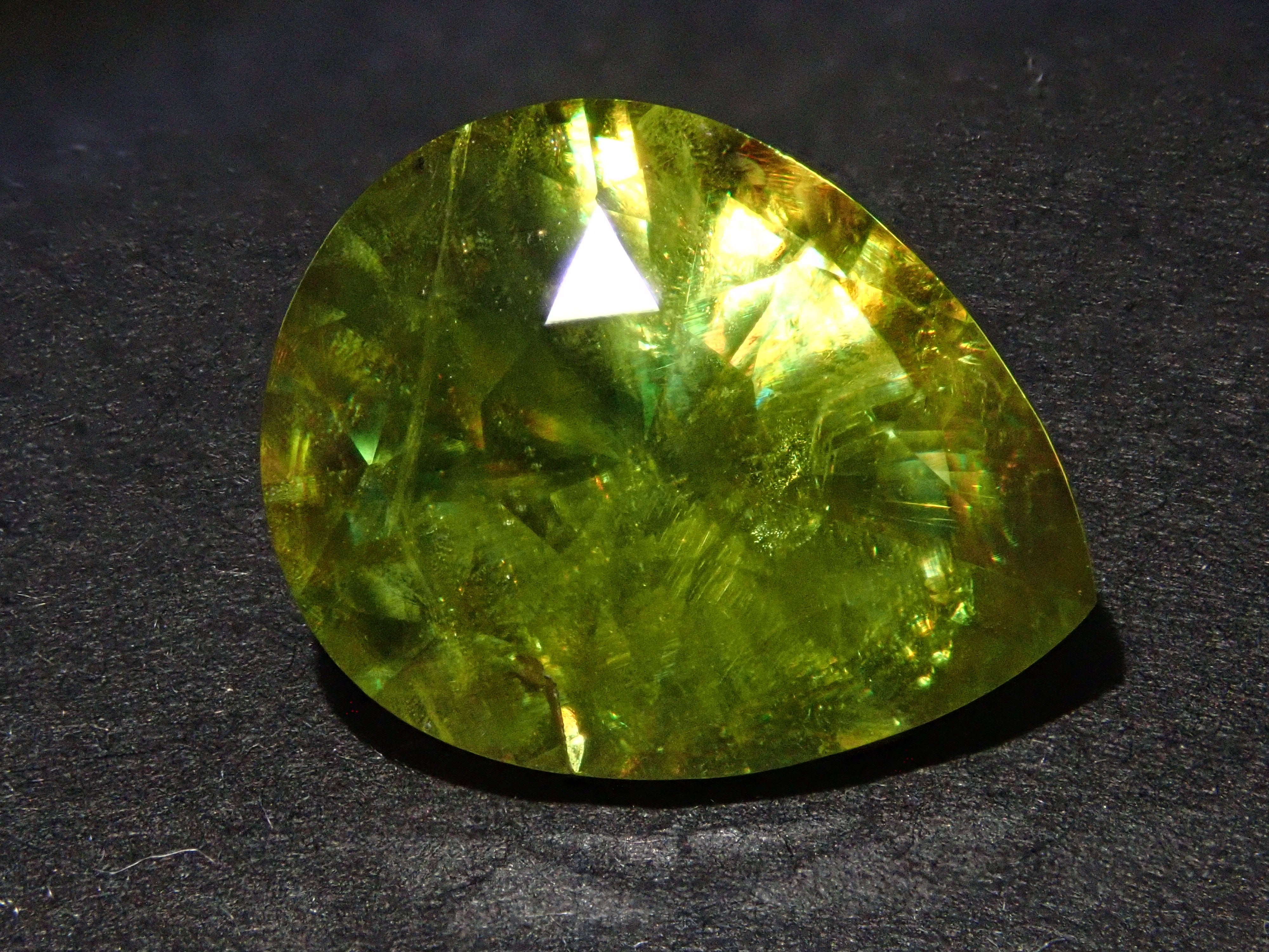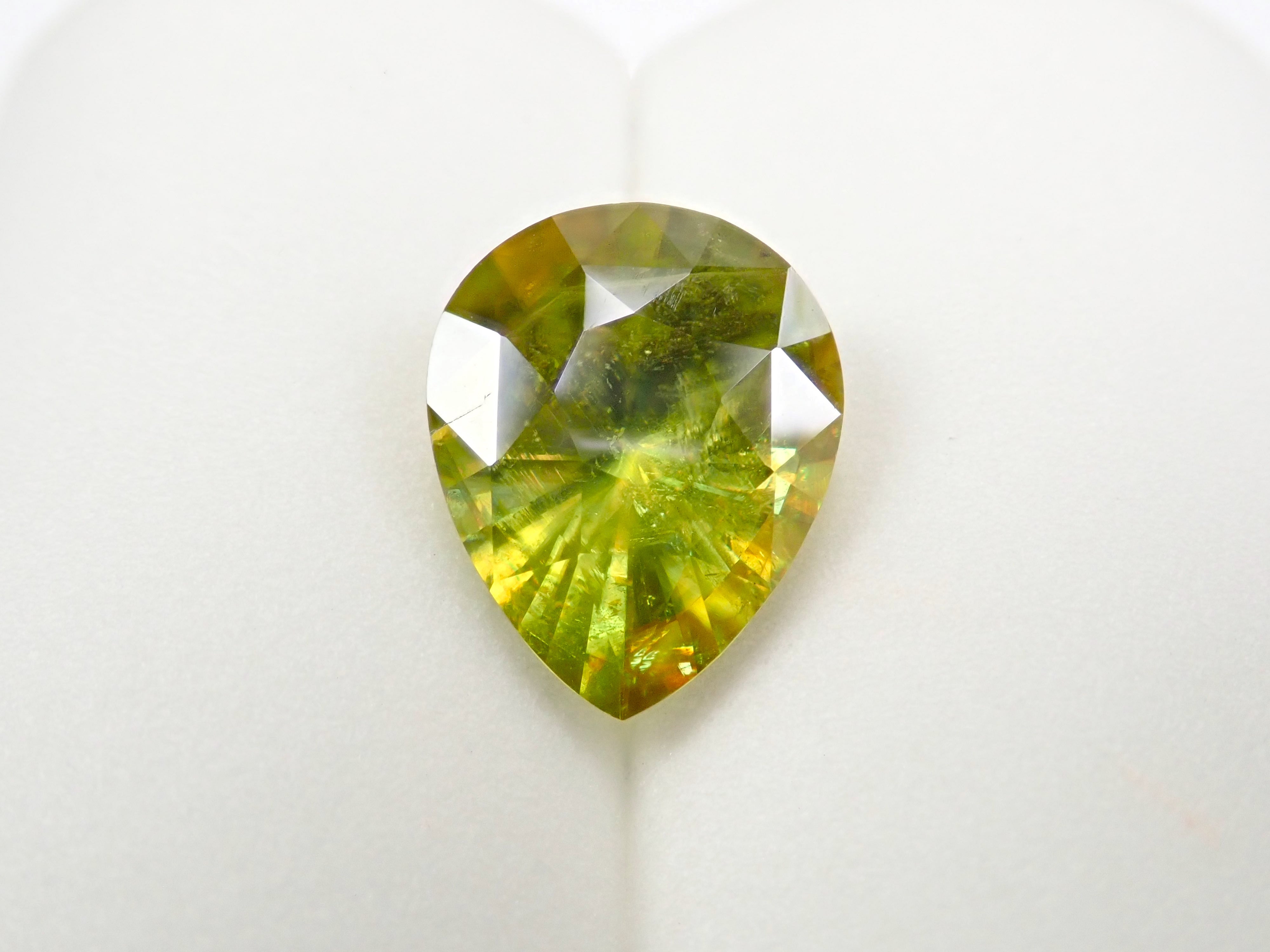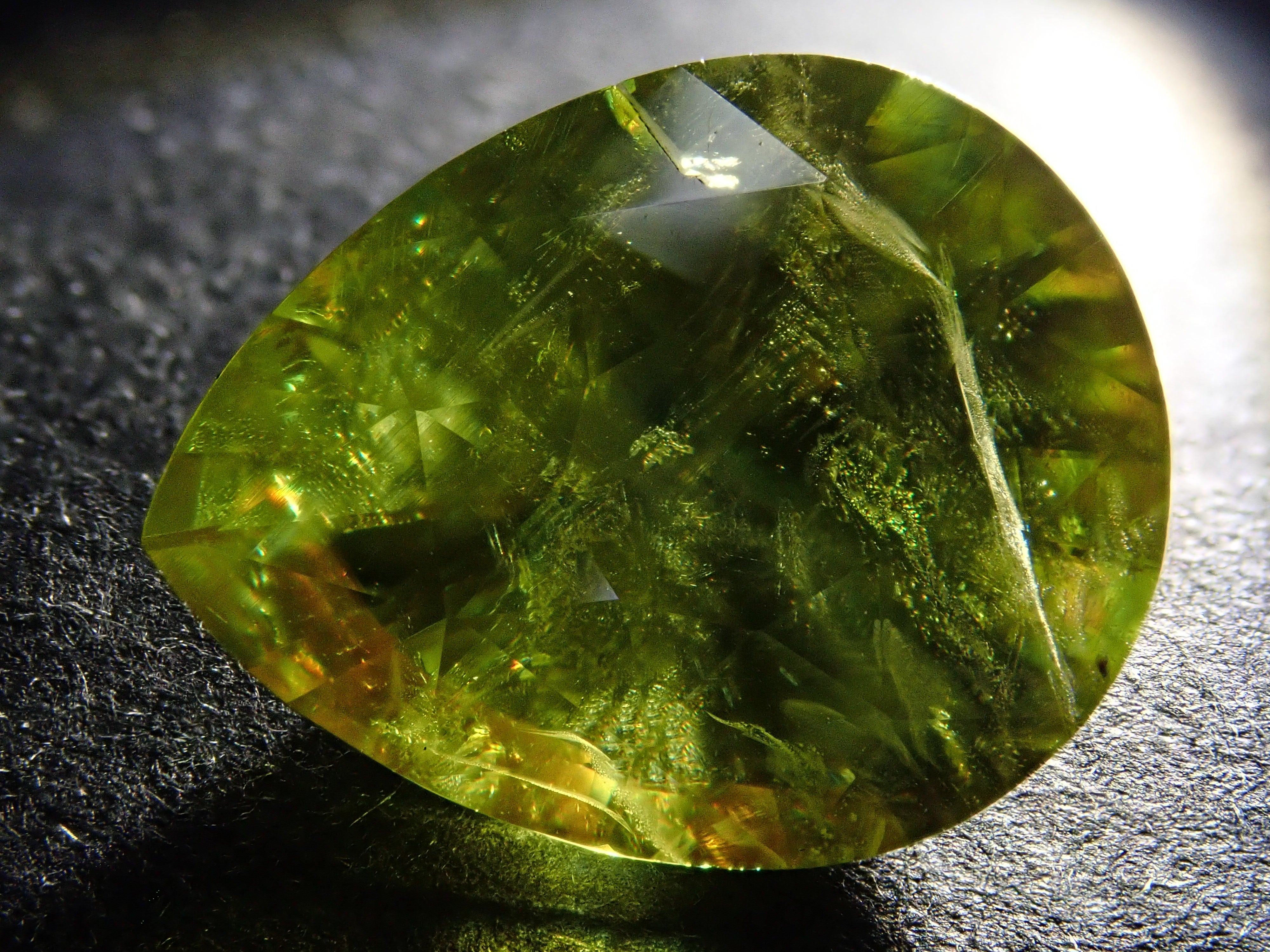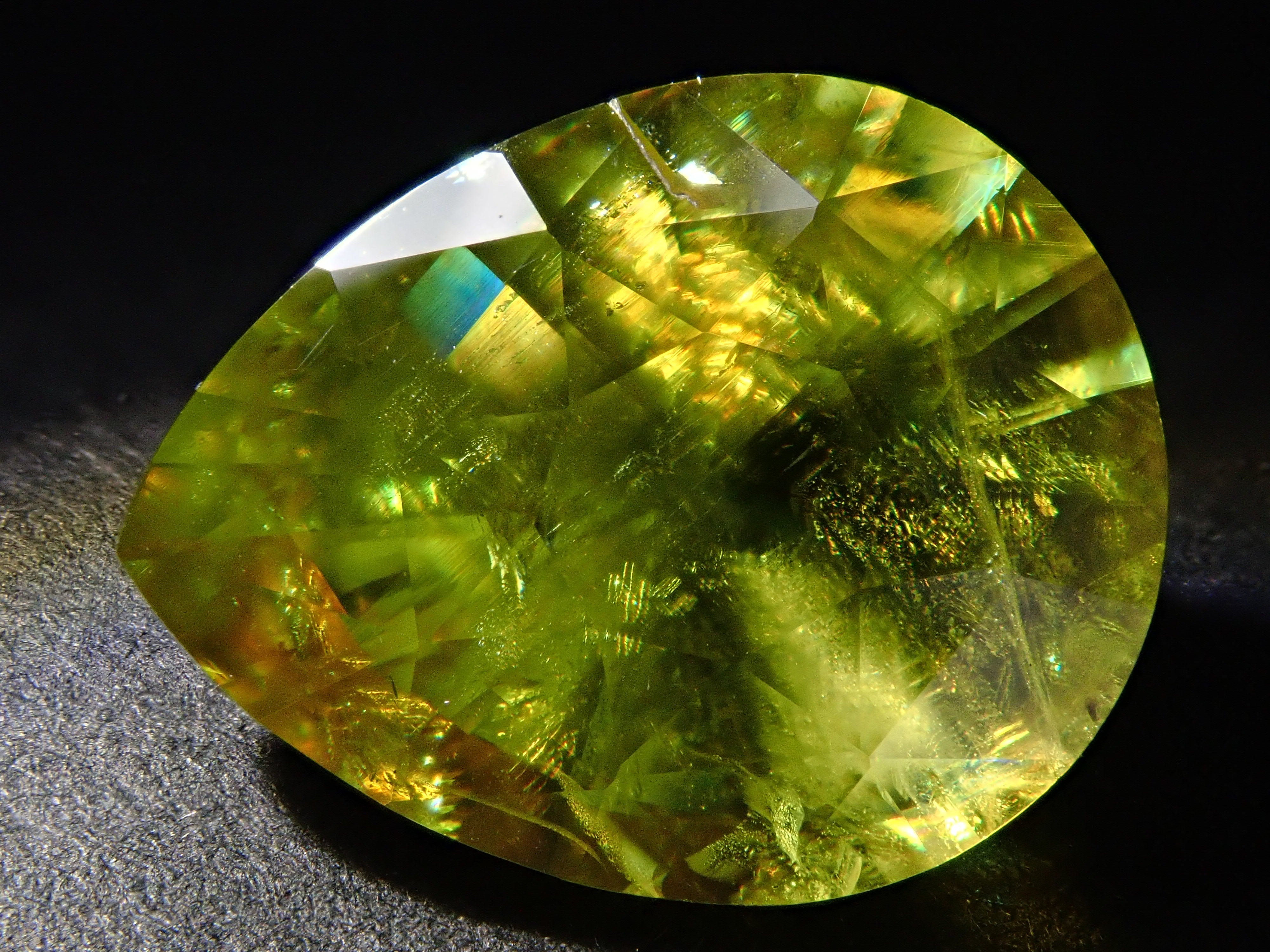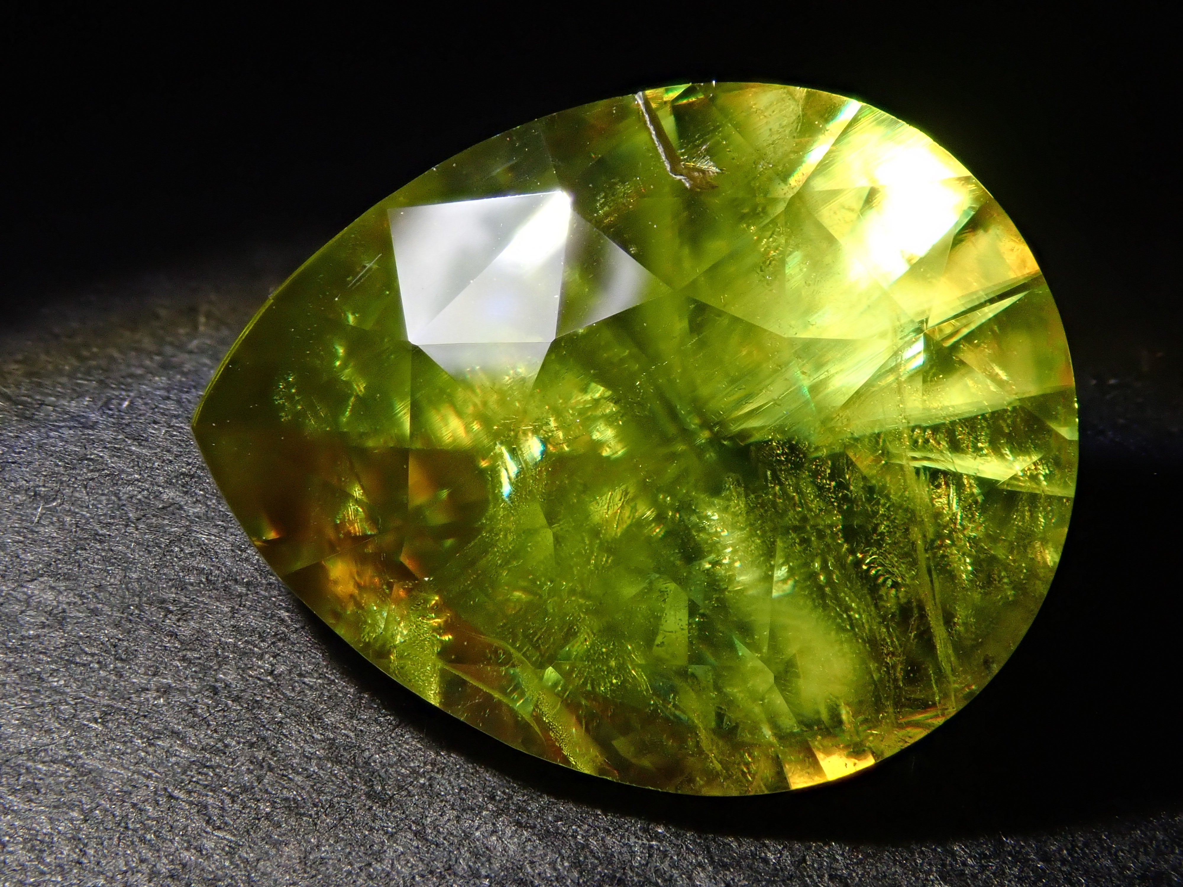 呈現出金色光芒和奢華火焰的榍石。它作為一種有吸引力的寶石而受到收藏家的歡迎,它散發出比鑽石更強大的火彩。輝度隨角度而快速變化的榍石。請在陽光下在手中滾動並觀察。請注意,有些照片是使用筆燈拍攝的。