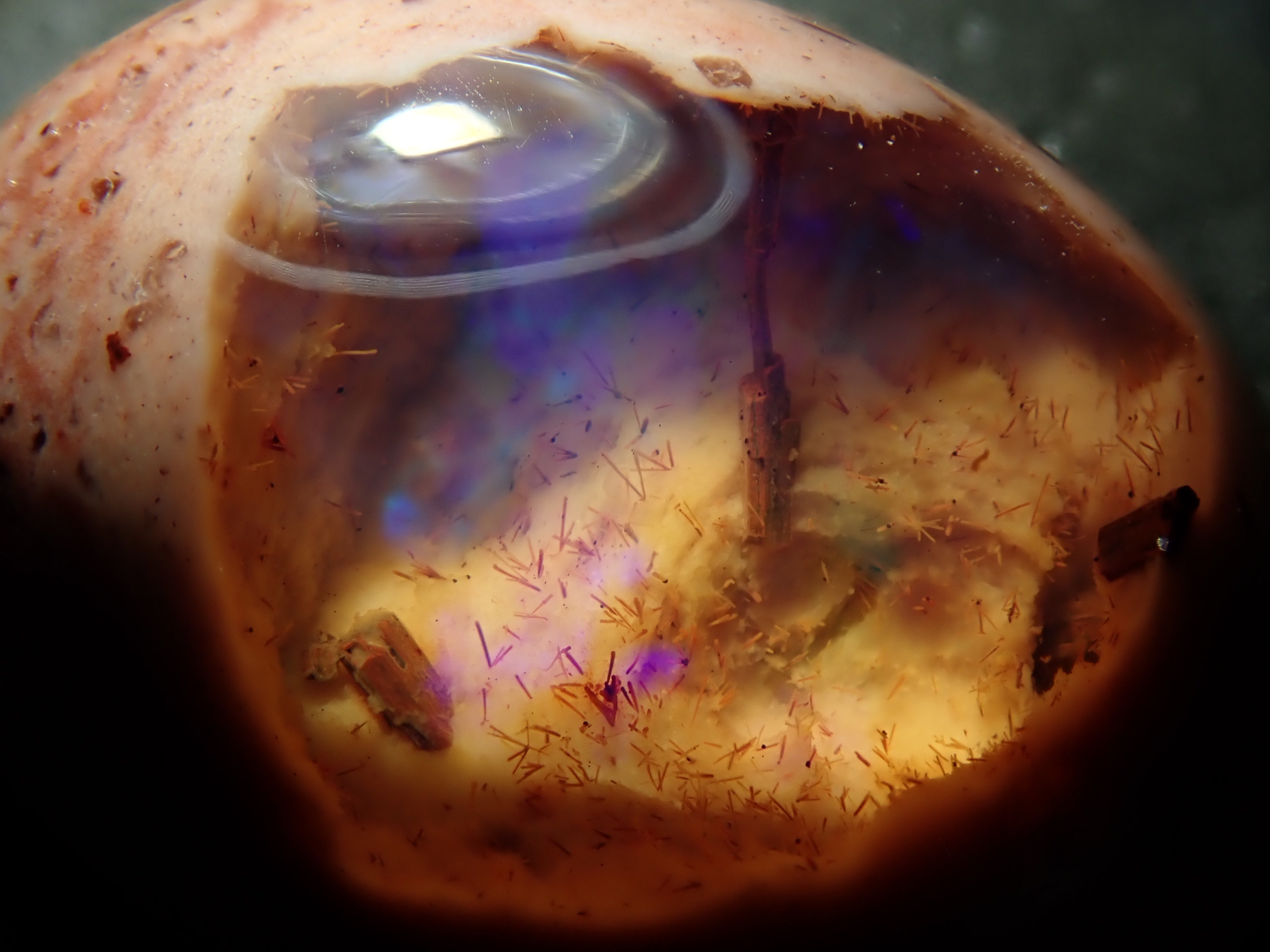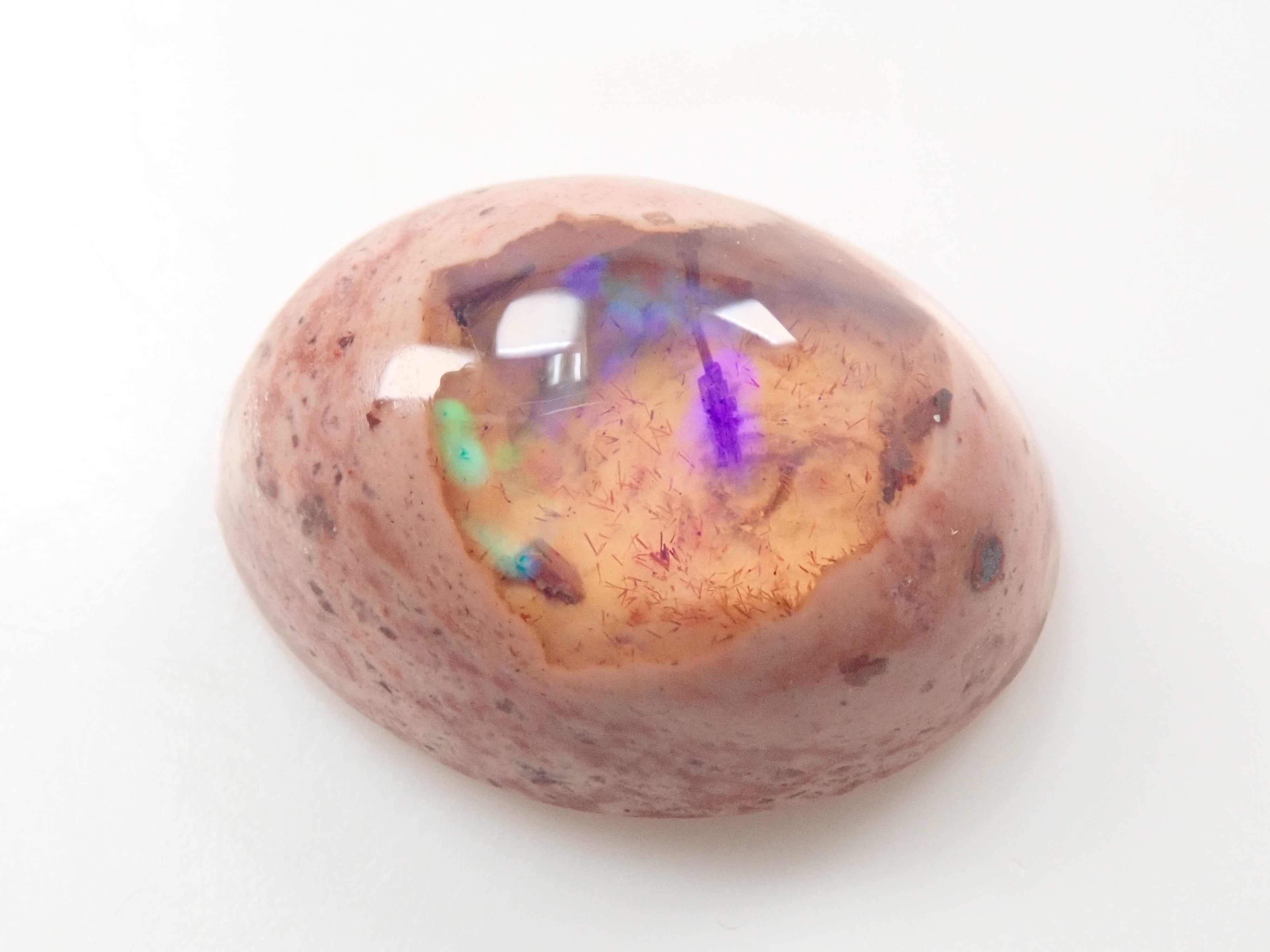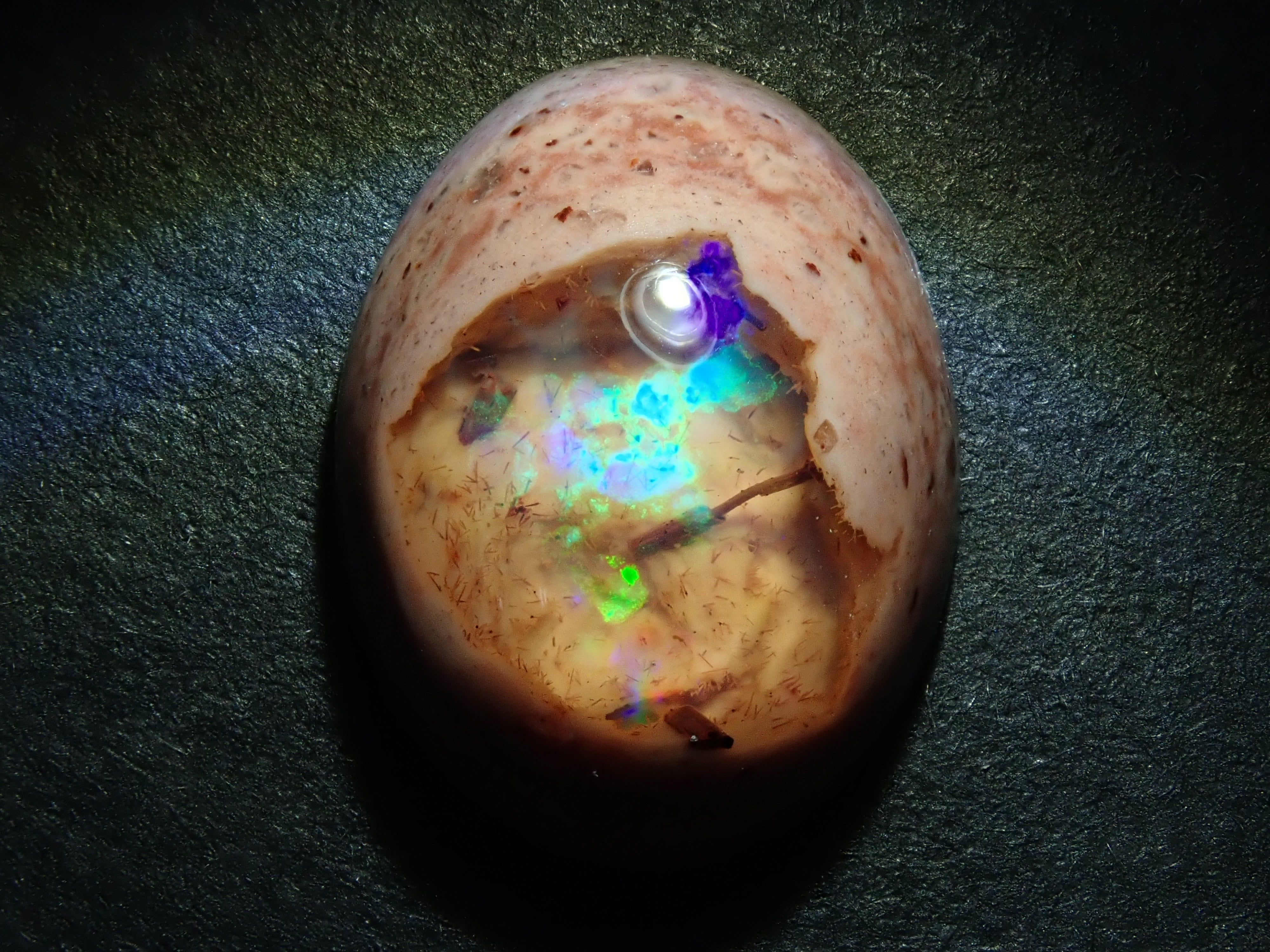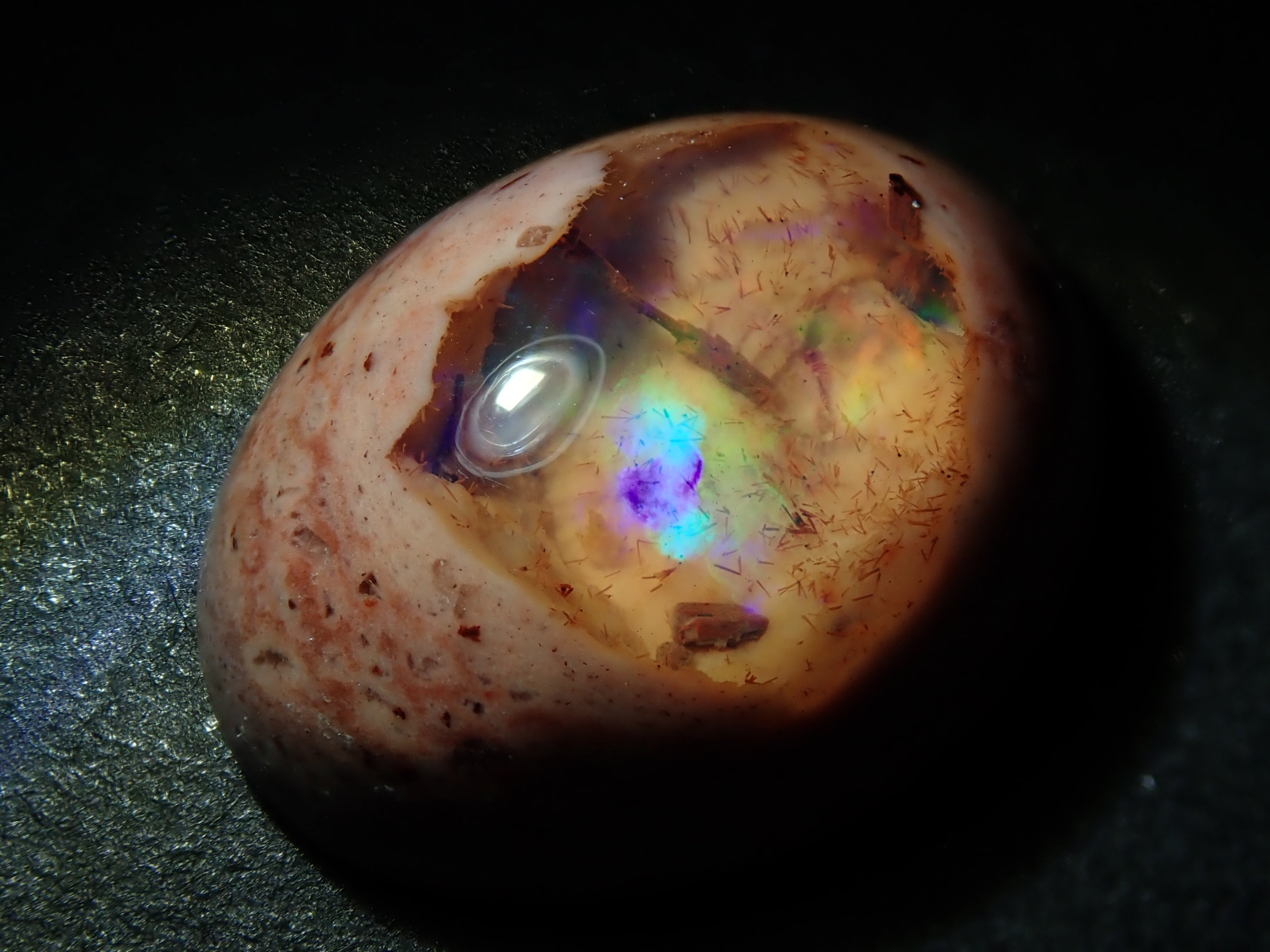 蛋白石是一種以彩虹般閃耀的色彩為特徵的寶石。蛋白石種類繁多,但最受收藏家青睞的是坎特拉蛋白石。它散發著大地的活力,擁有眾多愛好者,即使是散石也可以欣賞。坎特拉蛋白石本身就是一種擁有大量寶石的寶石。照片是用筆形電筒拍攝的。這顆產自墨西哥的4.973克拉散石坎特拉蛋白石,有著洞穴般的質感,讓人彷彿置身於色彩的海洋之中。
