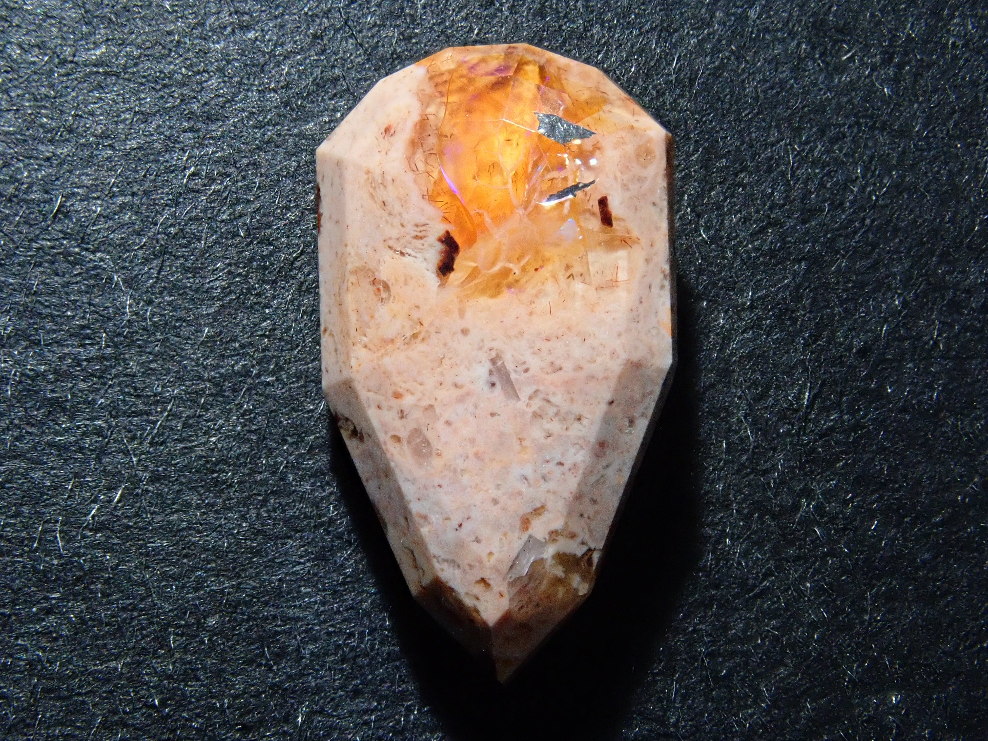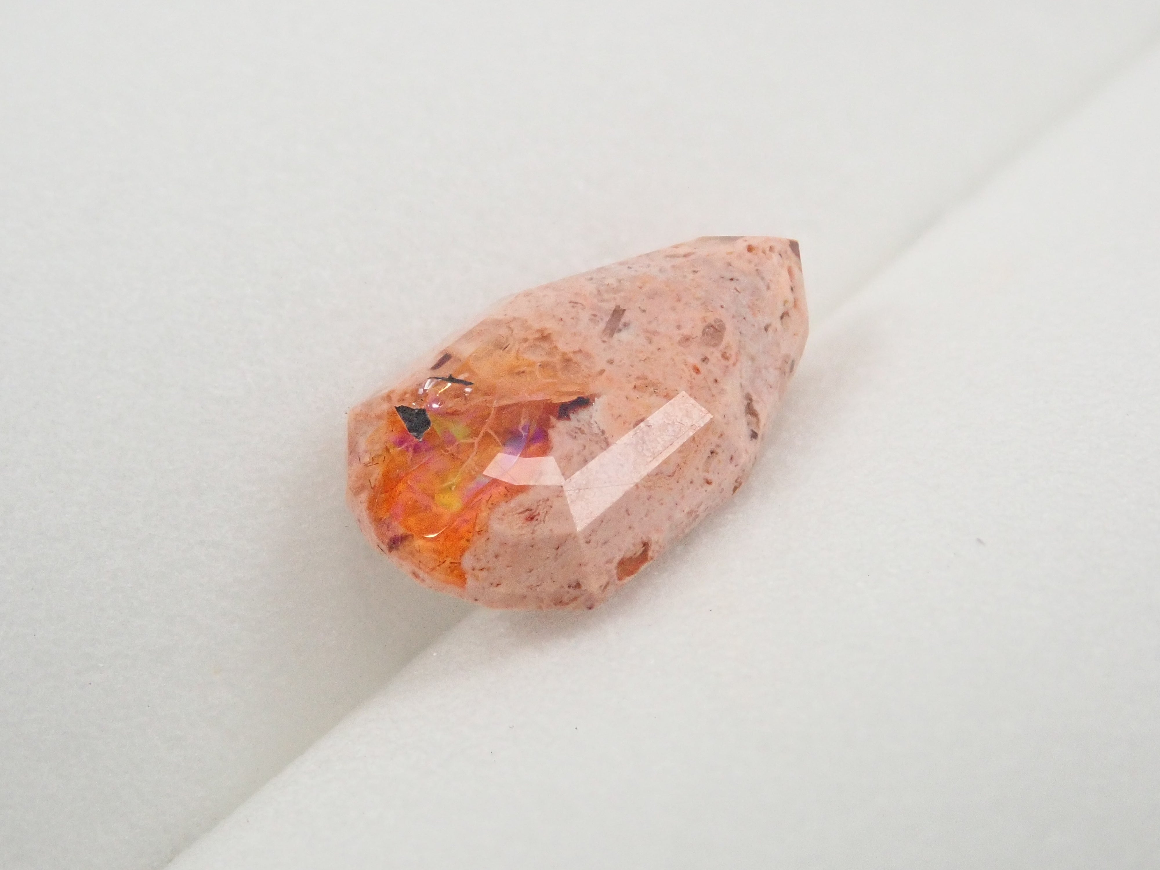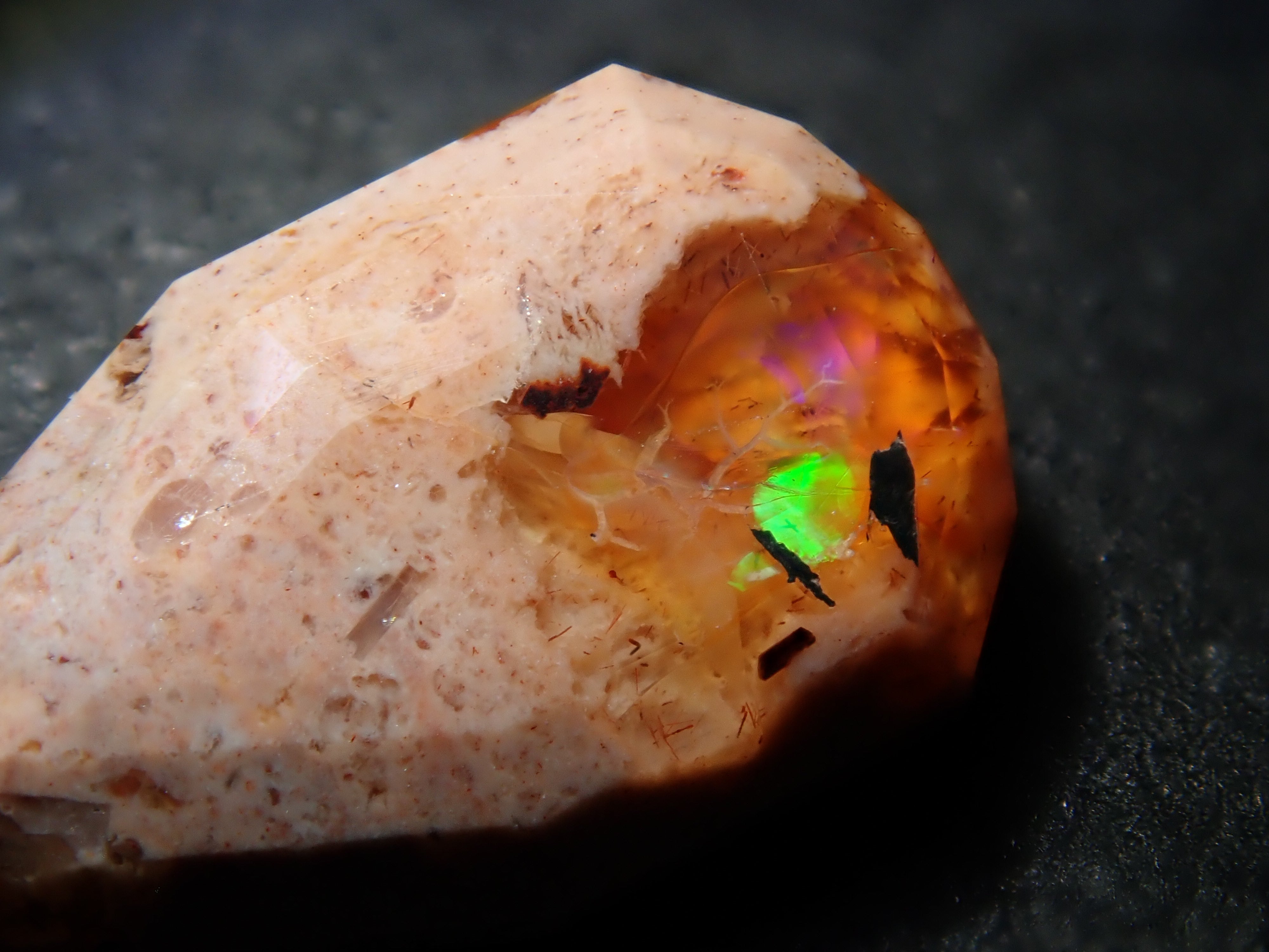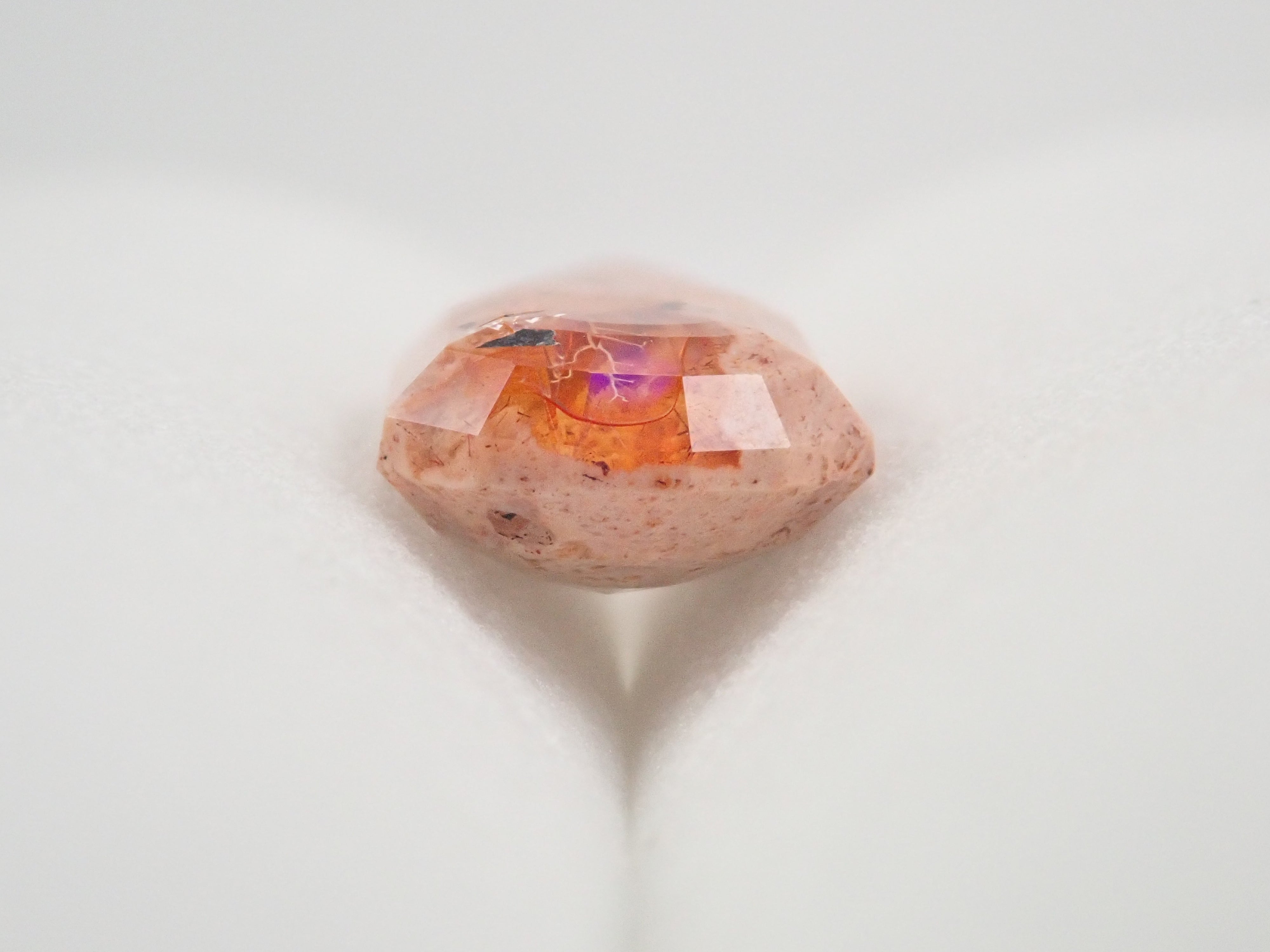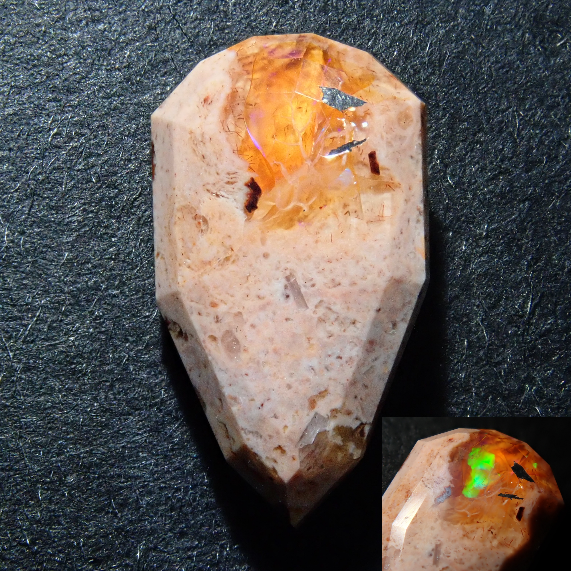 蛋白石是一種閃爍著彩虹色光芒的寶石。蛋白石有多種類型,但其中坎特拉蛋白石最受收藏家歡迎。它是一種寶石,擁有許多感受到大地活力的愛好者,甚至可以鬆散地欣賞它。 Cantera 蛋白石原本是一種有許多環的寶石。照片是使用筆燈拍攝的。 這是一顆墨西哥坎特拉蛋白石,有刻面切割。由斯里蘭卡拋光師 Sanjay 切割。