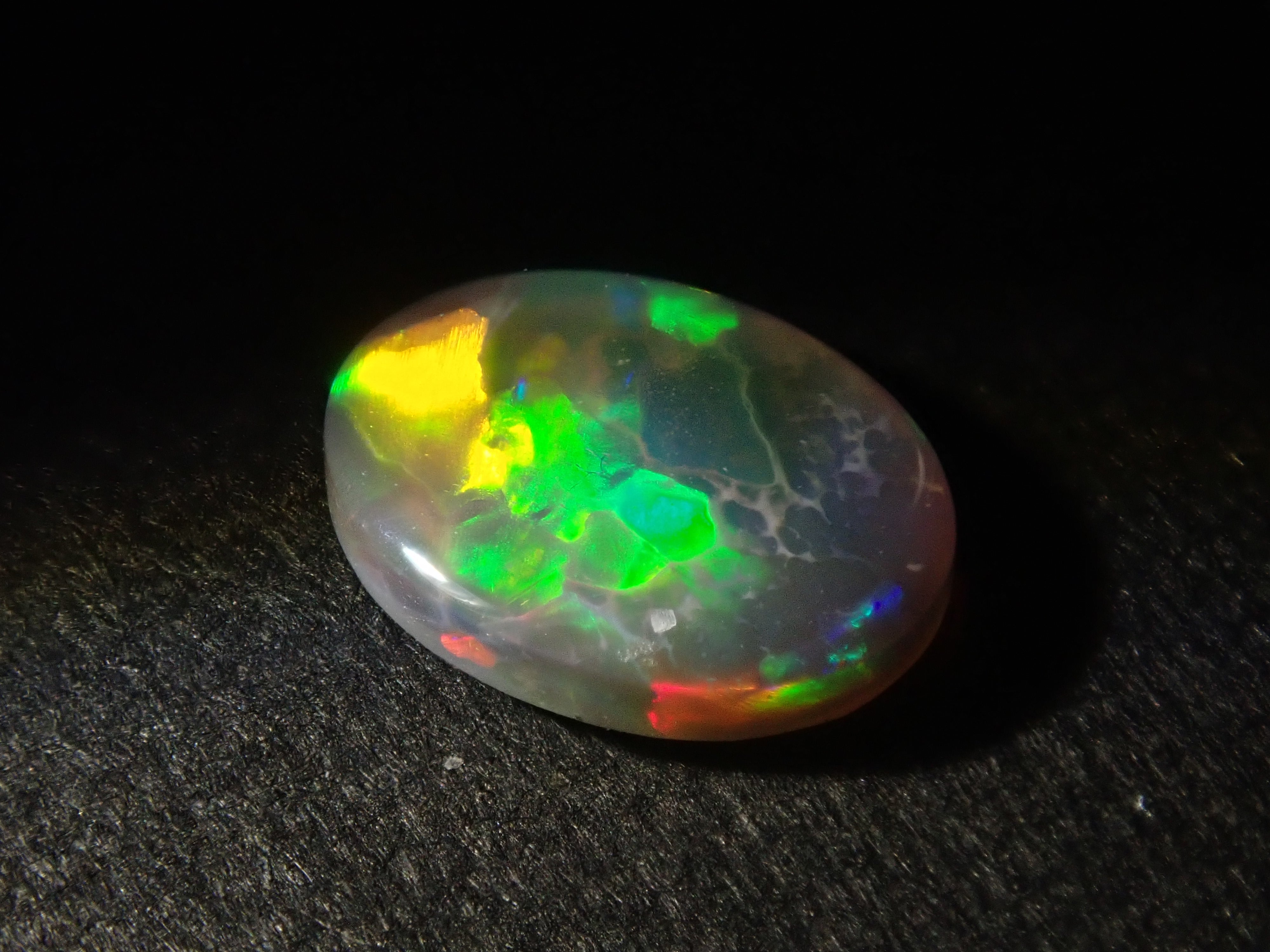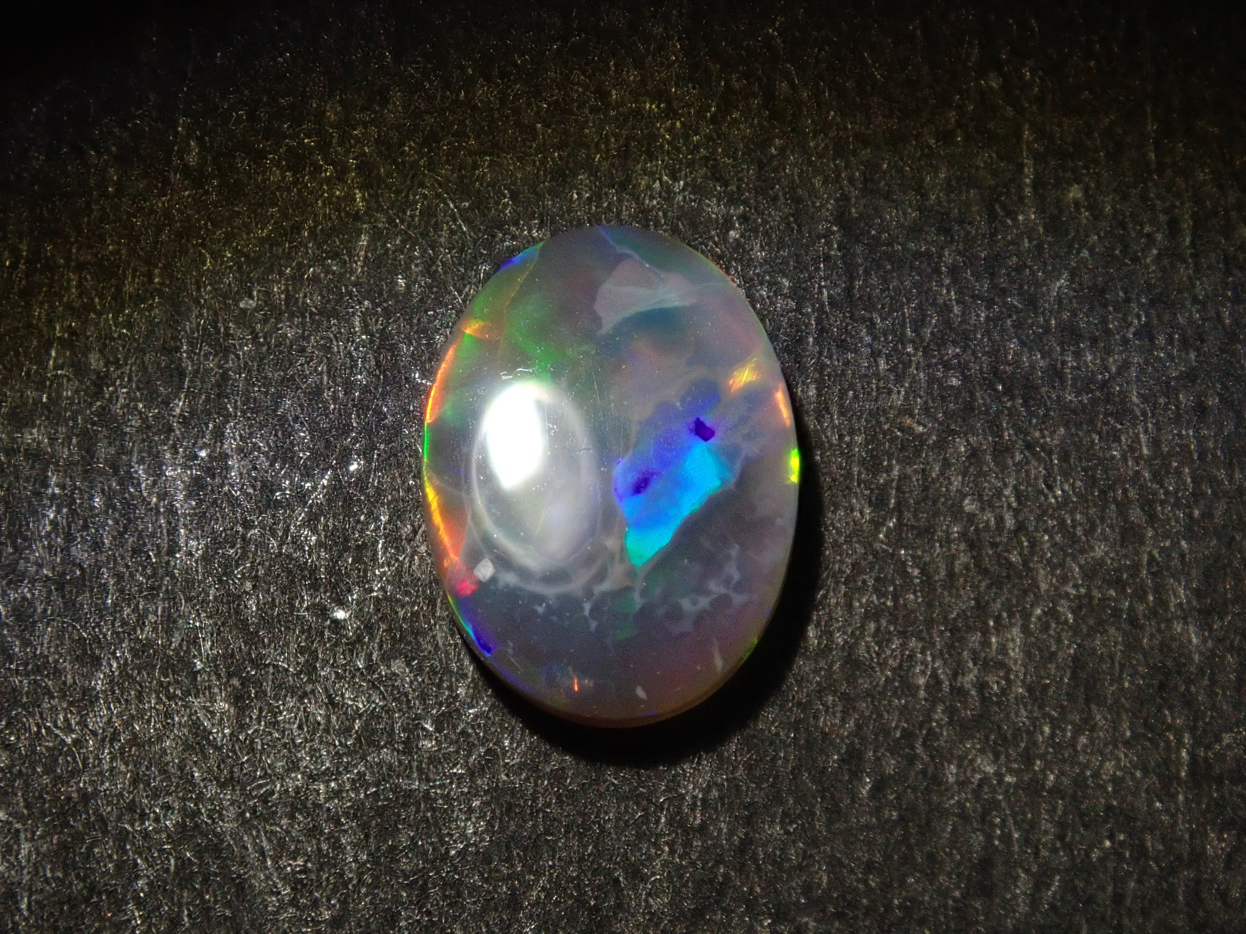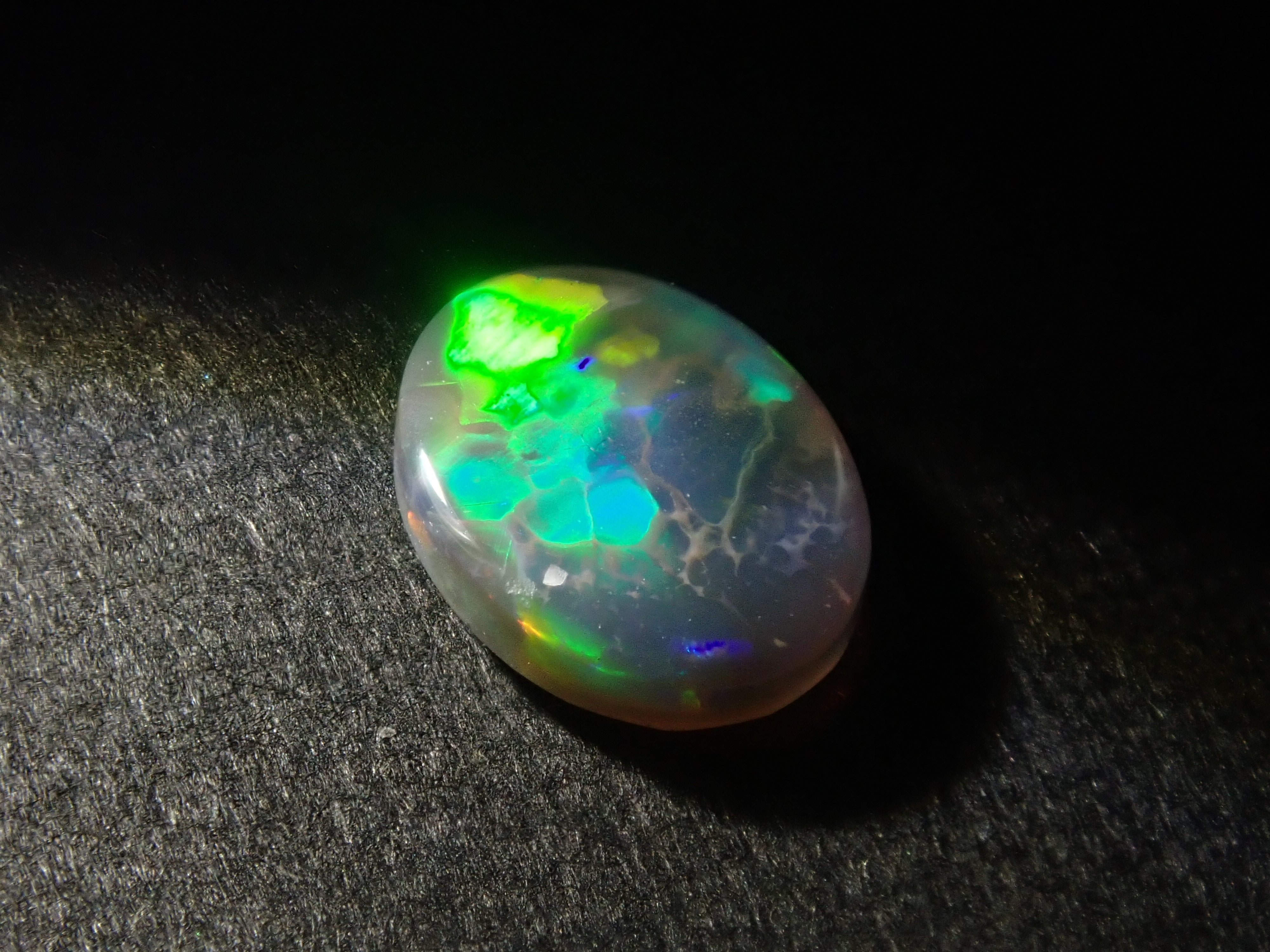 蛋白石是一種以閃爍的彩虹色為特徵的寶石。蛋白石有幾種不同的類型,但黑蛋白石在漆黑一片中閃爍的紅色火焰特別美麗。其背景色可以是黑色、藍色或灰色。這張照片是用筆型電筒拍攝的。