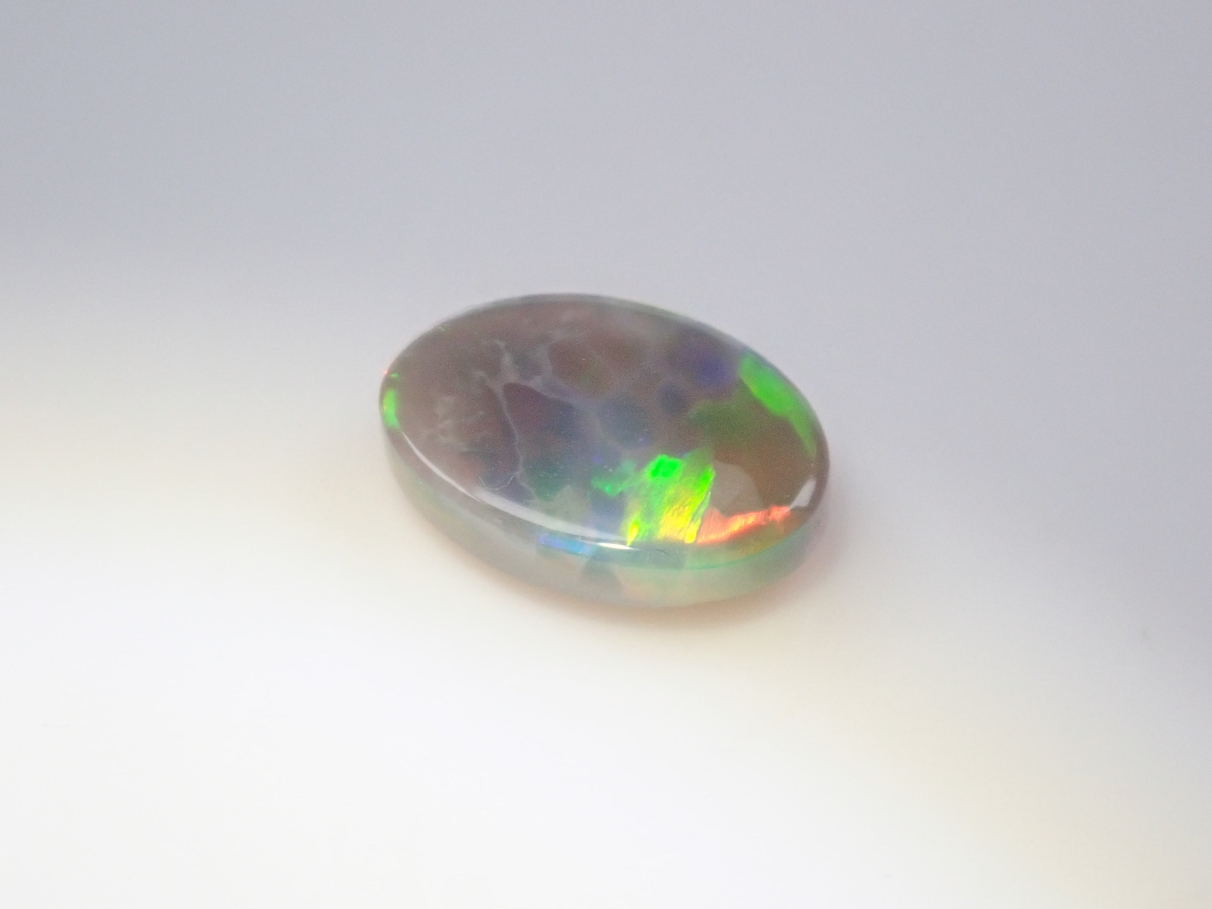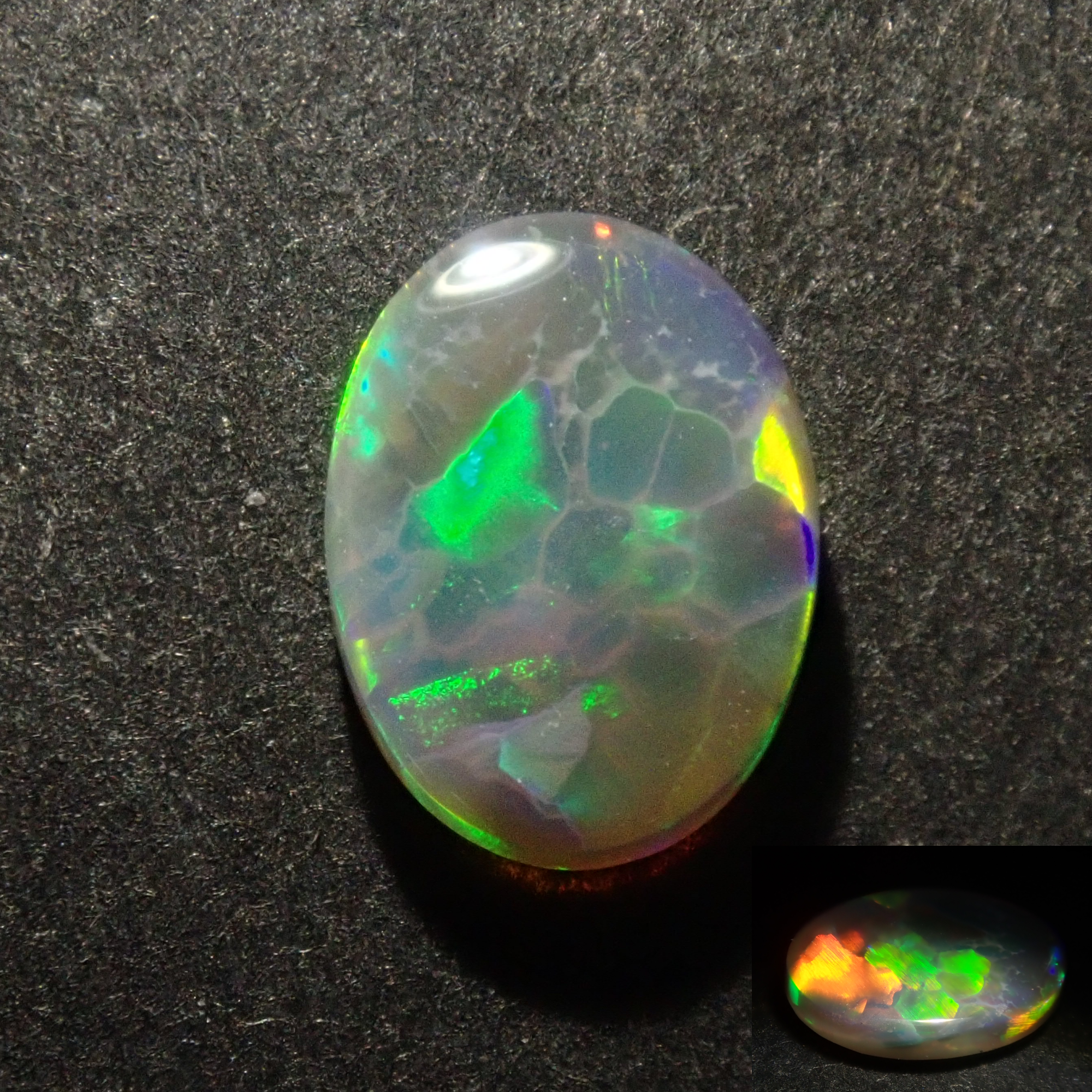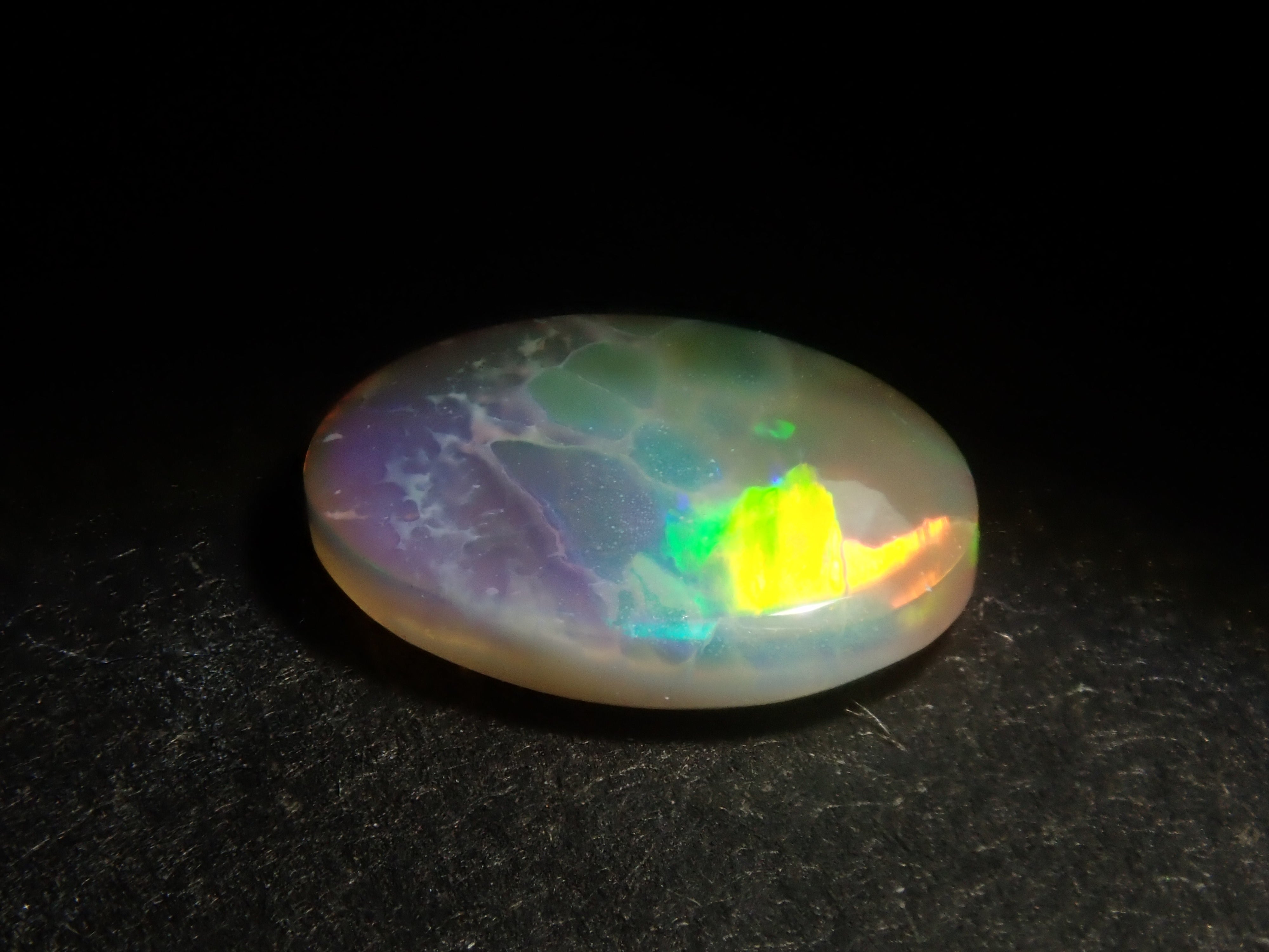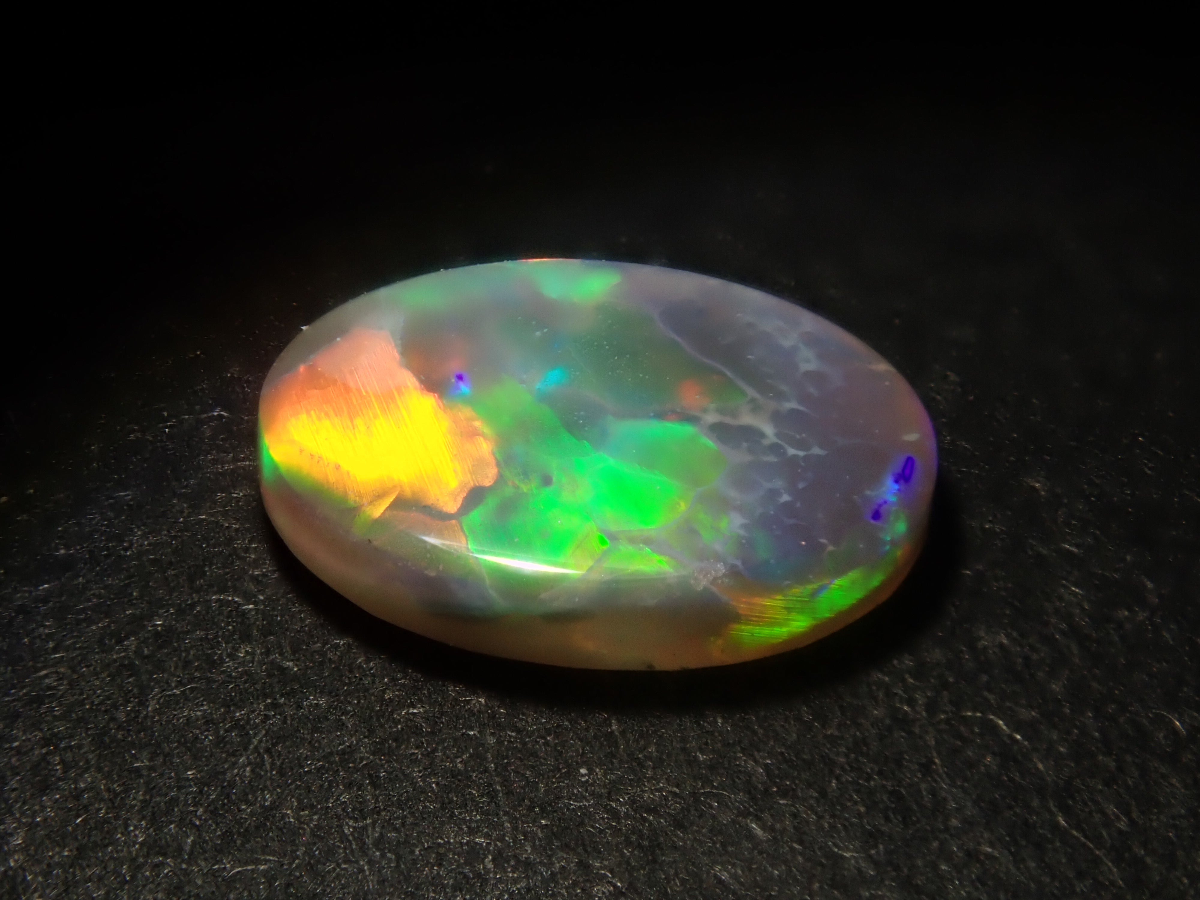 蛋白石是一種以閃爍的彩虹色為特徵的寶石。蛋白石有幾種不同的類型,但黑蛋白石在漆黑一片中閃爍的紅色火焰特別美麗。其背景色可以是黑色、藍色或灰色。這張照片是用筆型電筒拍攝的。