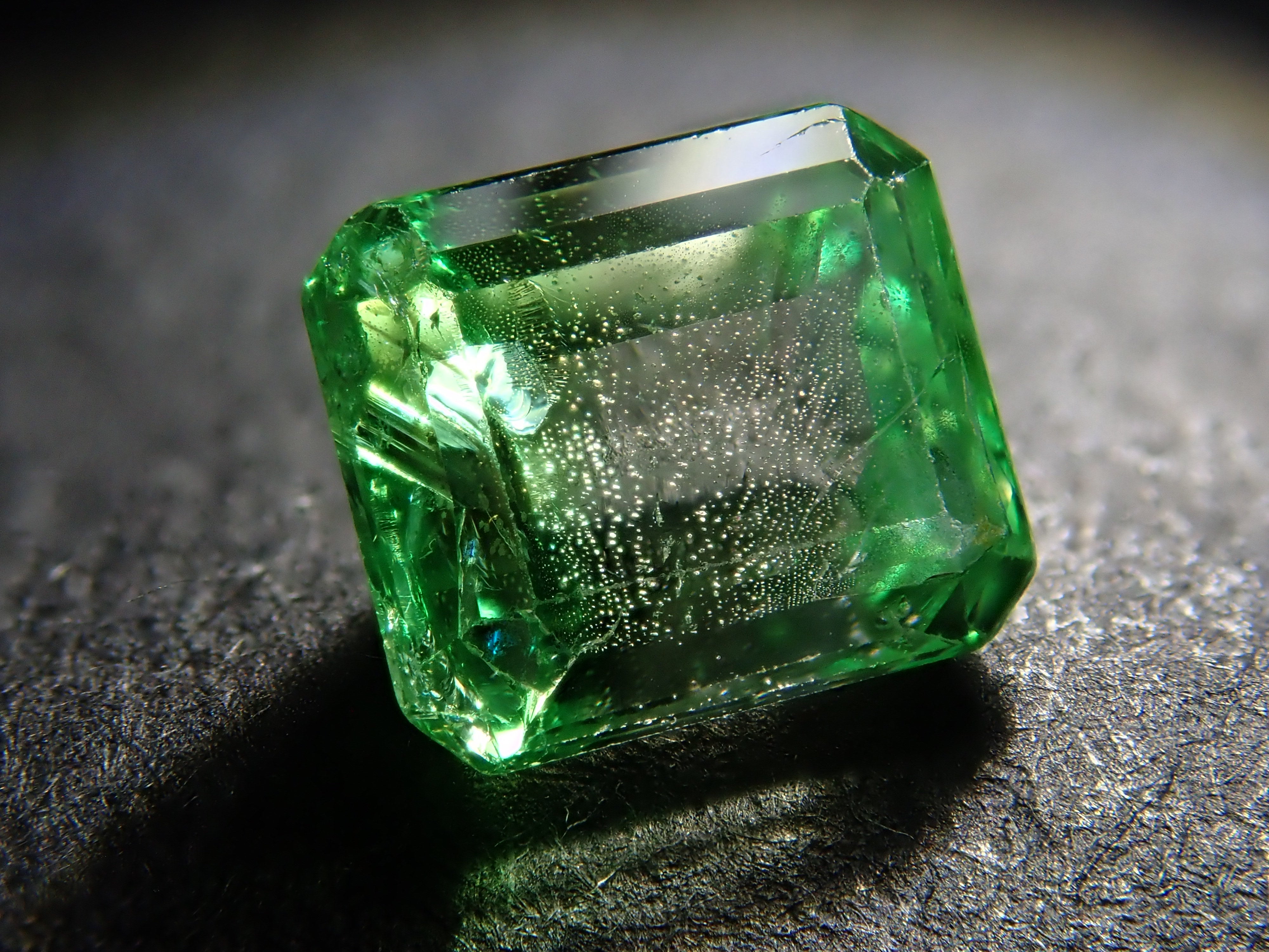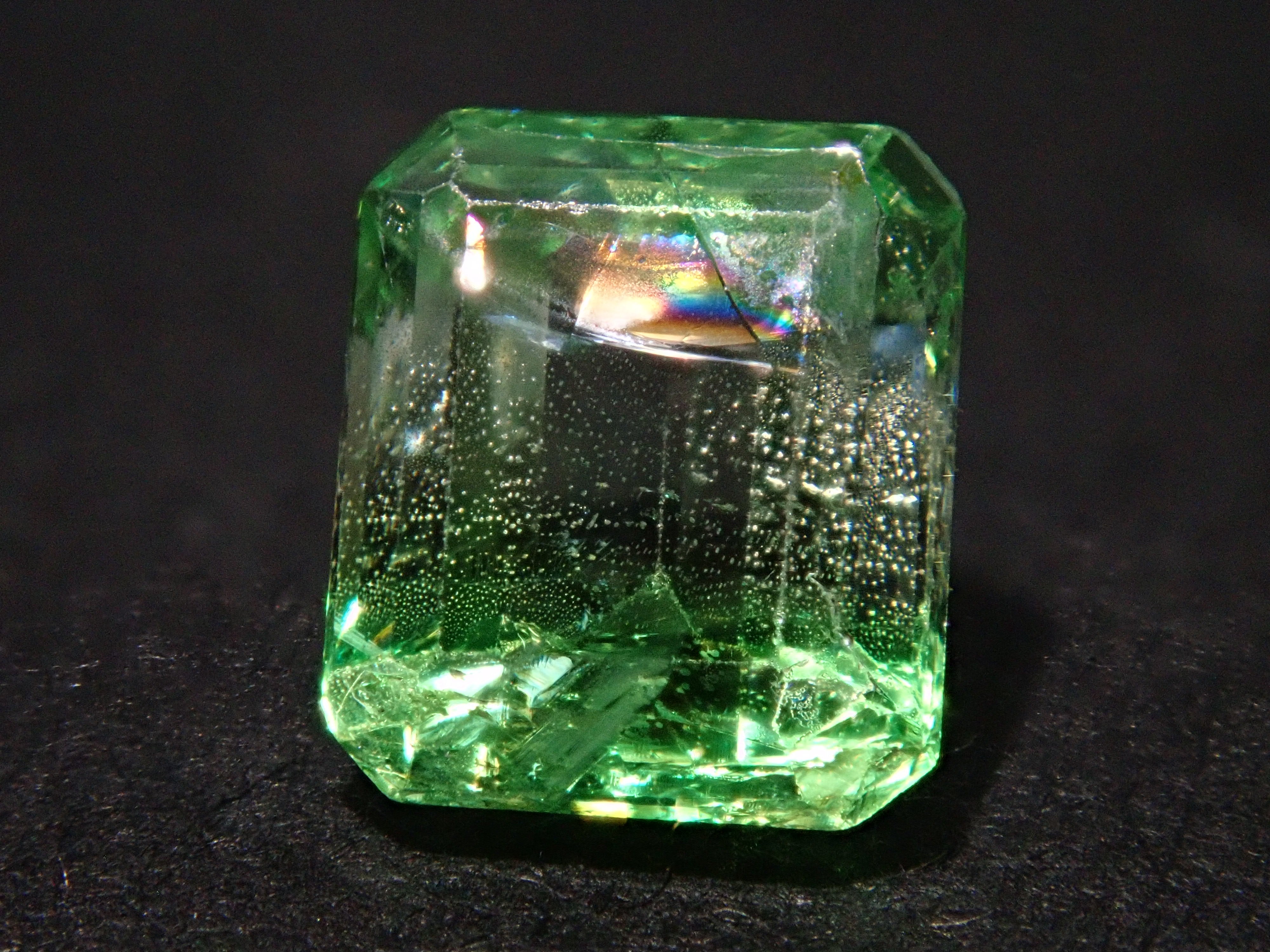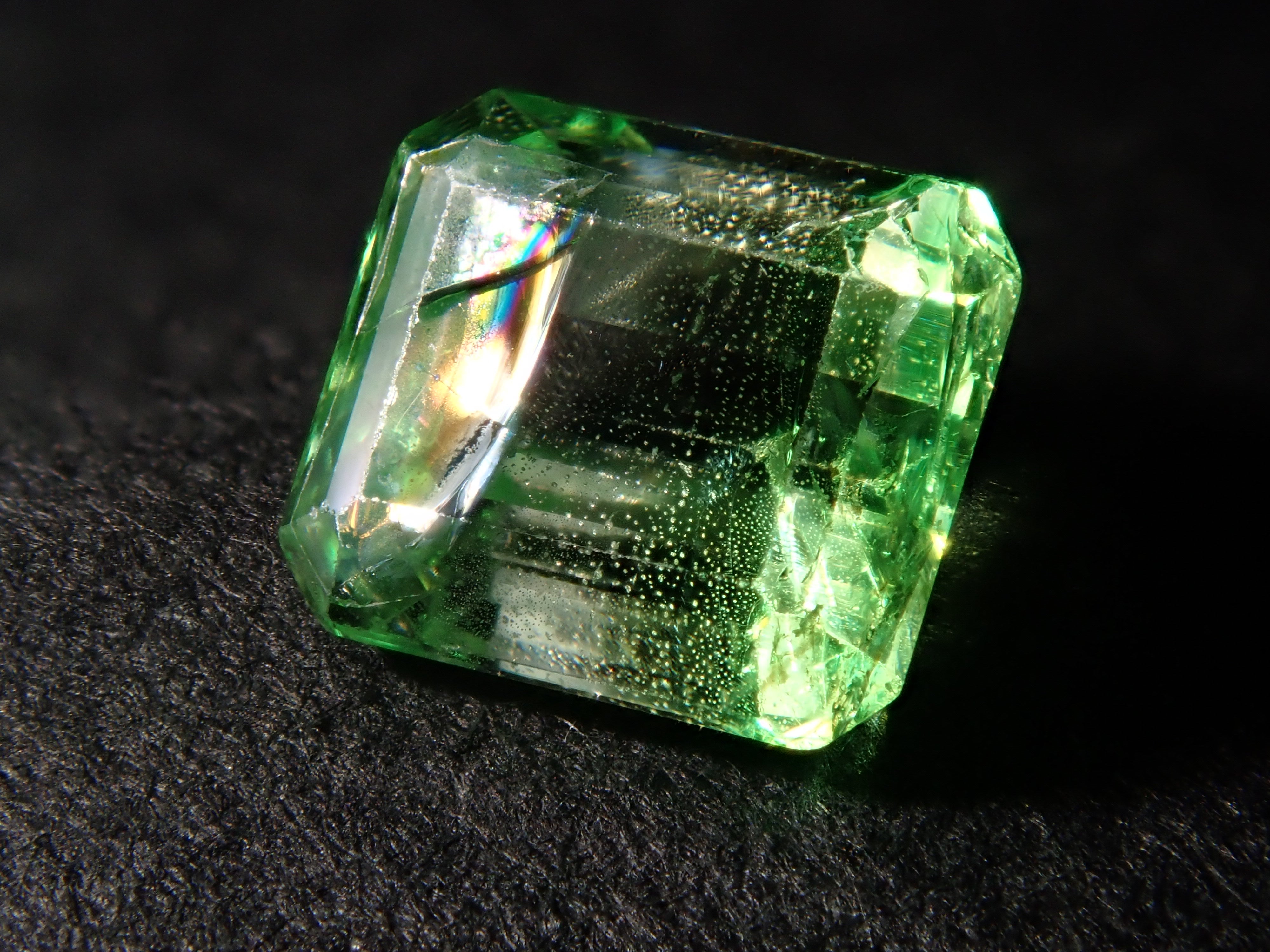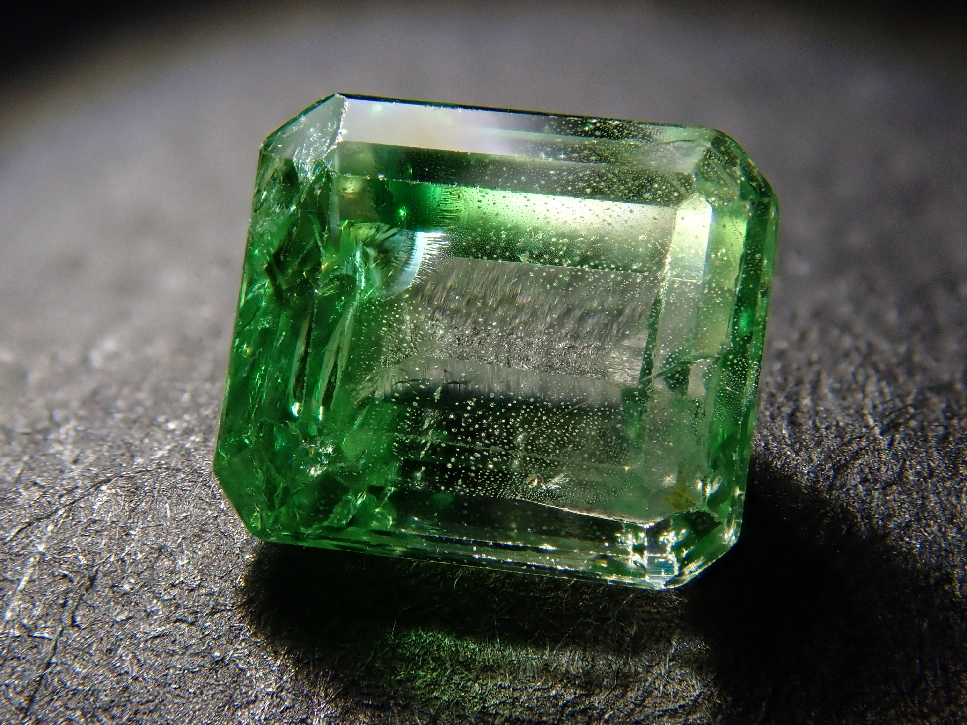 雙色沙弗萊石的正式名稱是鈣鋁榴石。沙弗萊石是一種綠色寶石,在石榴石中較為珍貴。像這樣擁有兩種顏色的寶石非常罕見。螢光照片是在暗室中用強光燈拍攝的。如果您想在家中欣賞螢光,可以透過調暗房間或用手掌遮蓋寶石來欣賞美麗的螢光。