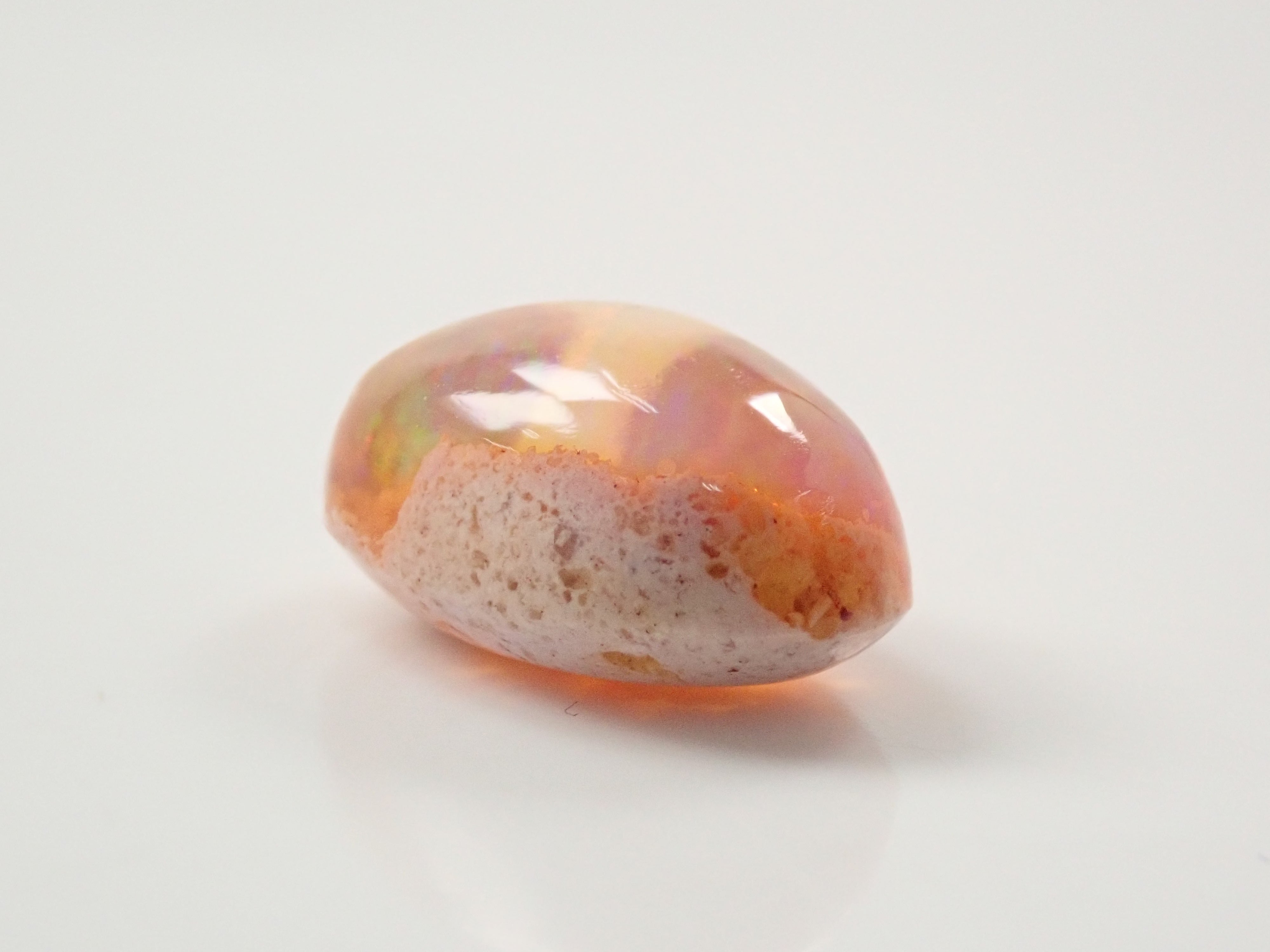 這是一顆產自墨西哥的4.456克拉裸石坎特拉蛋白石,透明度高,並帶有變彩。變彩在廣闊的範圍內可見,而母岩表面較窄。