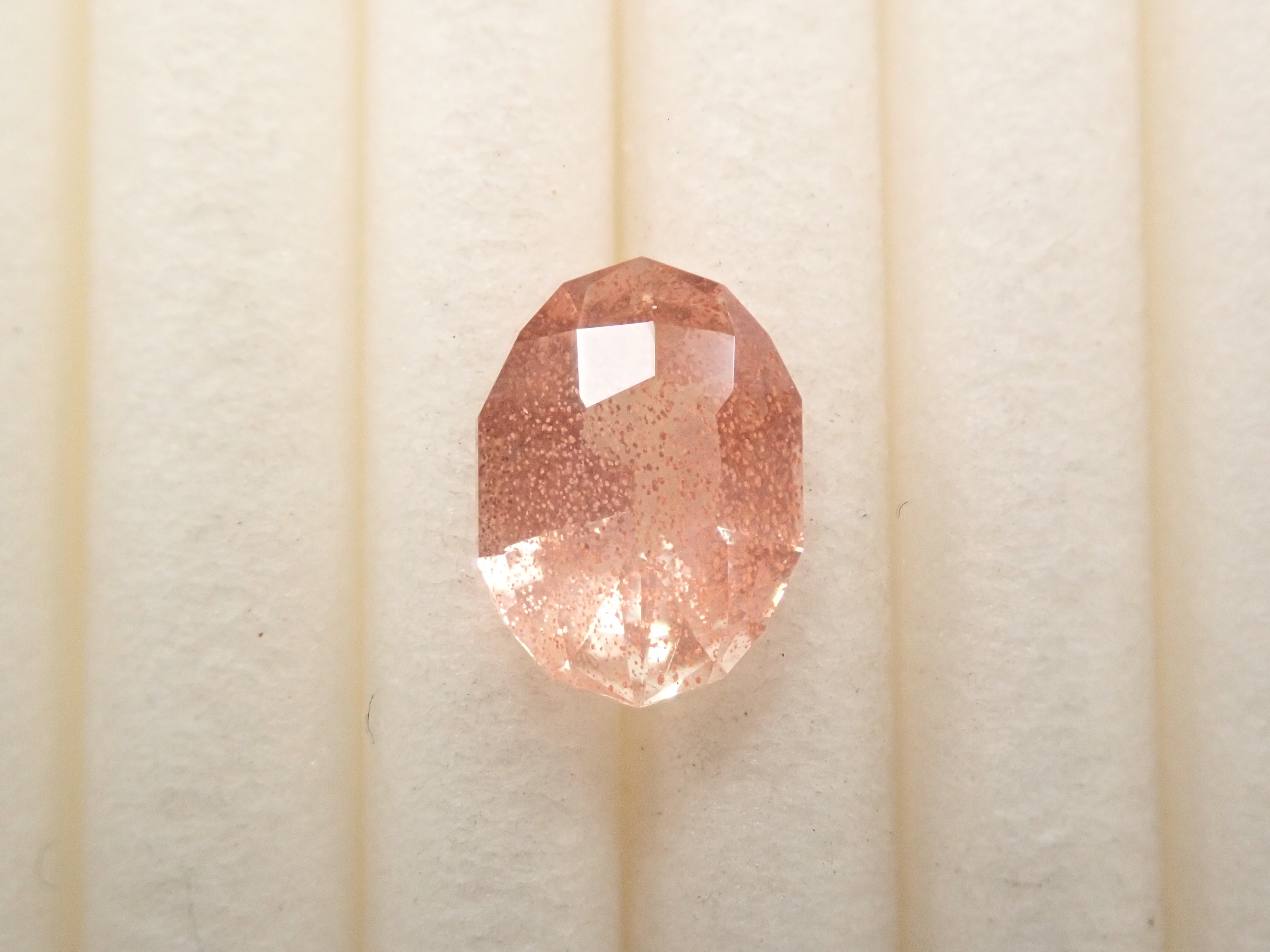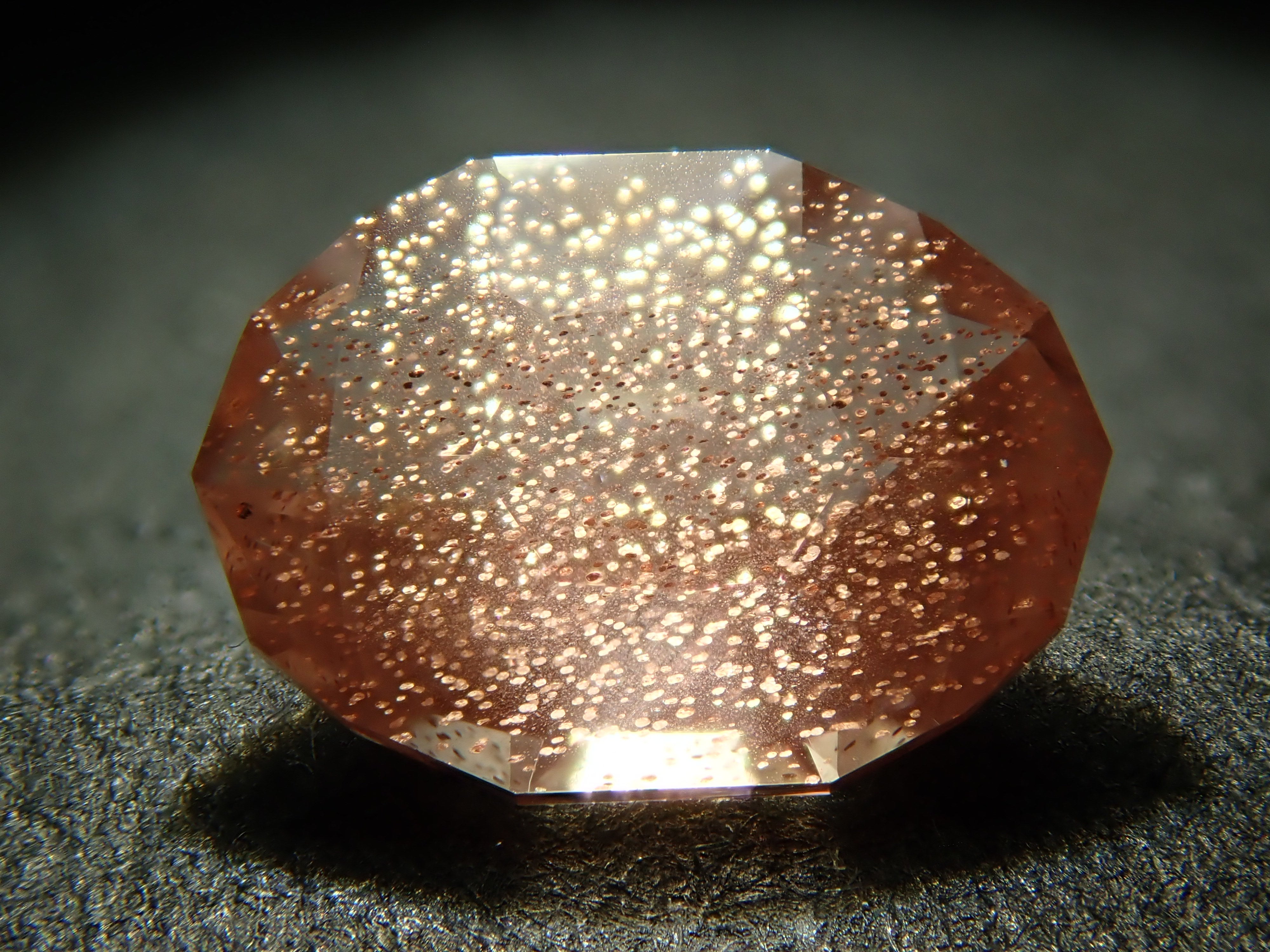 俄勒岡太陽石被譽為世界上最美麗的拉長石。近年來,這種寶石越來越受歡迎。有些寶石中的內含物會像閃光一樣反射,這種現象稱為灑金現象(席勒效應)。為了更好地呈現這些光學效果,攝影時會使用筆形電筒。