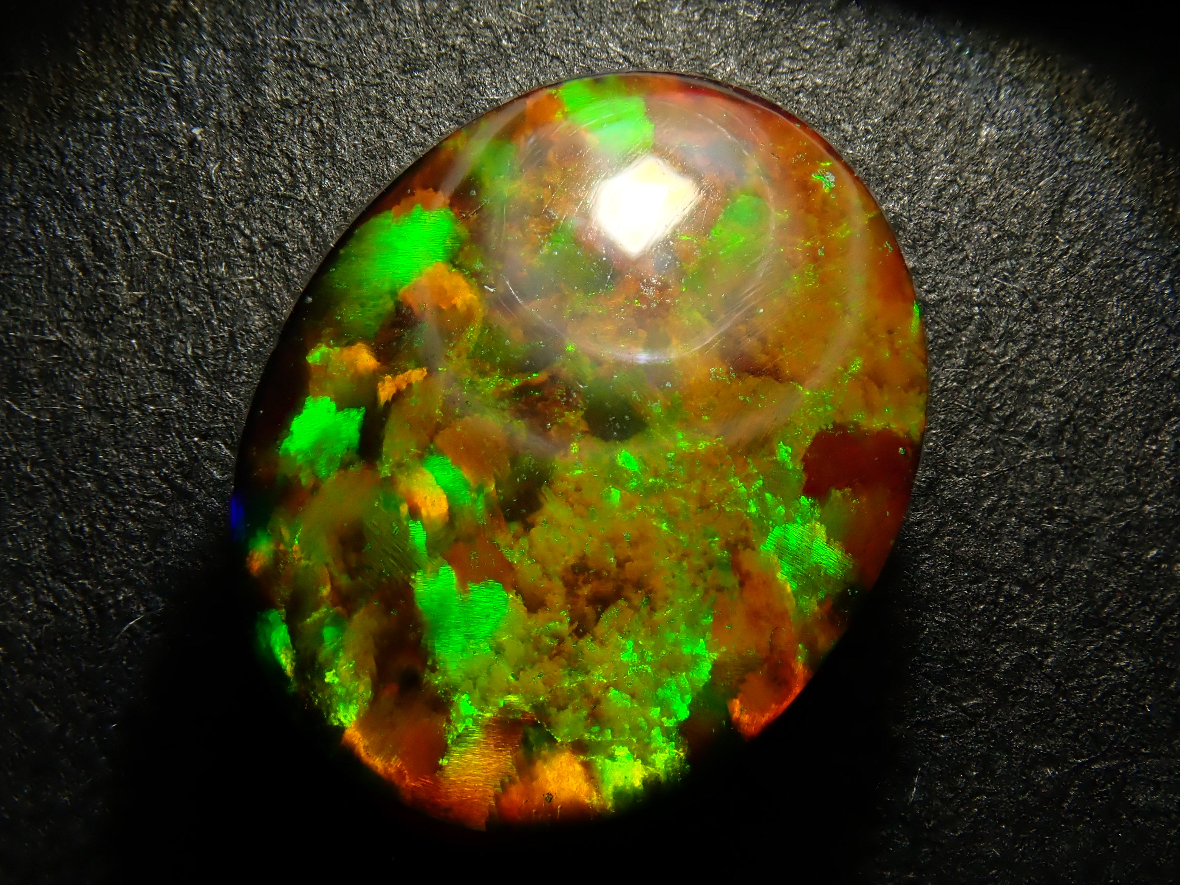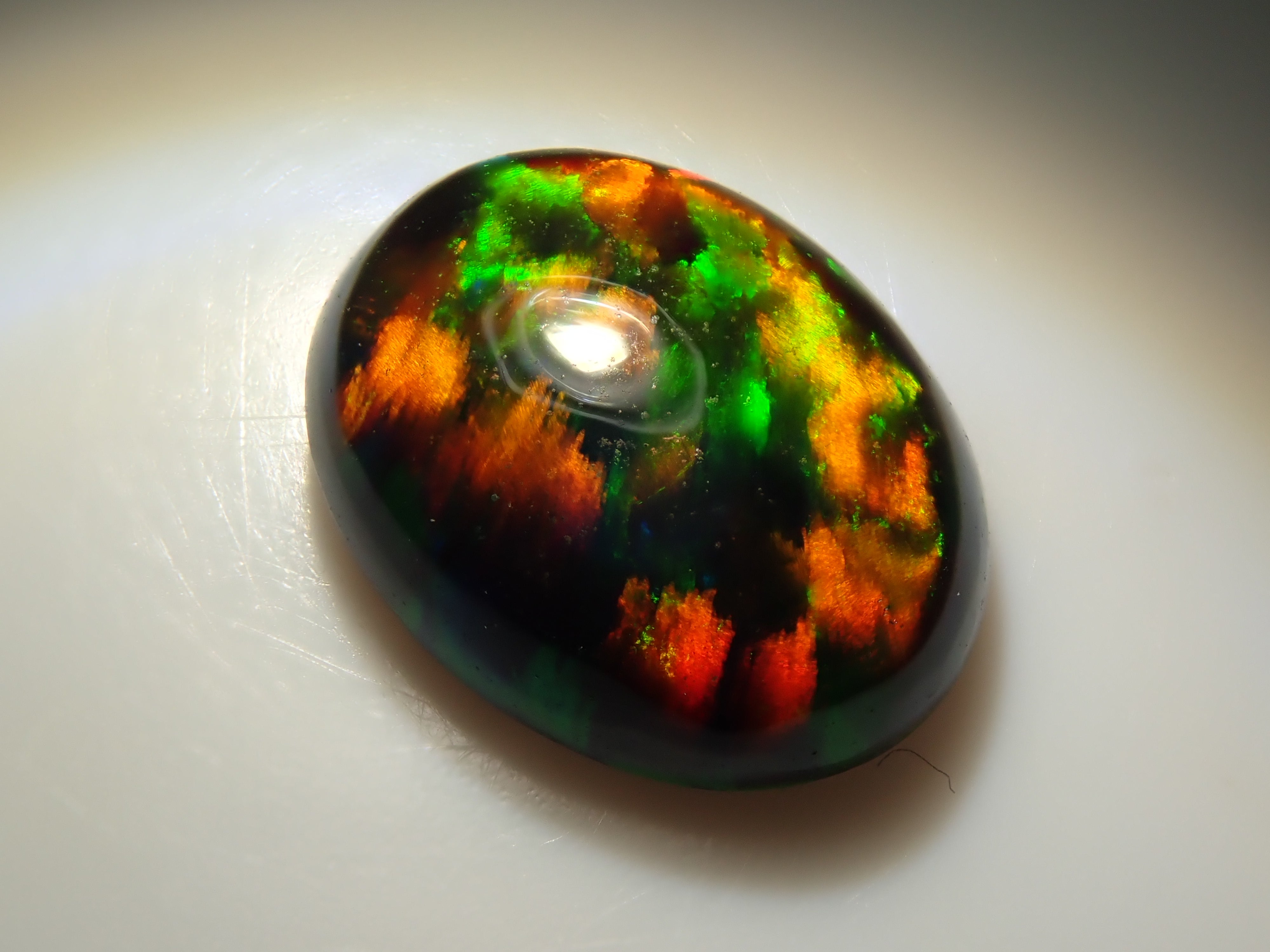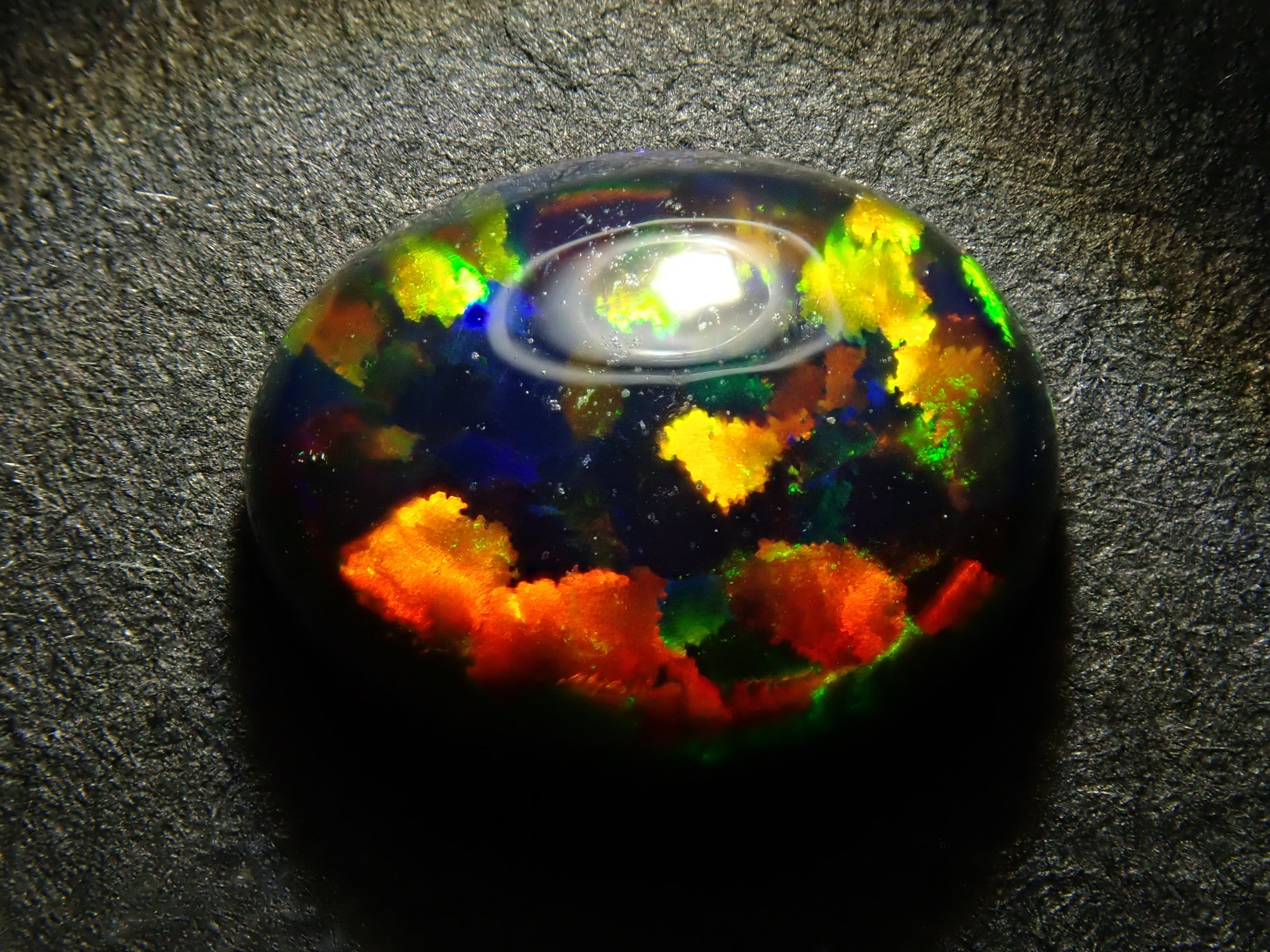 蛋白石是一種以彩虹色光澤為特徵的寶石。這是人工合成的蛋白石,僅供研究參考之用。照片是用筆形電筒拍攝的。