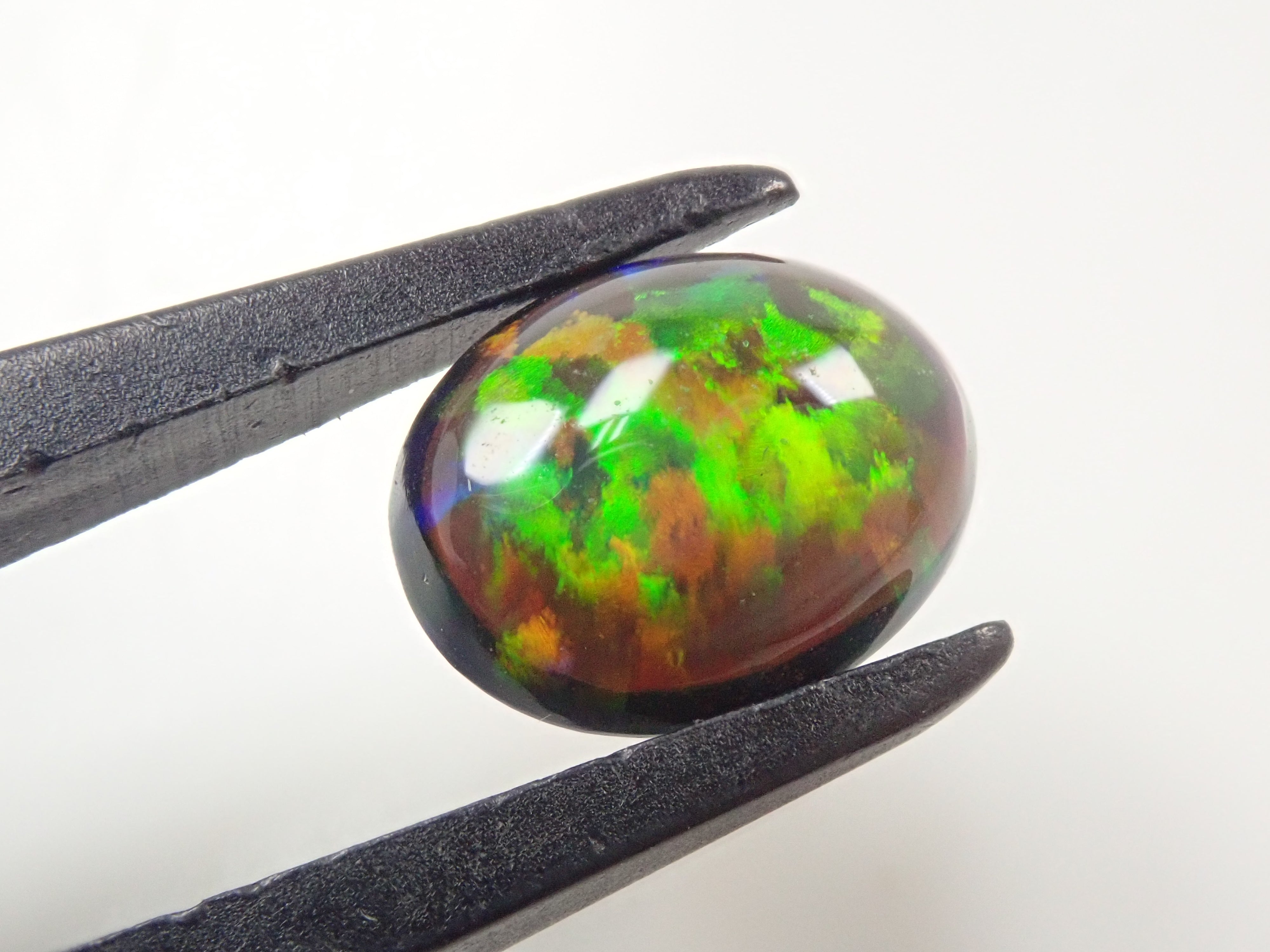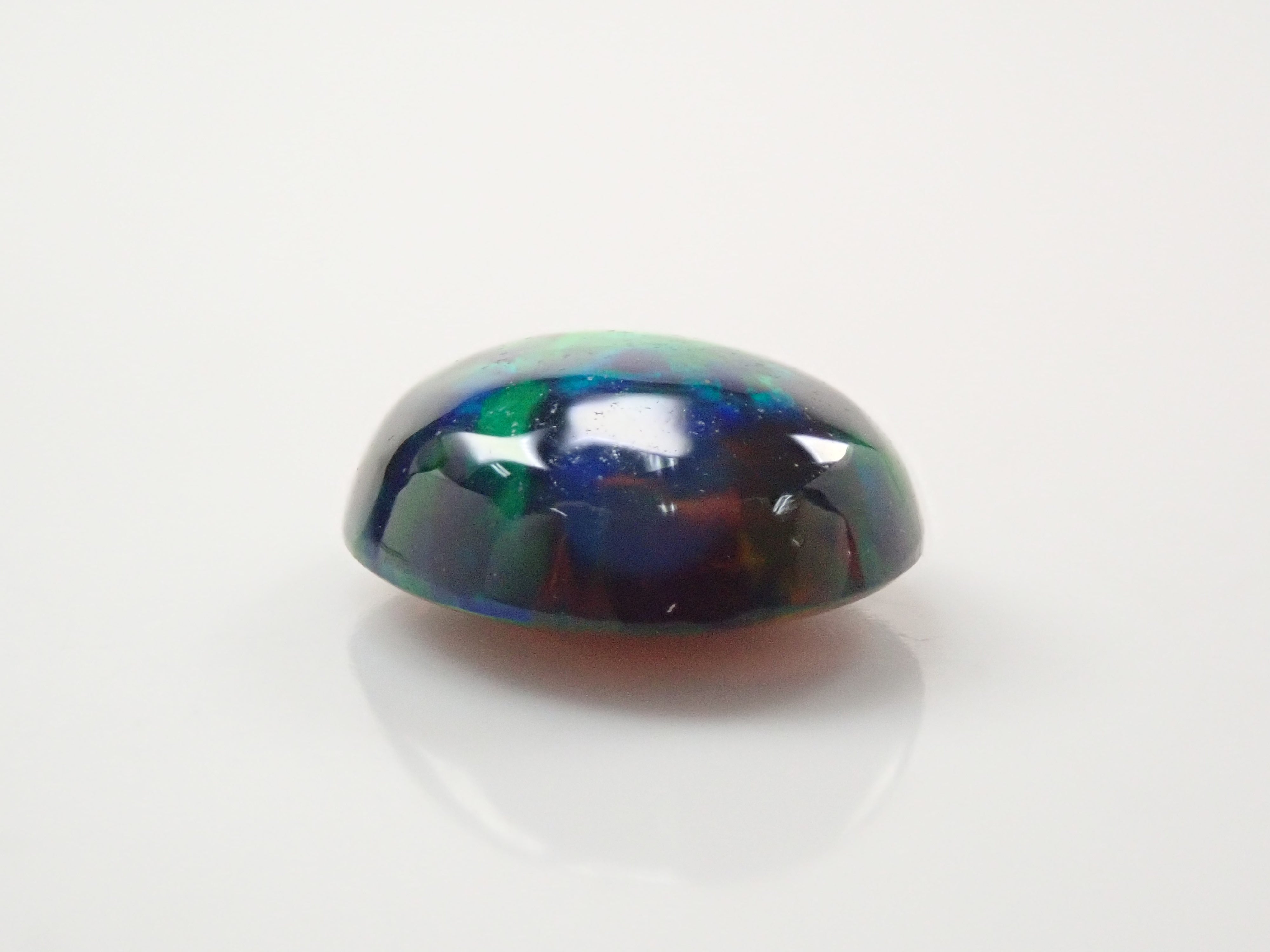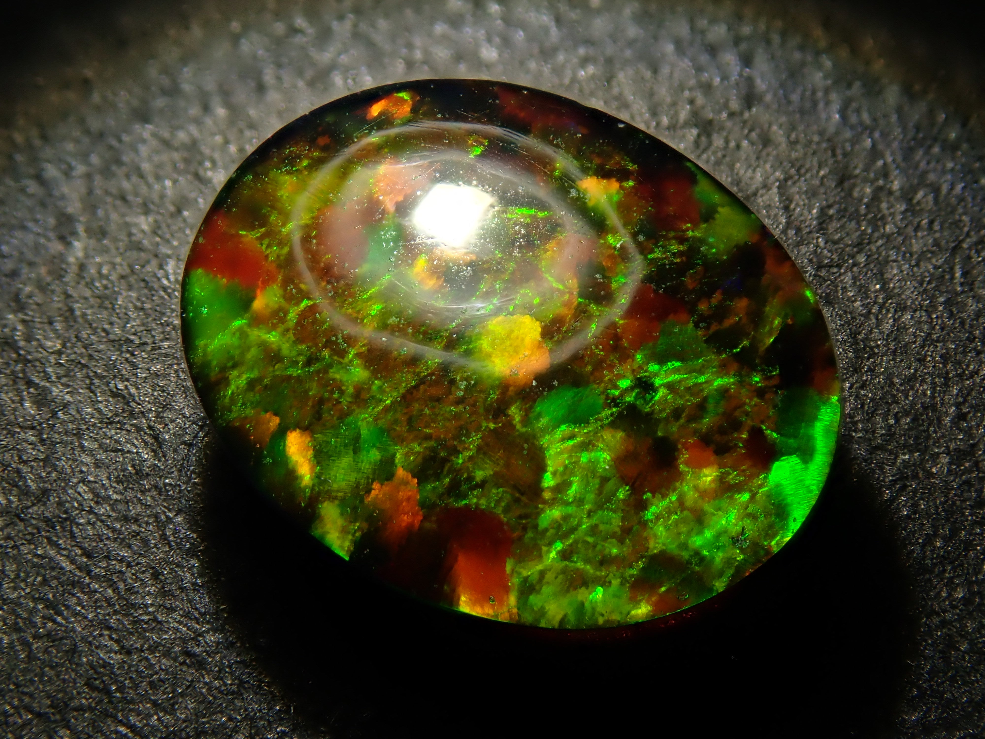 蛋白石是一種以彩虹色光澤為特徵的寶石。這是人工合成的蛋白石,僅供研究參考之用。照片是用筆形電筒拍攝的。
