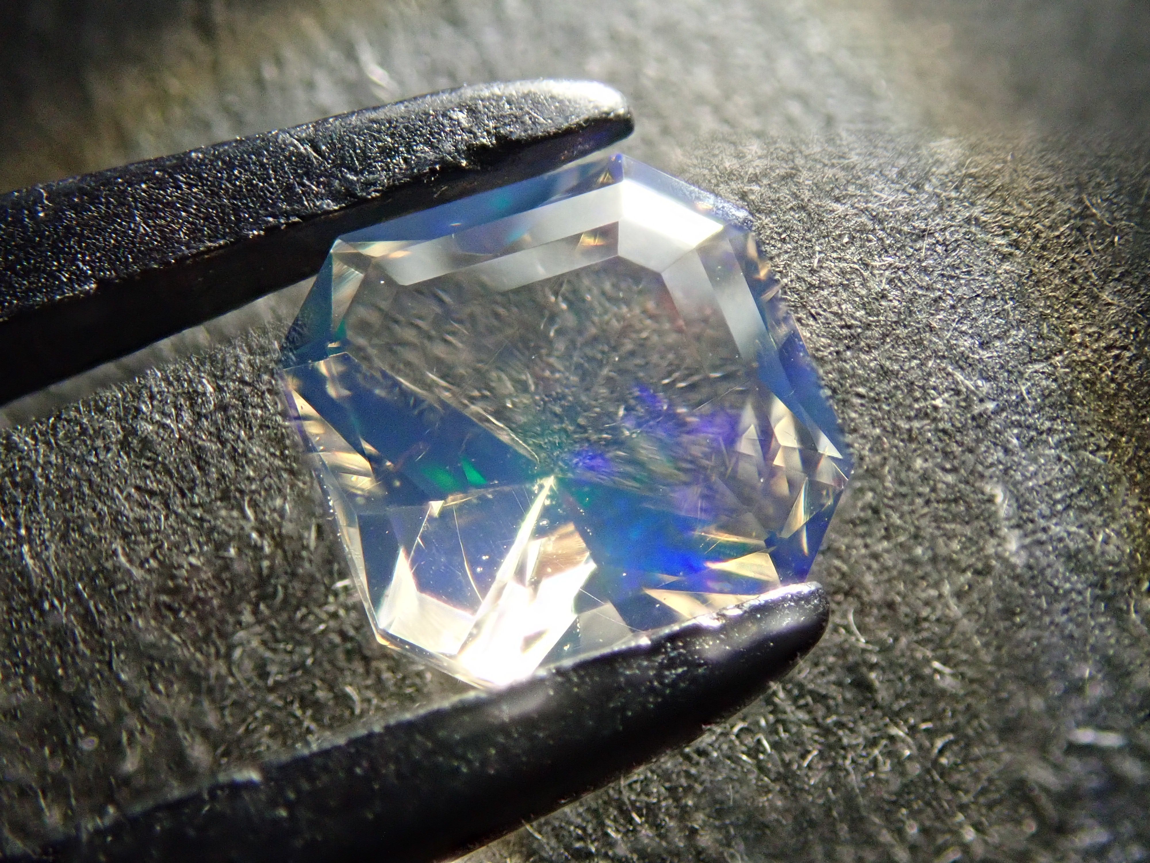蛋白石是一種以彩虹般閃耀的色彩為特徵的寶石。蛋白石種類繁多,呈現各種不同的色彩。有些人對此非常著迷,以至於他們只收藏蛋白石。這張照片是用筆型電筒拍攝的。這是一顆刻面蛋白石。