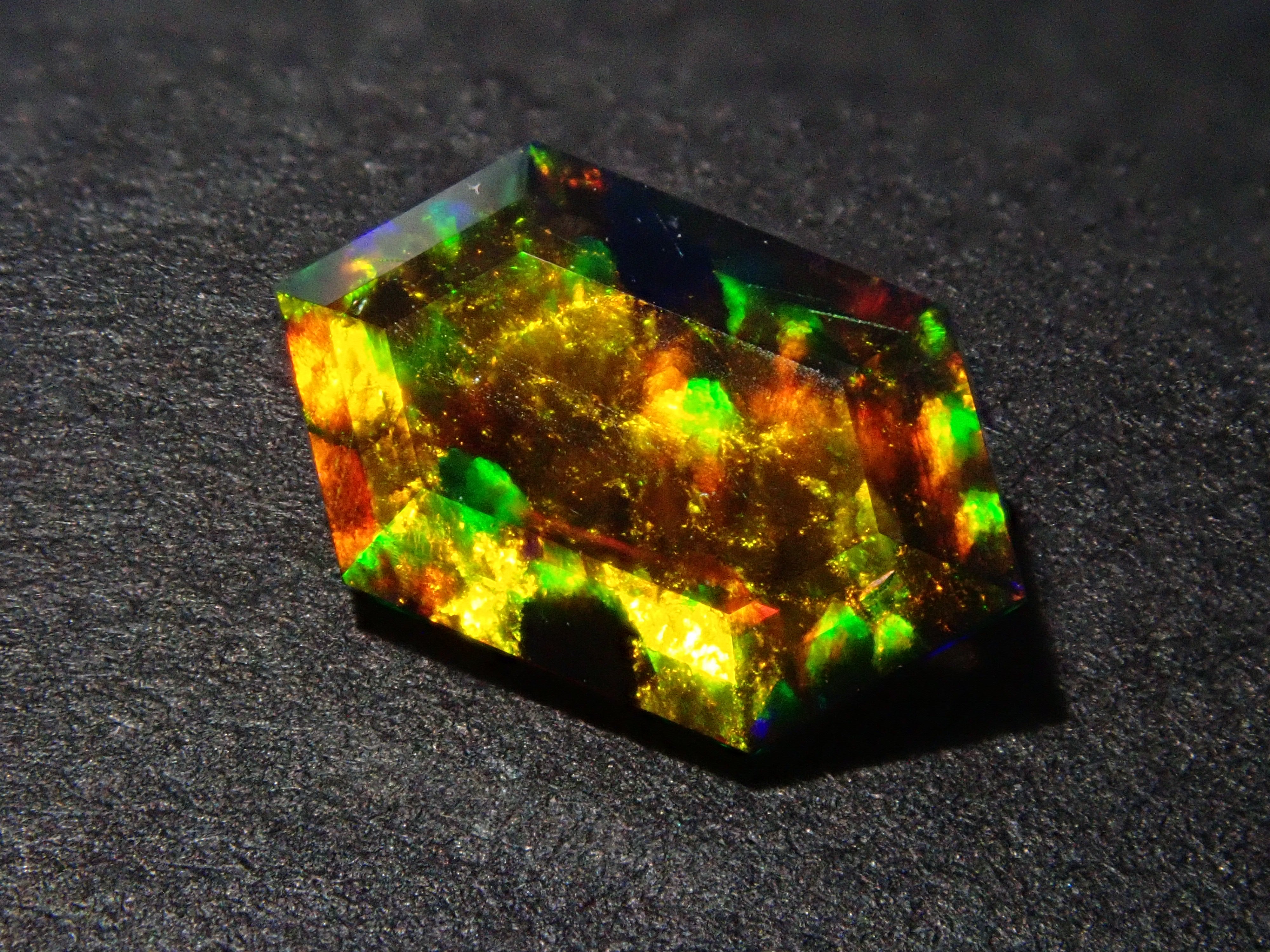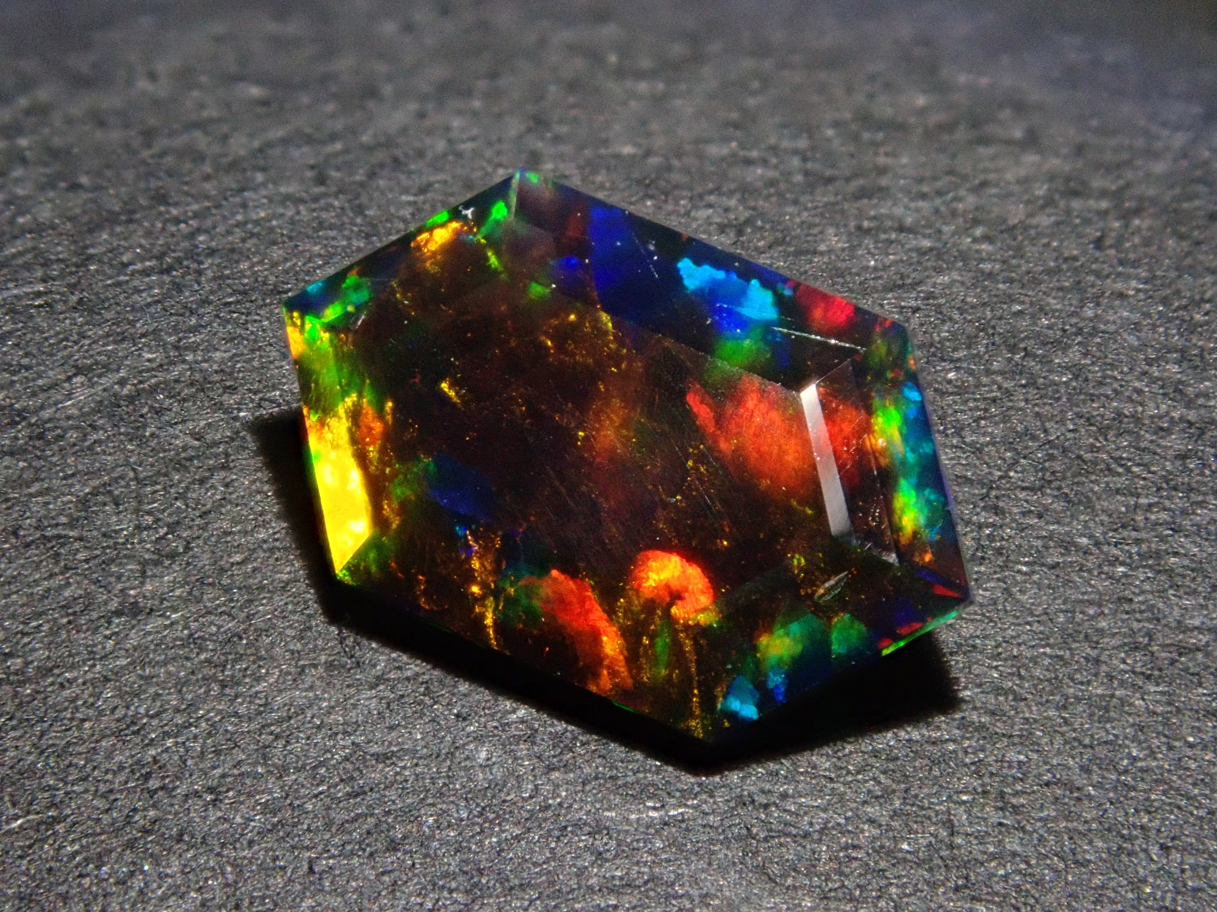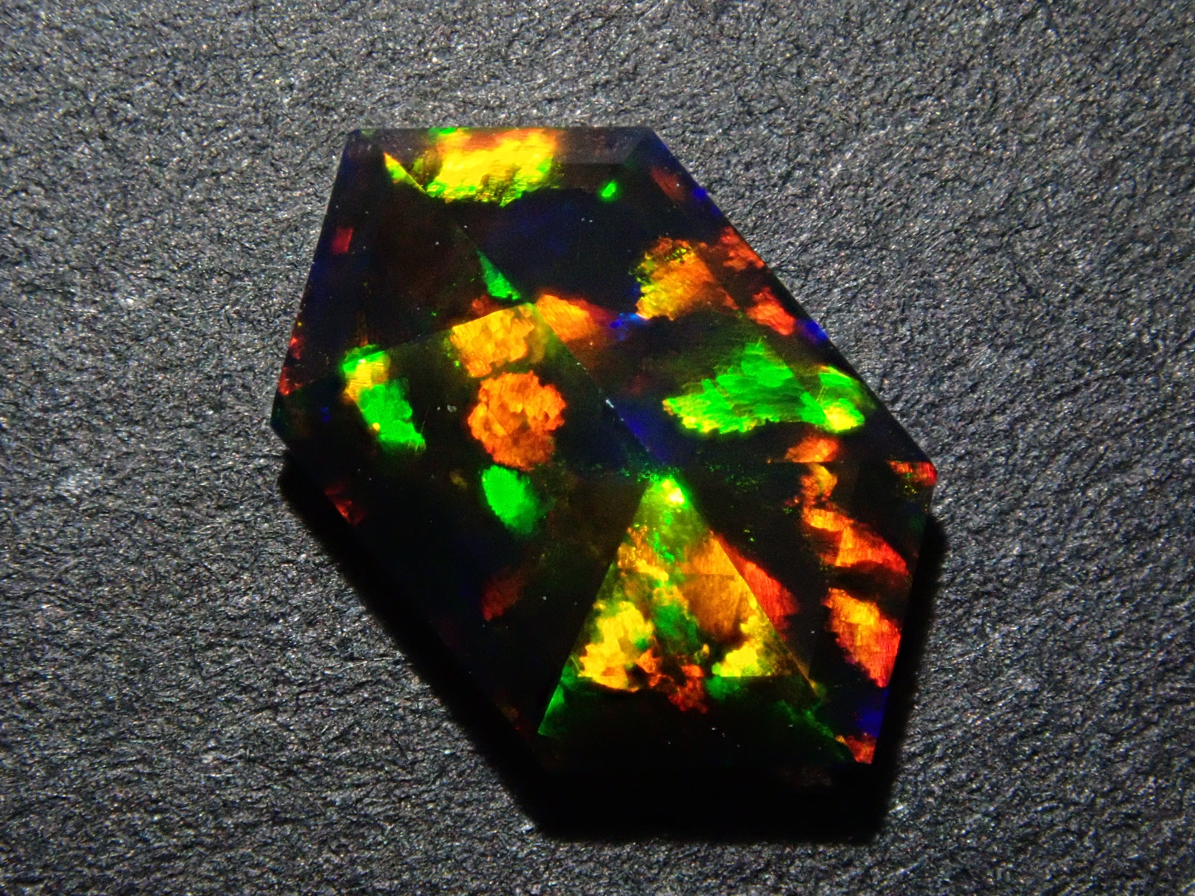 蛋白石是一種以虹彩光澤為特徵的寶石。這顆蛋白石是人造合成的,僅供研究和參考之用。照片是用筆形電筒拍攝的。它是由斯里蘭卡切割師桑傑(Sanjay)切割而成。