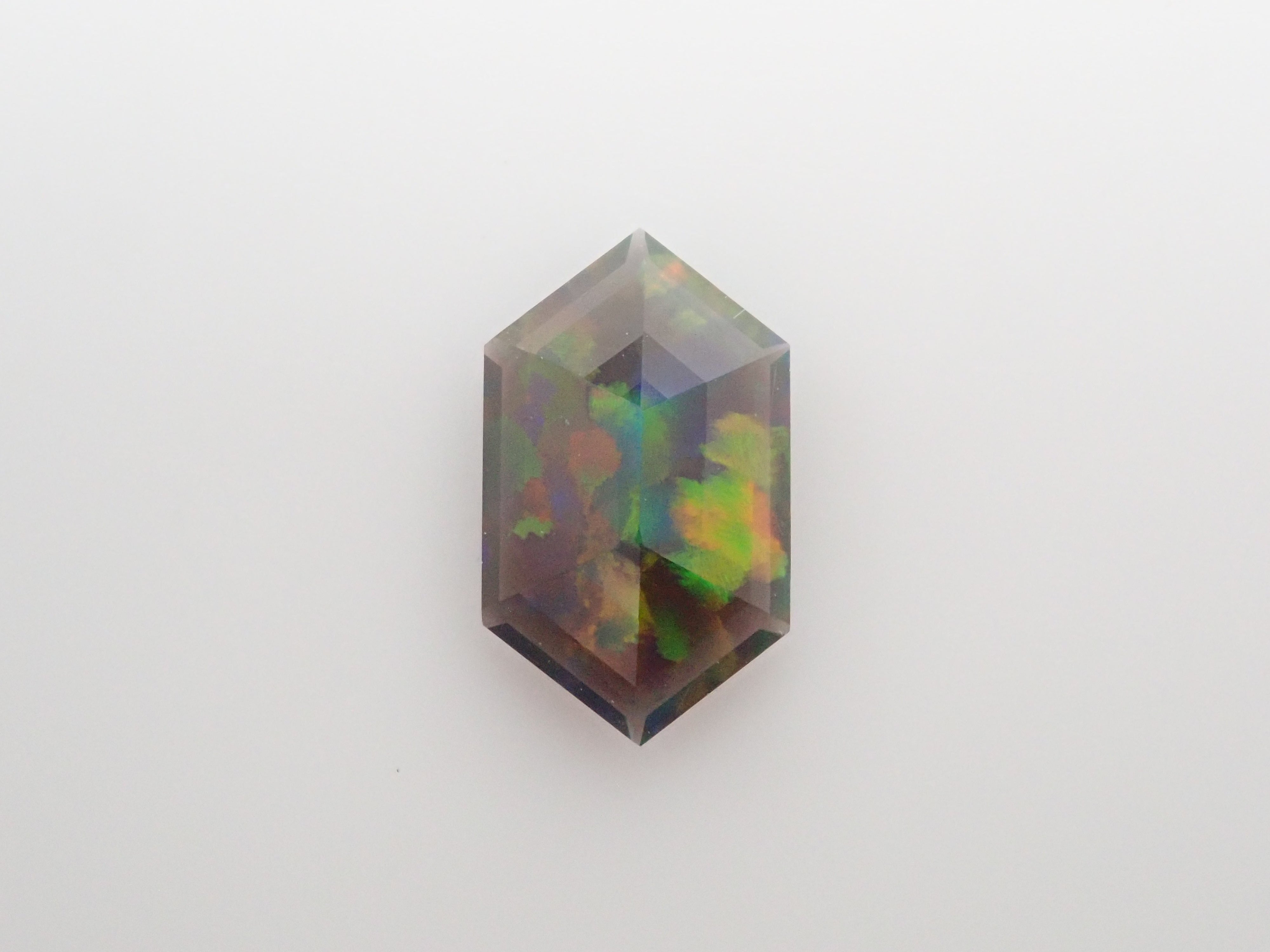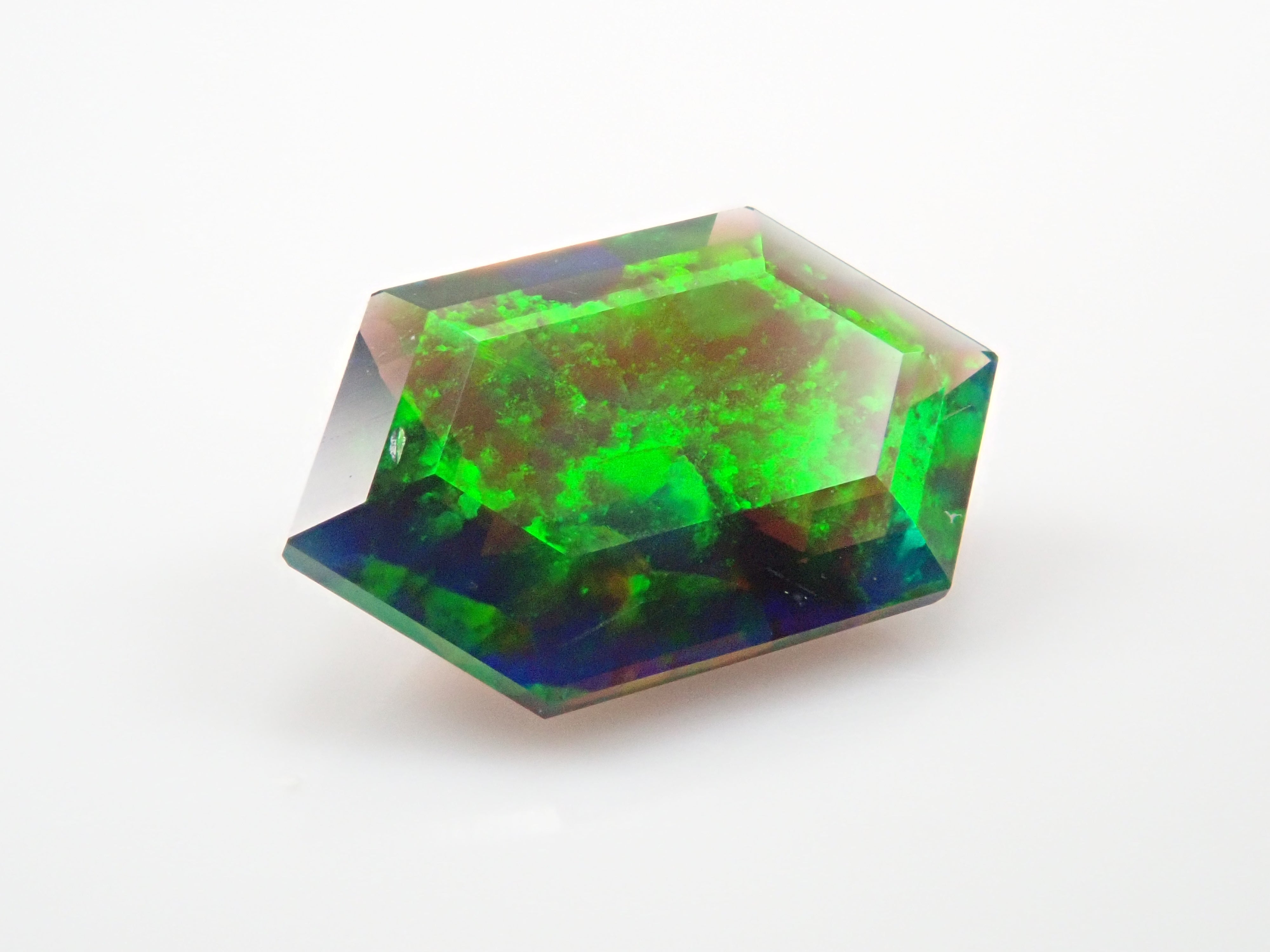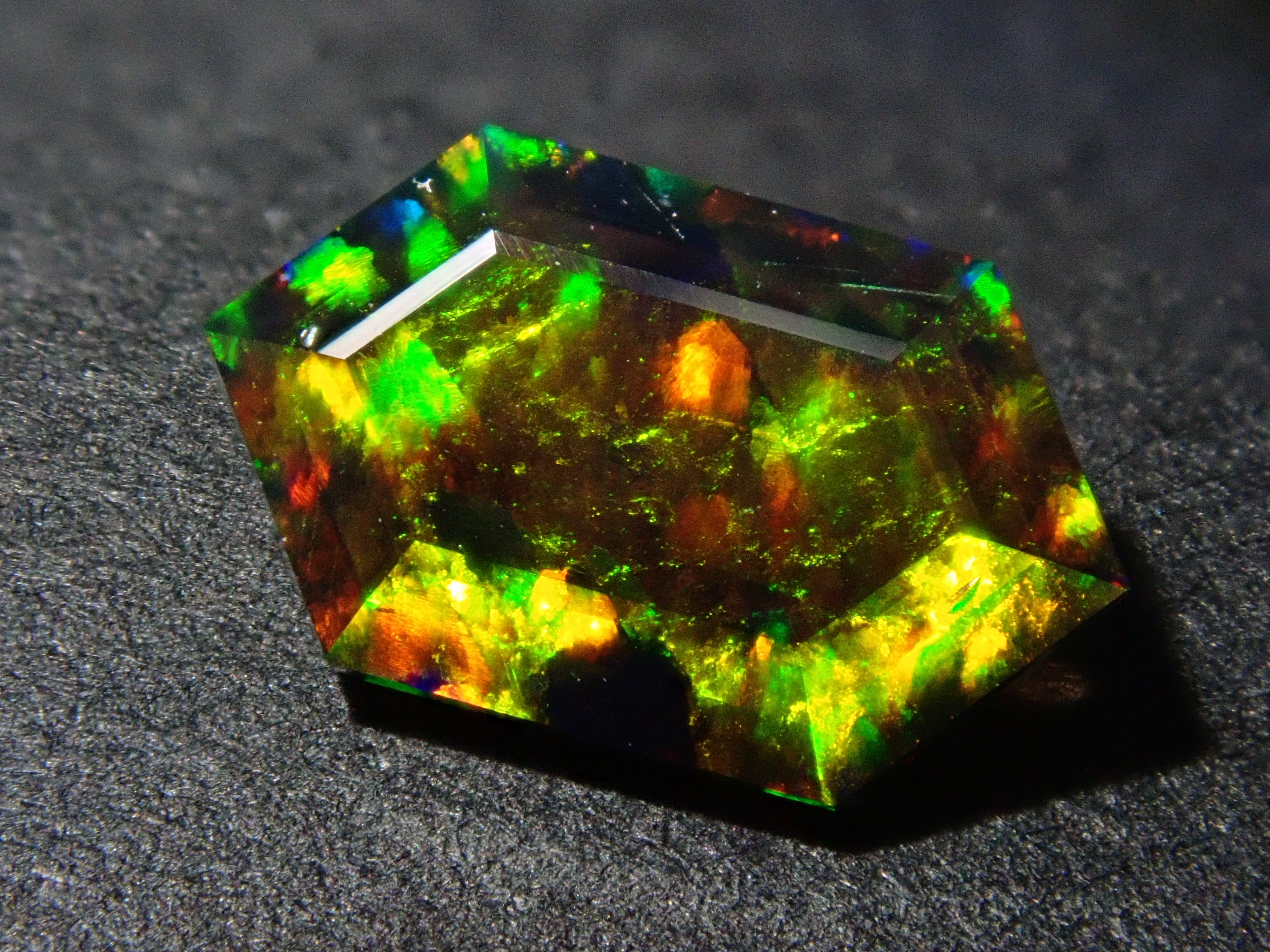 蛋白石是一種以虹彩光澤為特徵的寶石。這顆蛋白石是人造合成的,僅供研究和參考之用。照片是用筆形電筒拍攝的。它是由斯里蘭卡切割師桑傑(Sanjay)切割而成。