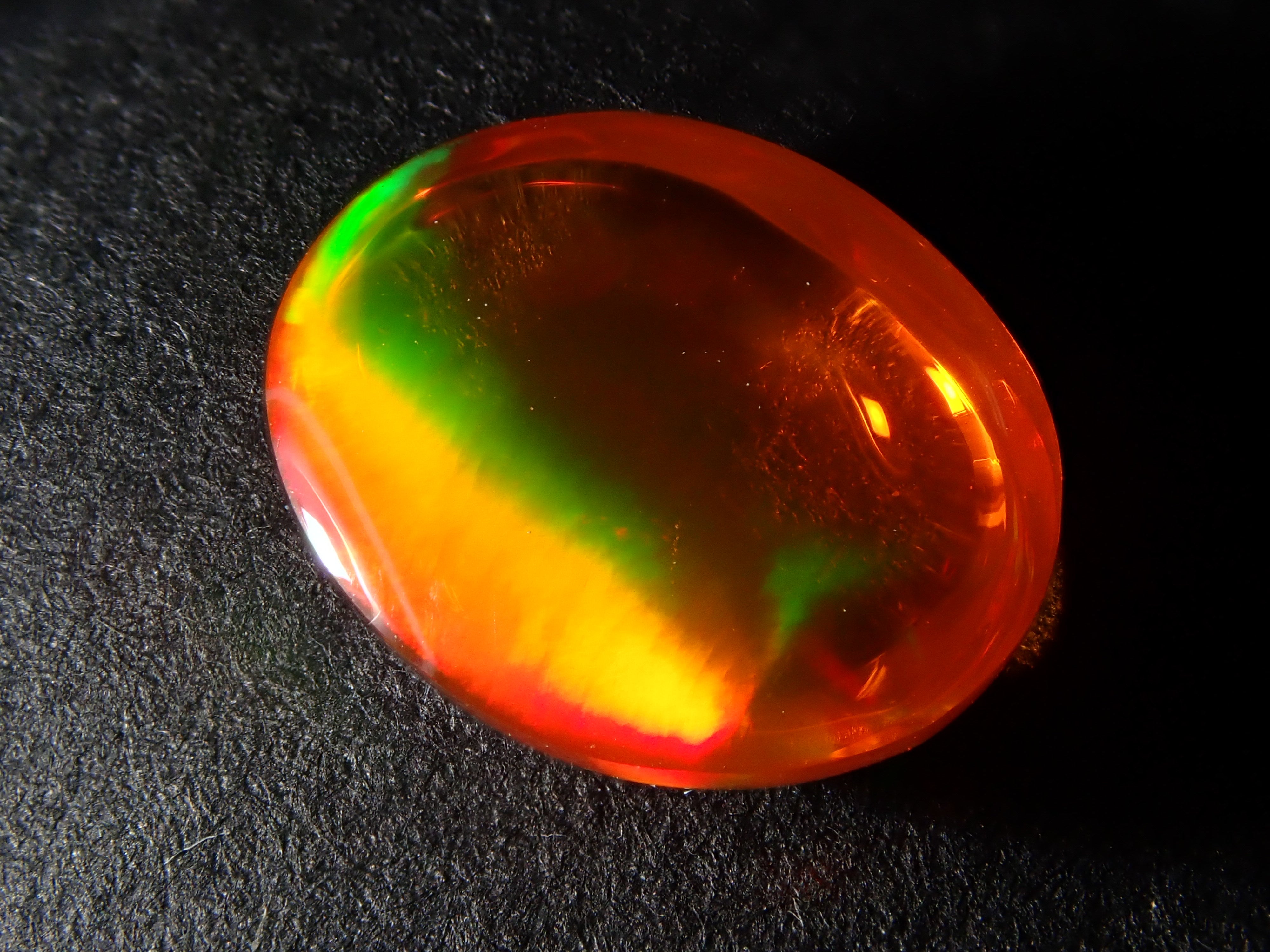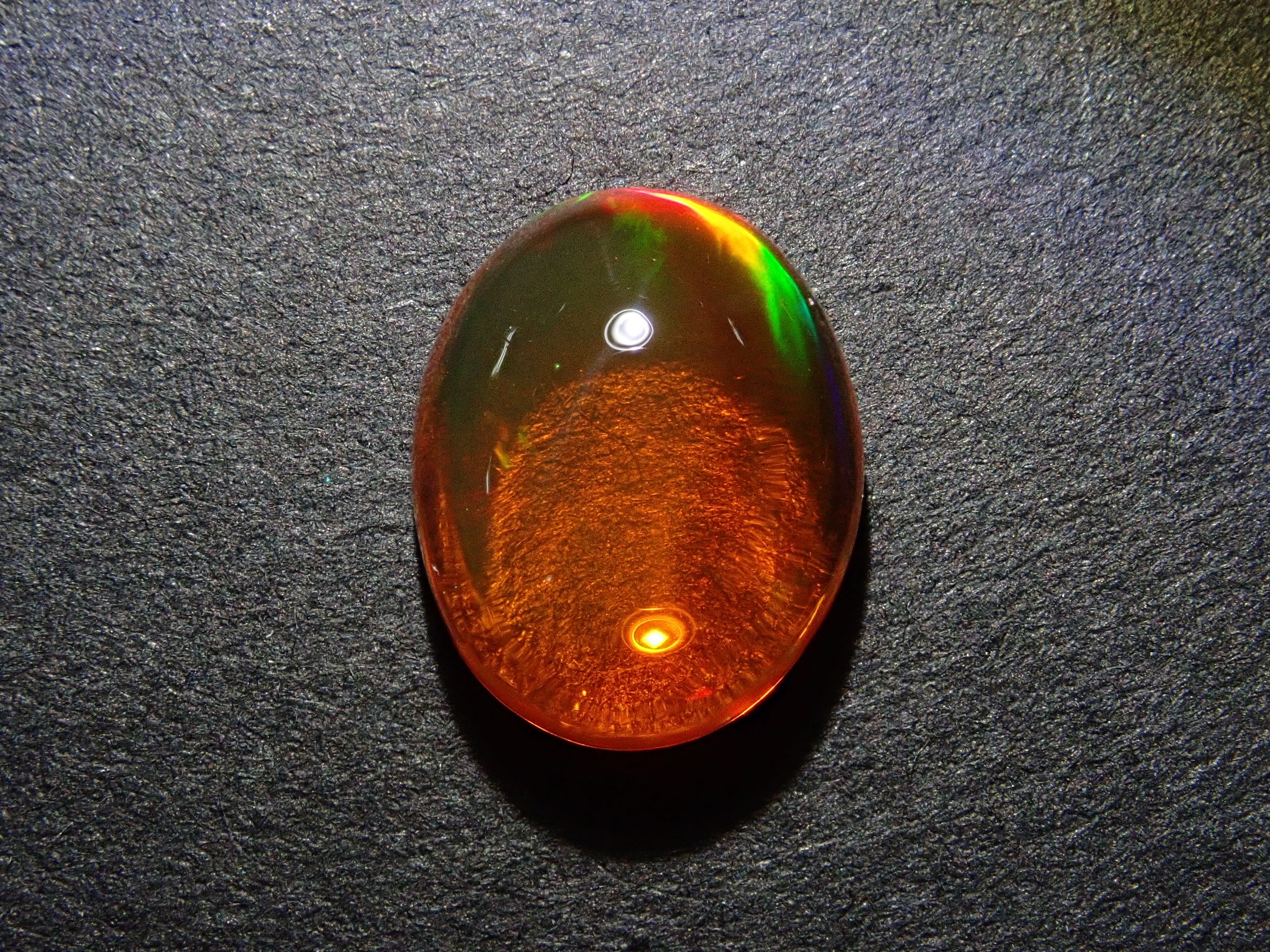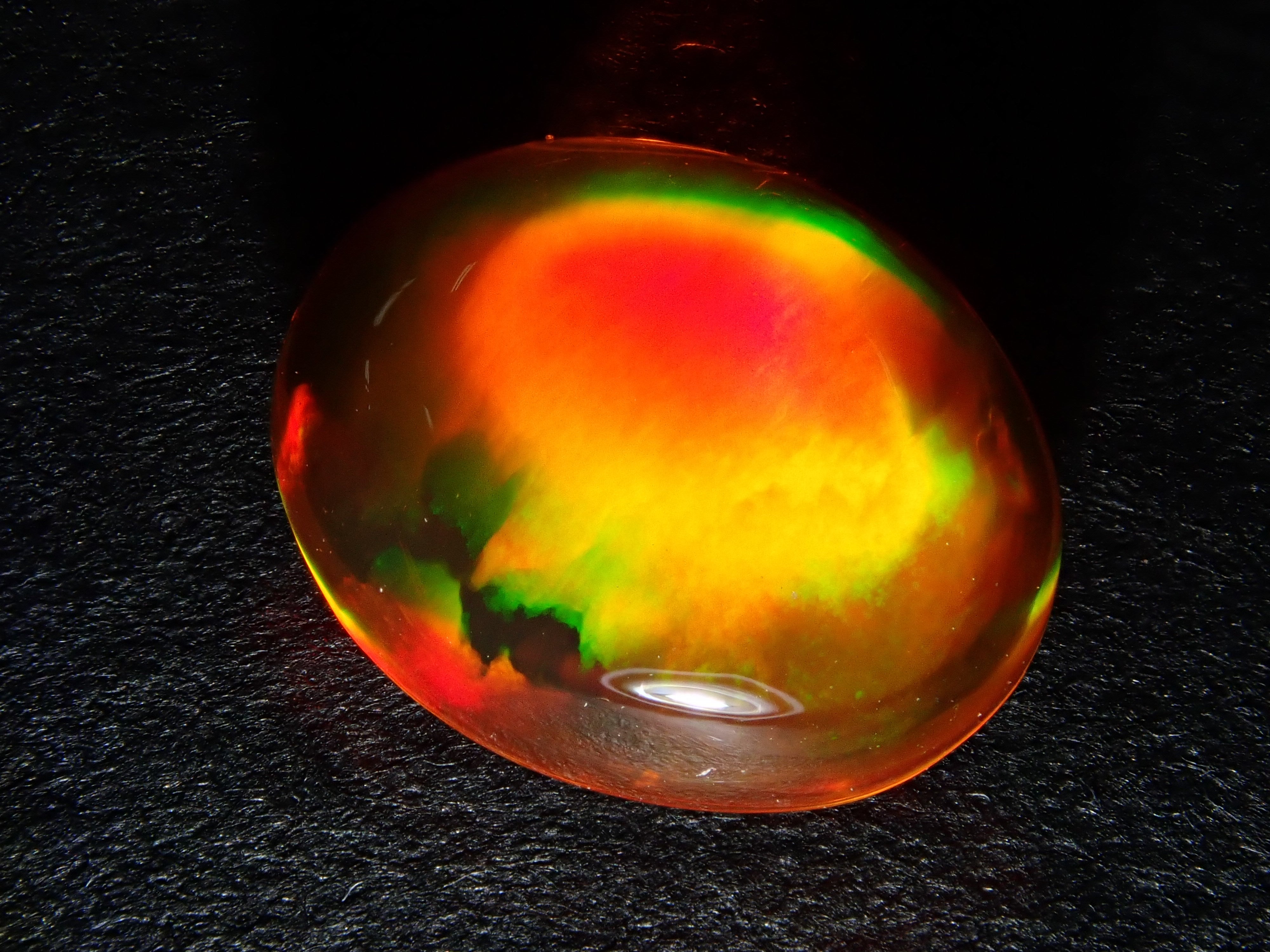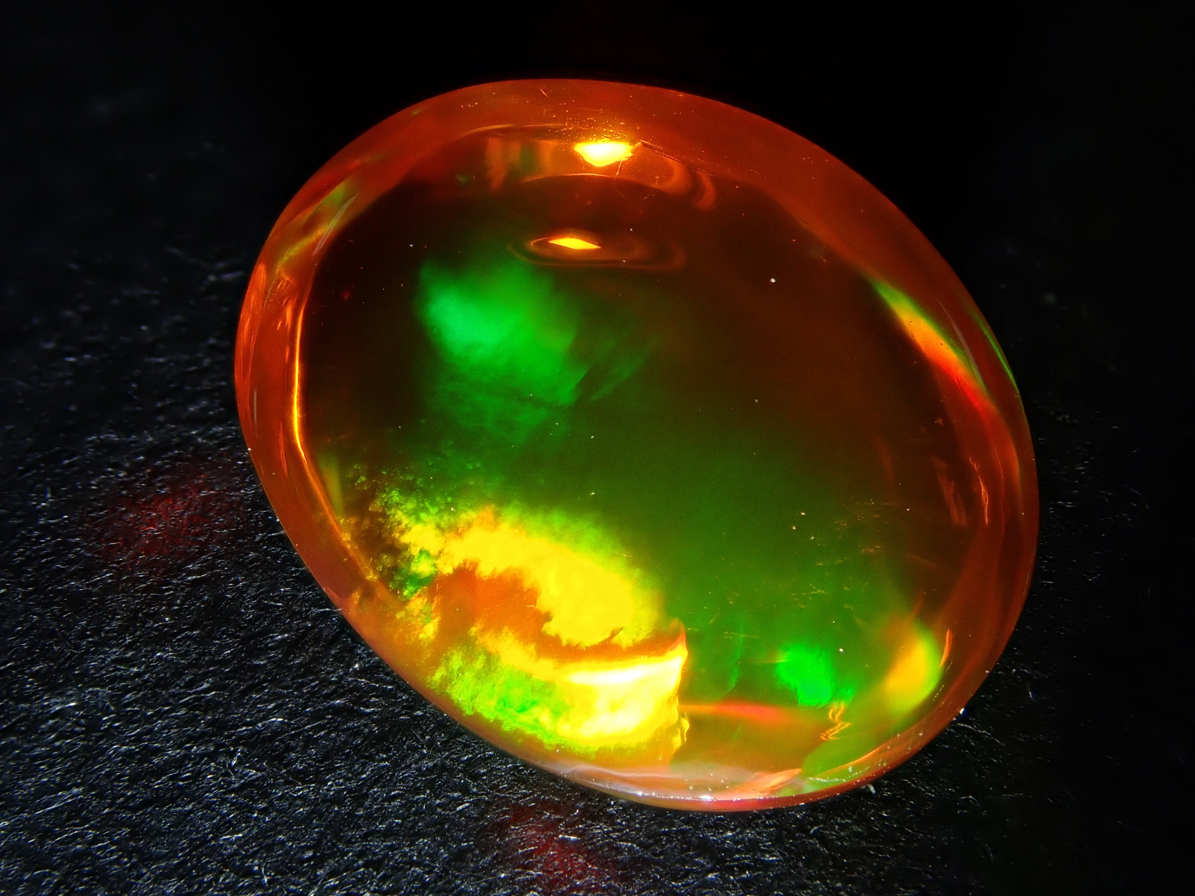 自古羅馬時代以來,蛋白石就廣受歡迎。火蛋白石是一種以紅色到橘色為底色的蛋白石,形狀像「火」。這張照片是用筆型電筒拍攝的。