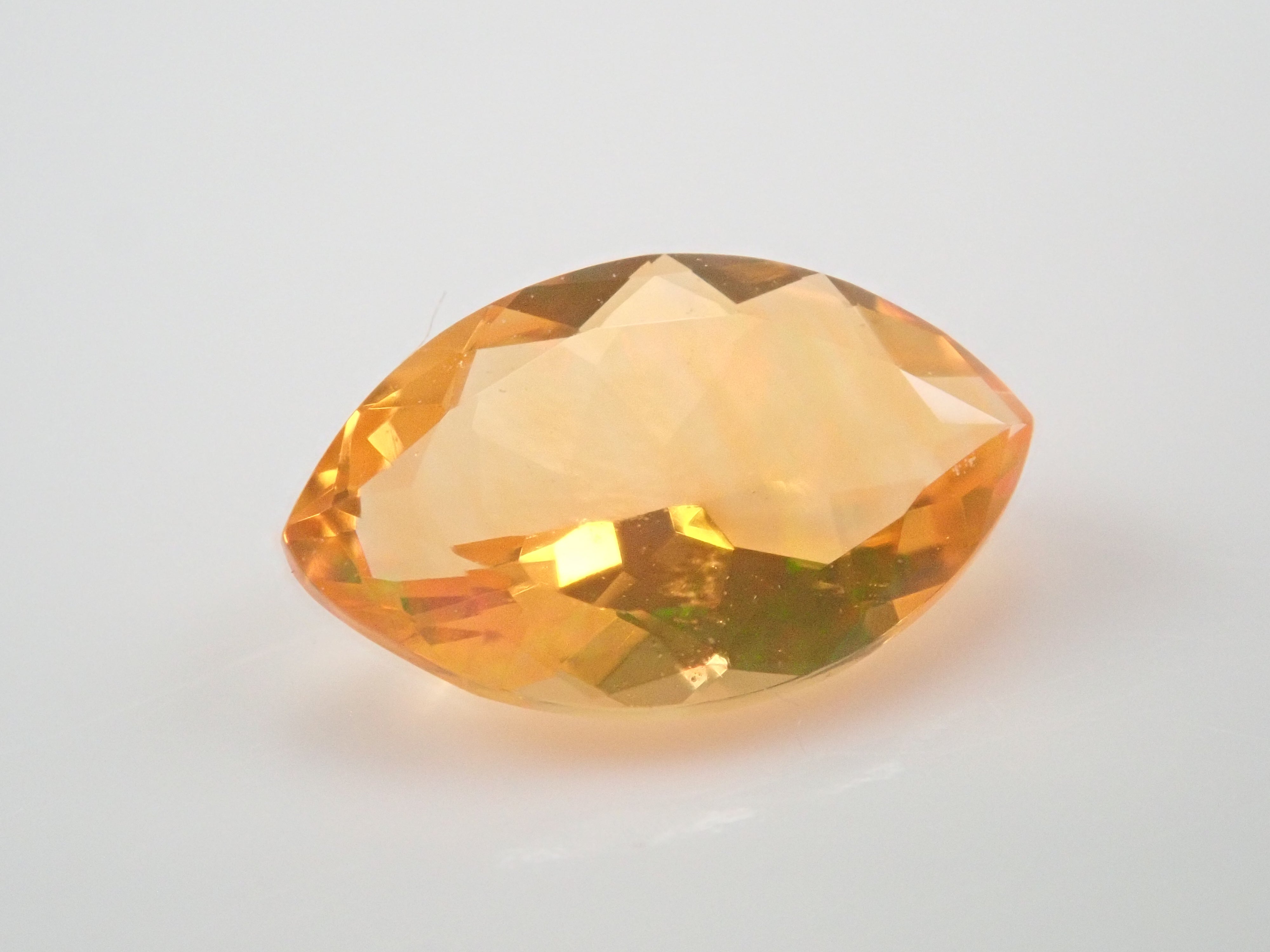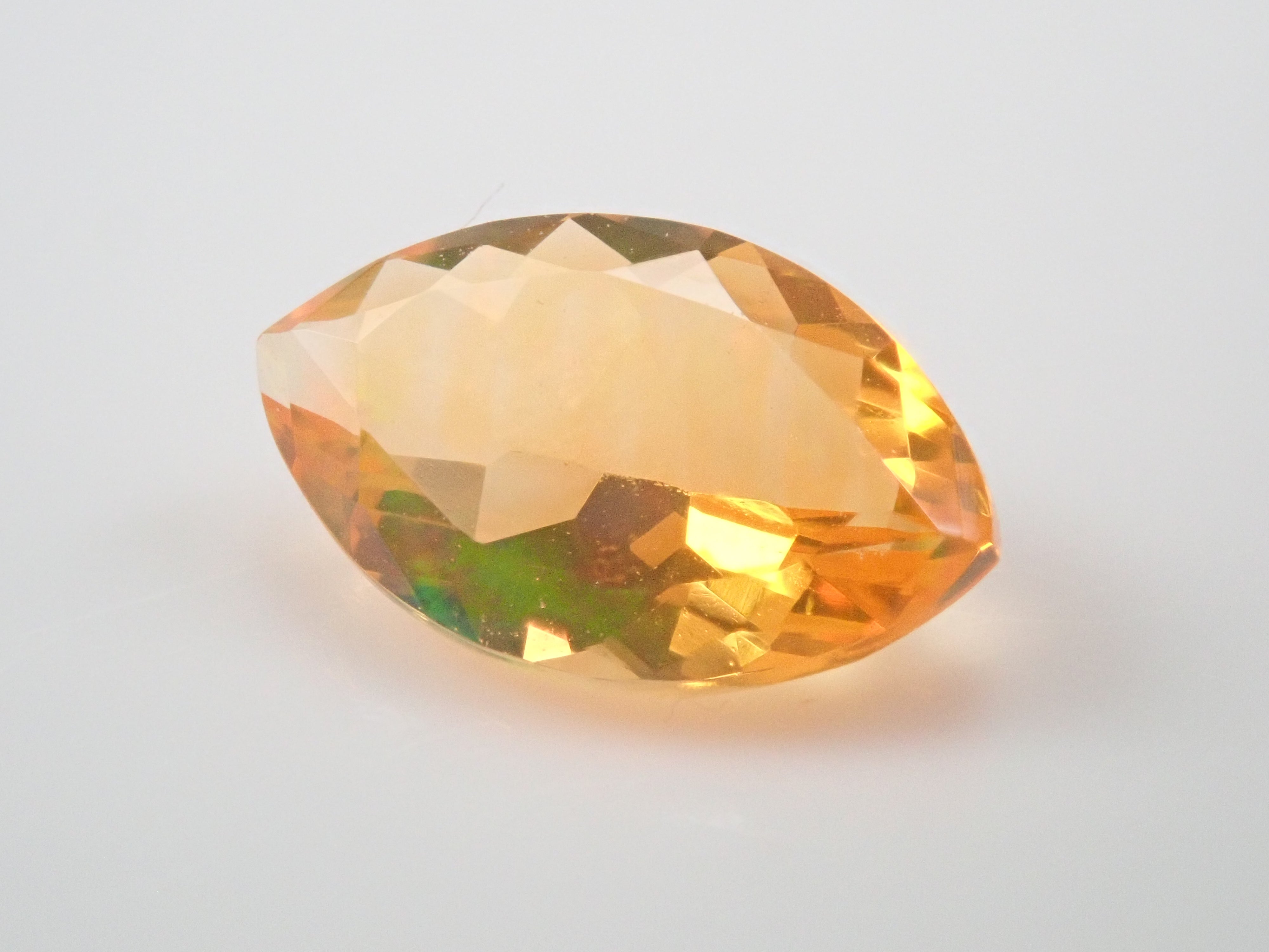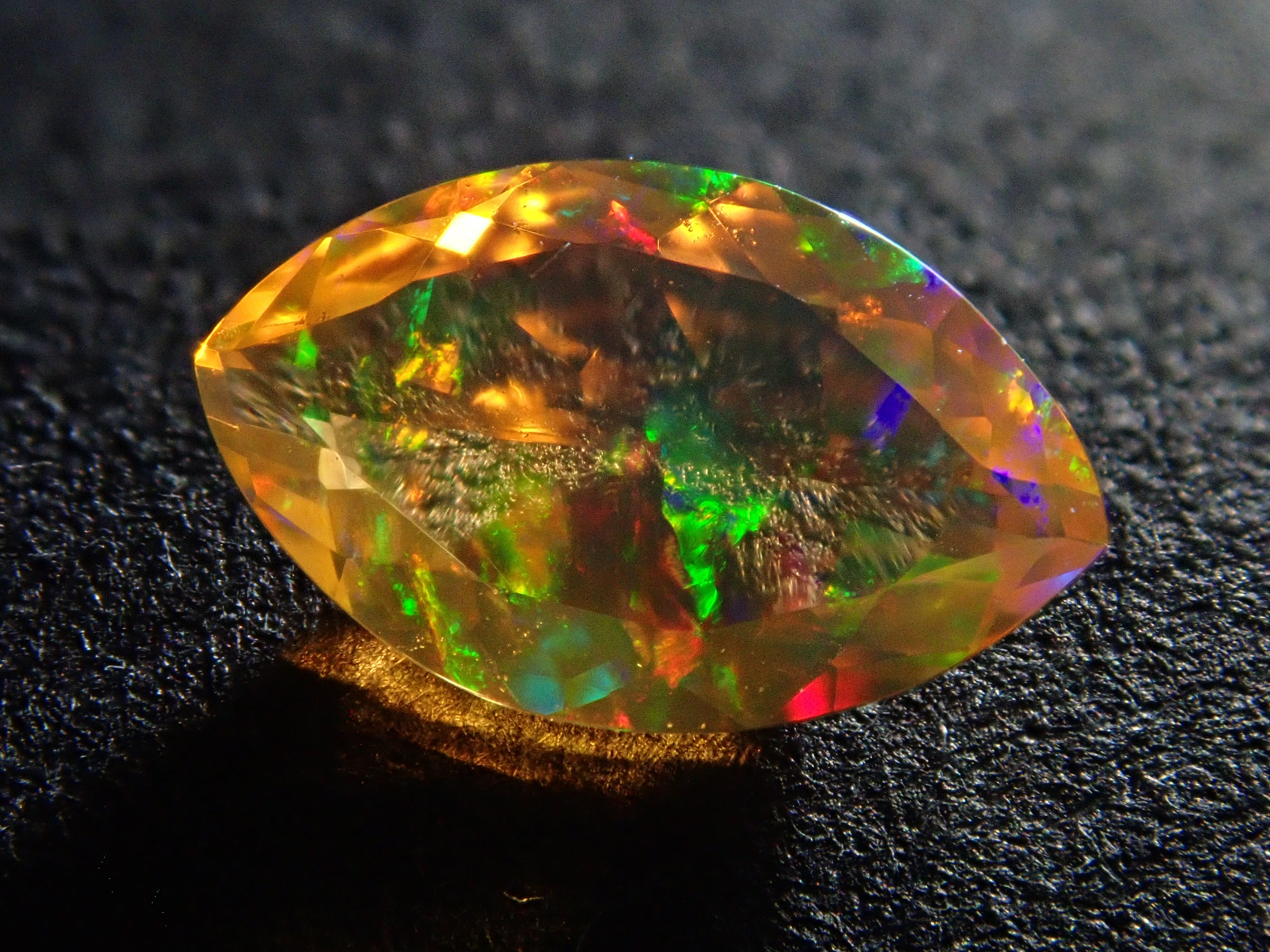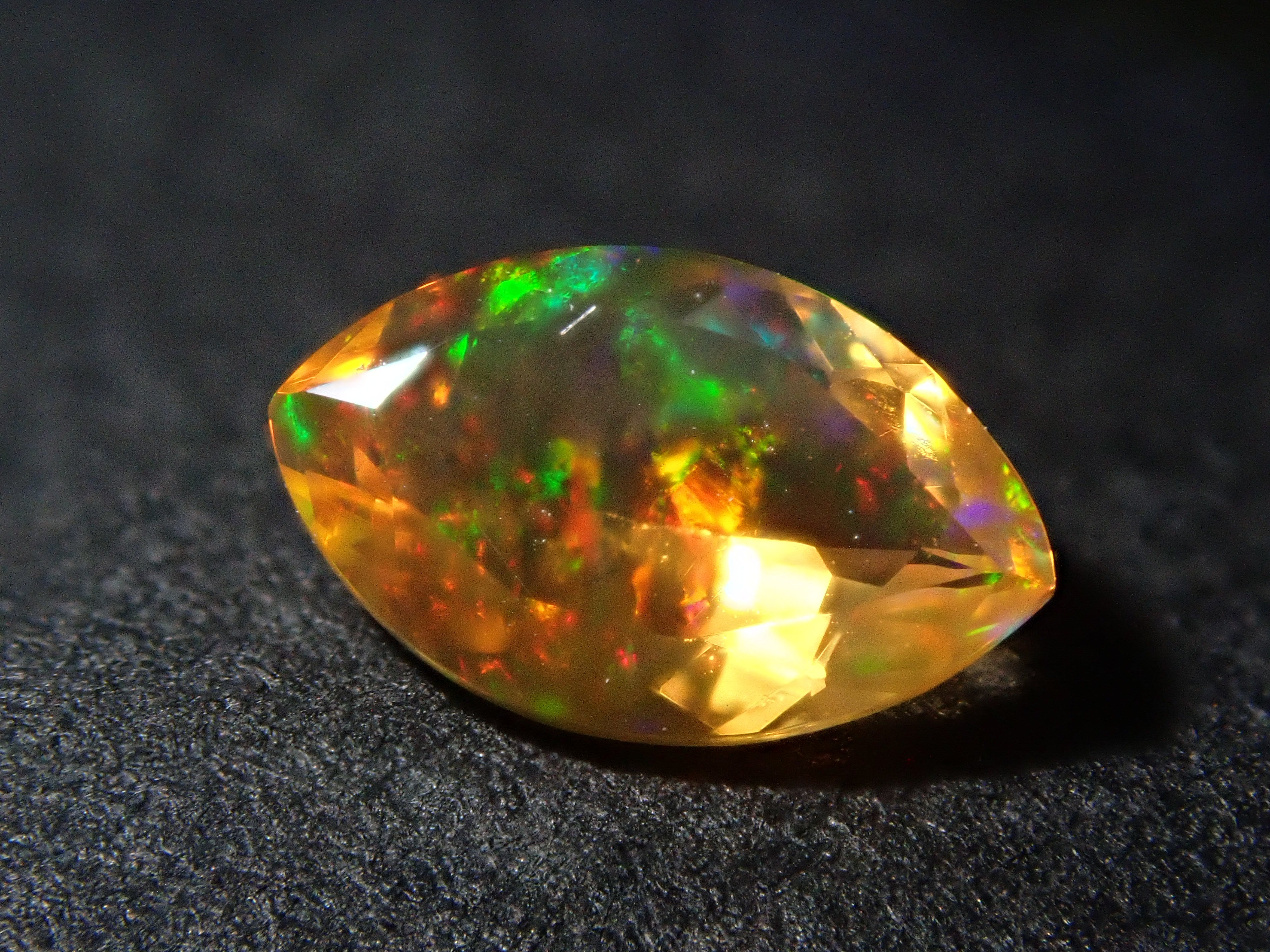 自古羅馬時代以來,蛋白石就廣受歡迎。火蛋白石是一種以紅色到橙色為底色的蛋白石,令人聯想到火焰。這張照片是用筆型電筒拍攝的。這是一顆刻面火蛋白石。這是一顆墨西哥火蛋白石,由斯里蘭卡切割師 Sanjay 切割而成。