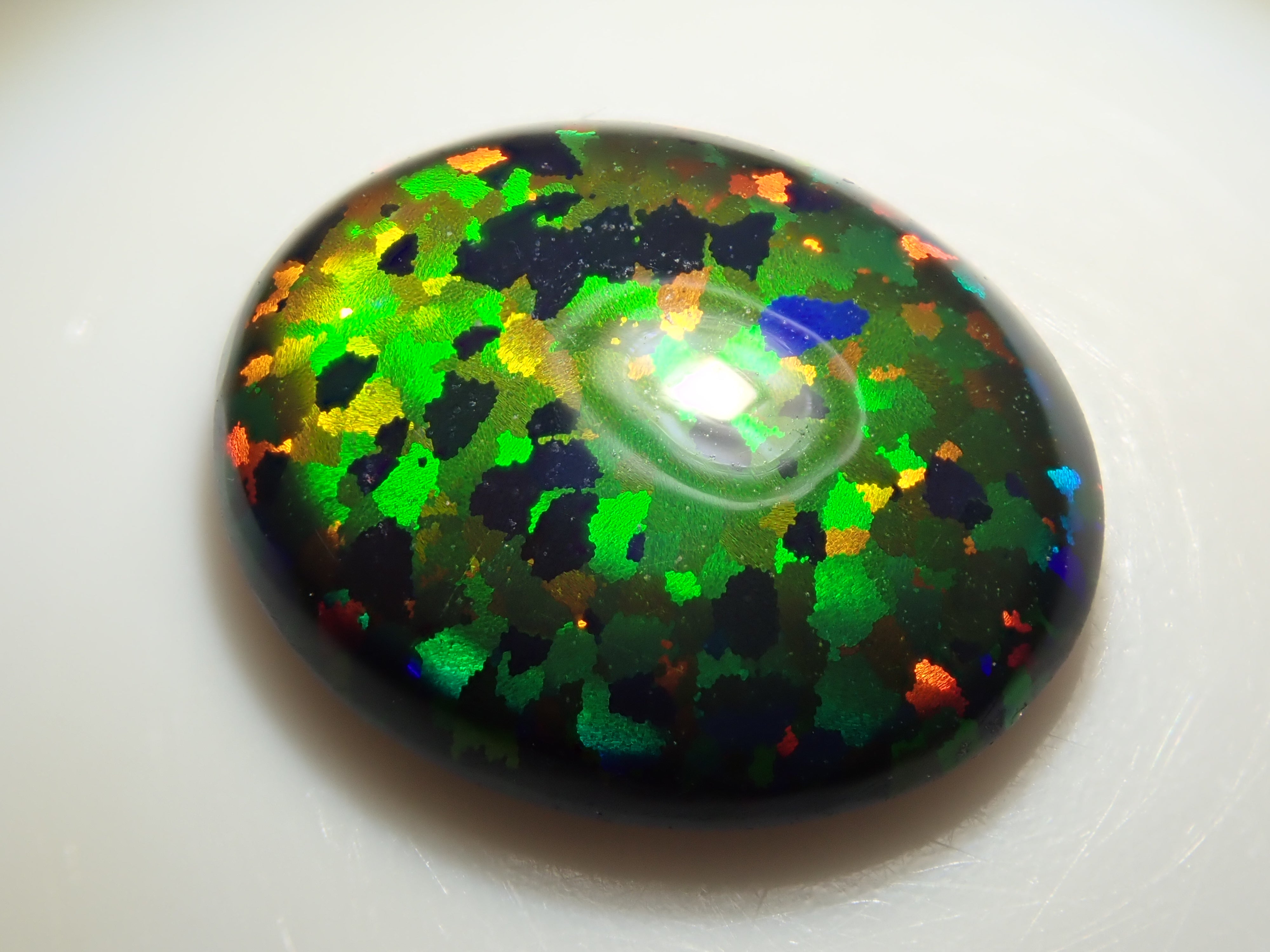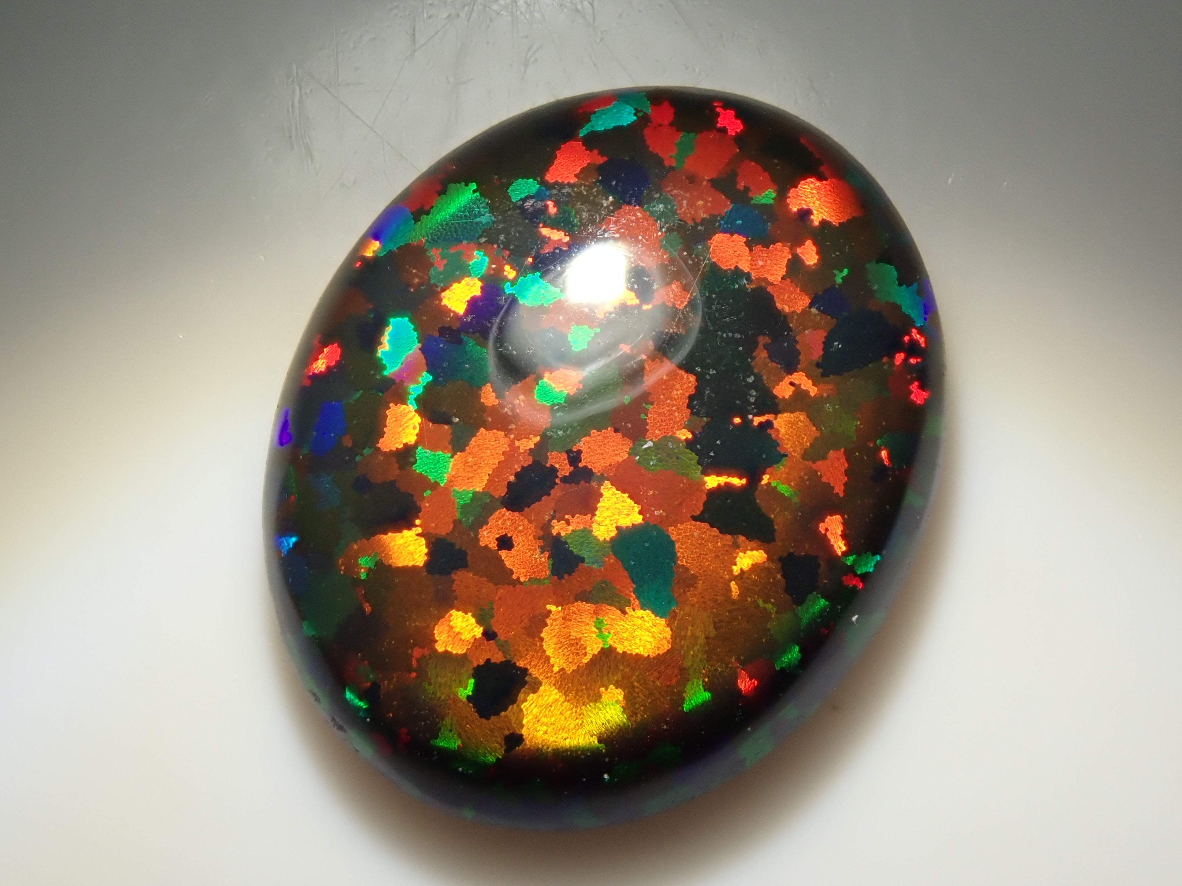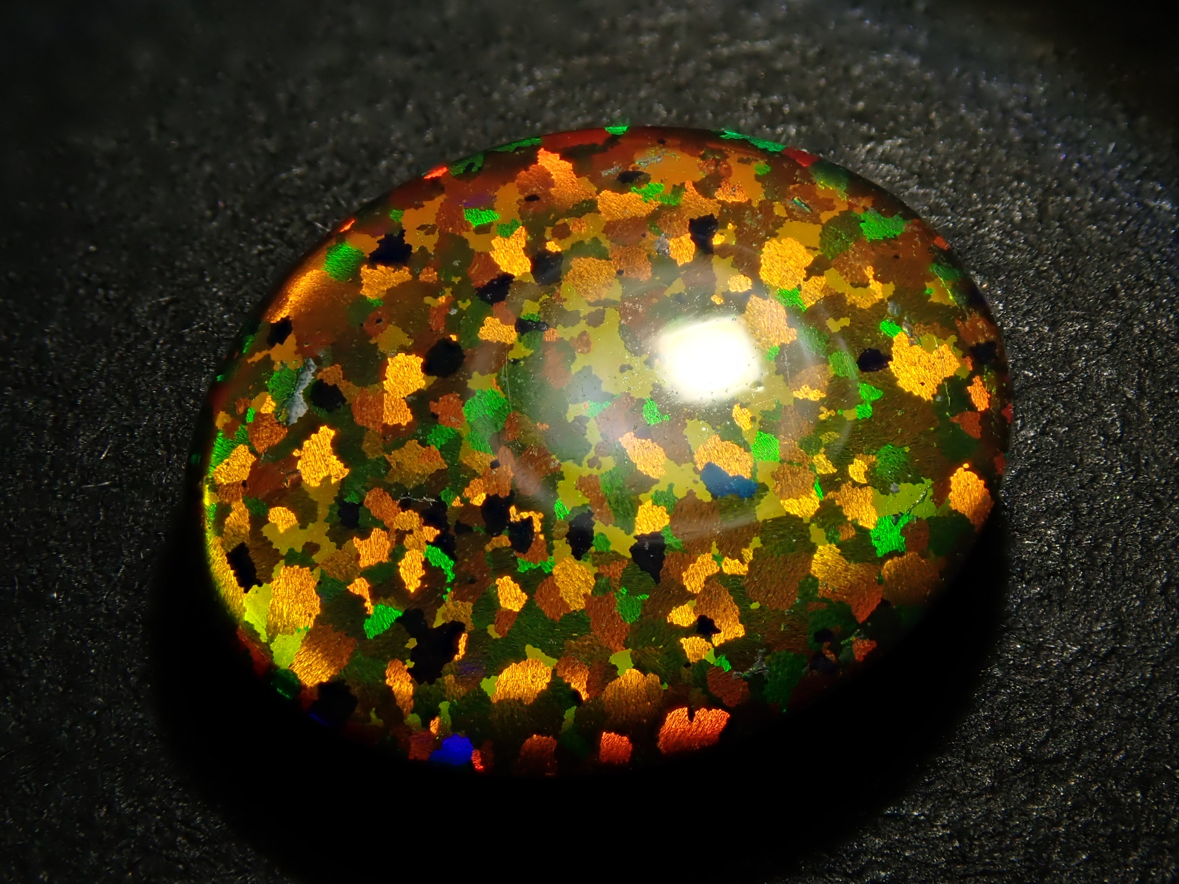 蛋白石是一種以虹彩光澤為特徵的寶石。這是人工合成的蛋白石,因此您可以欣賞各種色彩的變幻。照片是用筆型手電筒拍攝的。