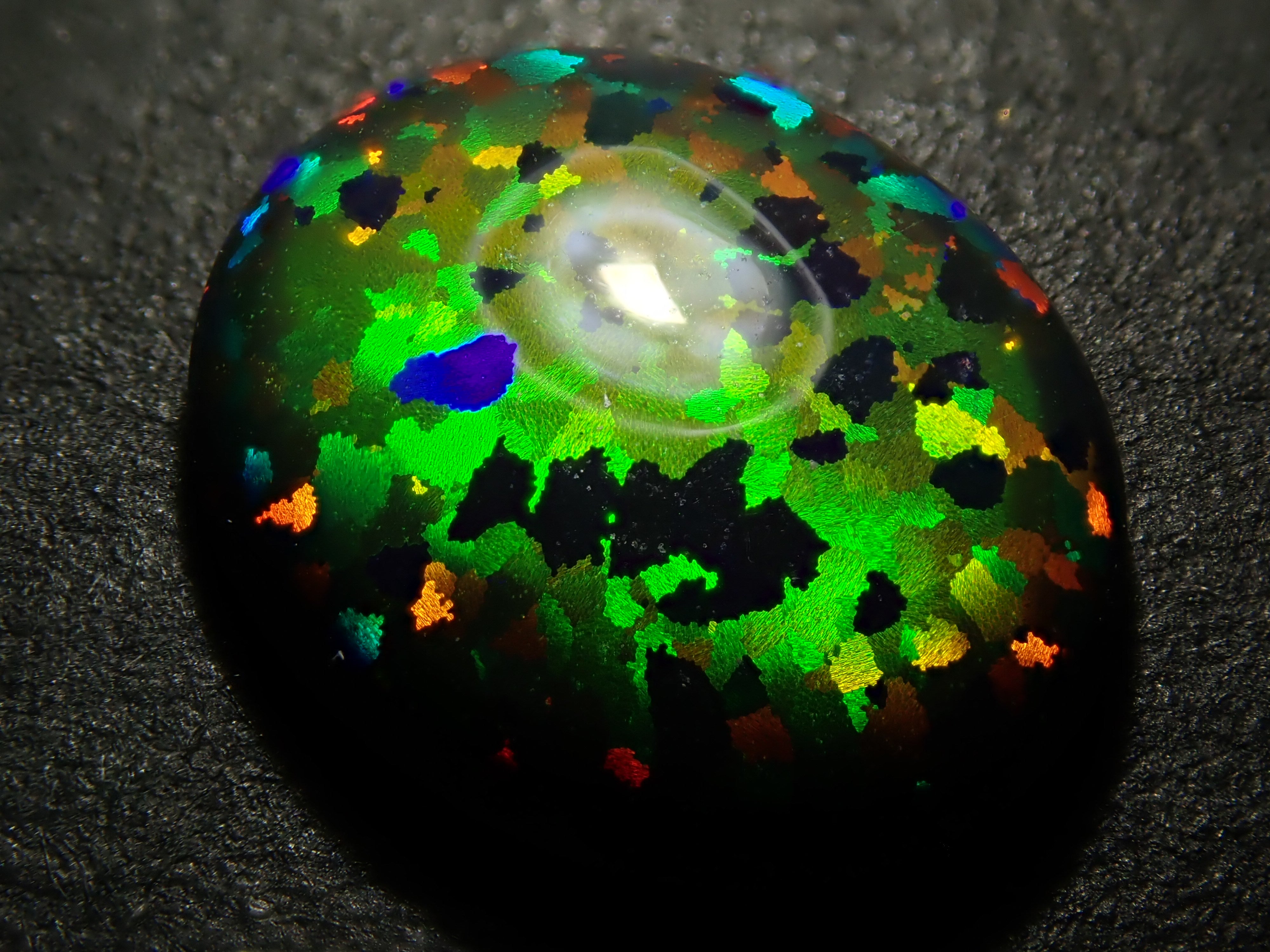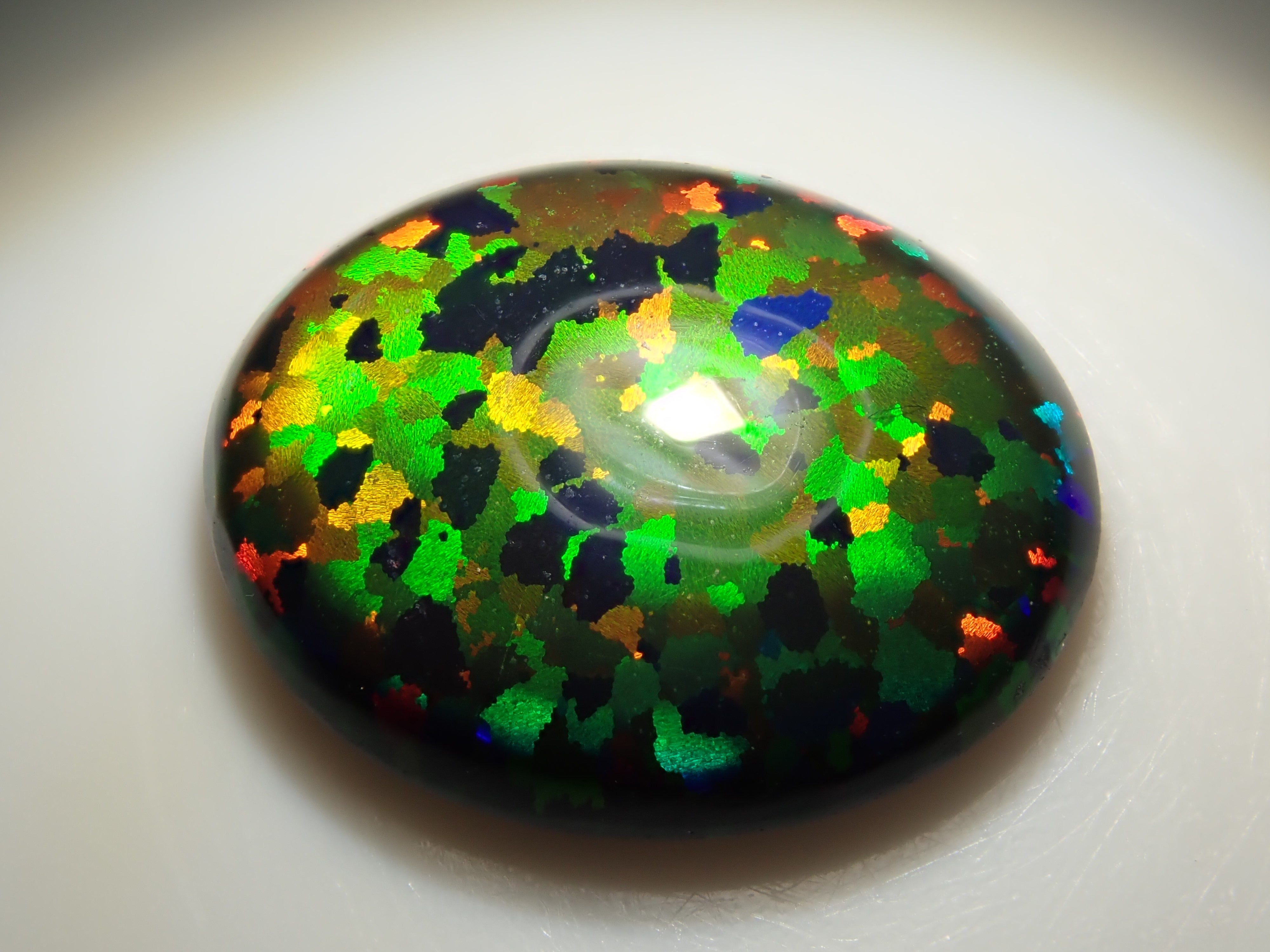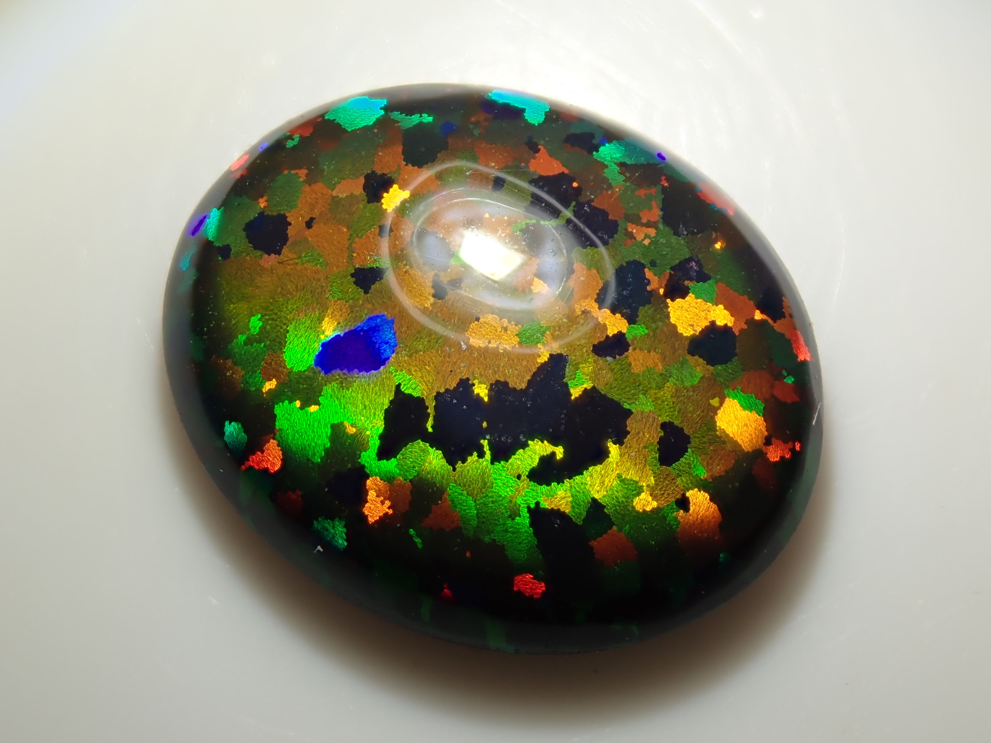 蛋白石是一種以虹彩光澤為特徵的寶石。這是人工合成的蛋白石,因此您可以欣賞各種色彩的變幻。照片是用筆型手電筒拍攝的。